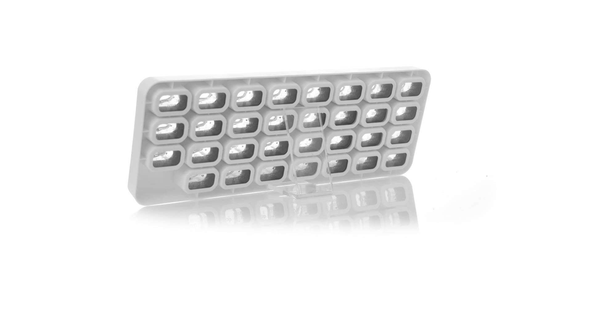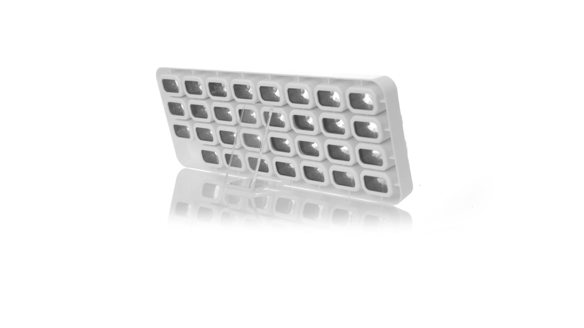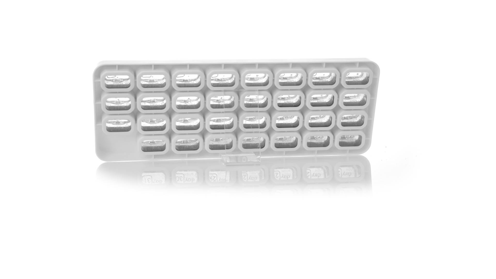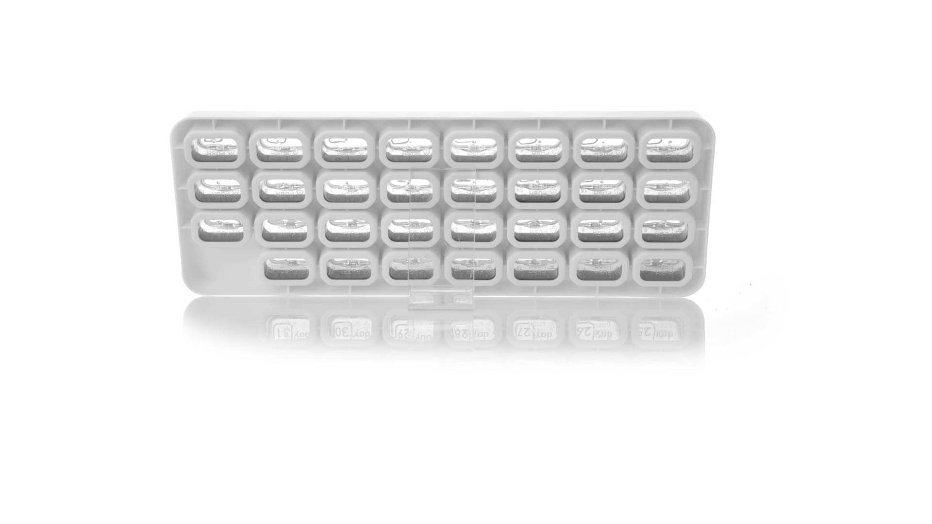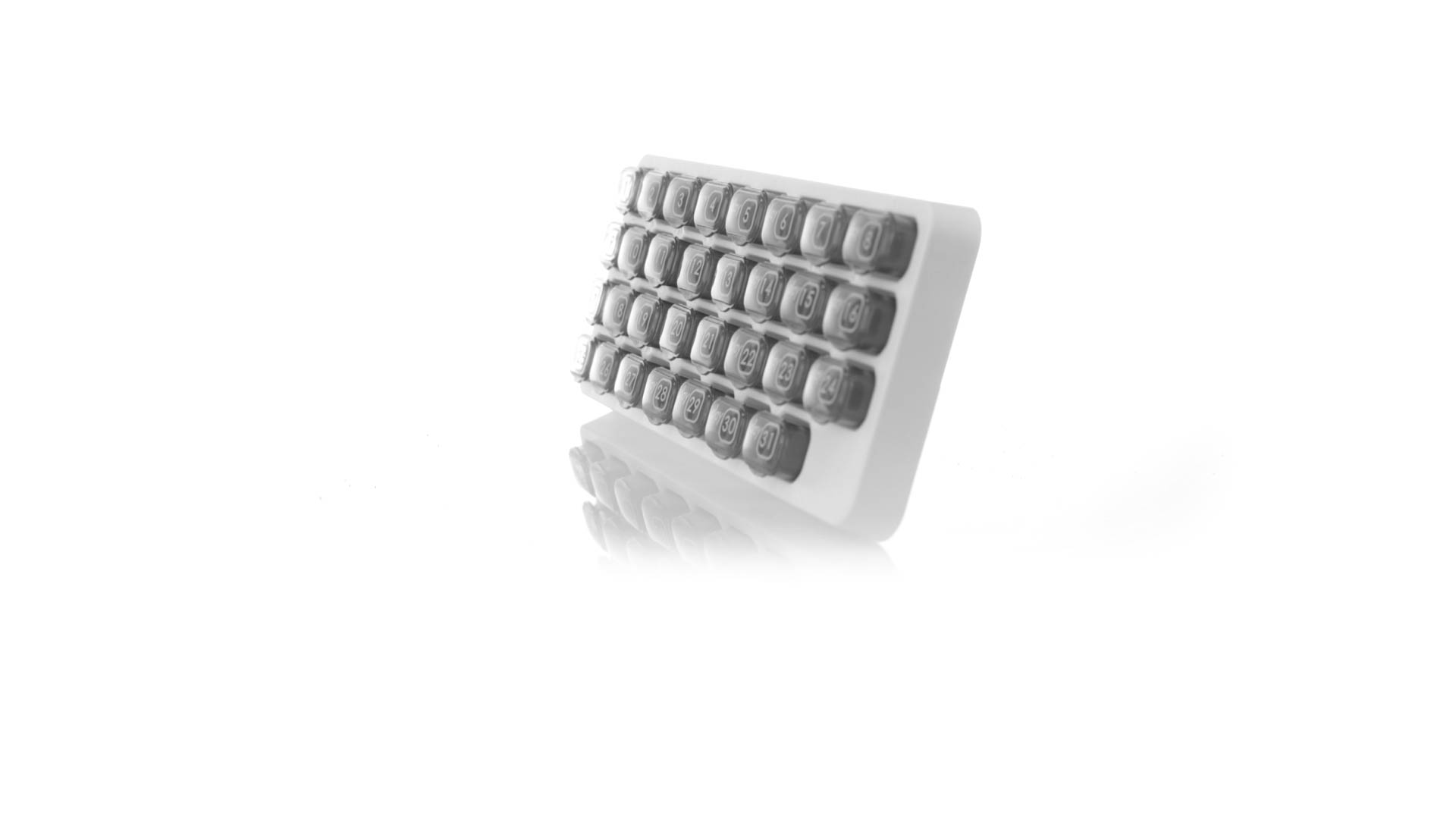 Original pastillero mensual, hergestellt aus widerstandsfähigem PP, mit 31 unabhängigen Behältern und Extras, um alle am Tag benötigten Pastillas zu schützen. Con base blanca y cajas greys impresas con el day del mes. Präsentiert in einer individuellen Tasche.