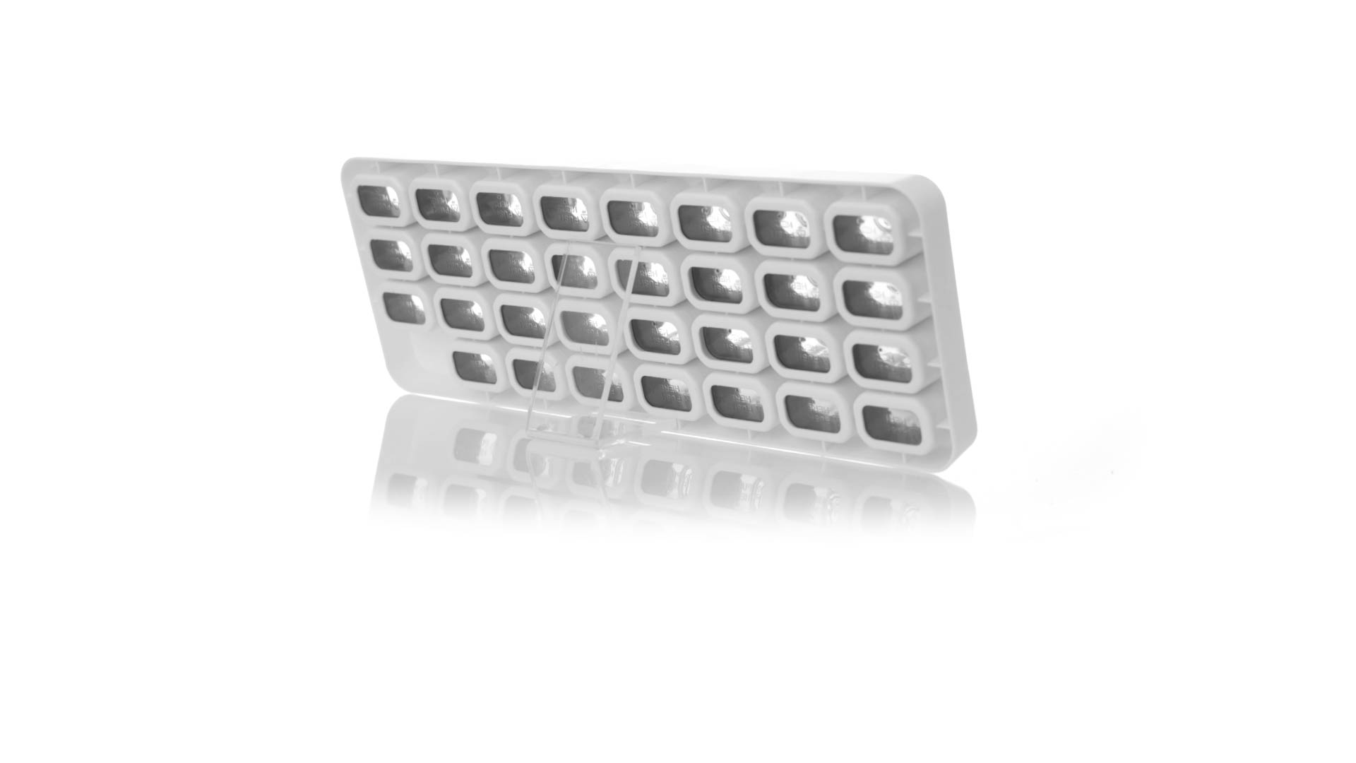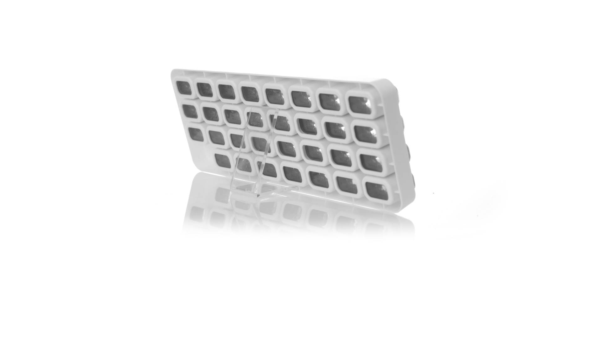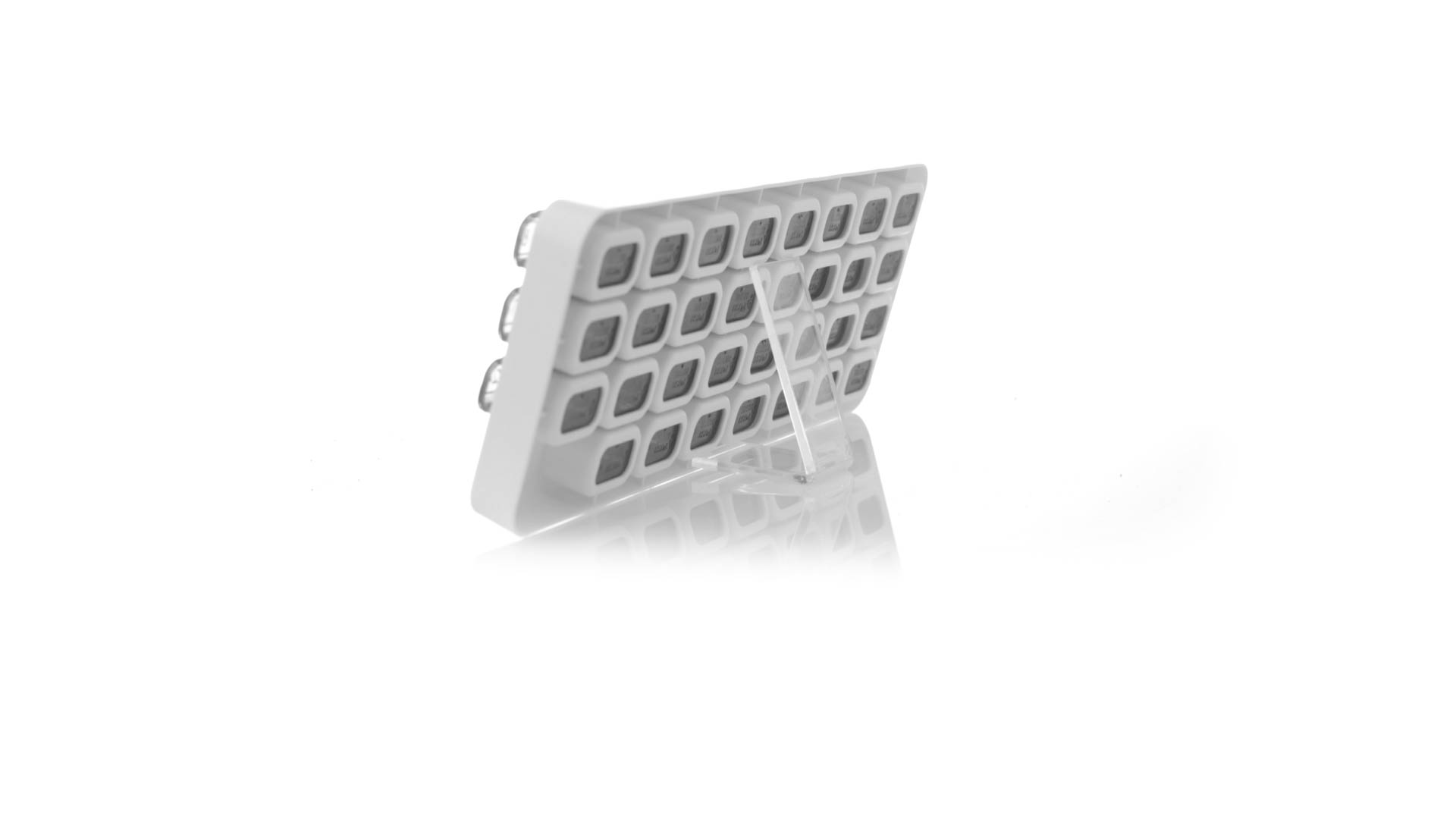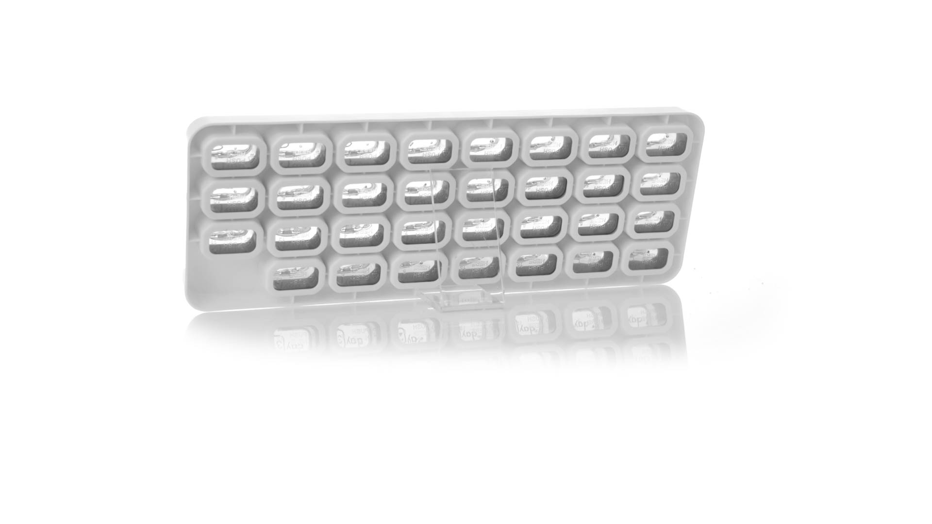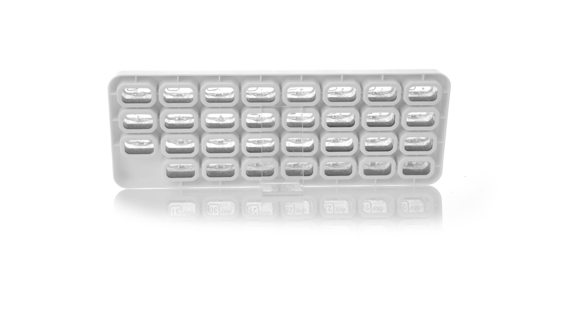 Original pastillero mensual, hergestellt aus widerstandsfähigem PP, mit 31 unabhängigen Behältern und Extras, um alle am Tag benötigten Pastillas zu schützen. Con base blanca y cajas greys impresas con el day del mes. Präsentiert in einer individuellen Tasche.