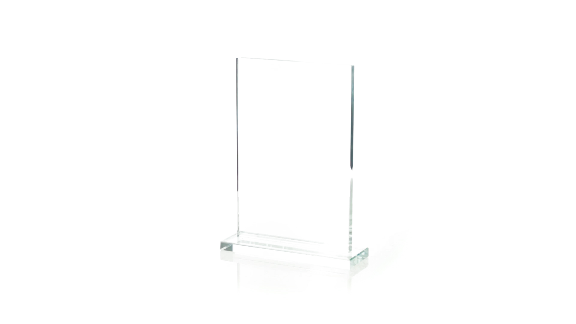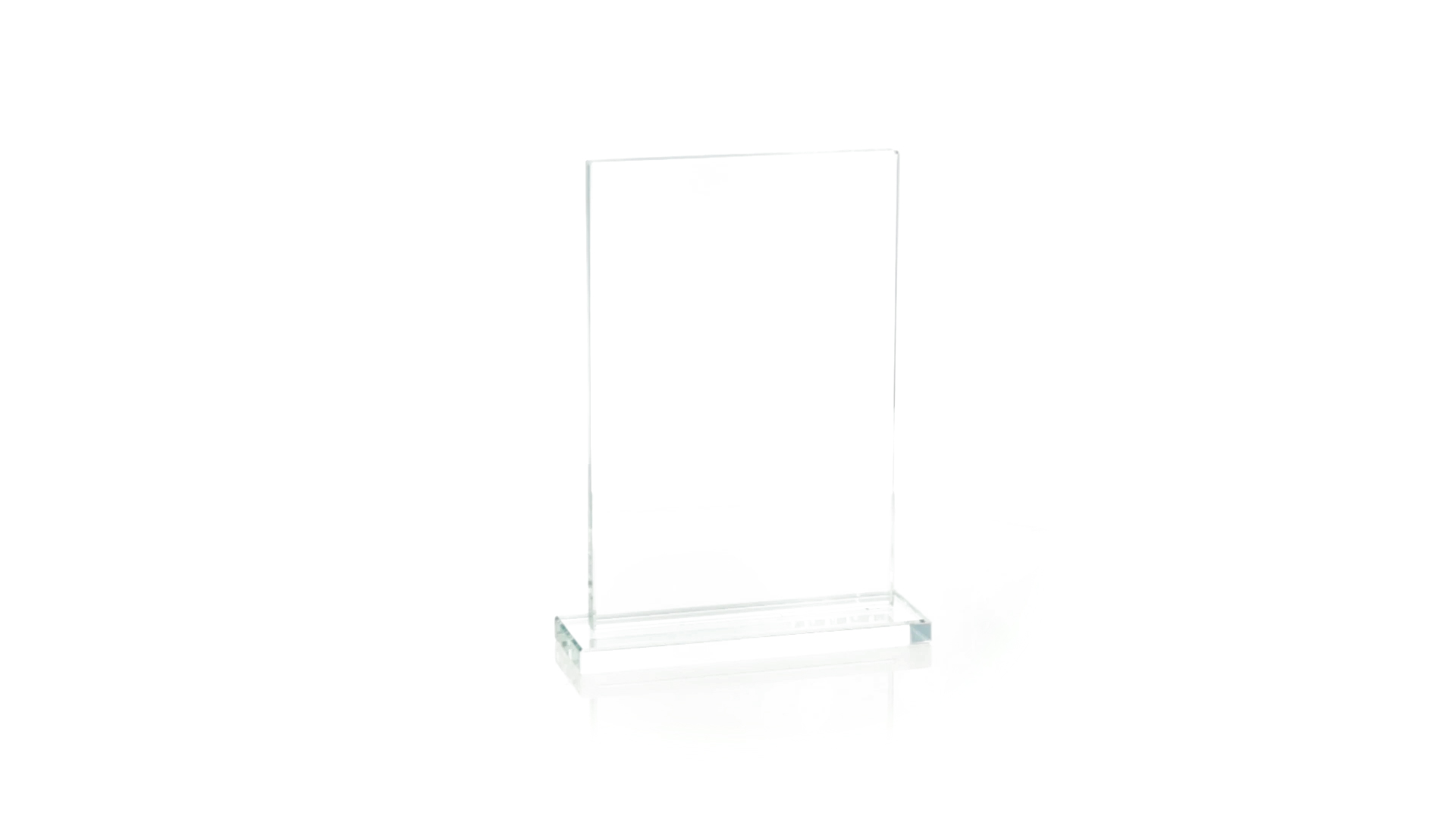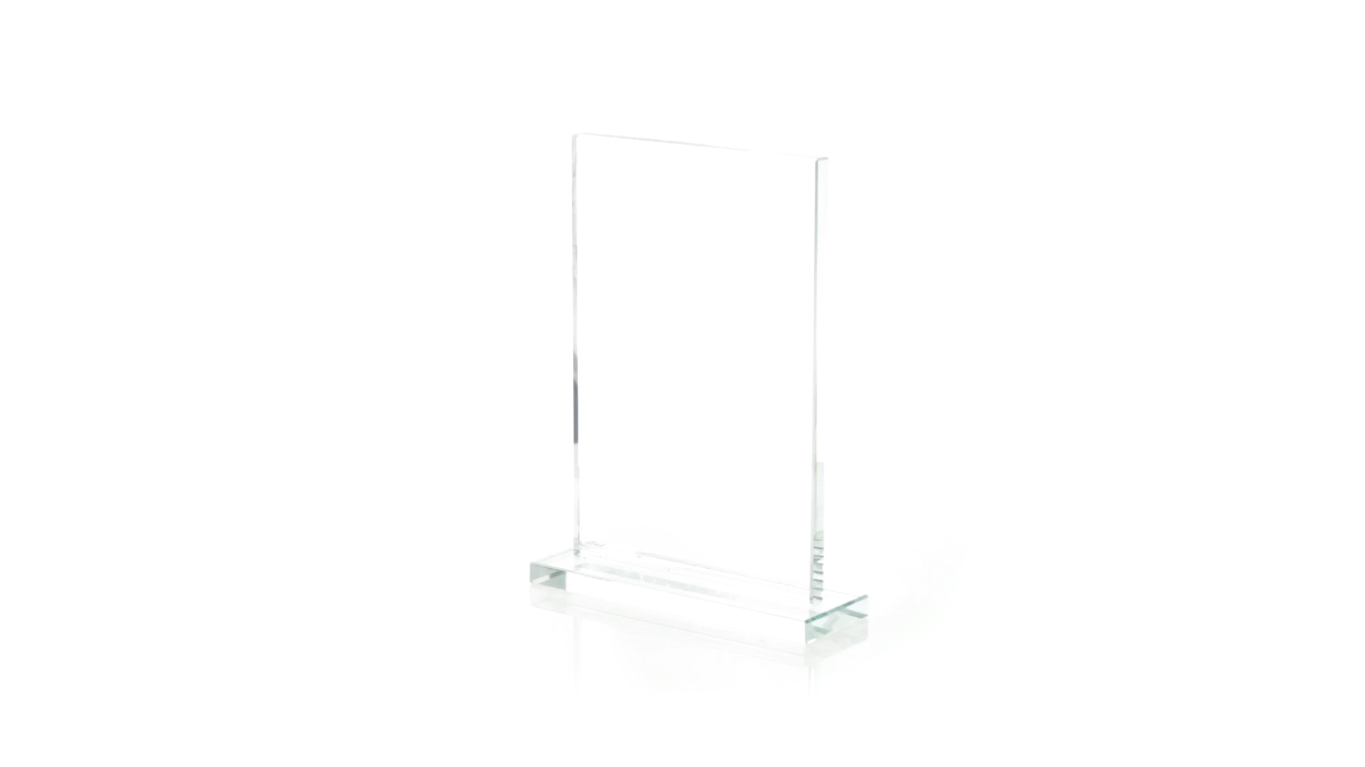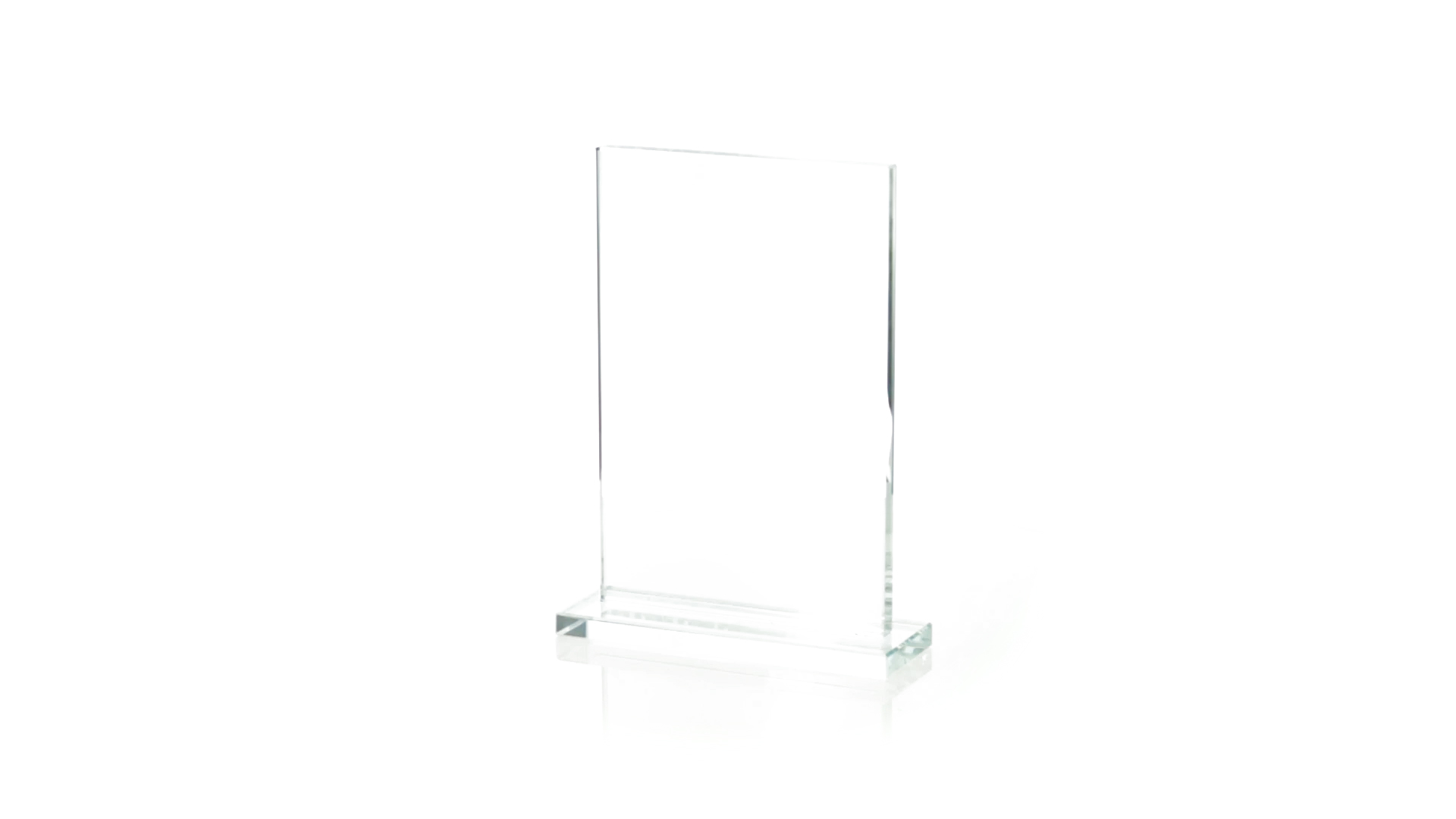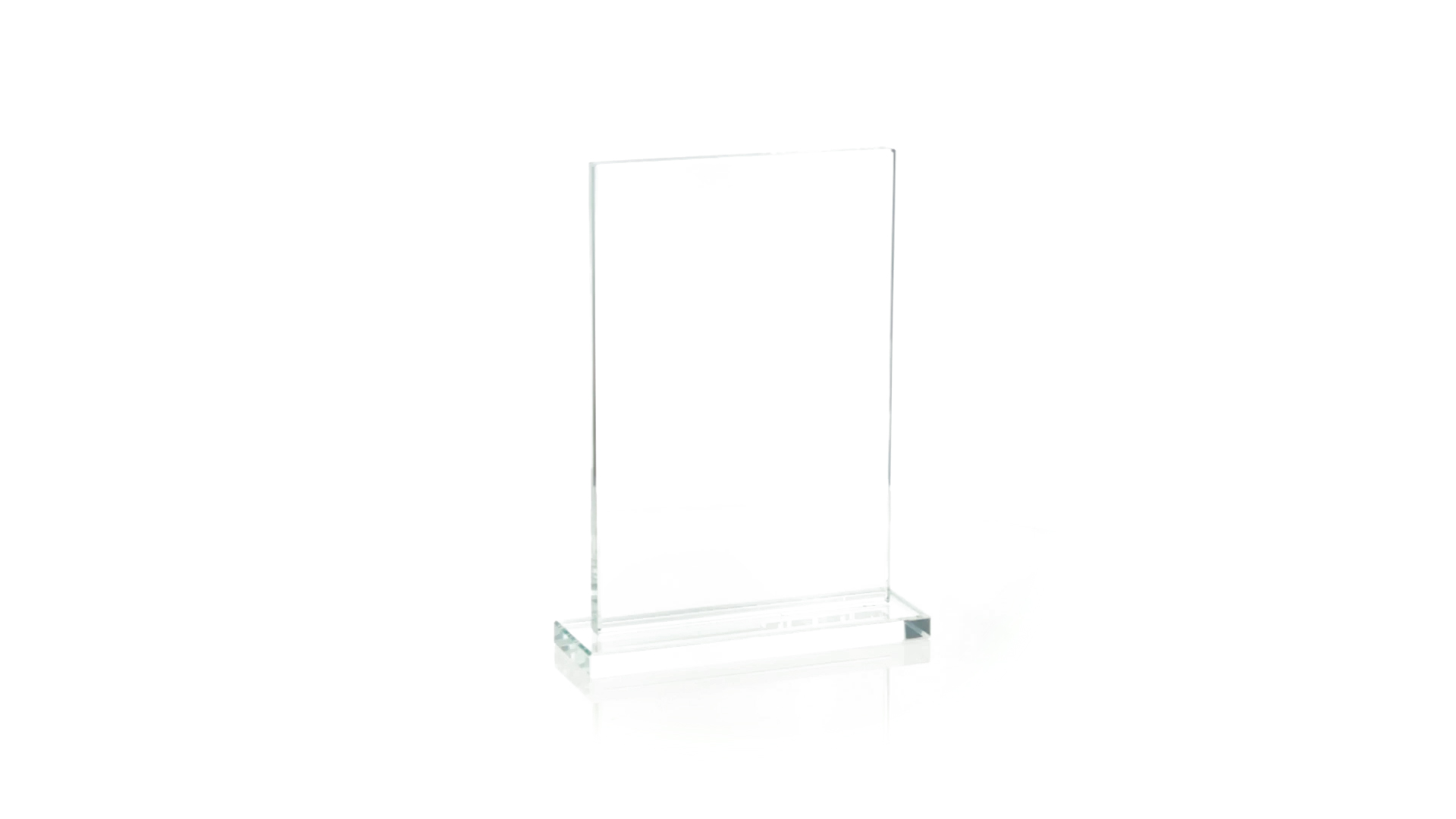 Trophäe aus dickem Glas mit elegantem rechteckigem Design und robustem Standbein. Speziell für den Laserdruck entwickelt. Präsentiert in einem individuellen Schutzcase.