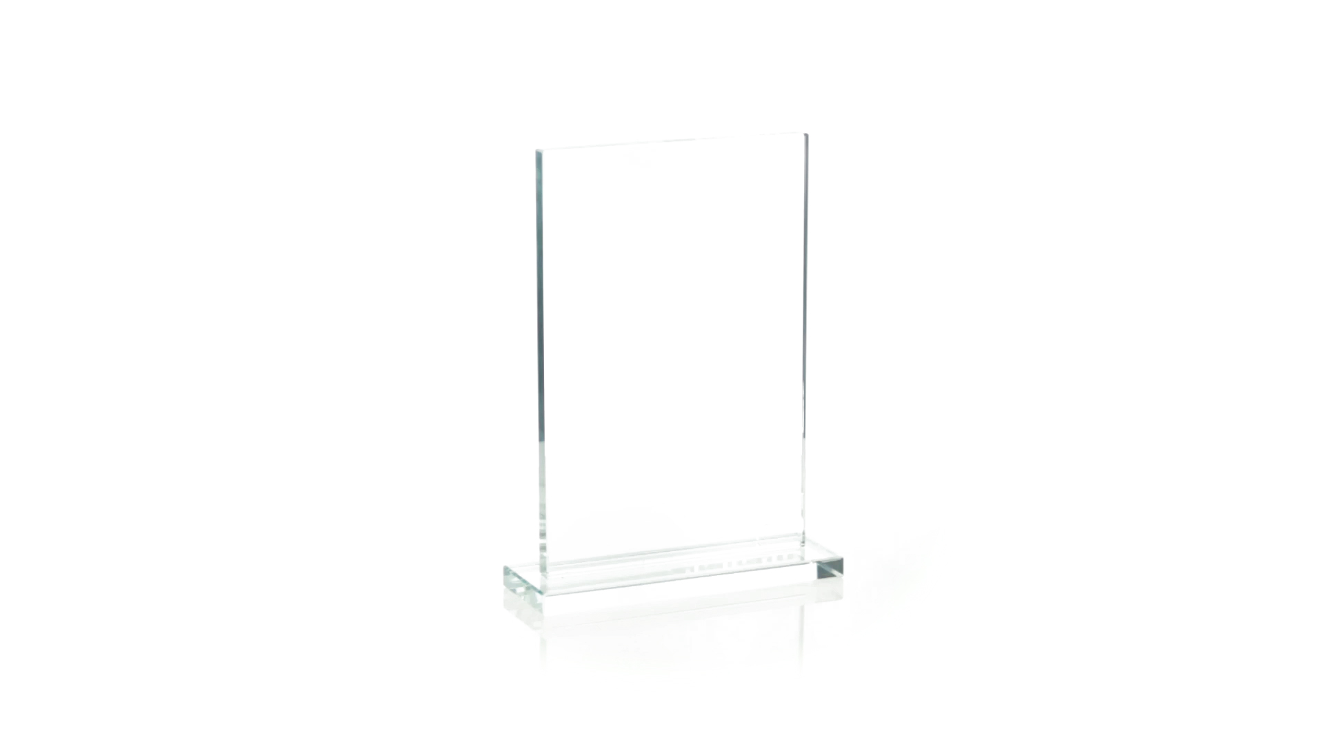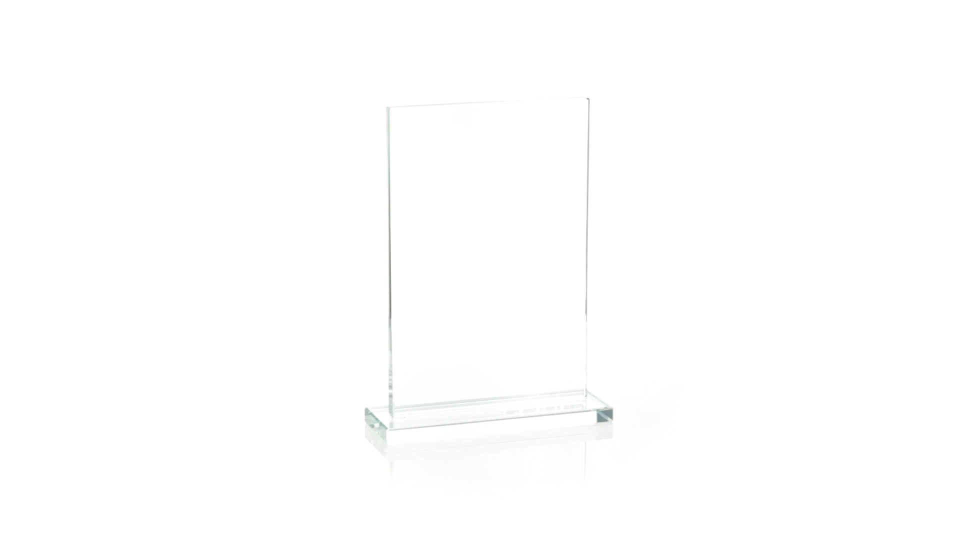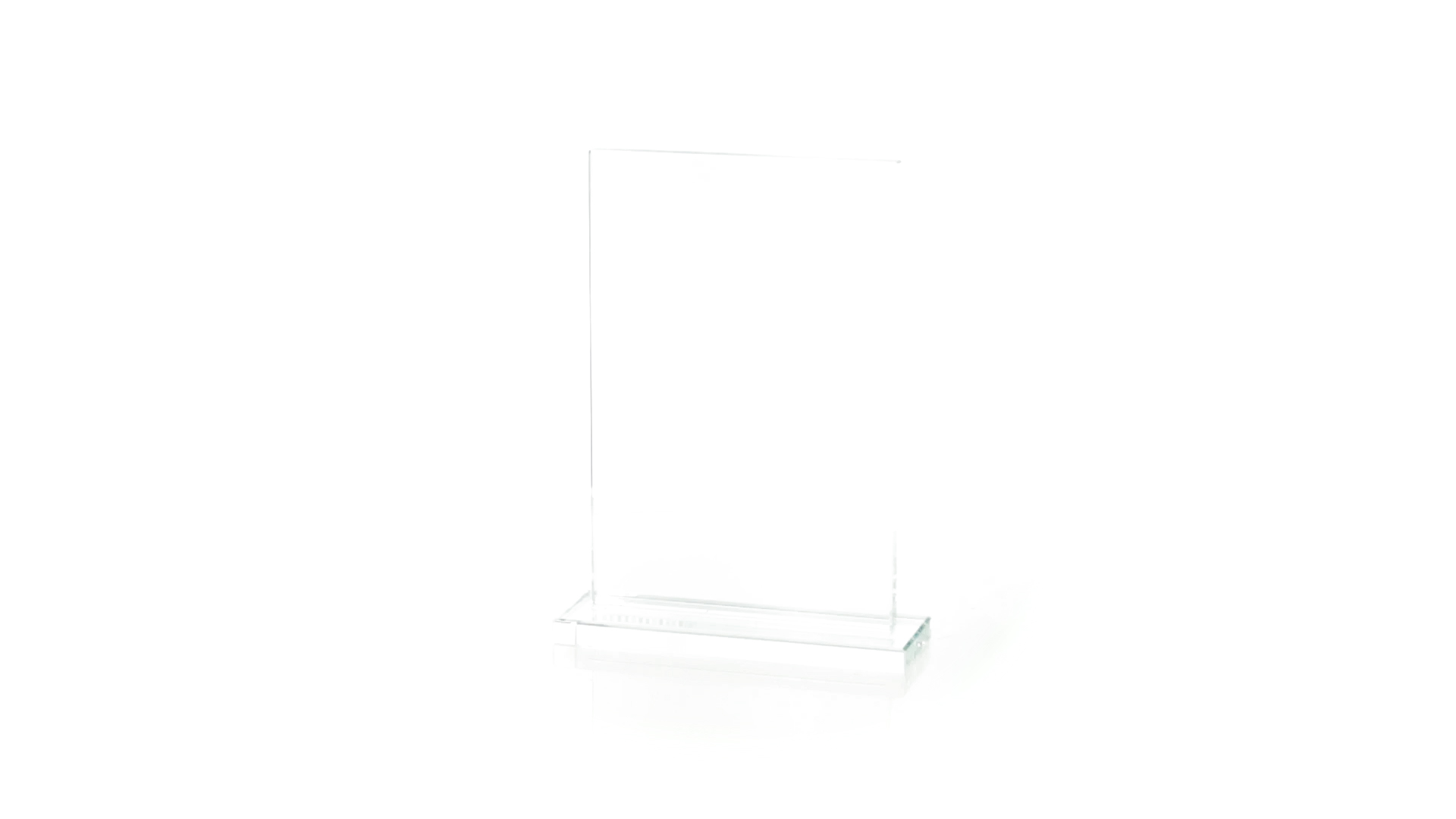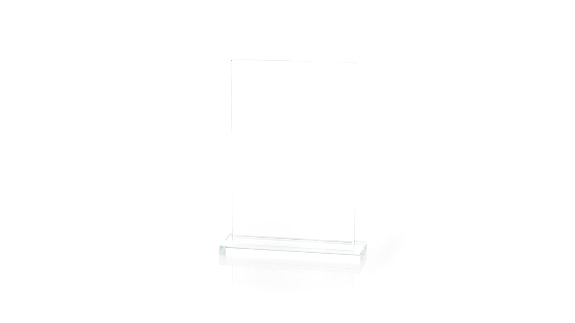 Trophäe aus dickem Glas mit elegantem rechteckigem Design und robustem Standbein. Speziell für den Laserdruck entwickelt. Präsentiert in einem individuellen Schutzcase.