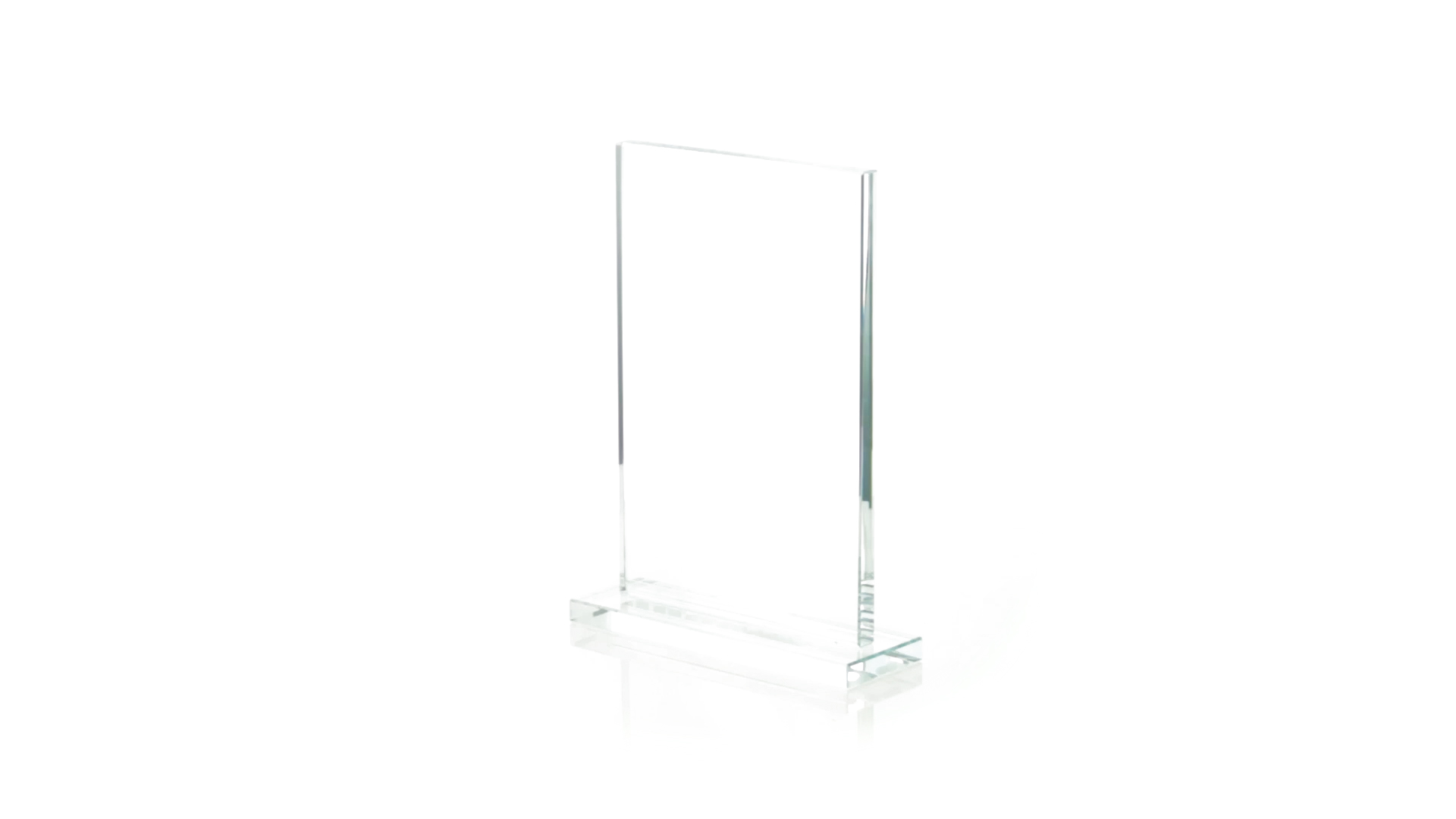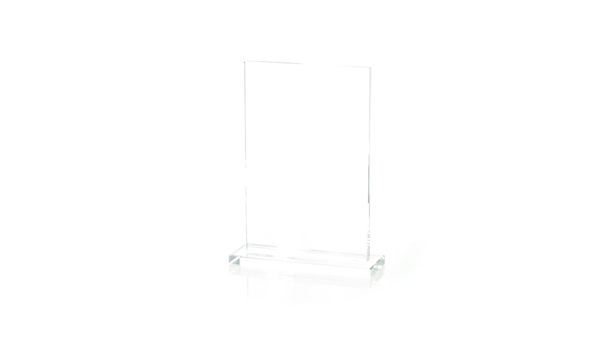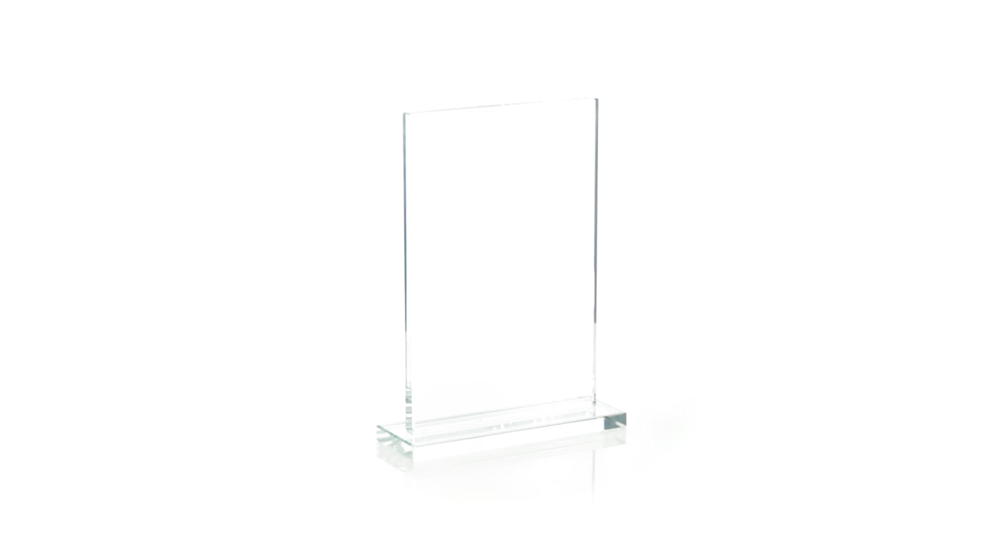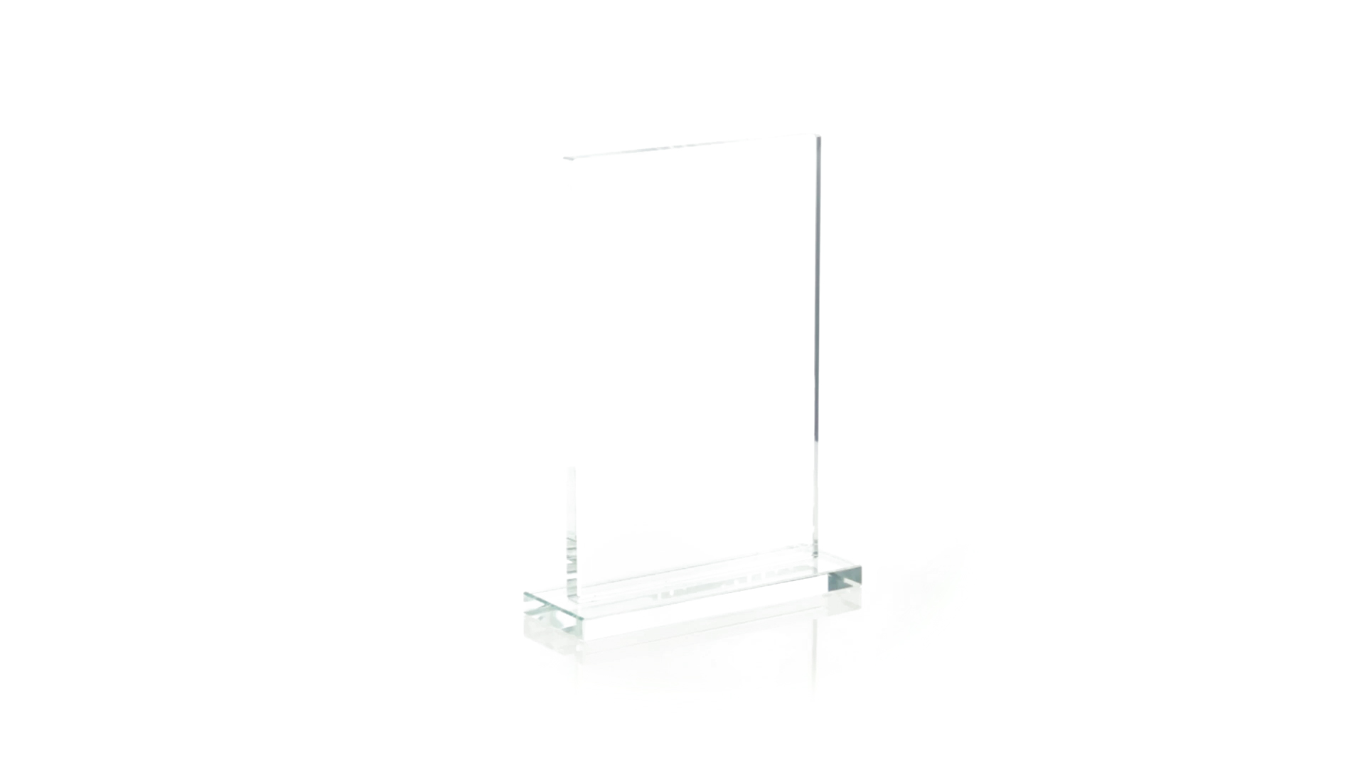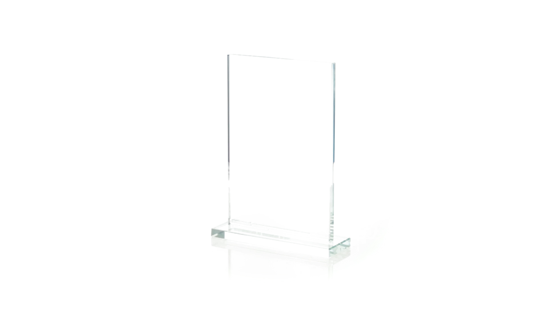 Trophäe aus dickem Glas mit elegantem rechteckigem Design und robustem Standbein. Speziell für den Laserdruck entwickelt. Präsentiert in einem individuellen Schutzcase.