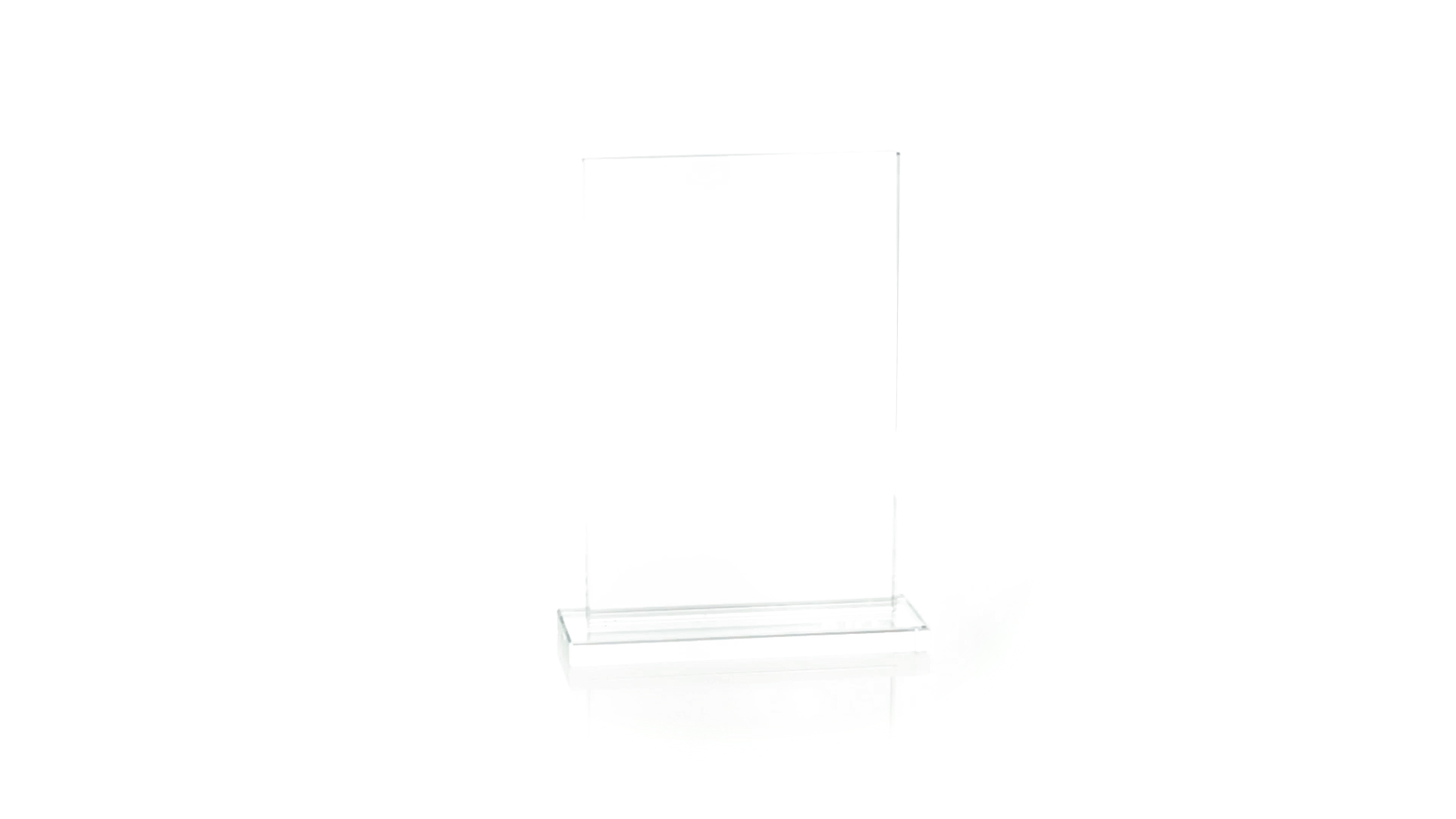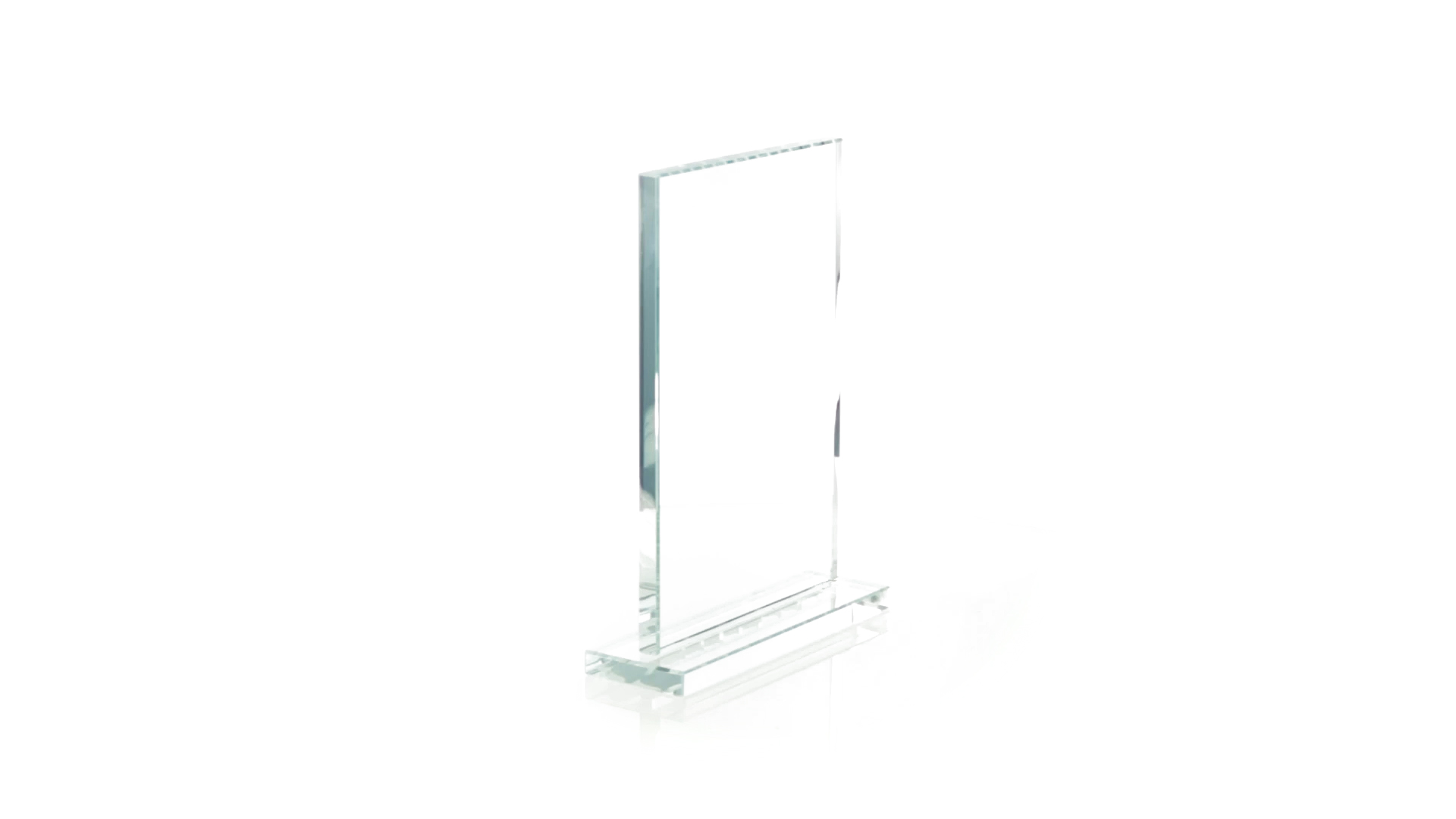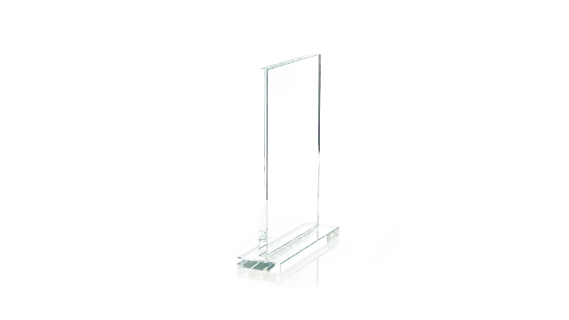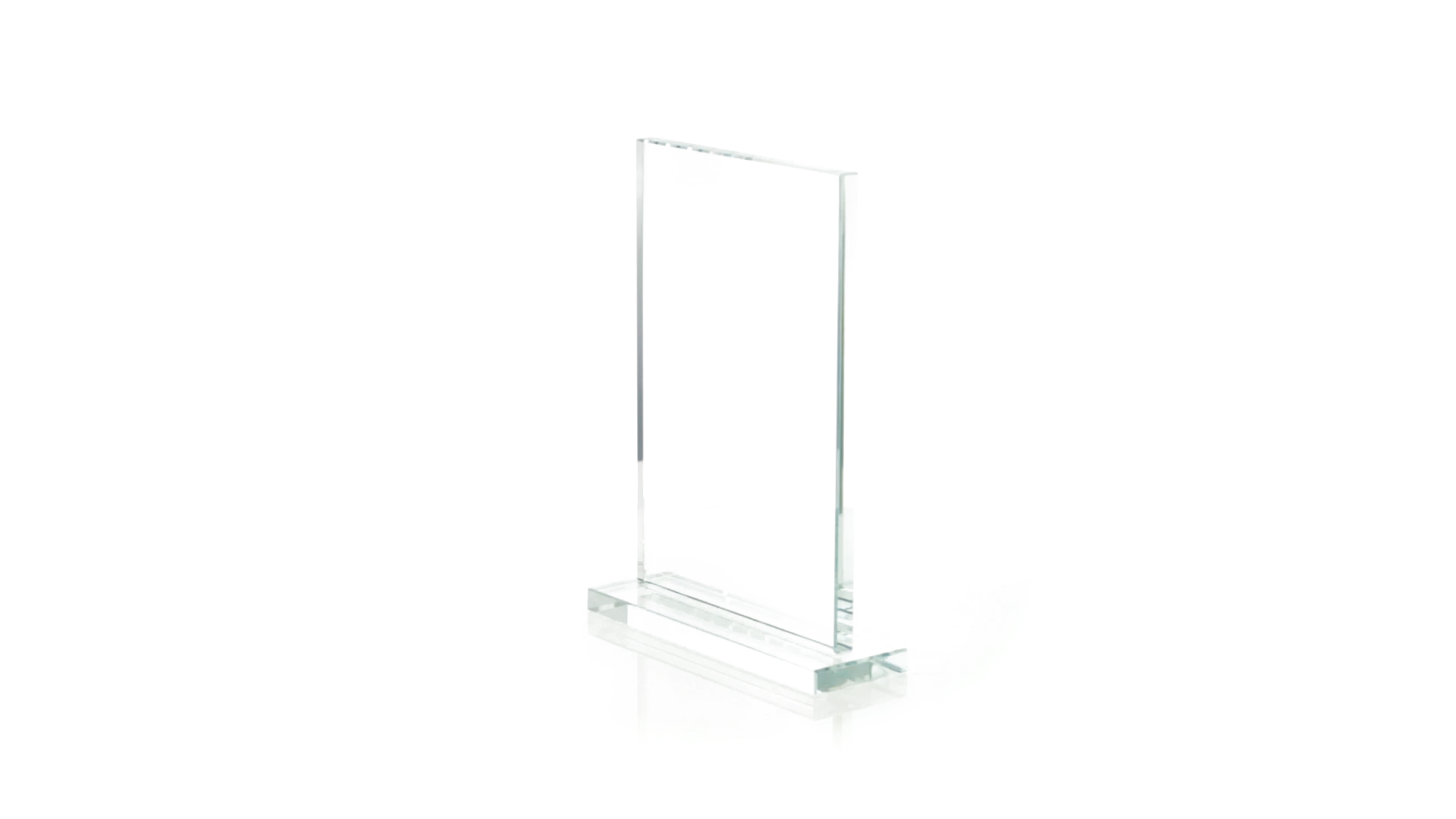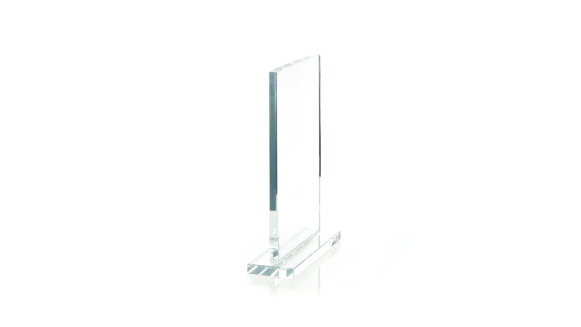 Trophäe aus dickem Glas mit elegantem rechteckigem Design und robustem Standbein. Speziell für den Laserdruck entwickelt. Präsentiert in einem individuellen Schutzcase.