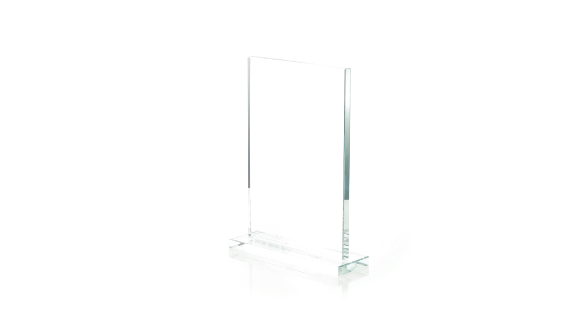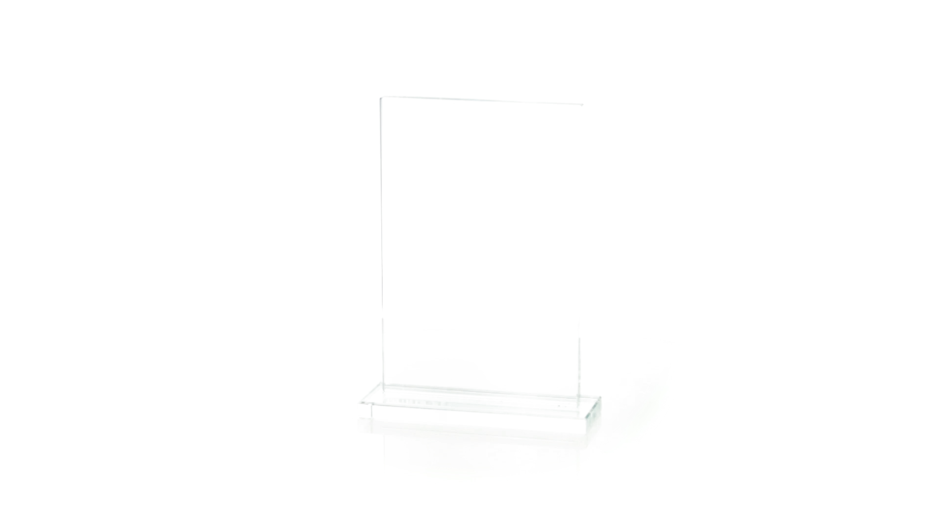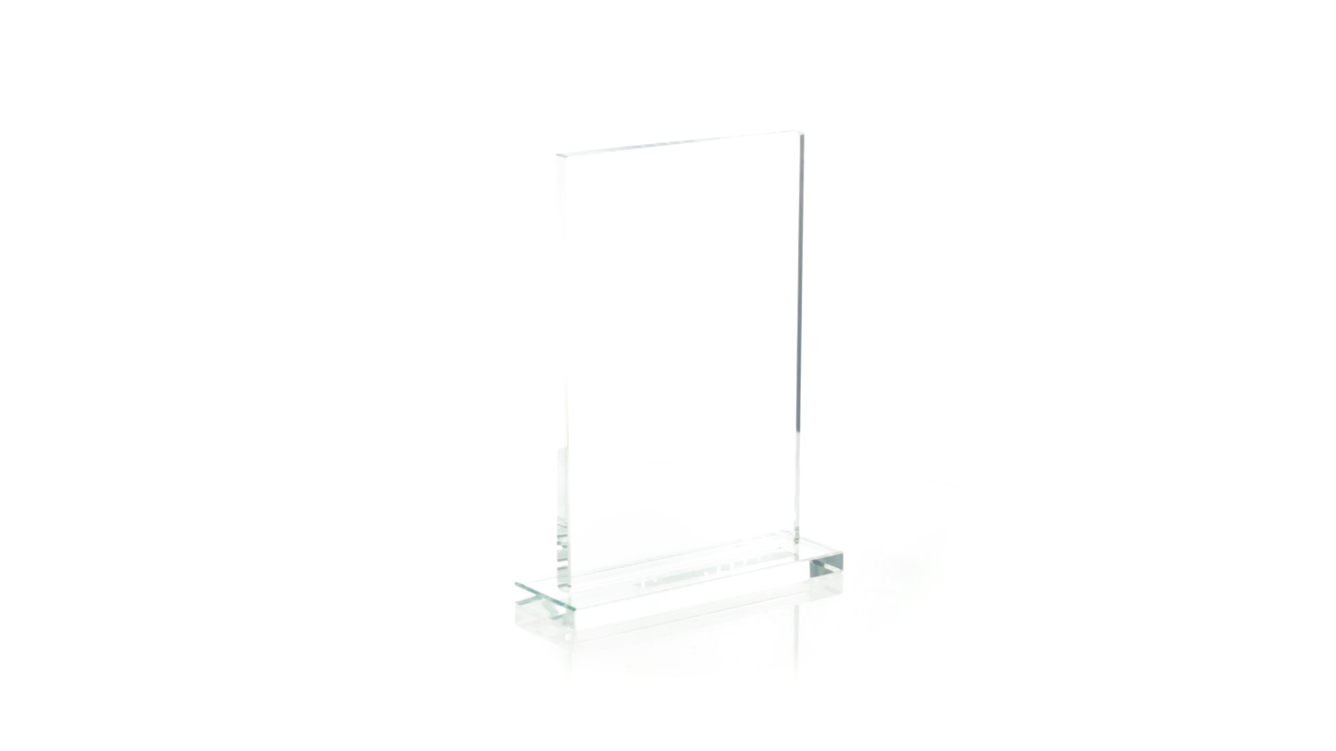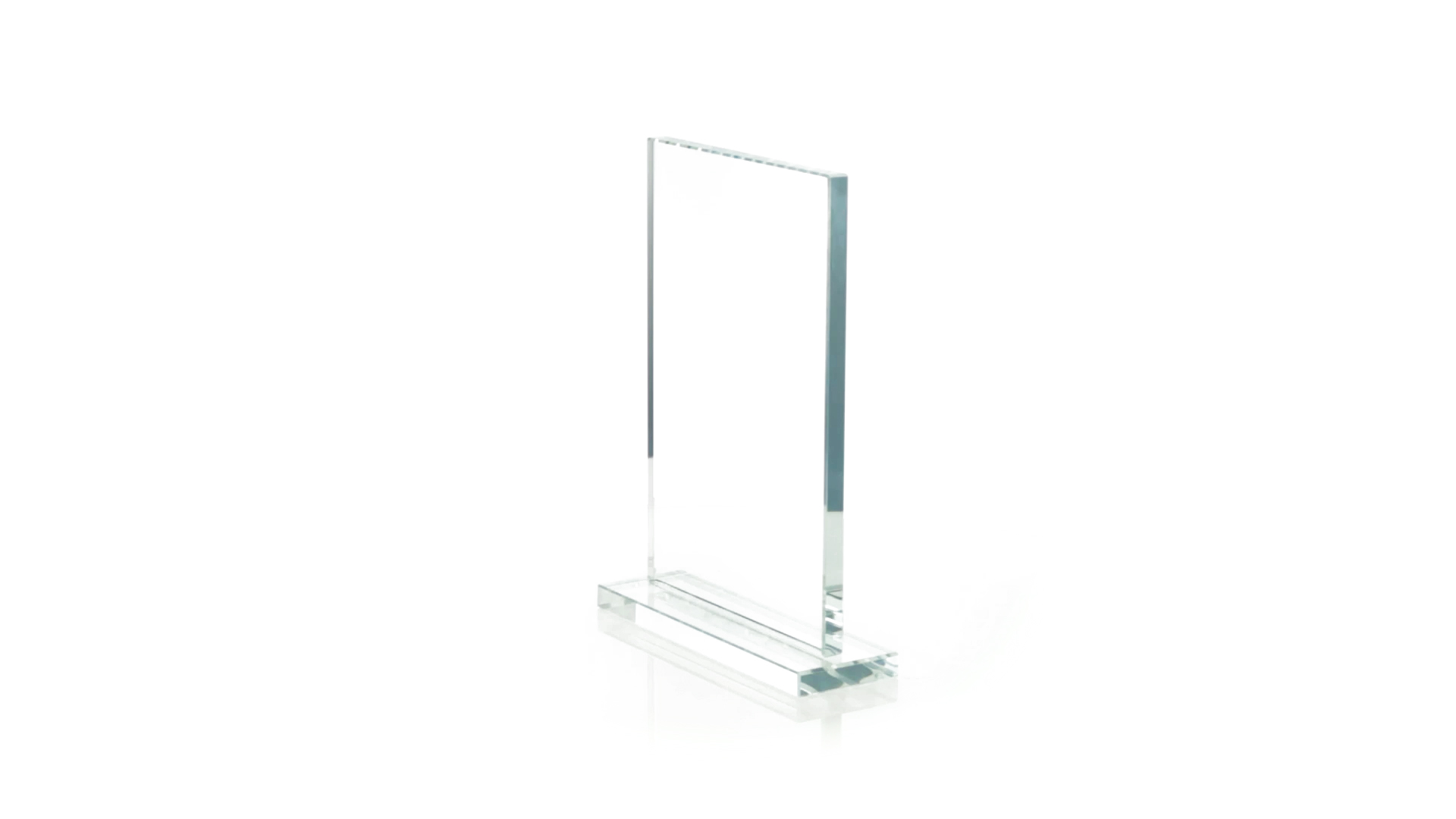 Trophäe aus dickem Glas mit elegantem rechteckigem Design und robustem Standbein. Speziell für den Laserdruck entwickelt. Präsentiert in einem individuellen Schutzcase.