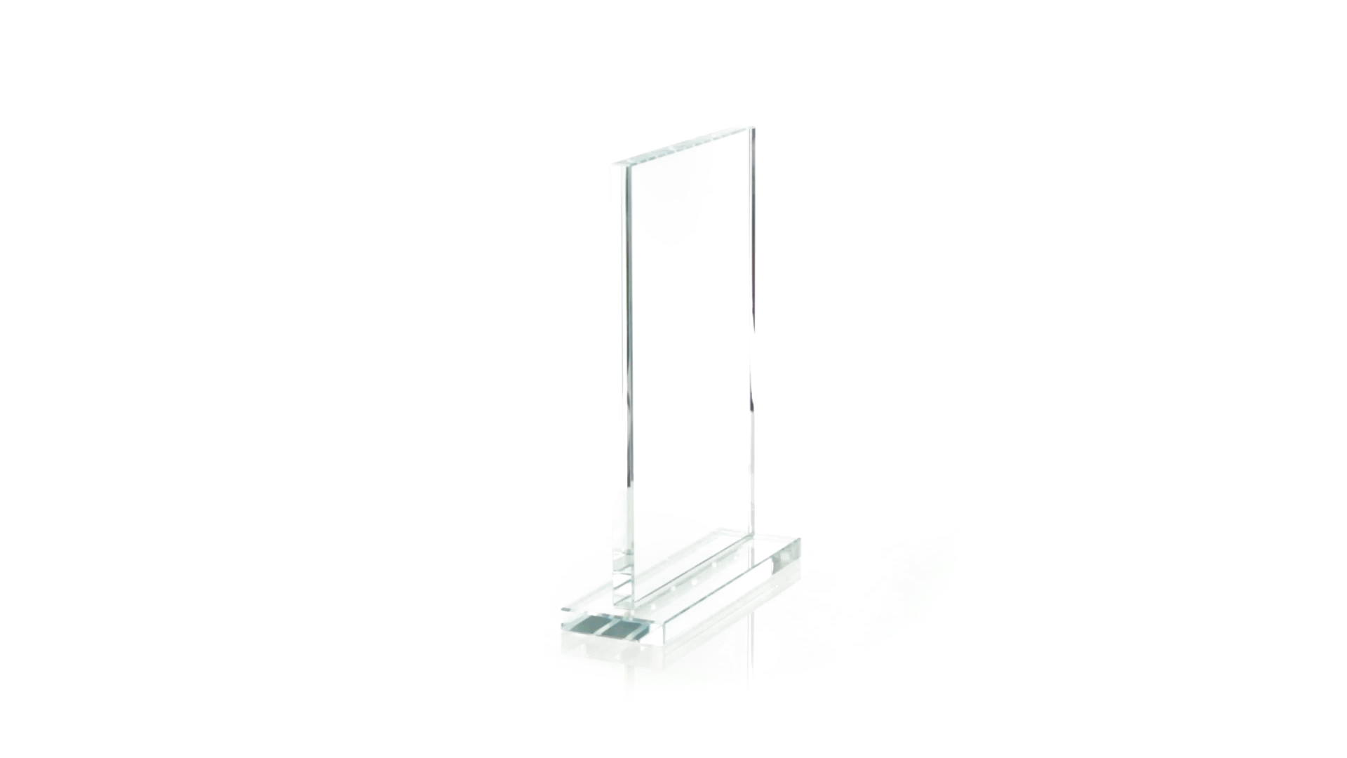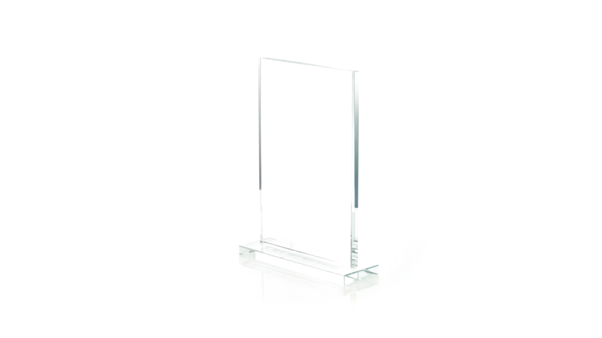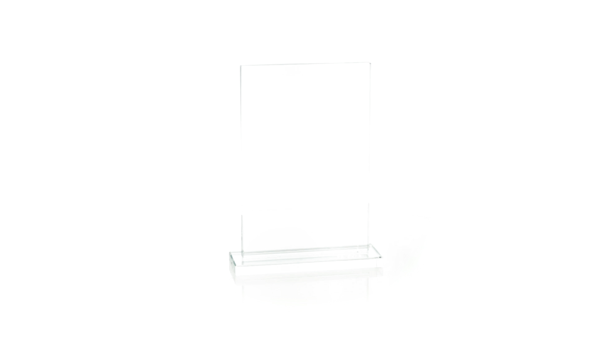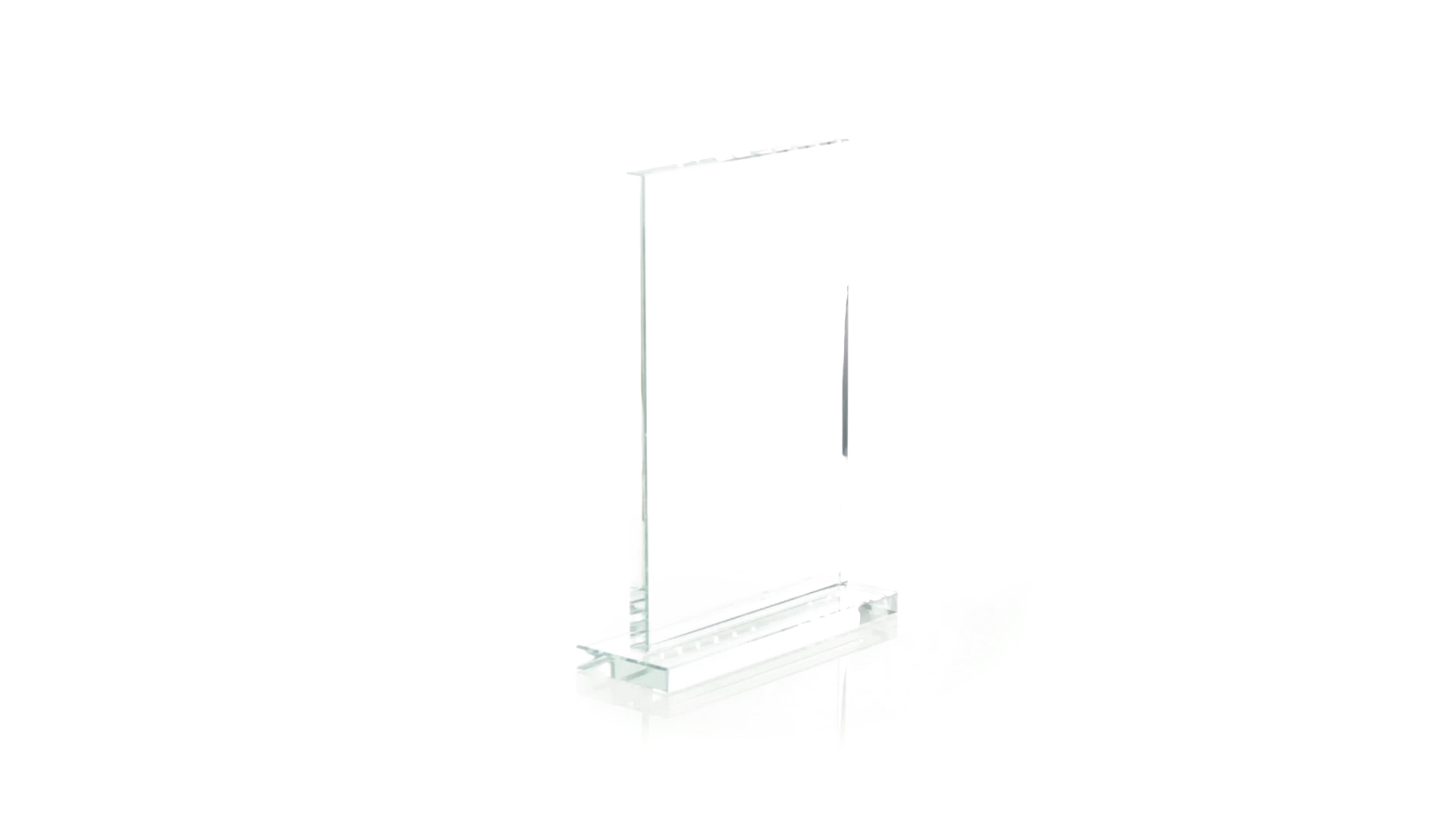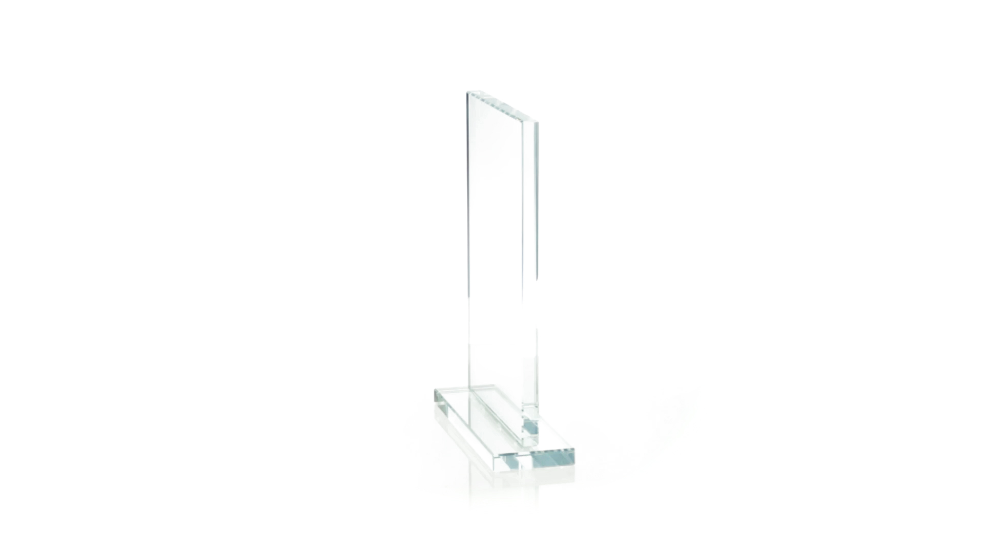Trophäe aus dickem Glas mit elegantem rechteckigem Design und robustem Standbein. Speziell für den Laserdruck entwickelt. Präsentiert in einem individuellen Schutzcase.