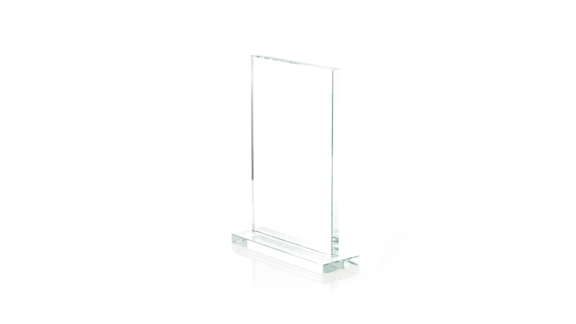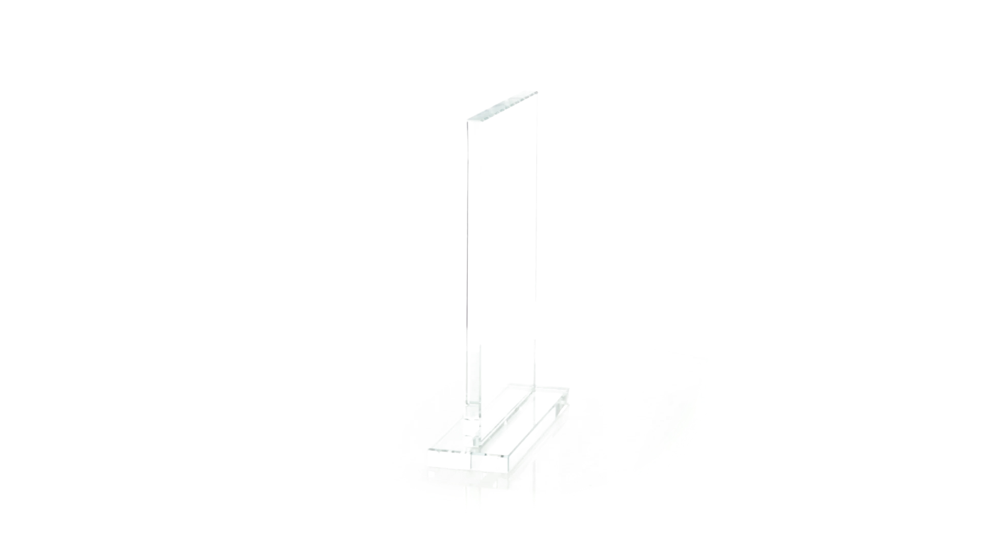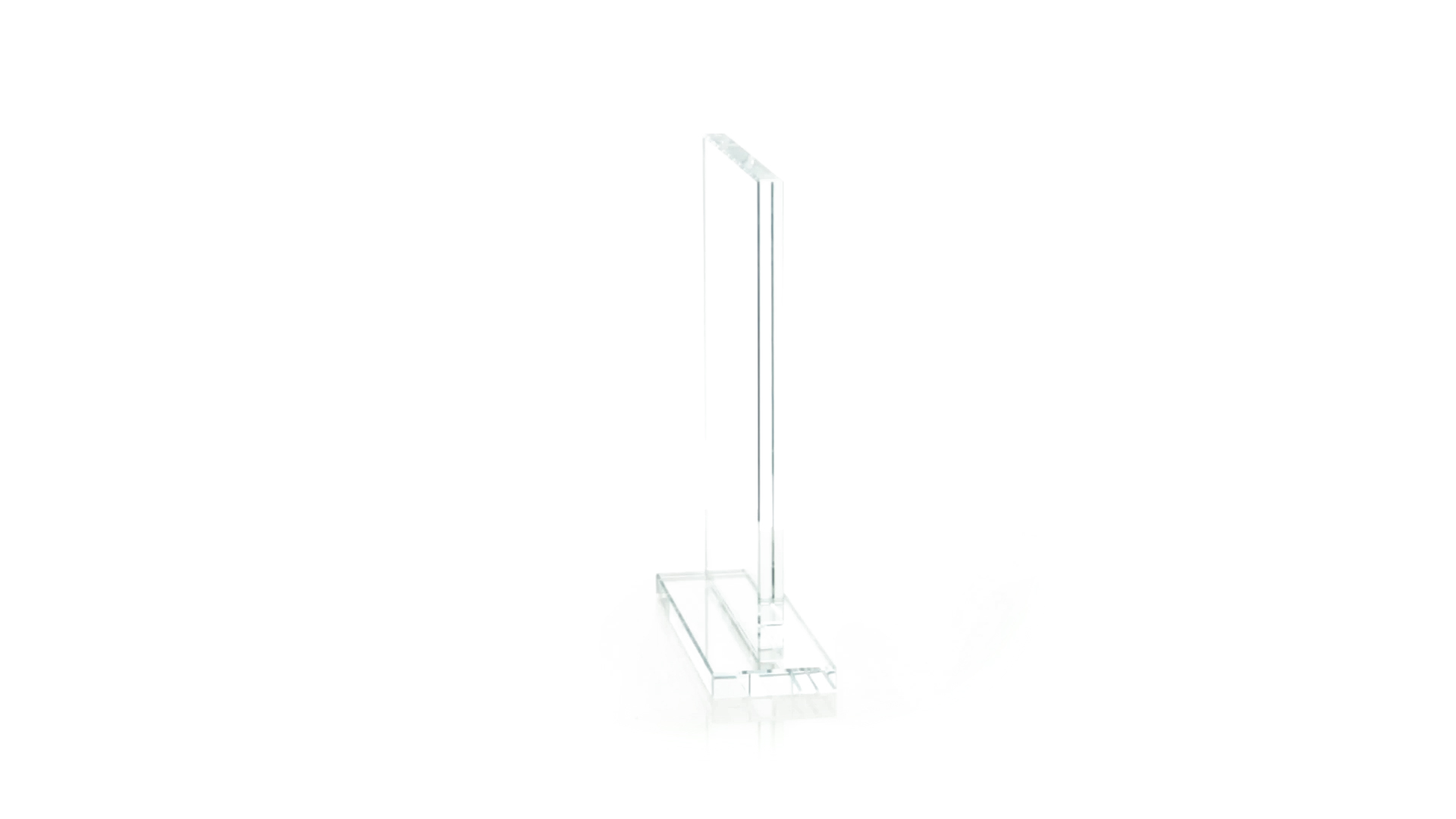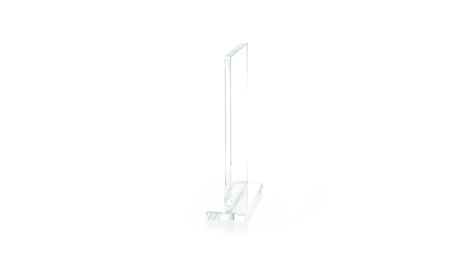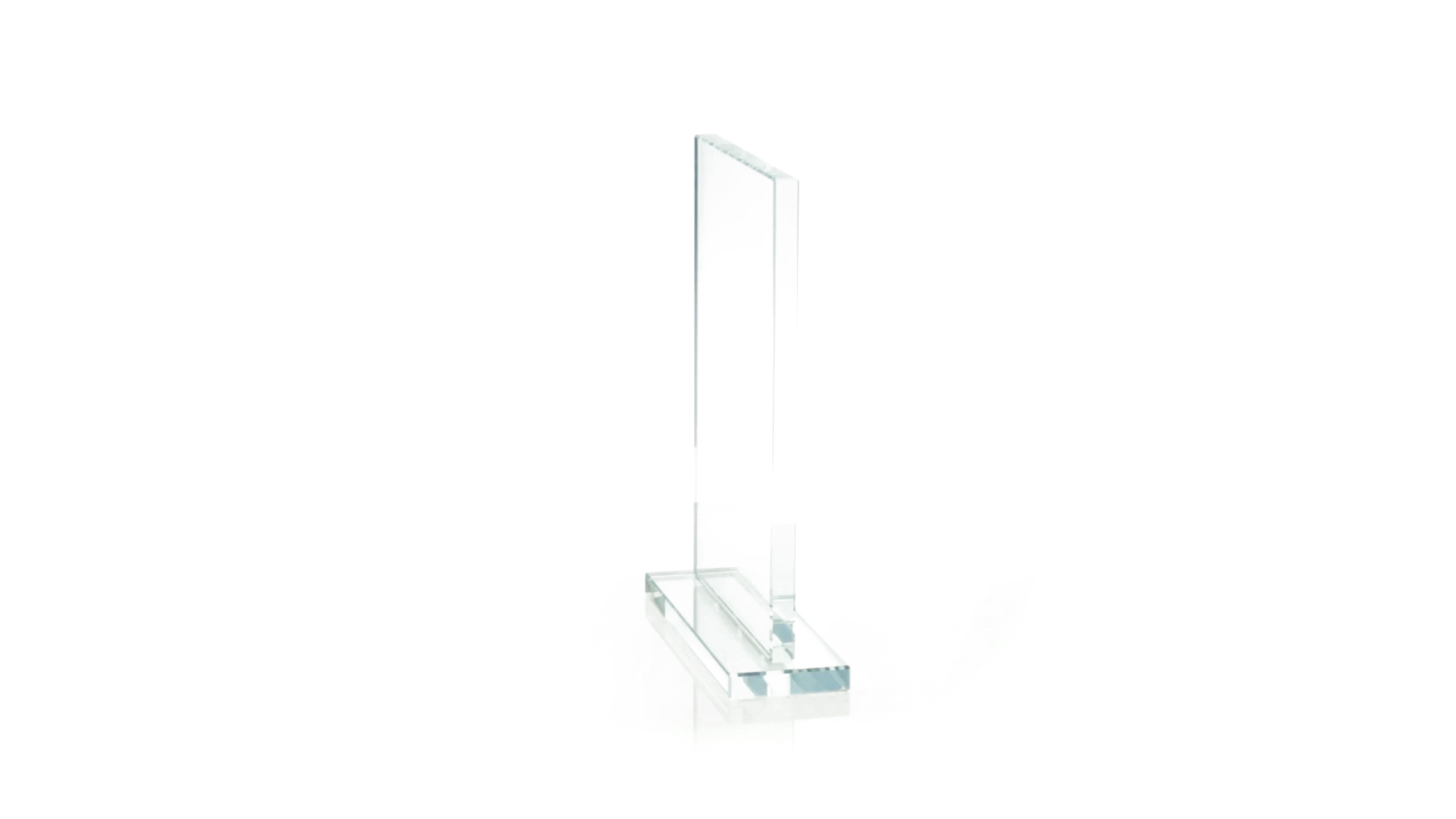 Trophäe aus dickem Glas mit elegantem rechteckigem Design und robustem Standbein. Speziell für den Laserdruck entwickelt. Präsentiert in einem individuellen Schutzcase.