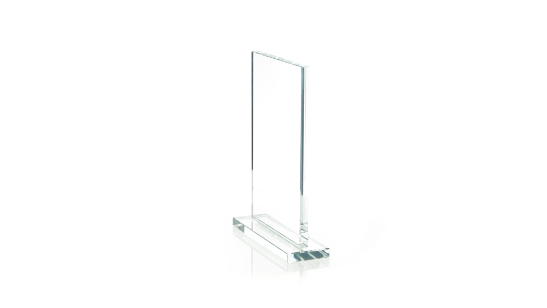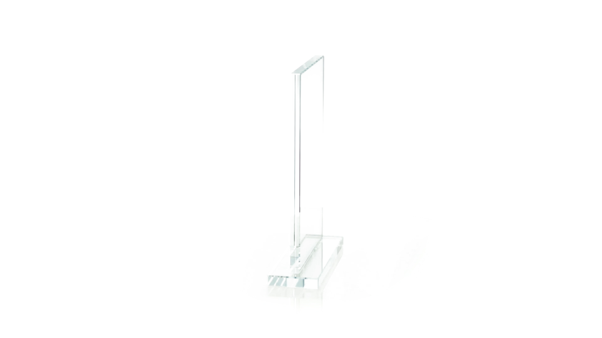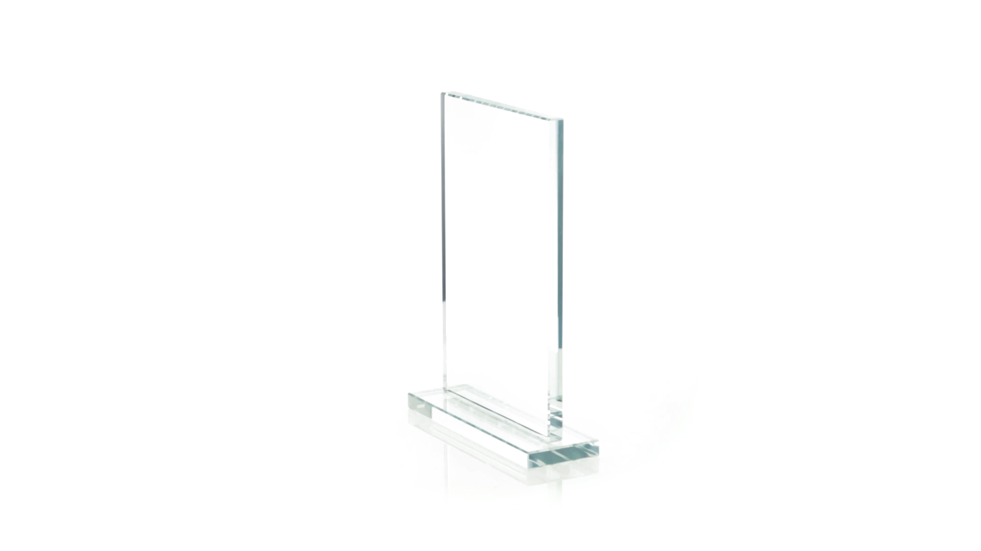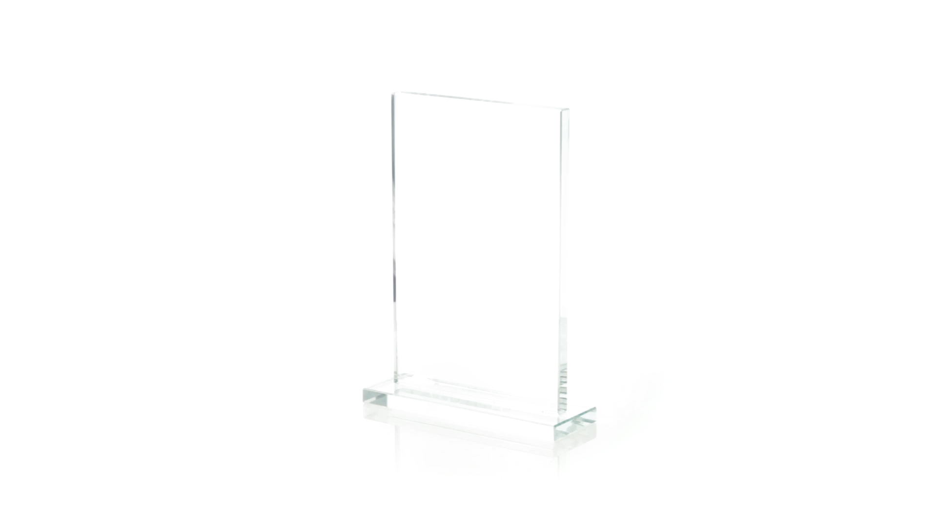 Trophäe aus dickem Glas mit elegantem rechteckigem Design und robustem Standbein. Speziell für den Laserdruck entwickelt. Präsentiert in einem individuellen Schutzcase.