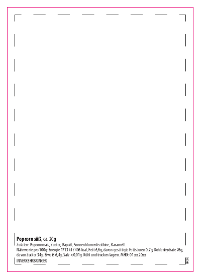 Die Werbeanbringung erfolgt ueber ein individuell gestaltbares Etikett, das 4-farbig (4c) bedruckbar ist. Logos, Claims oder kreative Designs lassen sich hochwertig umsetzen und verwandeln das Popcorn in einen wirkungsvollen Werbeartikel mit Genussfaktor.