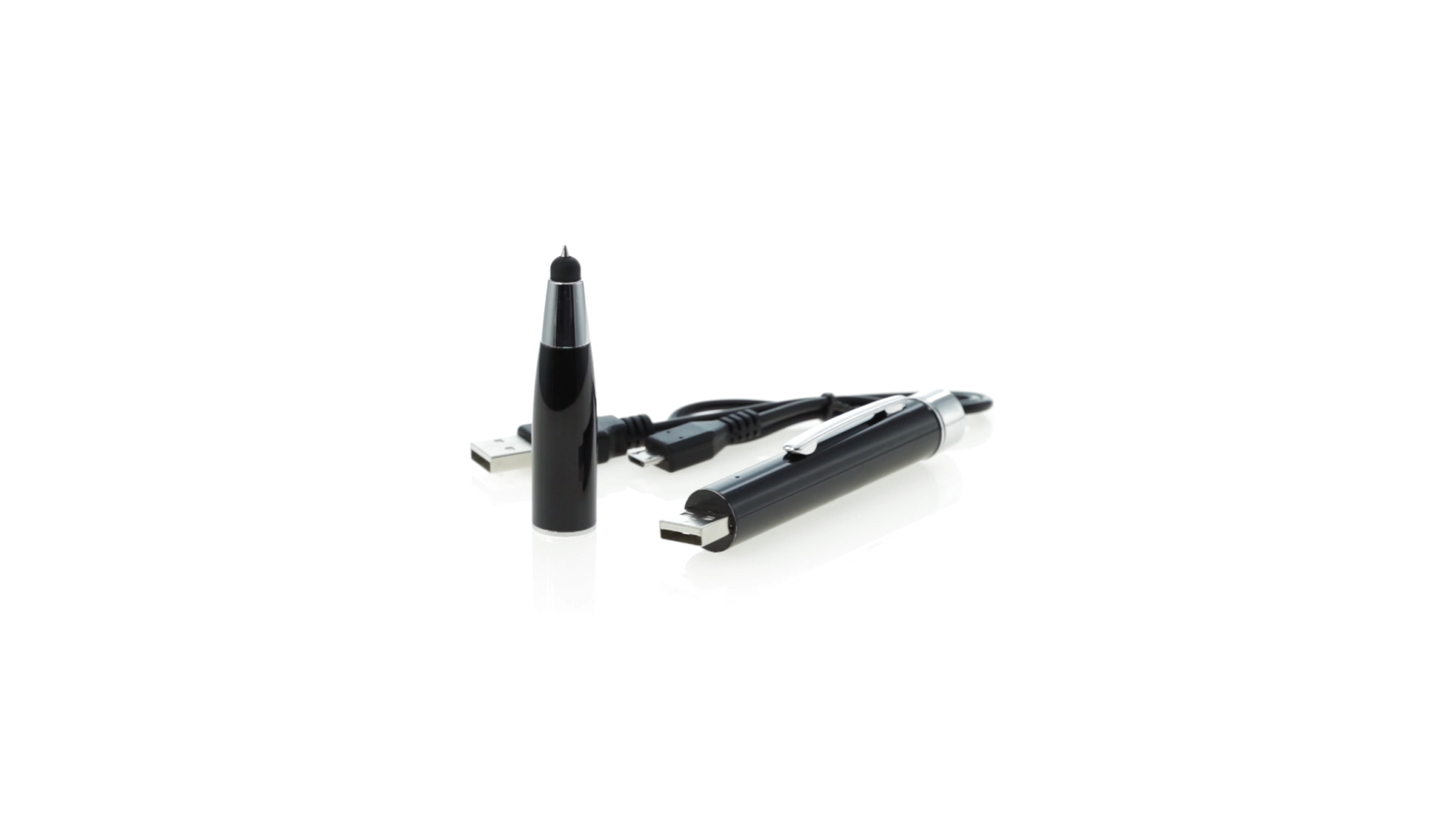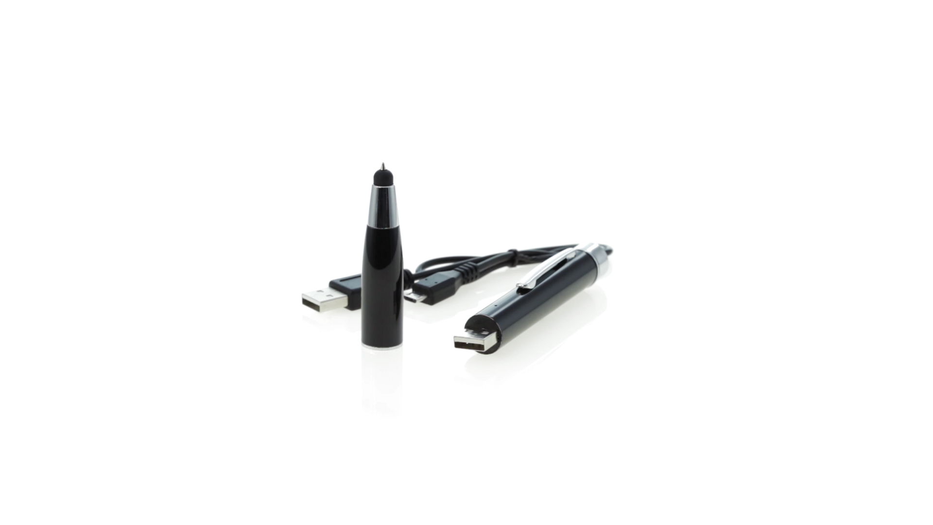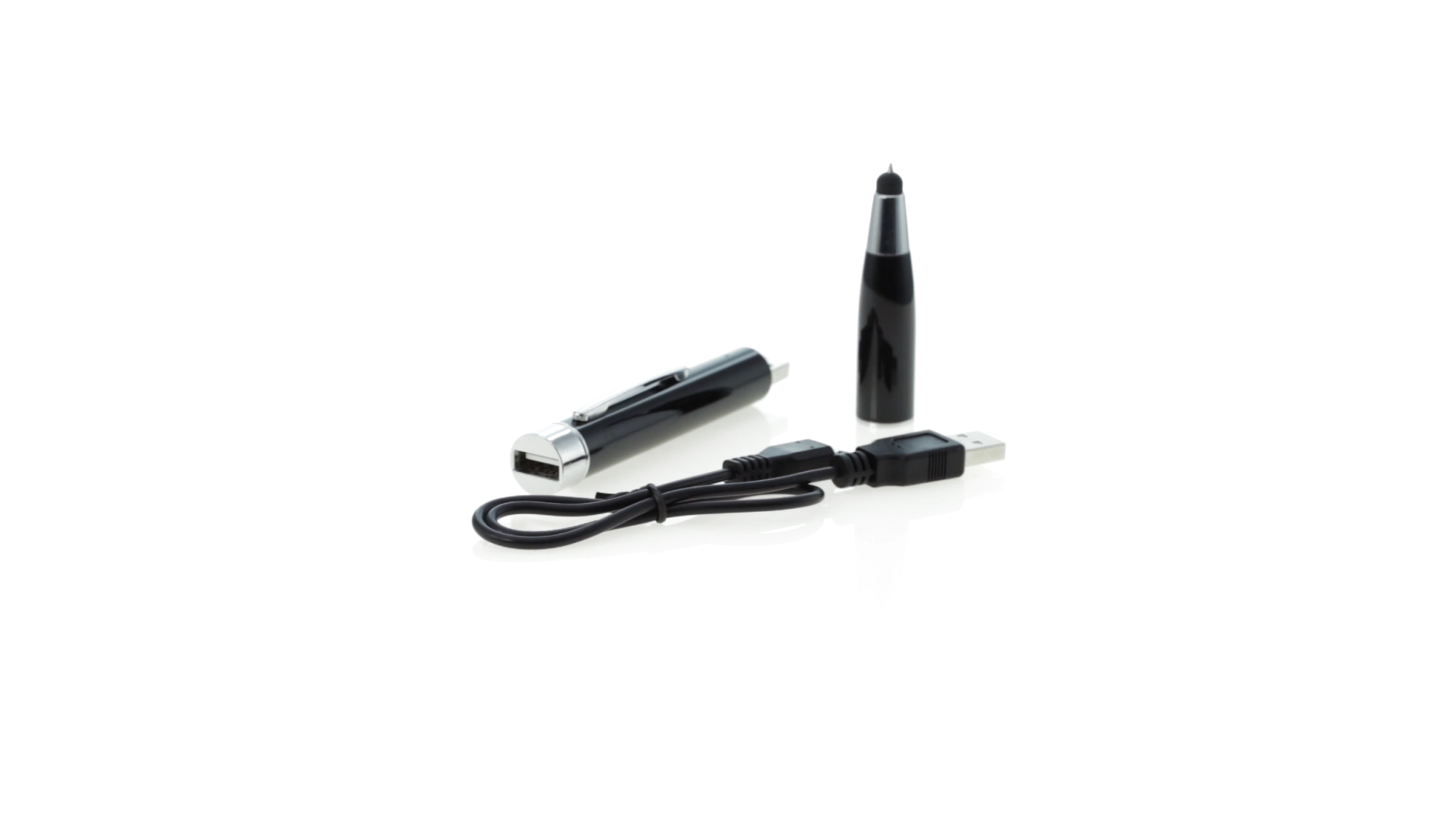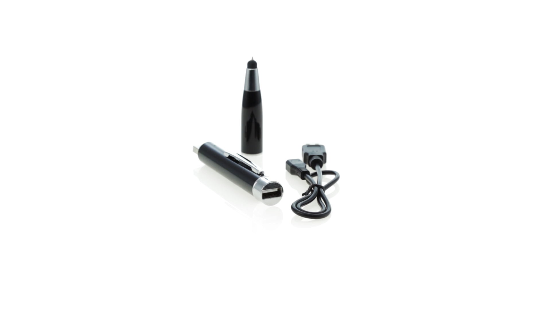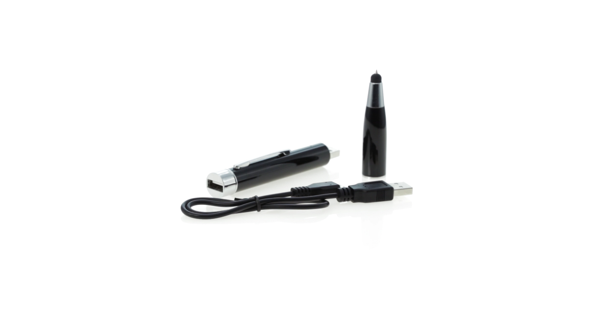 Multifunktioneller Dreh-Kugelschreiber mit externem Akku mit 650 mAh Ladekapazität und weichem Gummi-Stylus. Micro-USB-Kabel inklusive. Mit schwarzer Tinte. Präsentiert in einer attraktiven Designbox.