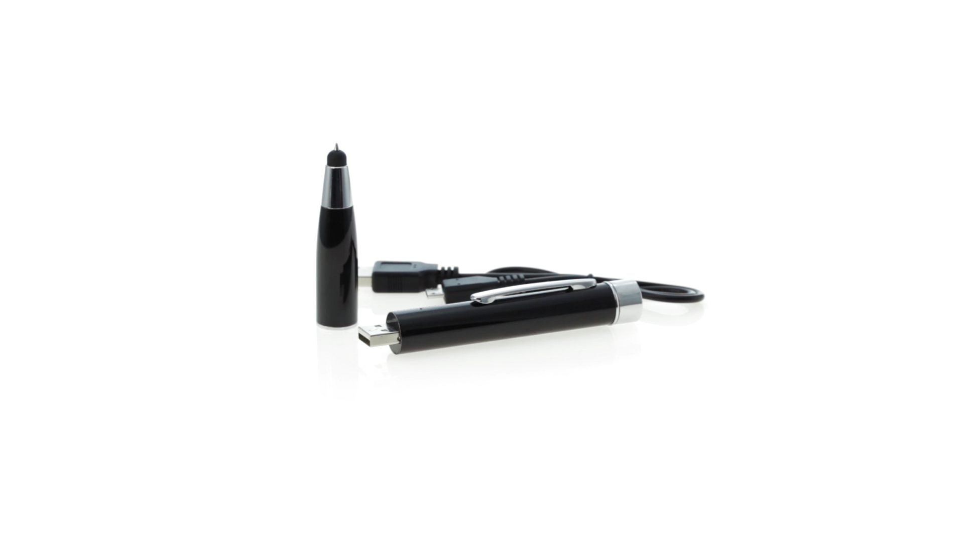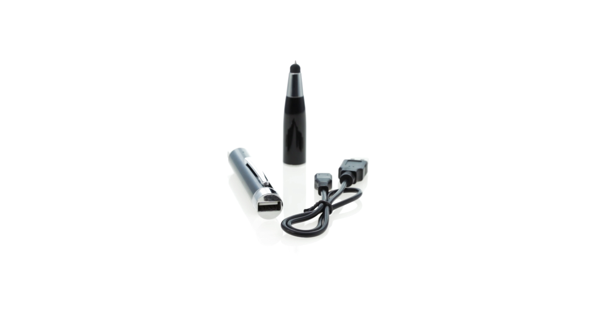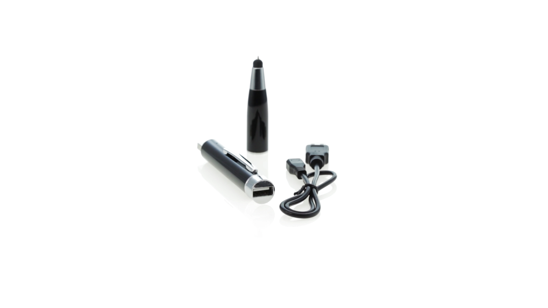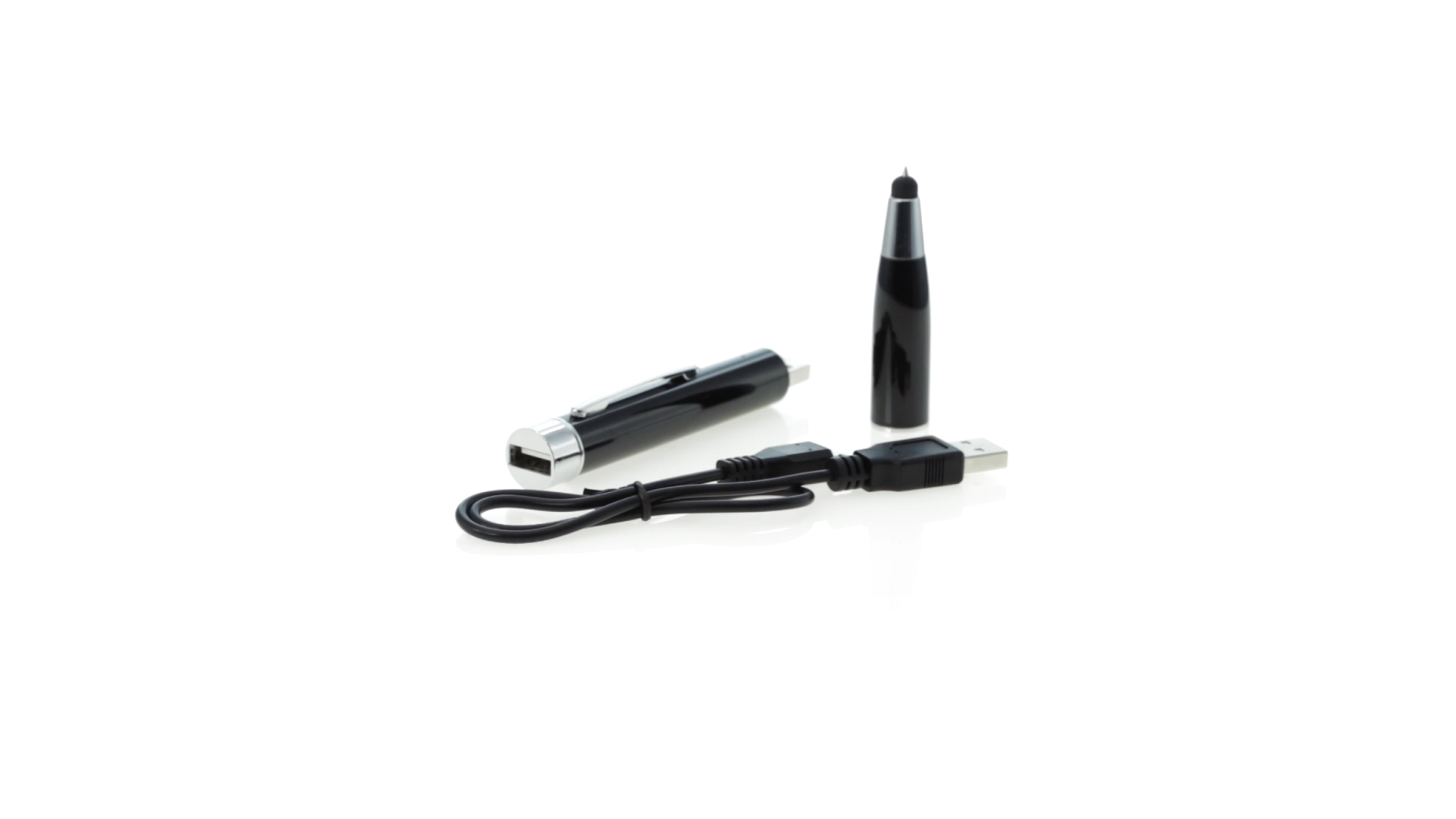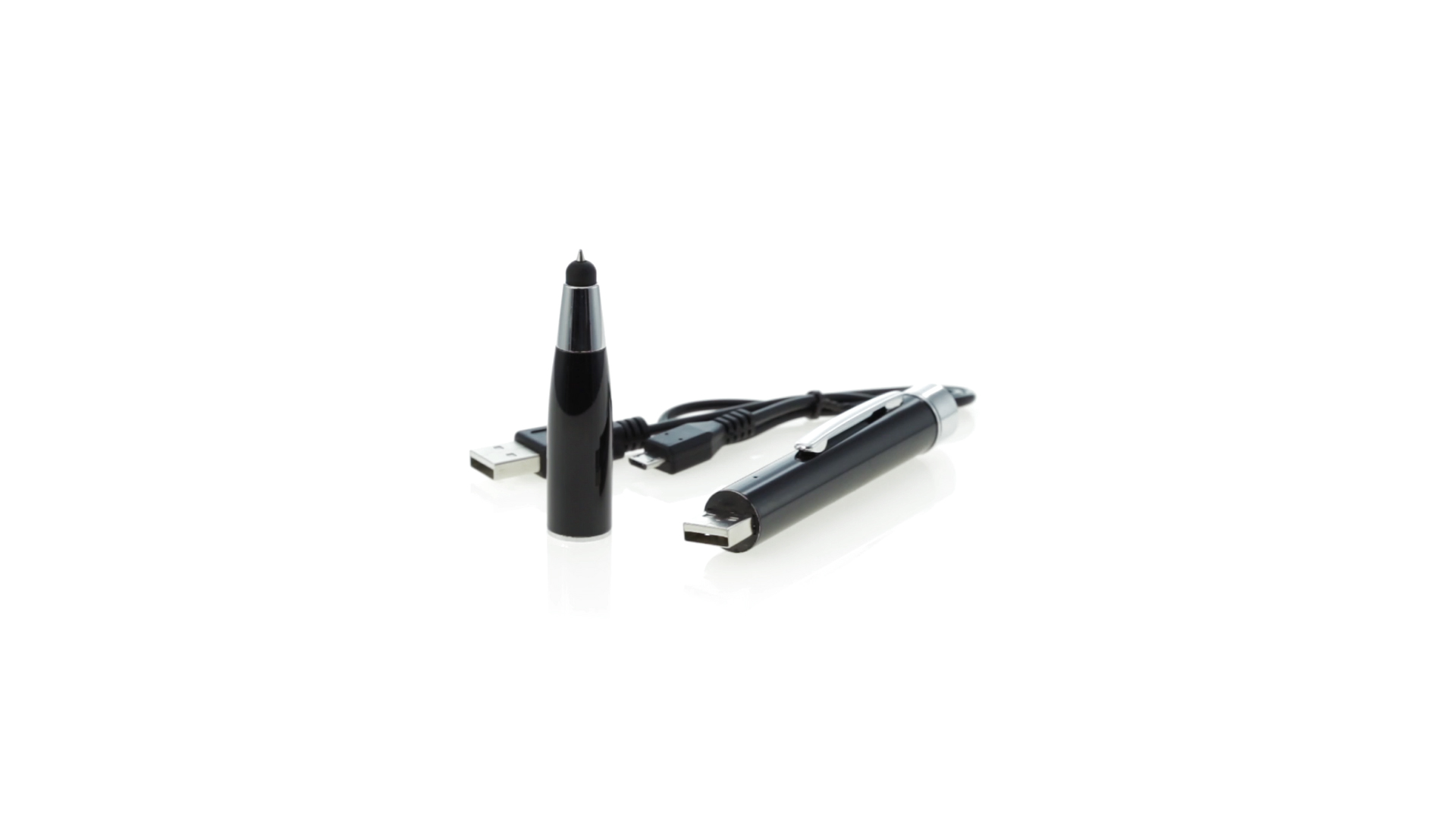 Multifunktioneller Dreh-Kugelschreiber mit externem Akku mit 650 mAh Ladekapazität und weichem Gummi-Stylus. Micro-USB-Kabel inklusive. Mit schwarzer Tinte. Präsentiert in einer attraktiven Designbox.
