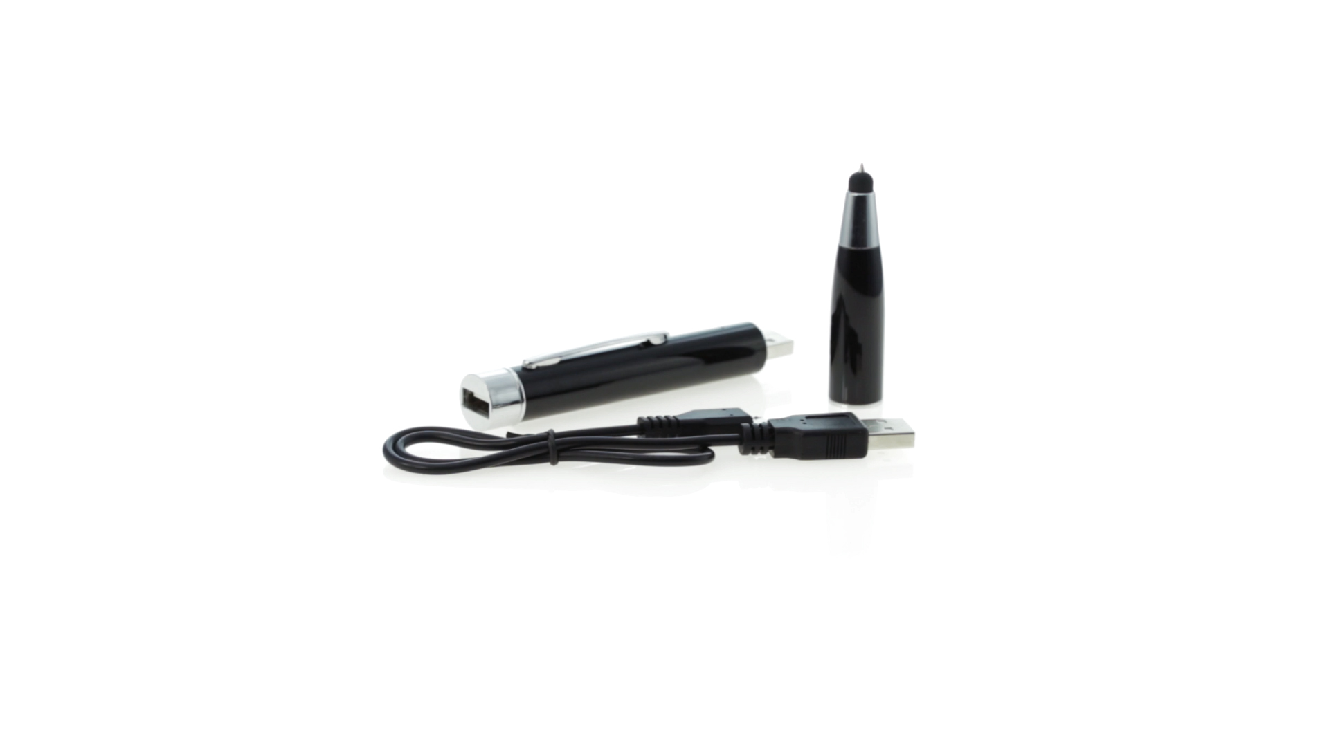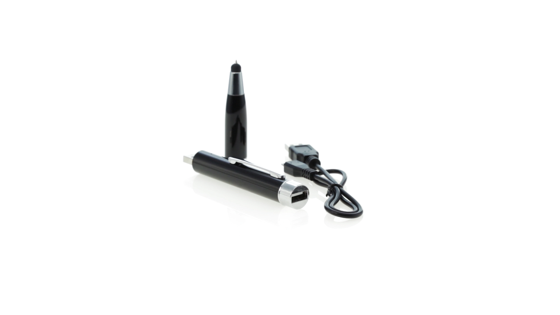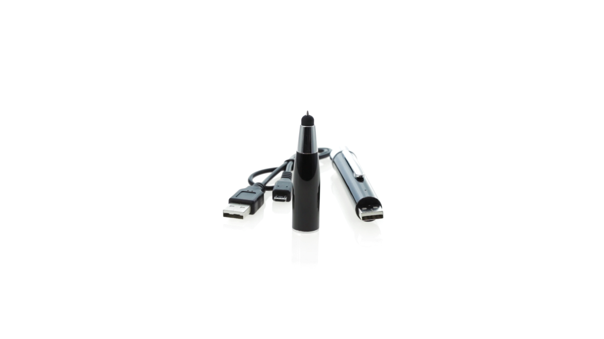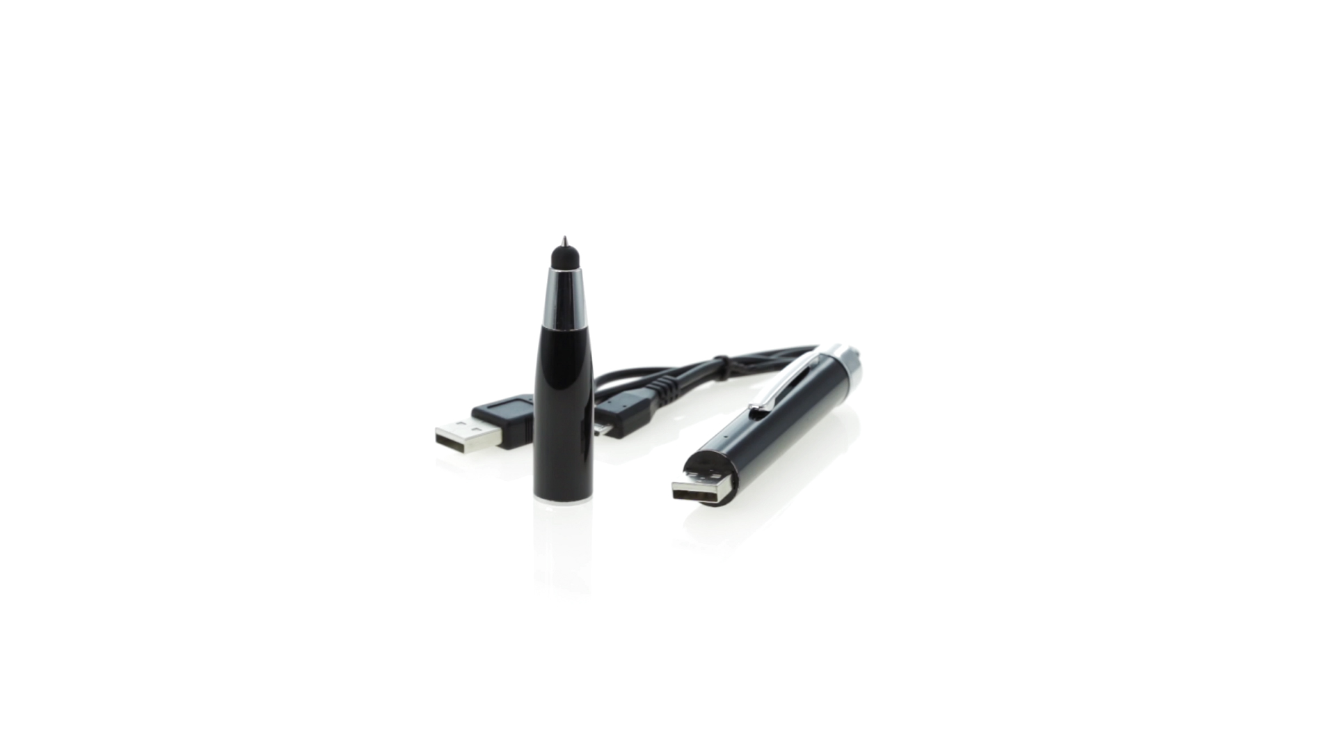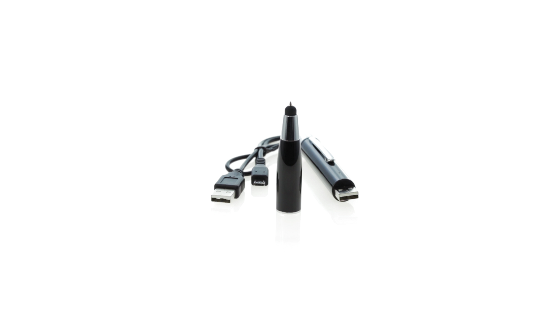 Multifunktioneller Dreh-Kugelschreiber mit externem Akku mit 650 mAh Ladekapazität und weichem Gummi-Stylus. Micro-USB-Kabel inklusive. Mit schwarzer Tinte. Präsentiert in einer attraktiven Designbox.