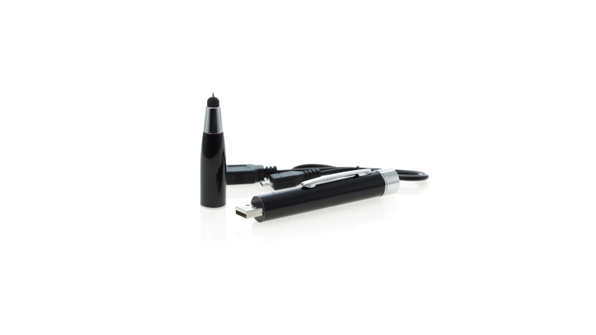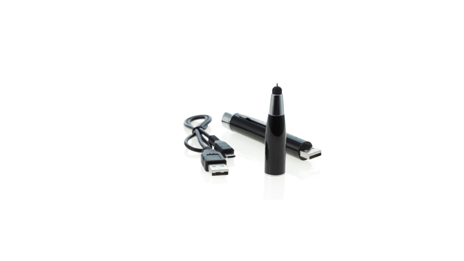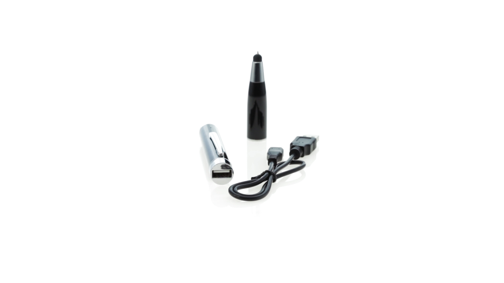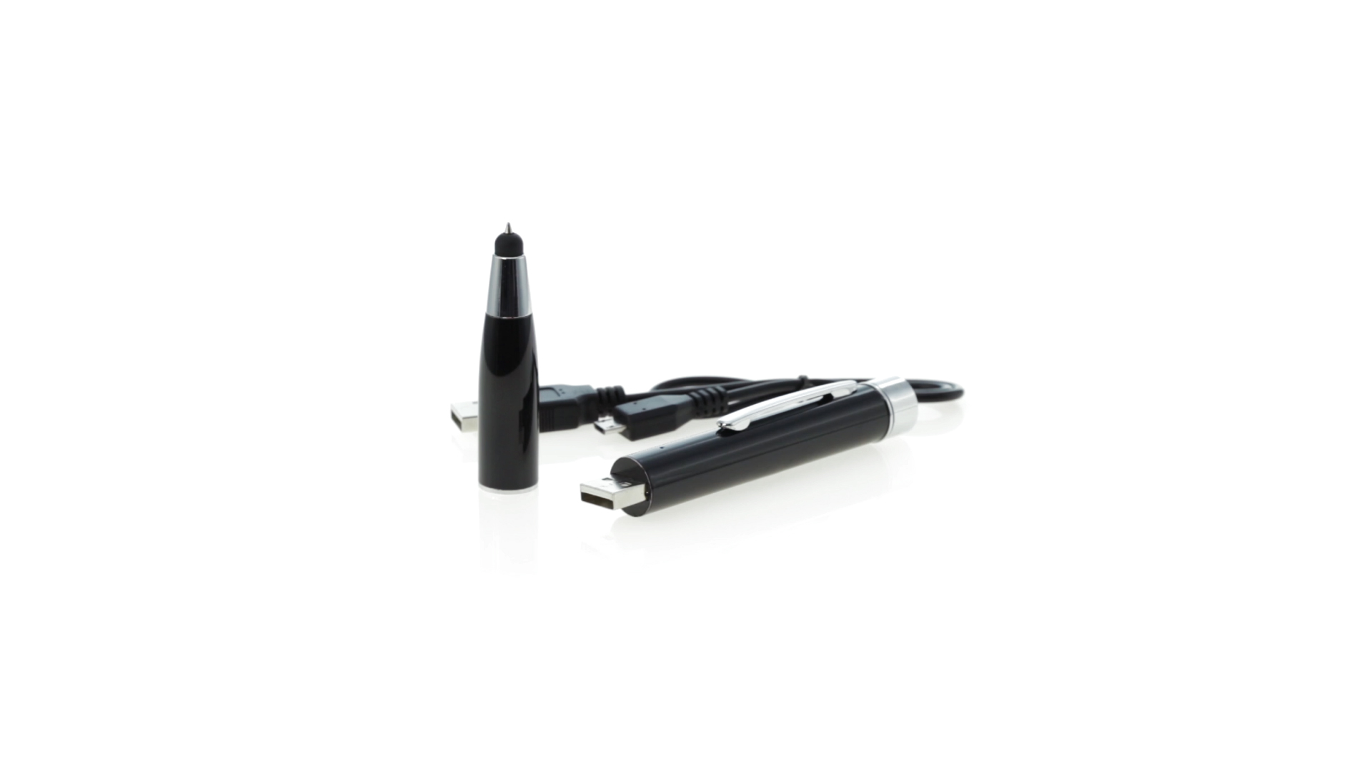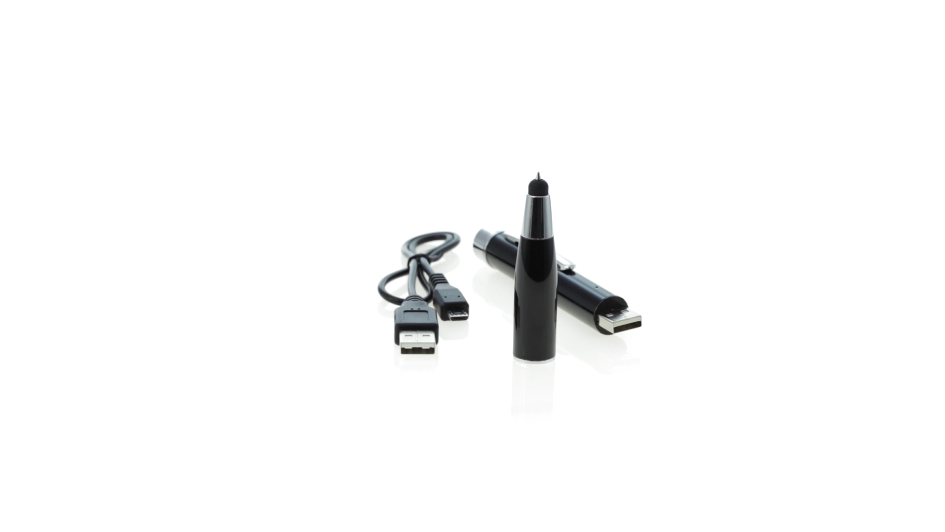 Multifunktioneller Dreh-Kugelschreiber mit externem Akku mit 650 mAh Ladekapazität und weichem Gummi-Stylus. Micro-USB-Kabel inklusive. Mit schwarzer Tinte. Präsentiert in einer attraktiven Designbox.