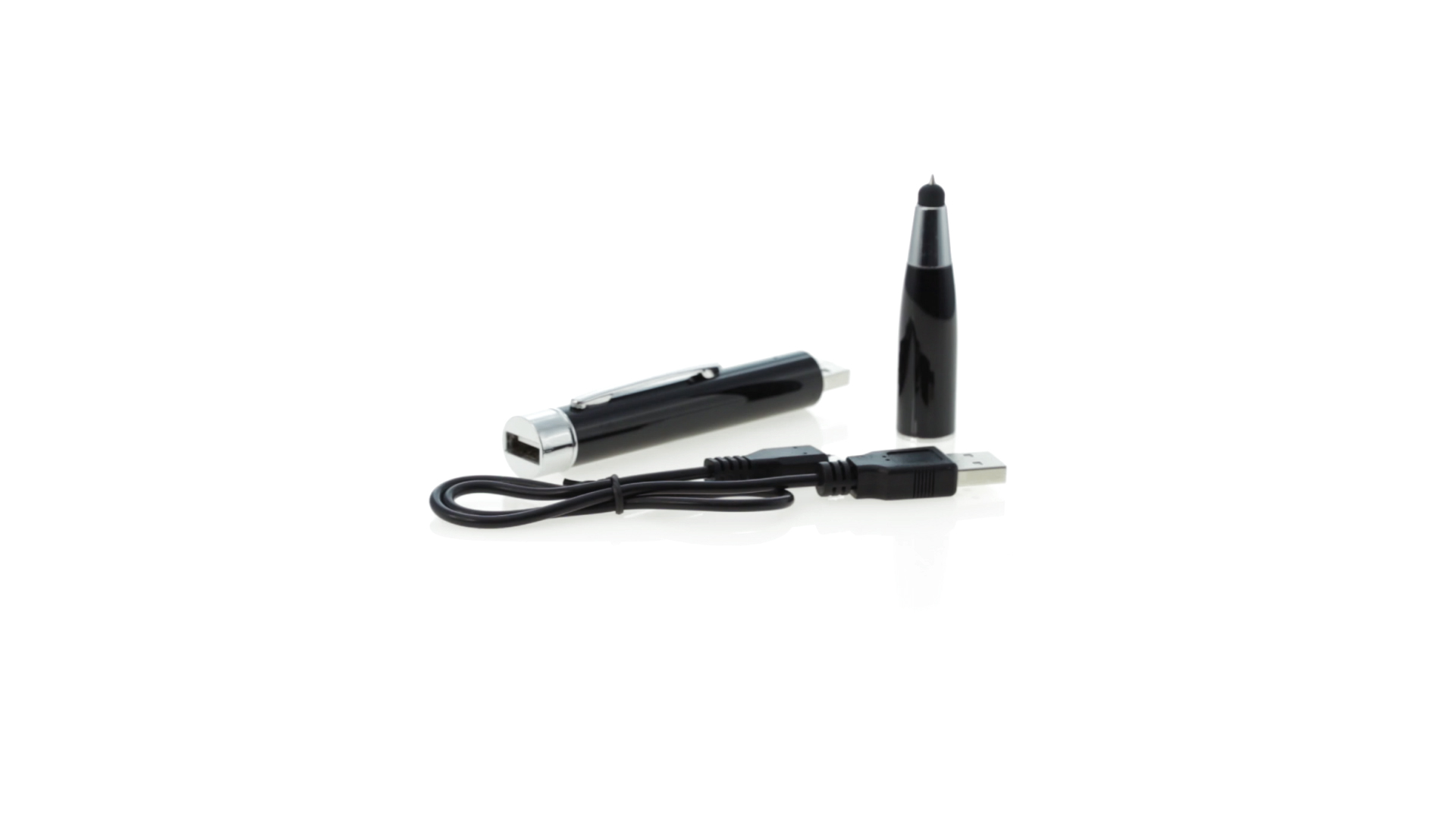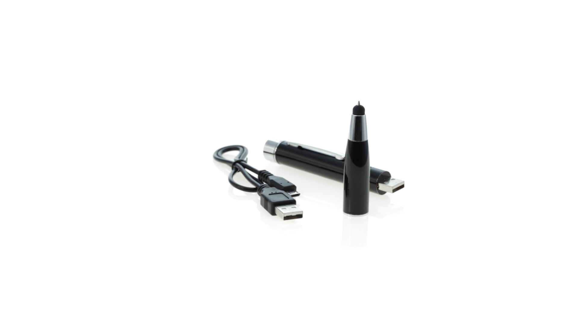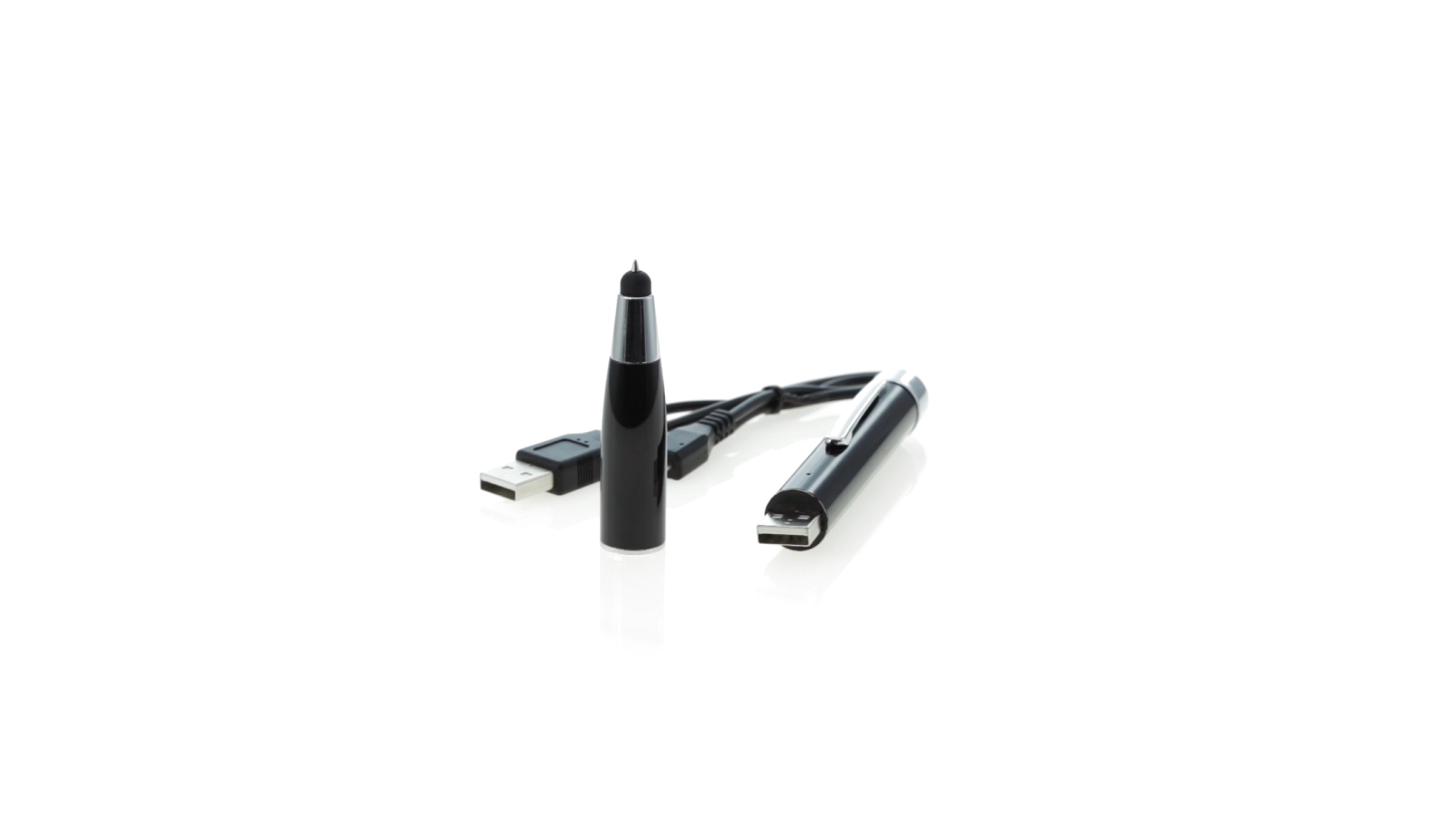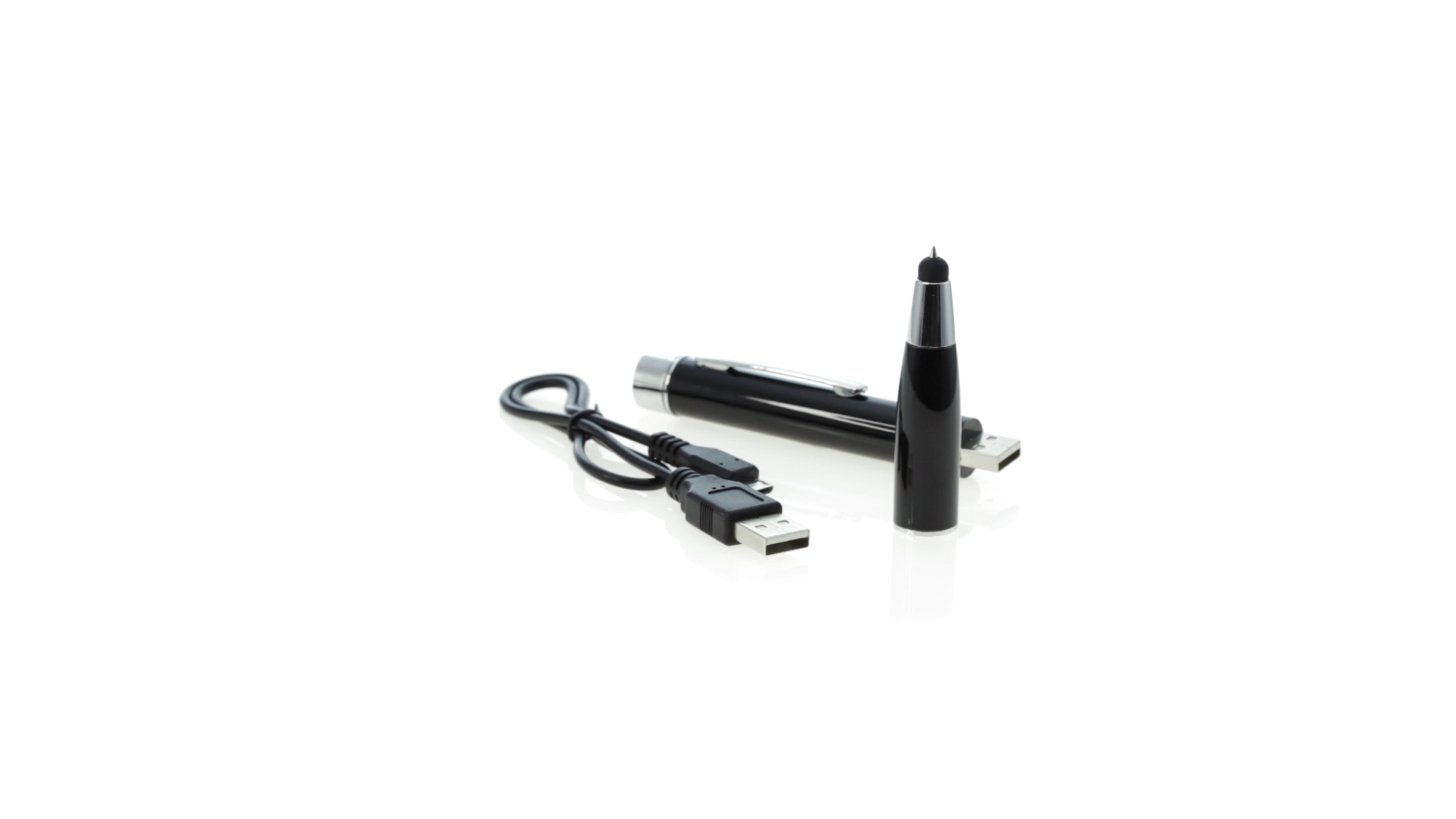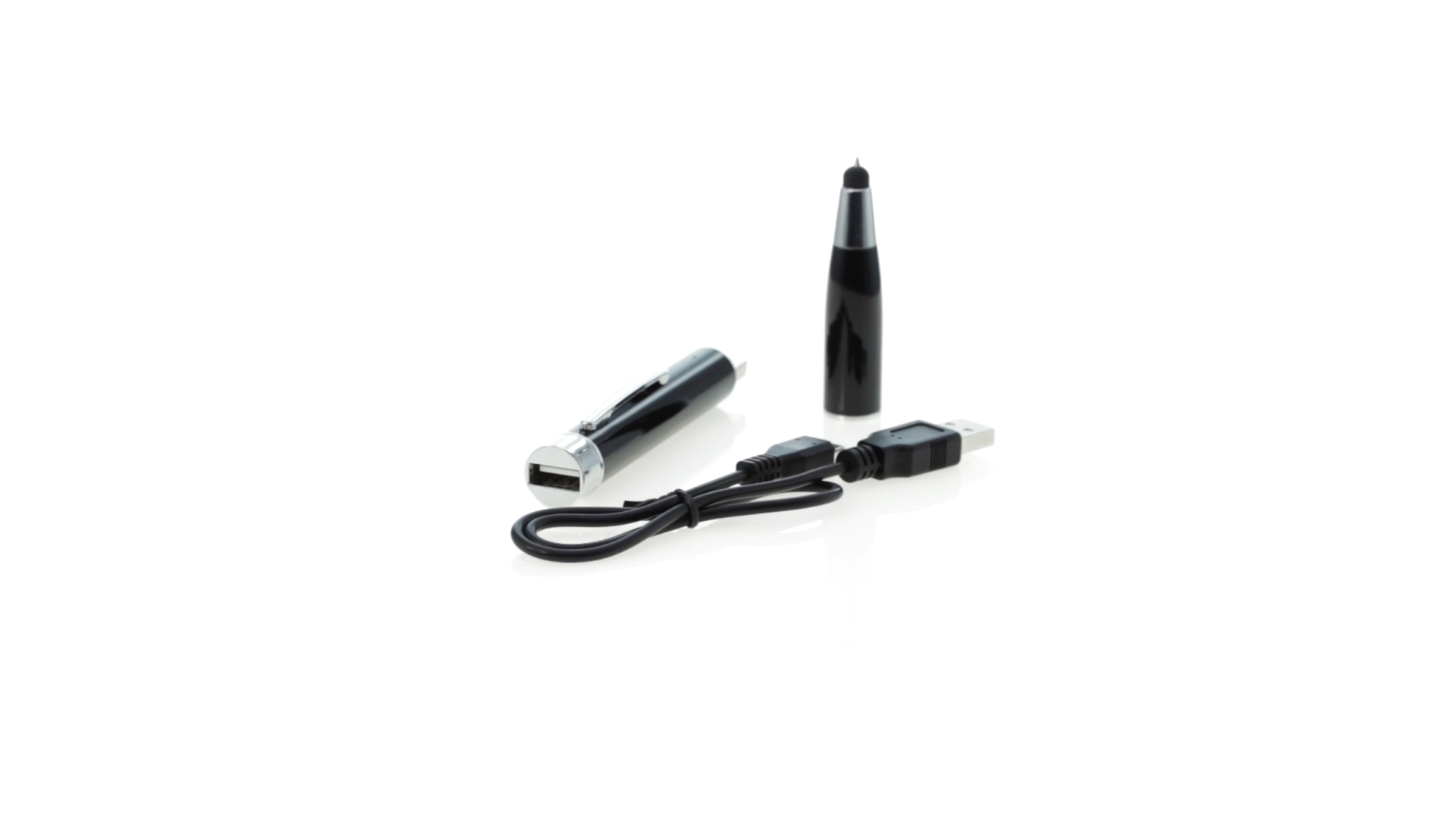 Multifunktioneller Dreh-Kugelschreiber mit externem Akku mit 650 mAh Ladekapazität und weichem Gummi-Stylus. Micro-USB-Kabel inklusive. Mit schwarzer Tinte. Präsentiert in einer attraktiven Designbox.