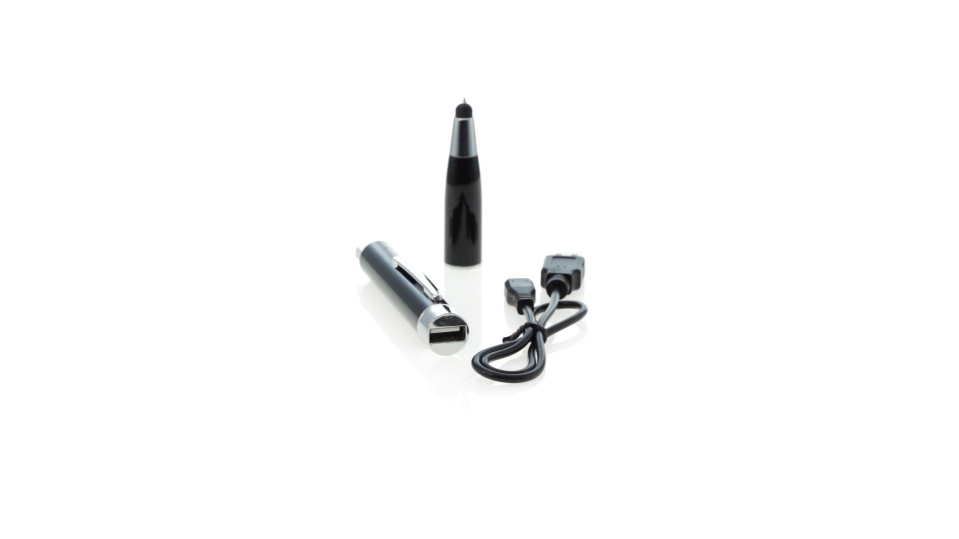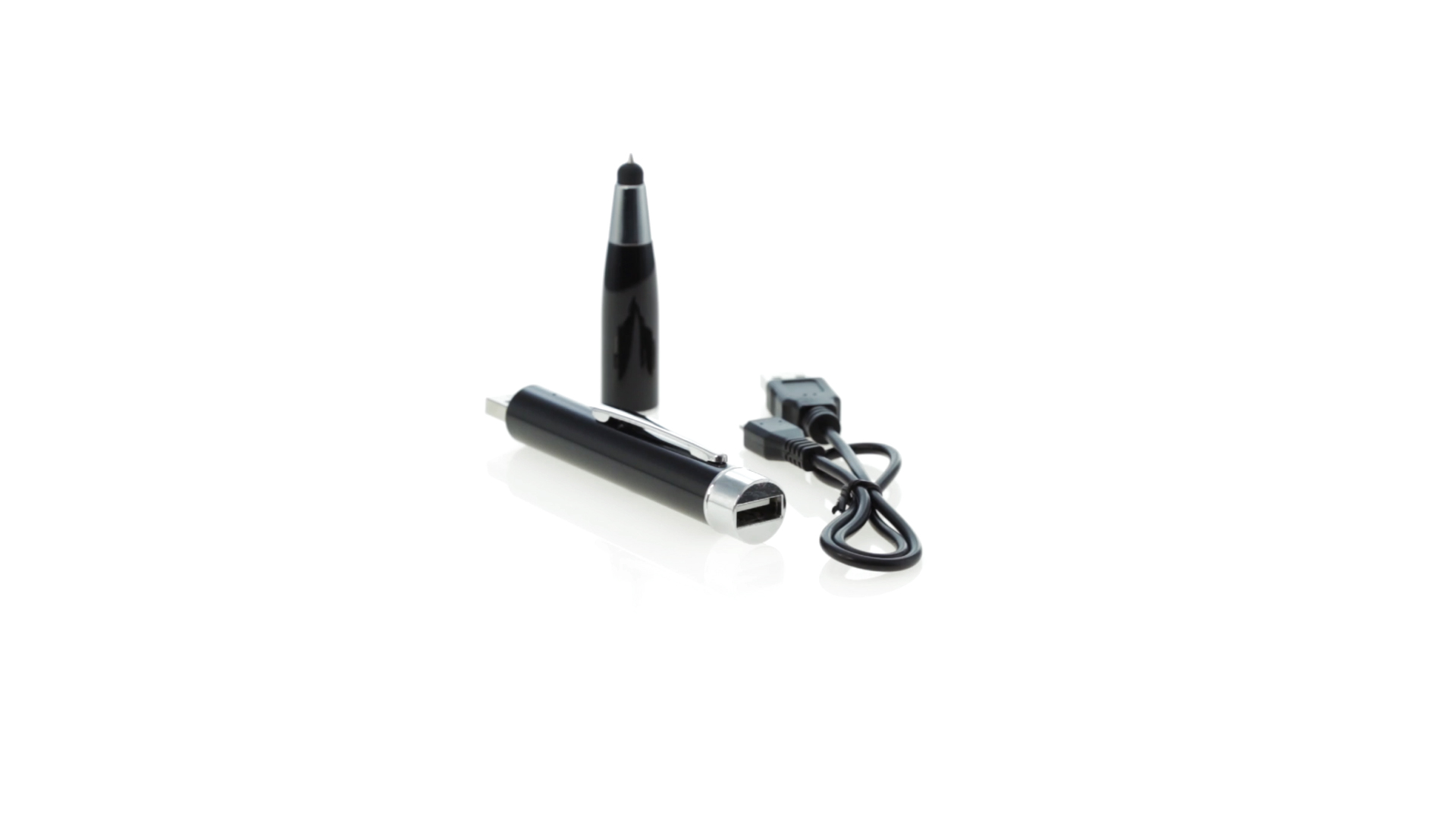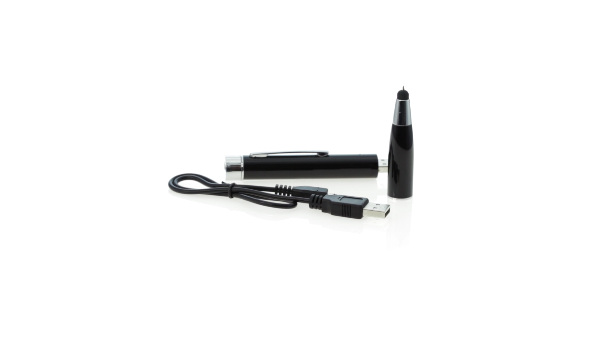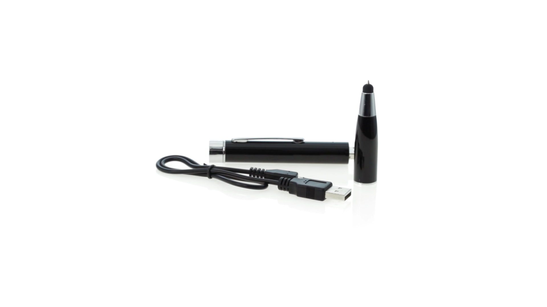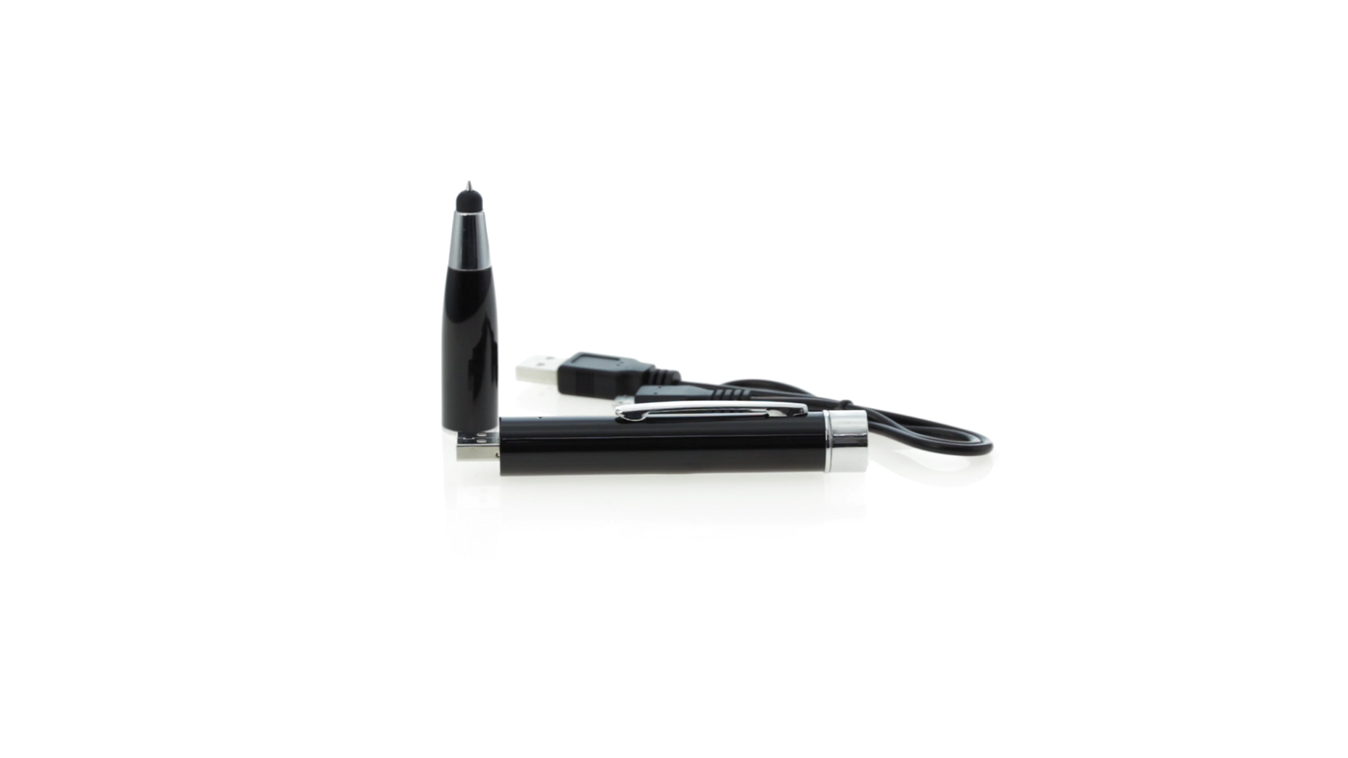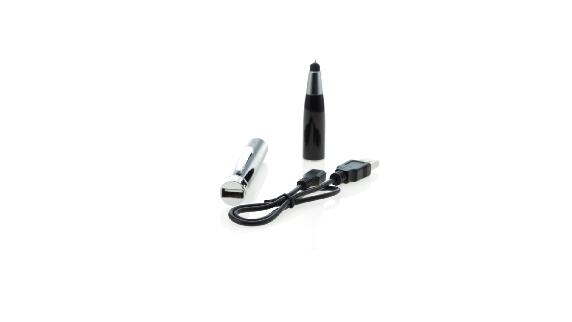 Multifunktioneller Dreh-Kugelschreiber mit externem Akku mit 650 mAh Ladekapazität und weichem Gummi-Stylus. Micro-USB-Kabel inklusive. Mit schwarzer Tinte. Präsentiert in einer attraktiven Designbox.