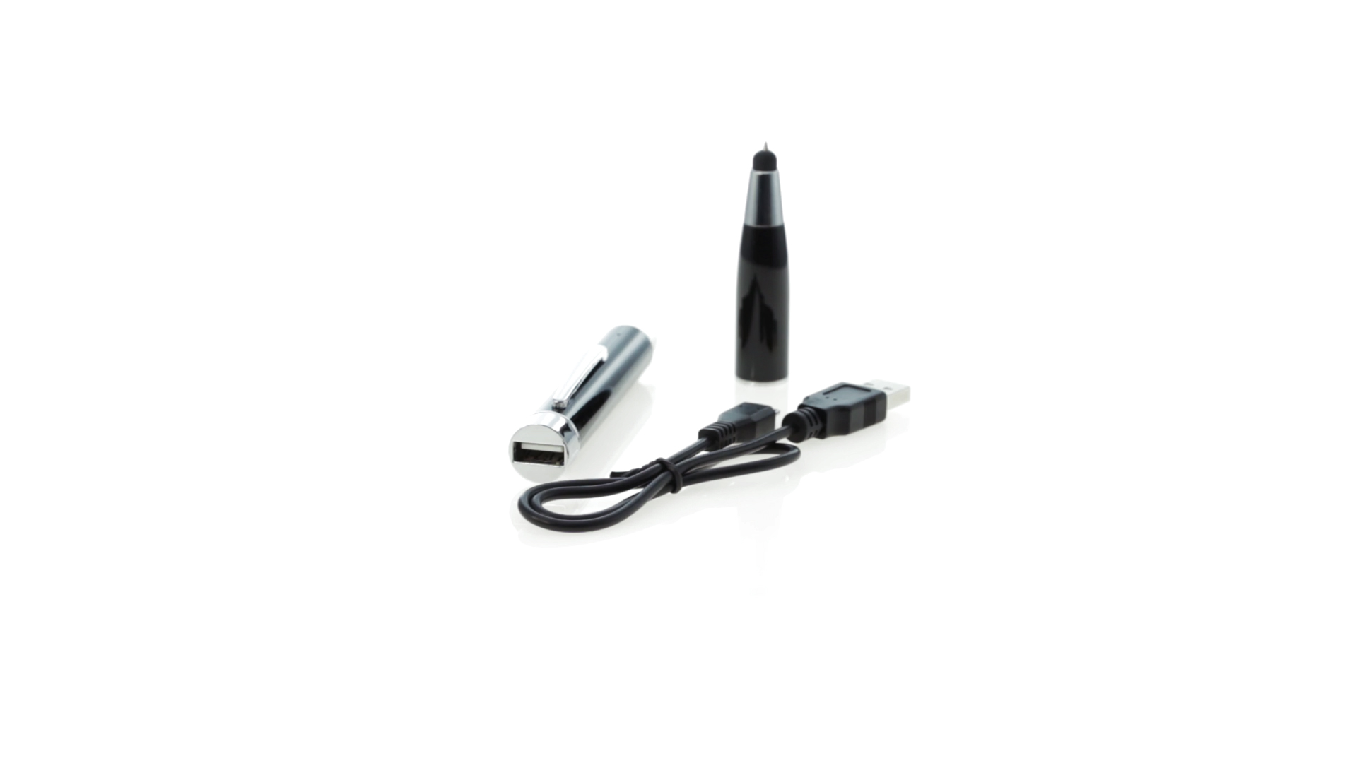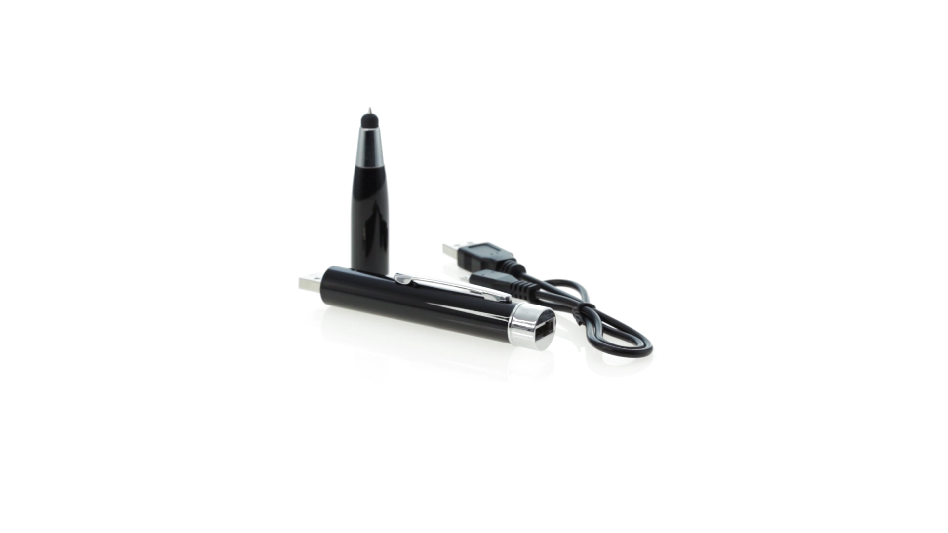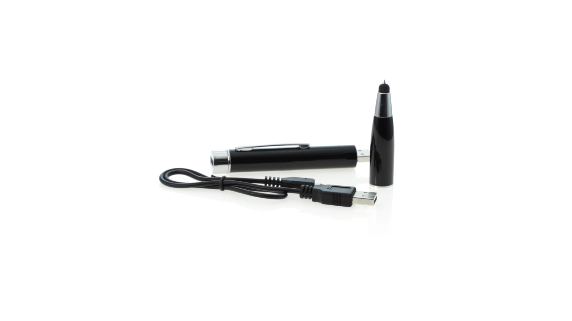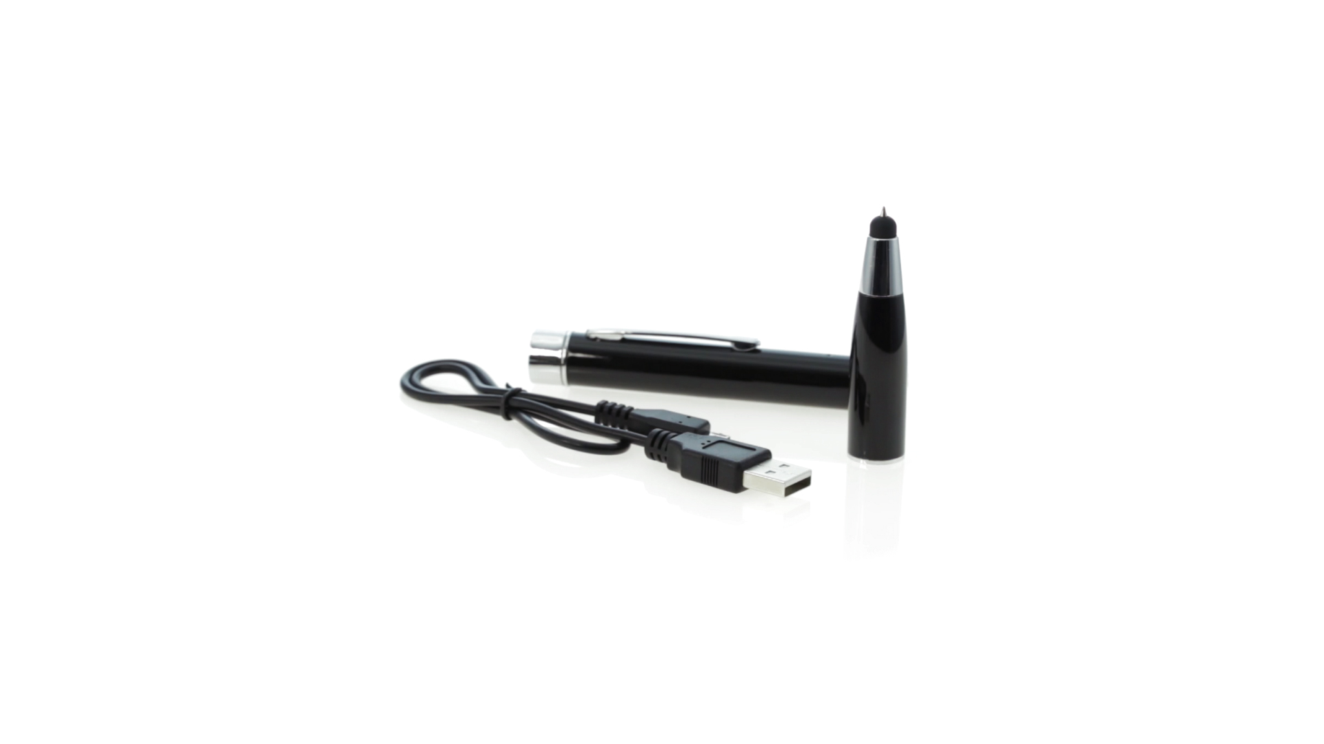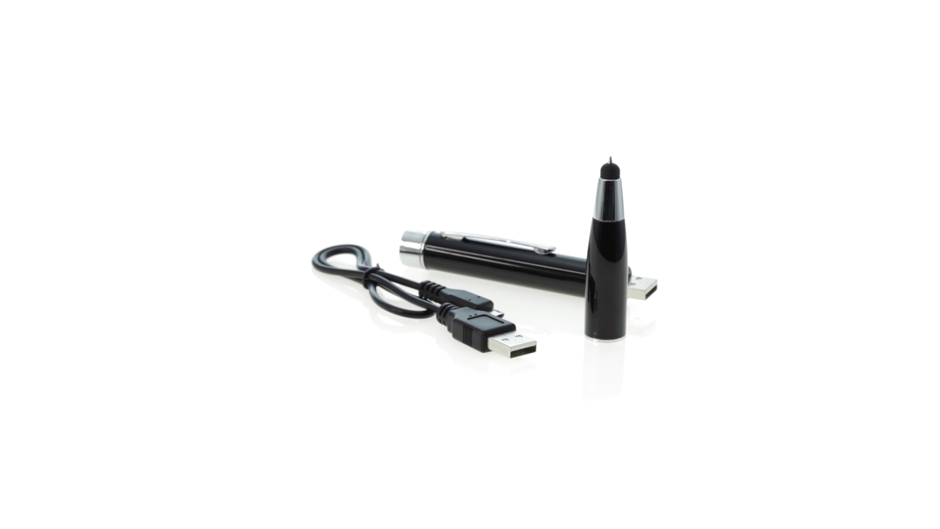 Multifunktioneller Dreh-Kugelschreiber mit externem Akku mit 650 mAh Ladekapazität und weichem Gummi-Stylus. Micro-USB-Kabel inklusive. Mit schwarzer Tinte. Präsentiert in einer attraktiven Designbox.