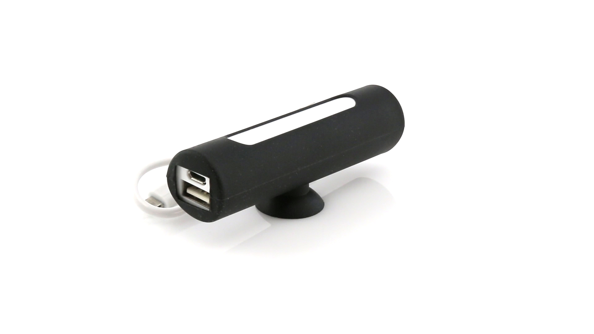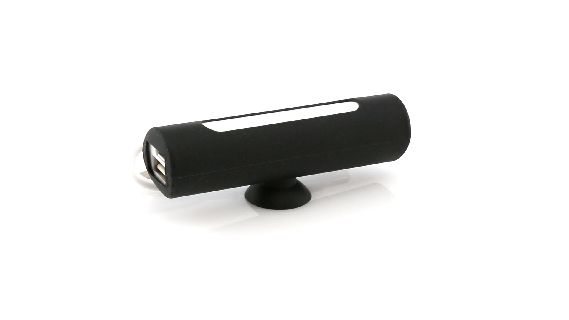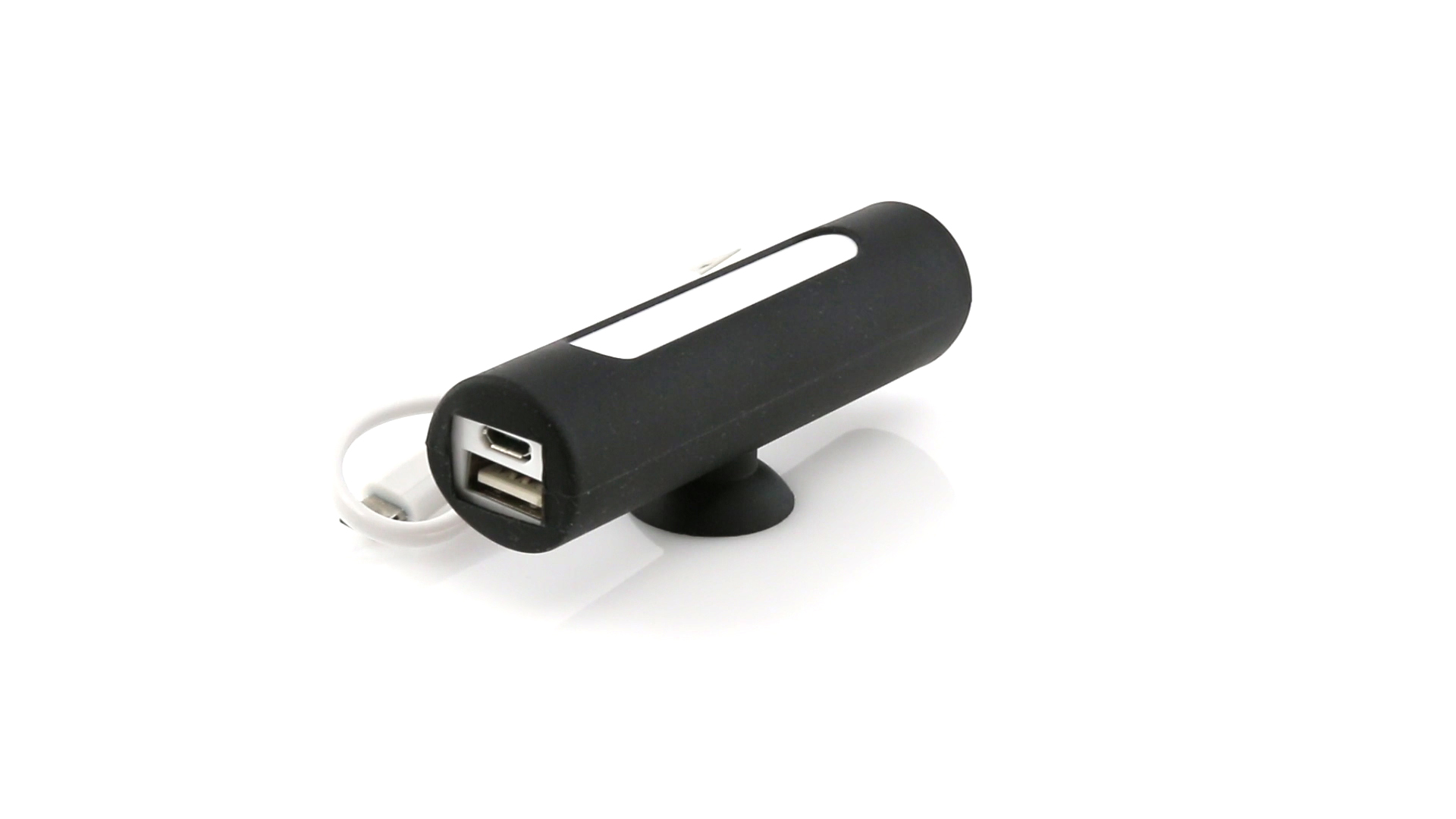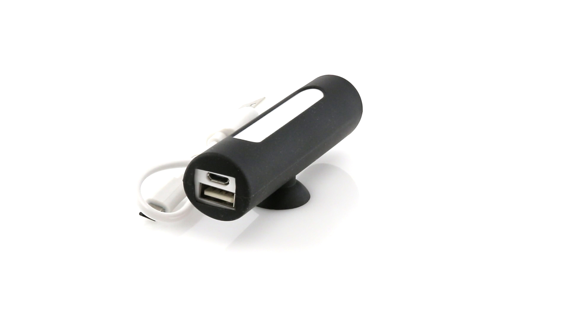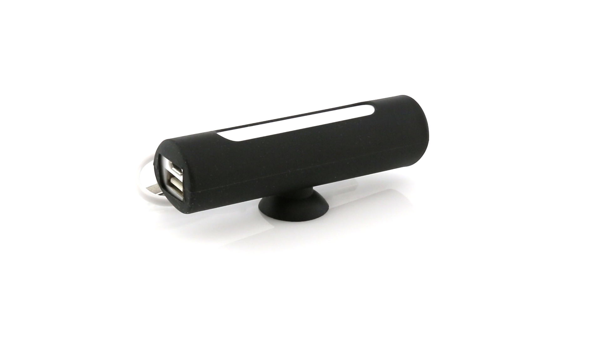 Zweifarbiger externer Akku mit 2.200 mAh Ladekapazität. Mit zylinderförmigen Körper aus Gummi und Saugnapf für die Befestigung an der Rückseite des Smartphones, durch den die Batterie auch gleichermassen als Smartphone-Ständer dient. Mit Micro-USB-Kabel und Kunststoff-Druckfläche auf der Vorderseite - besonders geeignet für Tampondruck. Präsentiert in einer attraktiven Designbox.