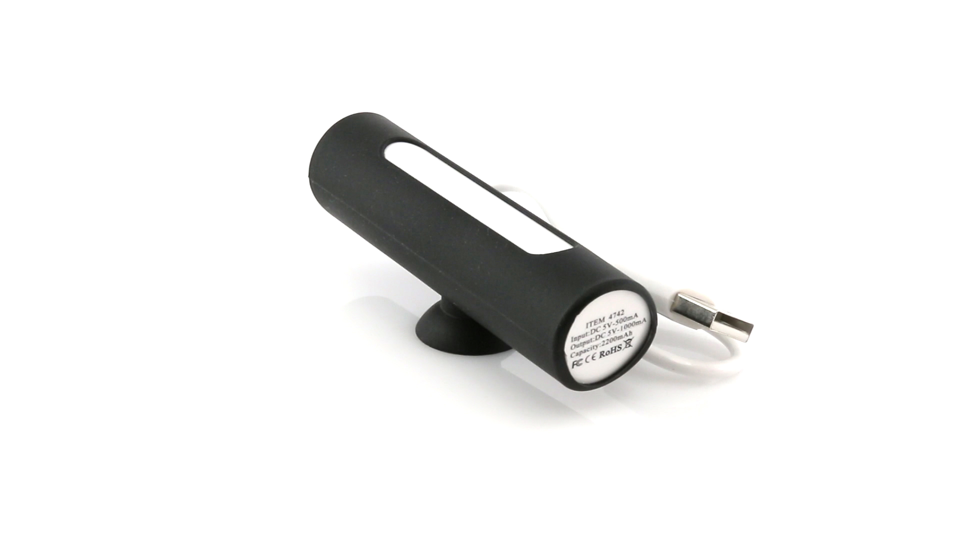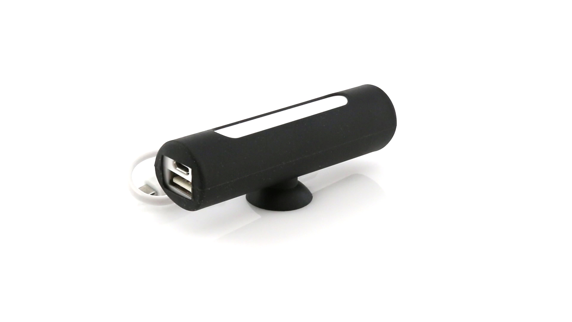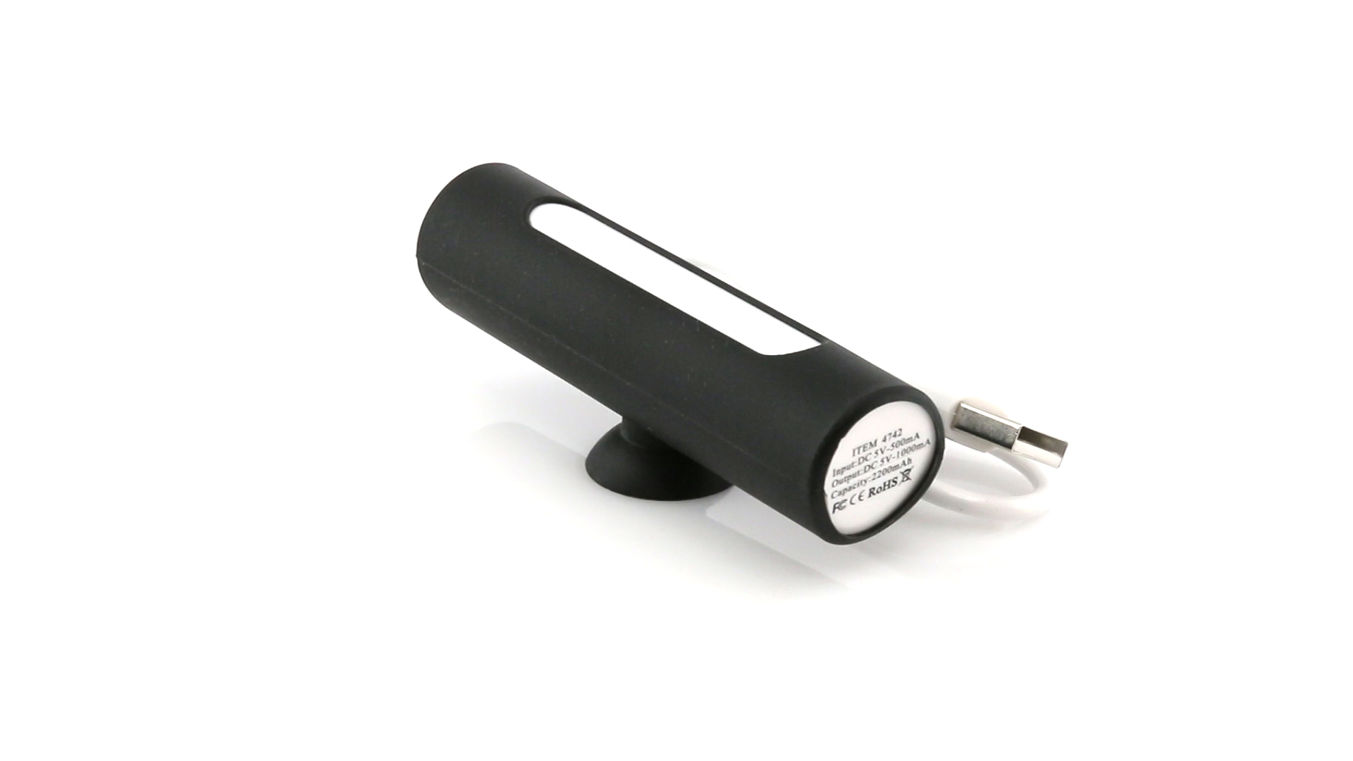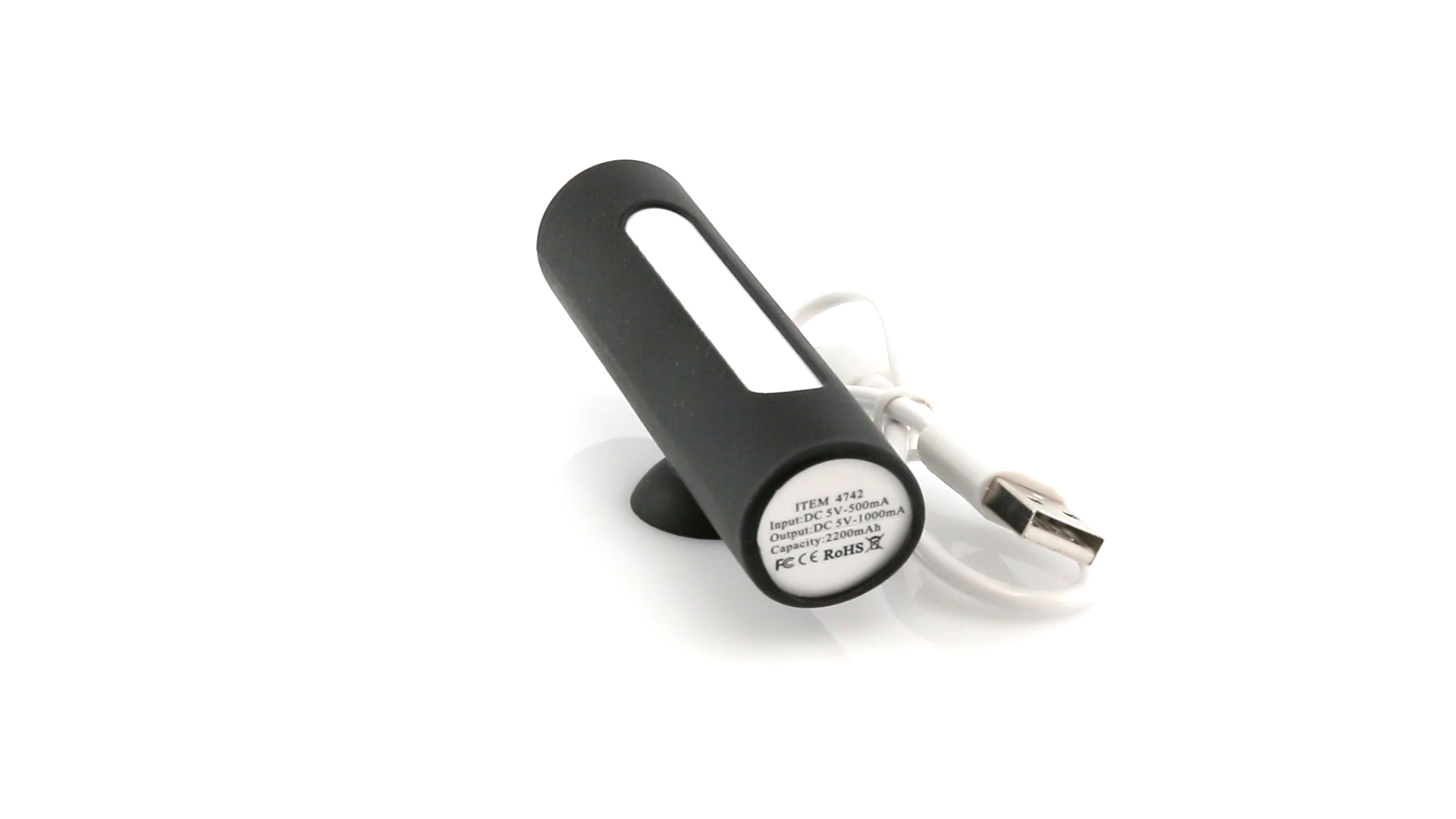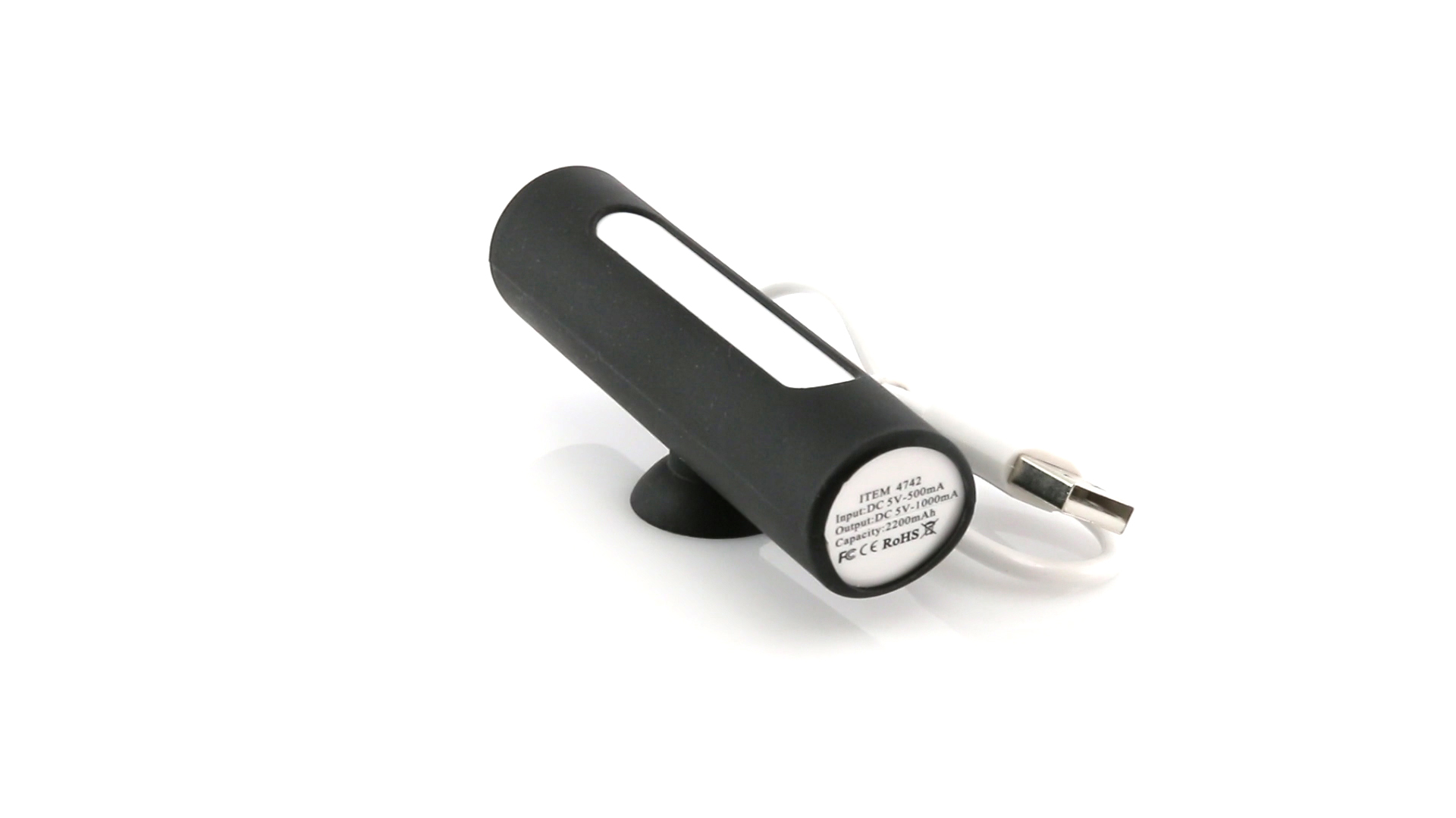 Zweifarbiger externer Akku mit 2.200 mAh Ladekapazität. Mit zylinderförmigen Körper aus Gummi und Saugnapf für die Befestigung an der Rückseite des Smartphones, durch den die Batterie auch gleichermassen als Smartphone-Ständer dient. Mit Micro-USB-Kabel und Kunststoff-Druckfläche auf der Vorderseite - besonders geeignet für Tampondruck. Präsentiert in einer attraktiven Designbox.
