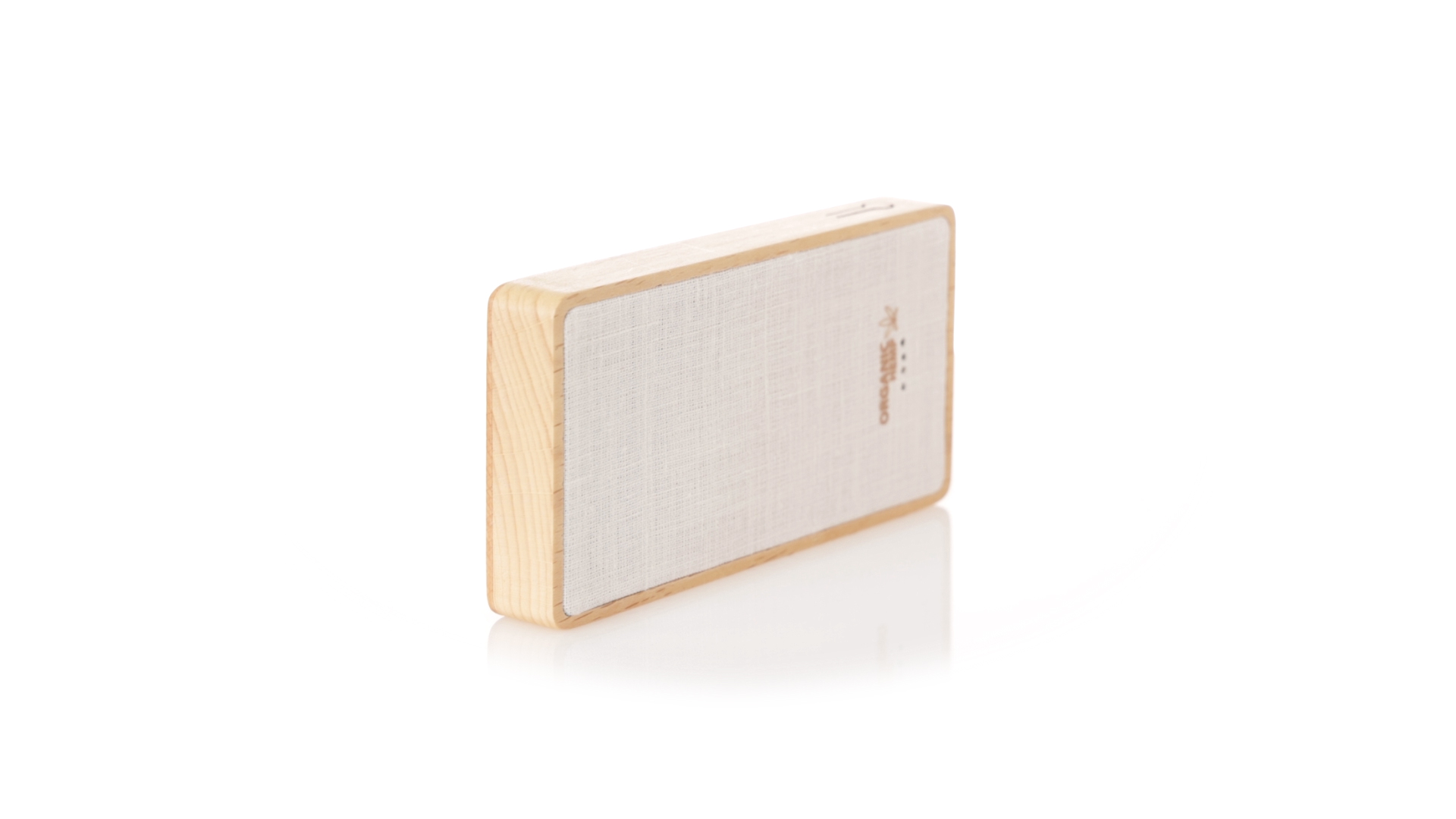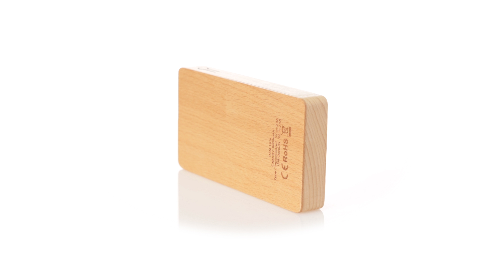 Externer Zusatzakku mit 8.000 mAh. Gehäuse aus einer Kombination aus Bio-Hanf und Naturholz.