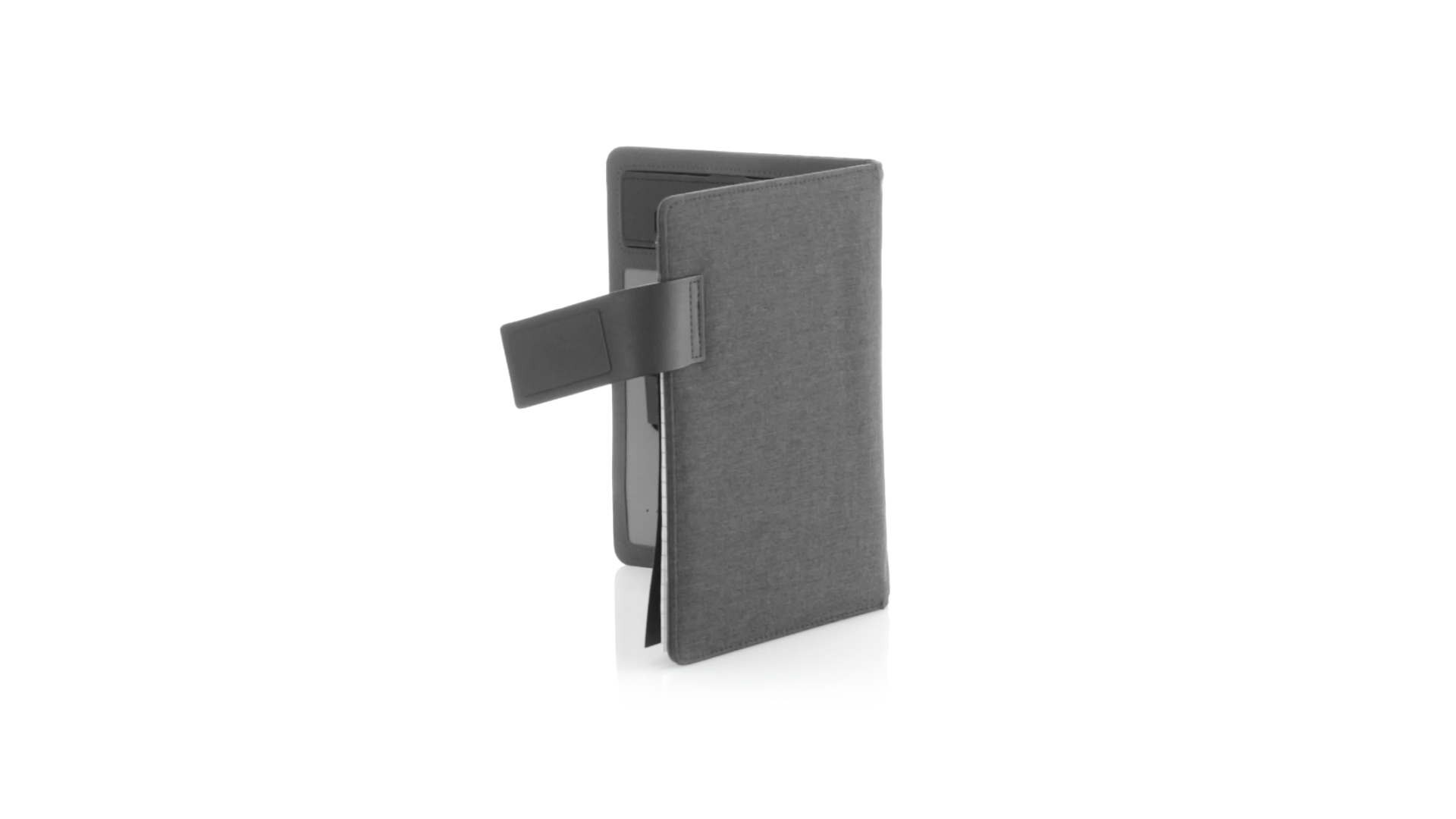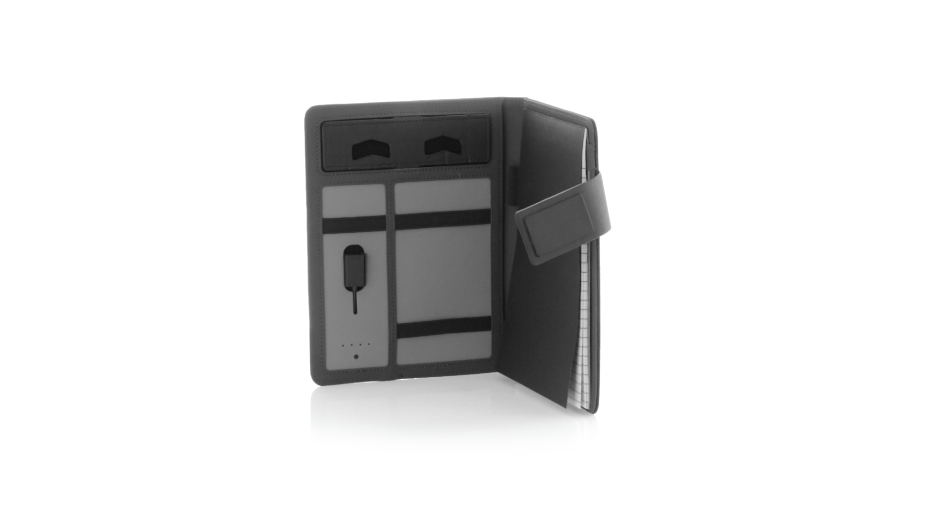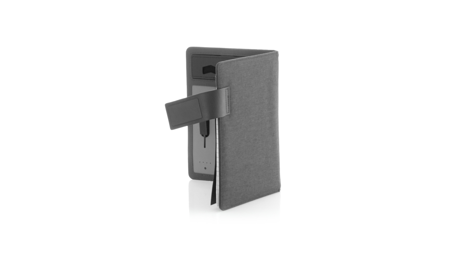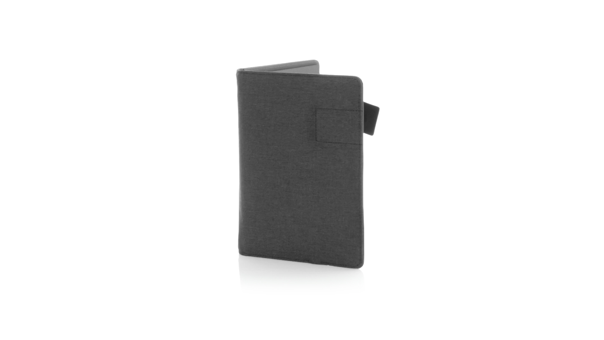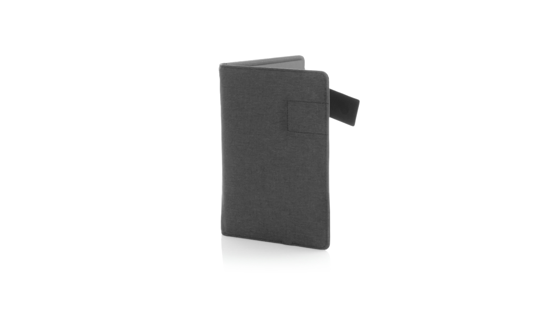 Notizbuch aus weichem 300D Polyester in Graphit-Ausführung mit integrierter Powerbank mit 4.000 mAh Ladekapazität. Schlichtes Design mit Magnetverschluss und Druckfläche aus Metall. Mit einer Vielzahl von Fächern zur Aufbewahrung von Visitenkarten und USB-Sticks, Ständer für Smartphones und Tablets sowie LED-Ladeanzeige im Inneren. Inklusive Notizblock mit 20 A5-Blättern. Der einfache Zugriff auf den externen Akku mittels Micro-USB-Kabel (inklusive), machen aus diesem Notizbuch das perfekte Gadget für Business und Studium.
