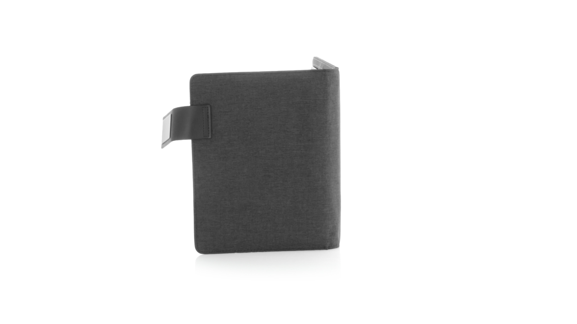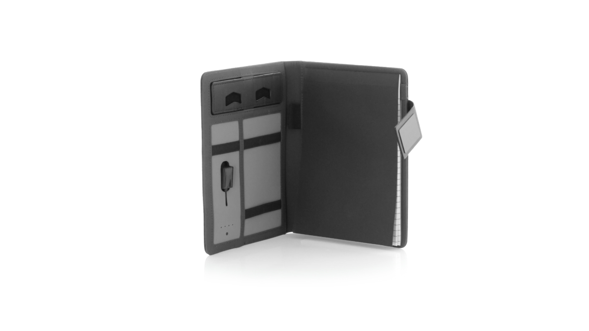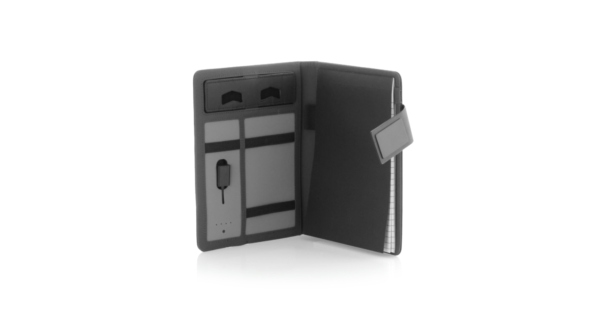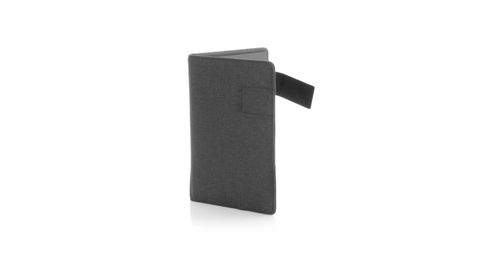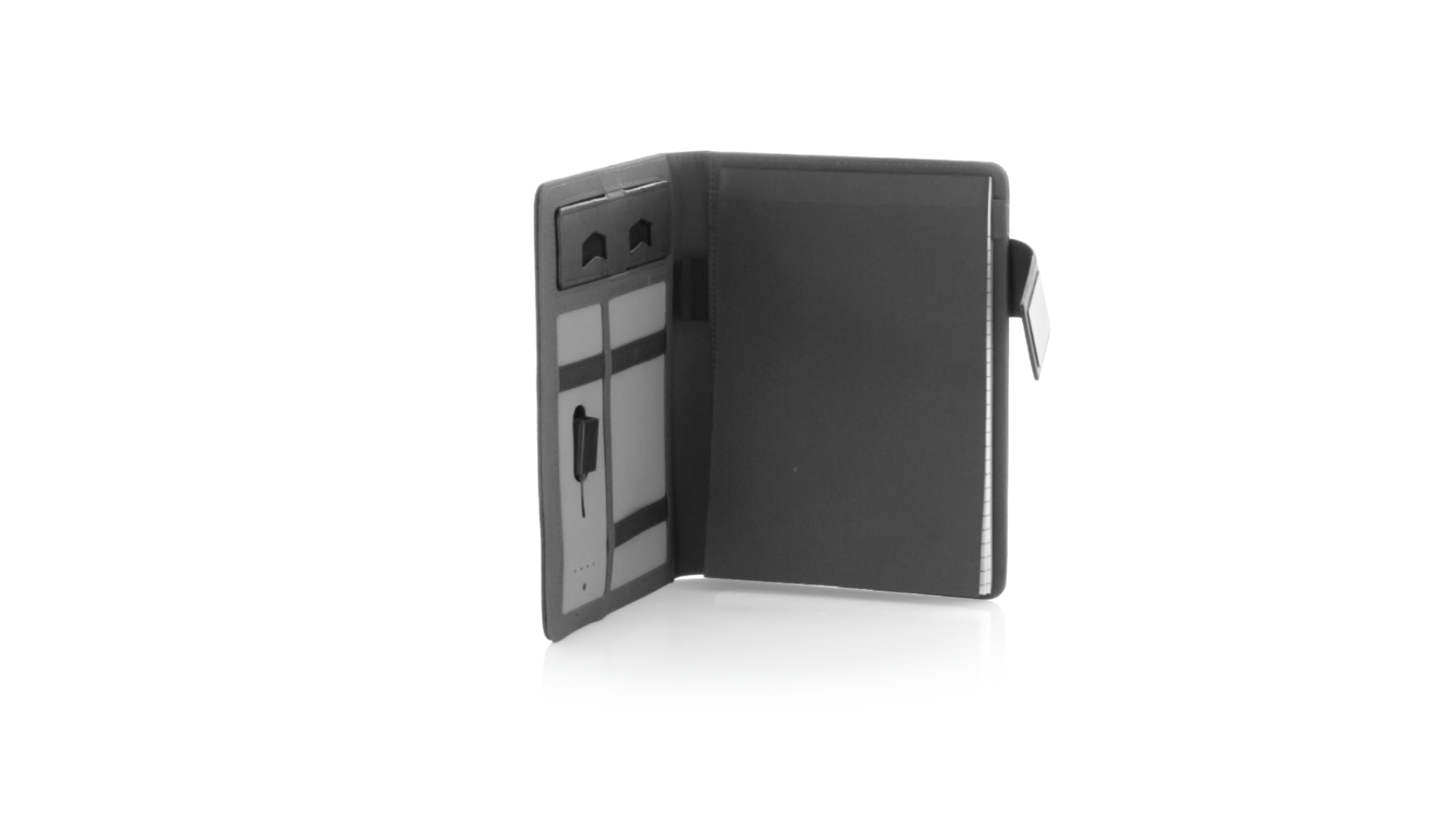 Notizbuch aus weichem 300D Polyester in Graphit-Ausführung mit integrierter Powerbank mit 4.000 mAh Ladekapazität. Schlichtes Design mit Magnetverschluss und Druckfläche aus Metall. Mit einer Vielzahl von Fächern zur Aufbewahrung von Visitenkarten und USB-Sticks, Ständer für Smartphones und Tablets sowie LED-Ladeanzeige im Inneren. Inklusive Notizblock mit 20 A5-Blättern. Der einfache Zugriff auf den externen Akku mittels Micro-USB-Kabel (inklusive), machen aus diesem Notizbuch das perfekte Gadget für Business und Studium.