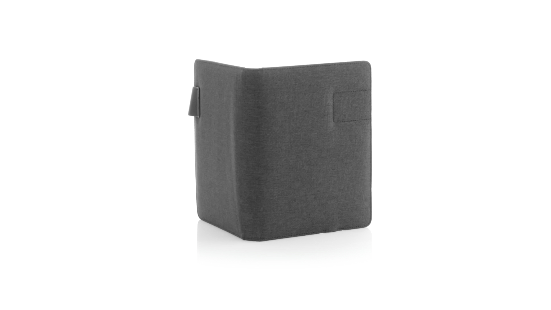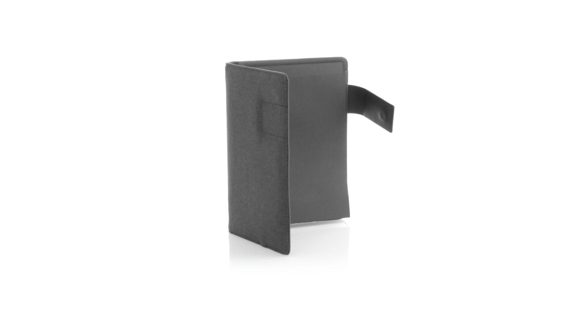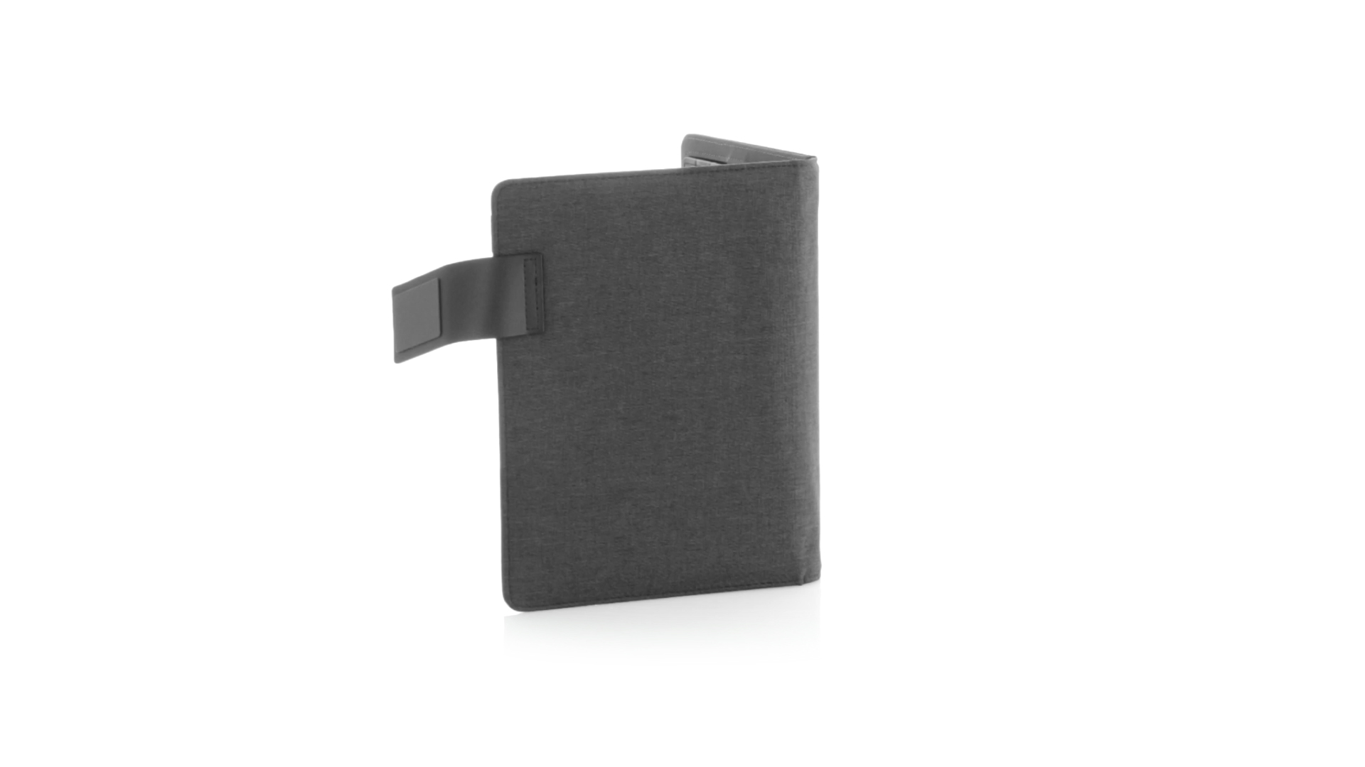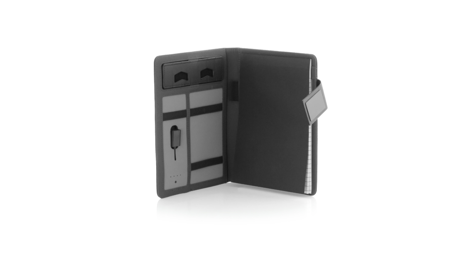 Notizbuch aus weichem 300D Polyester in Graphit-Ausführung mit integrierter Powerbank mit 4.000 mAh Ladekapazität. Schlichtes Design mit Magnetverschluss und Druckfläche aus Metall. Mit einer Vielzahl von Fächern zur Aufbewahrung von Visitenkarten und USB-Sticks, Ständer für Smartphones und Tablets sowie LED-Ladeanzeige im Inneren. Inklusive Notizblock mit 20 A5-Blättern. Der einfache Zugriff auf den externen Akku mittels Micro-USB-Kabel (inklusive), machen aus diesem Notizbuch das perfekte Gadget für Business und Studium.