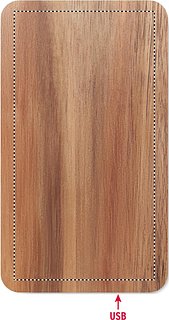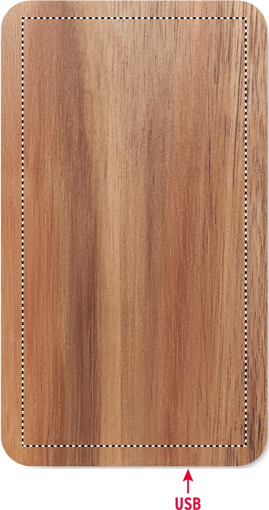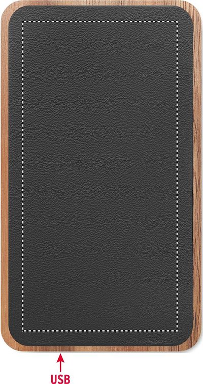 Powerbank 4000 mAh mit kabelloser Ladestation 15W. Gehäuse aus Akazienholz und recyceltem PU. Mit Schnellladefunktion (20W). Eingang/Ausgang: Typ-C.