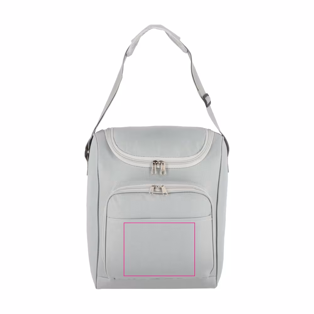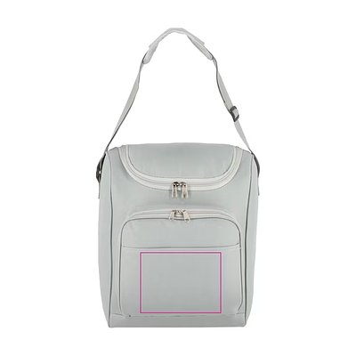 13-Liter-Kühltasche aus recyceltem PET 600D mit einer weiten Öffnung oben. Mit Aluminiumfolie gefüttert und einer Vordertasche mit Reissverschluss. Ideal für Getränkeflaschen, Picknicks und Einkäufe.