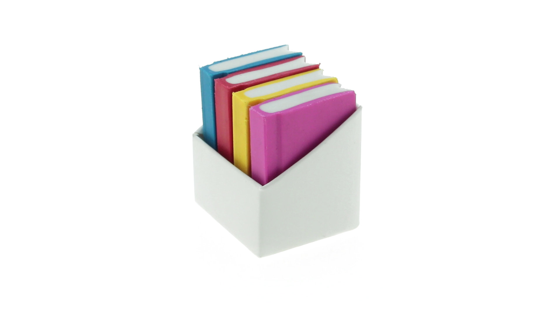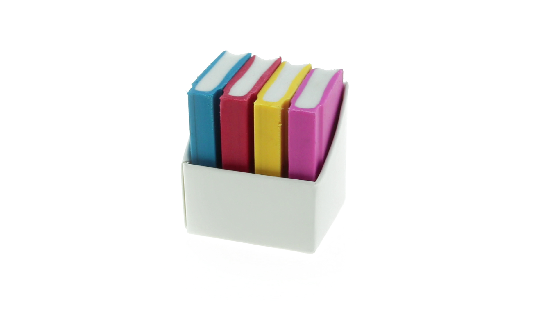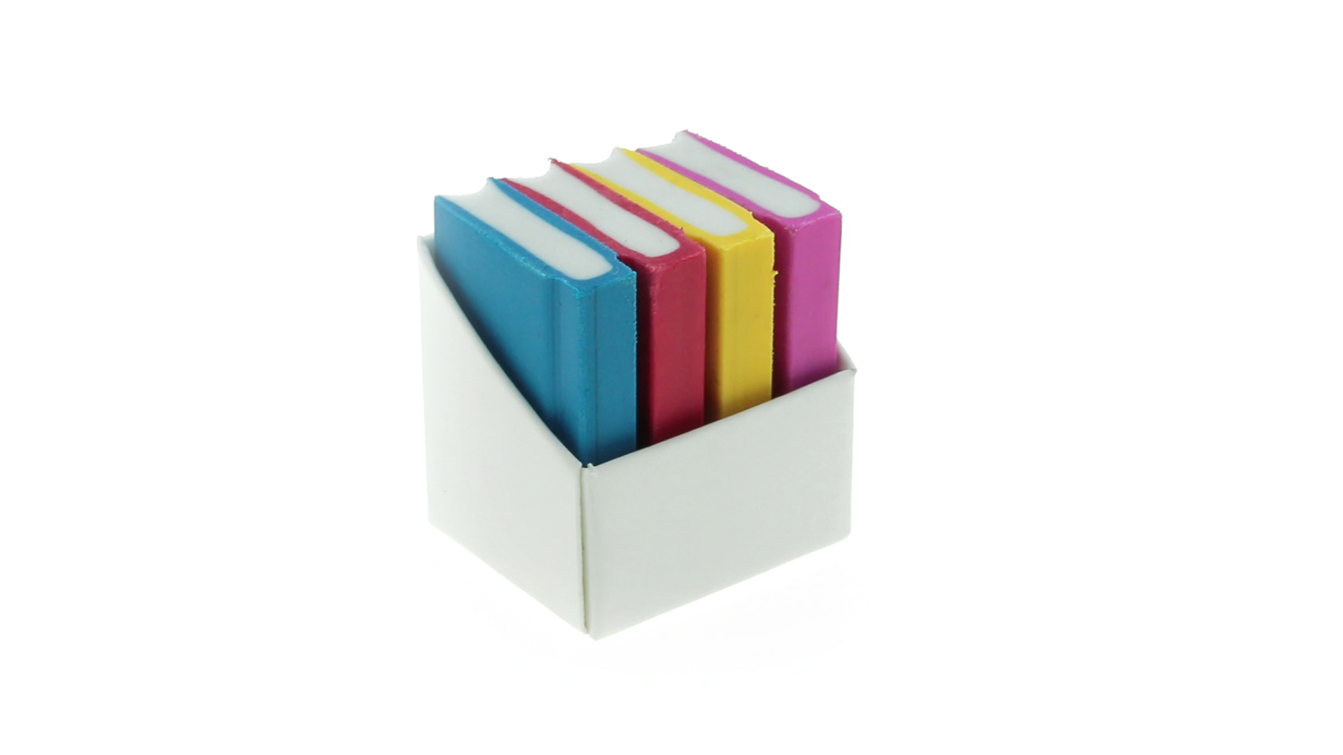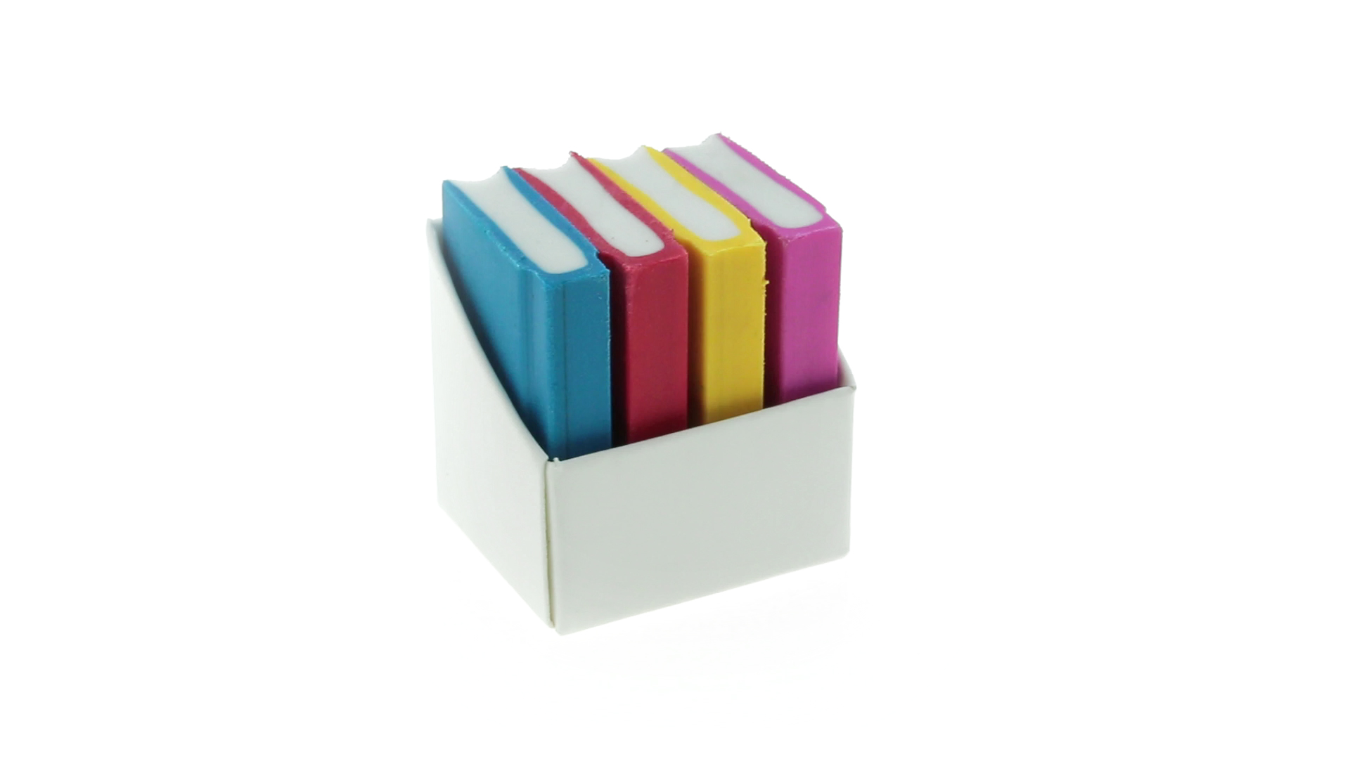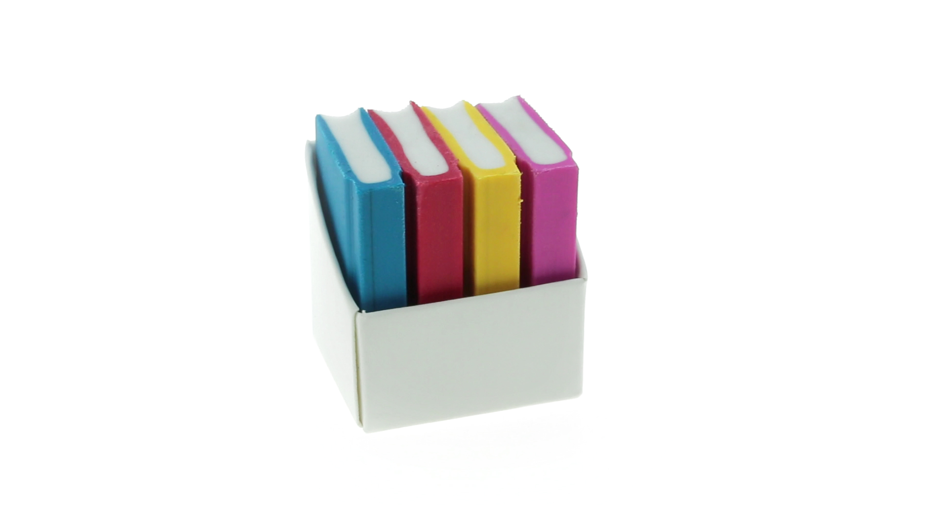 Tolles Set aus 4 Radiergummis in Buchform in verschiedenen lebendigen Farben. Präsentiert in einer weissen Kartonschachtel.