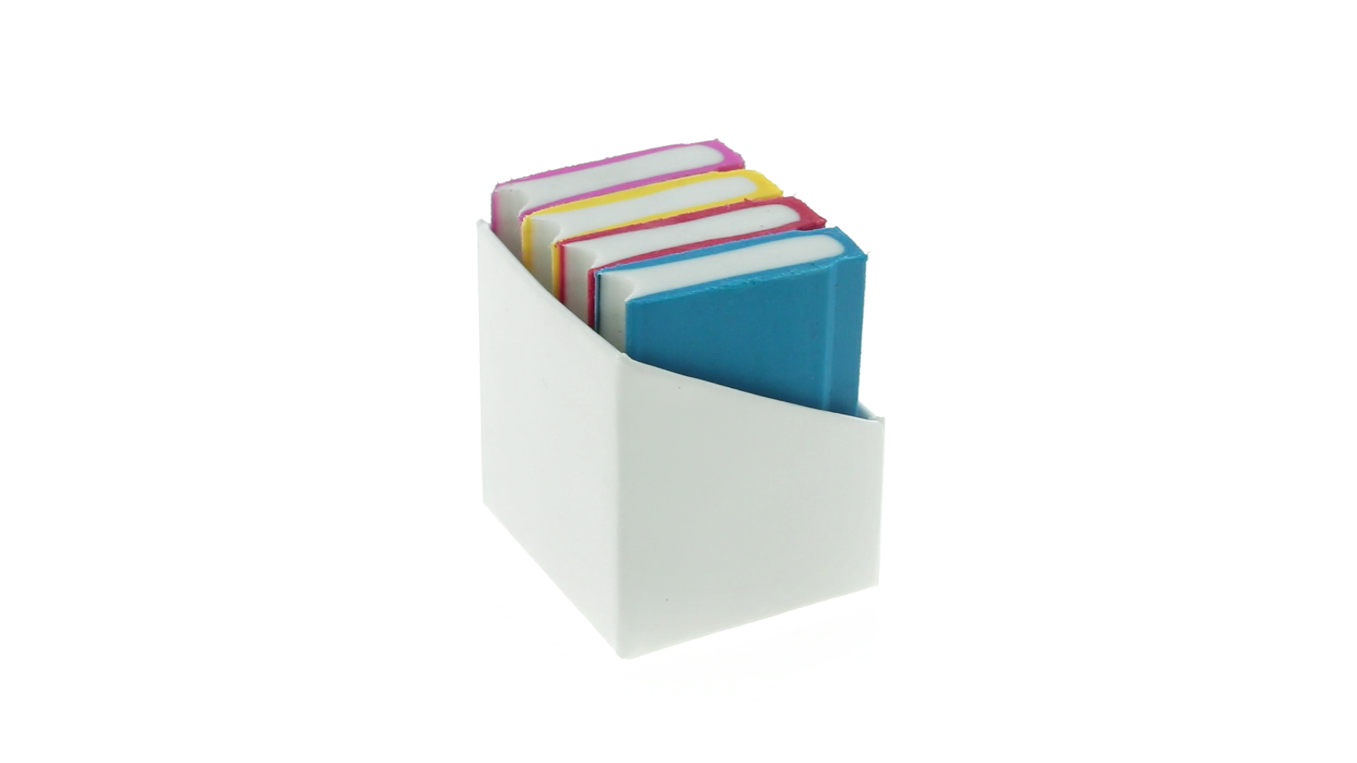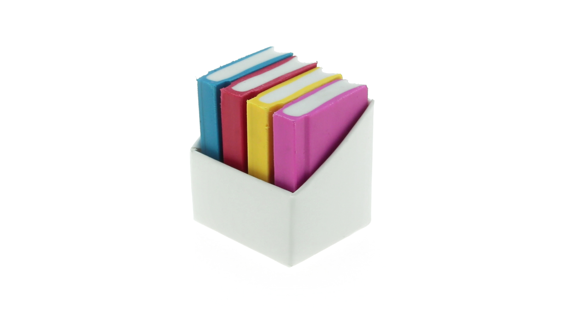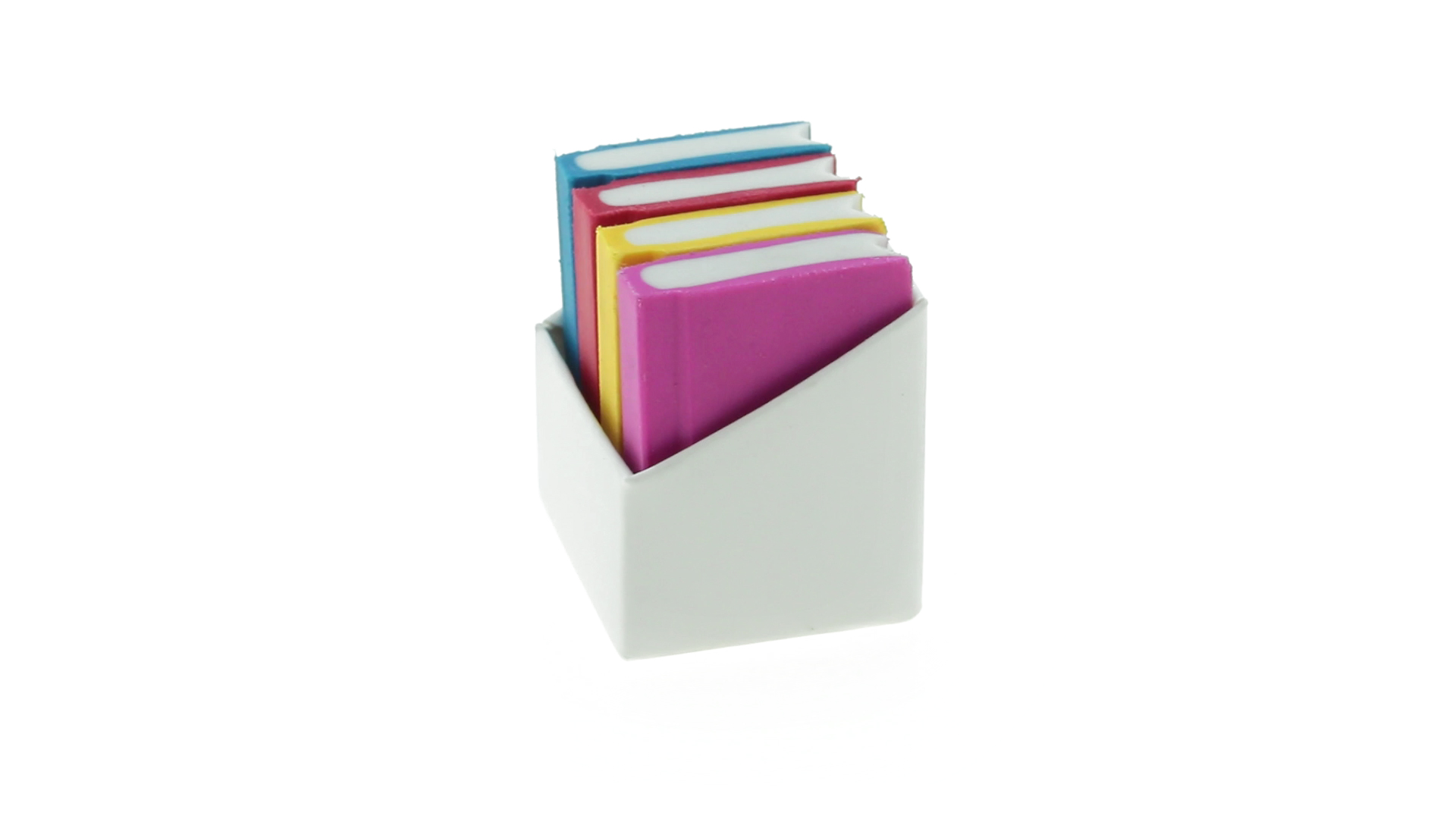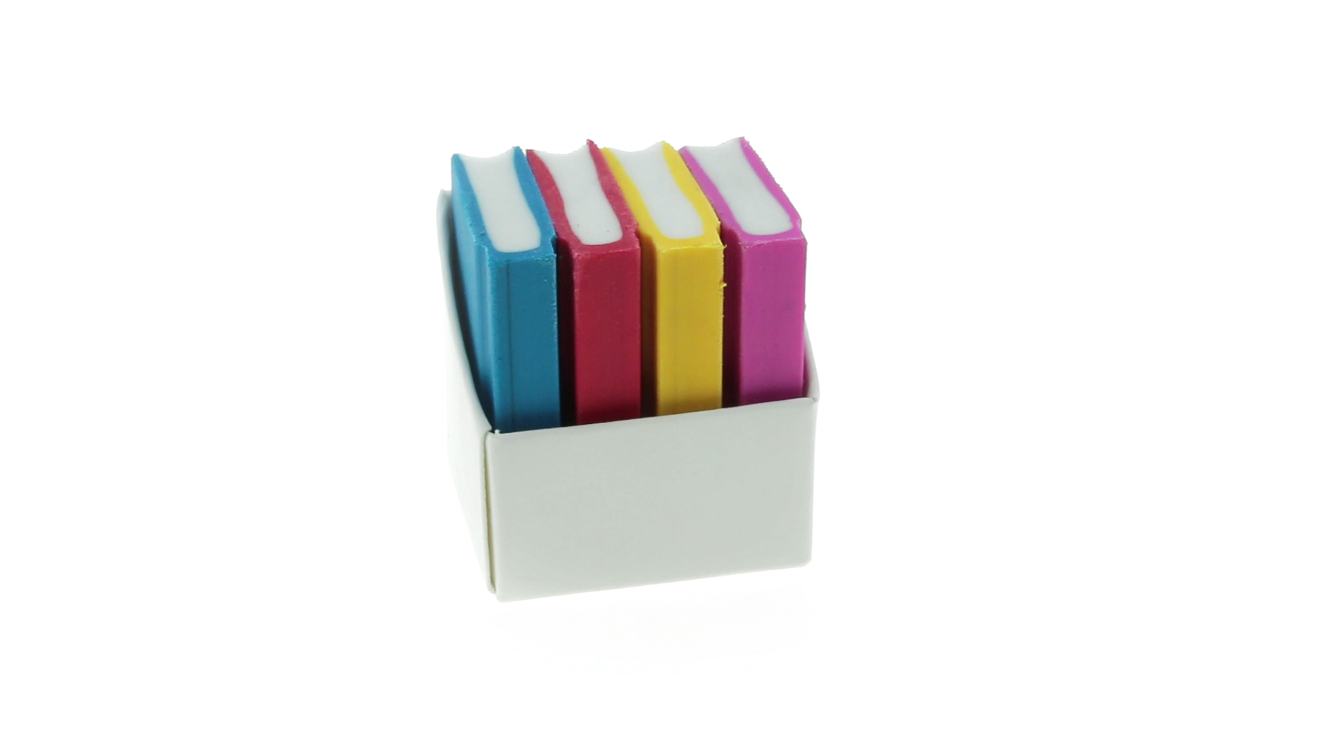 Tolles Set aus 4 Radiergummis in Buchform in verschiedenen lebendigen Farben. Präsentiert in einer weissen Kartonschachtel.
