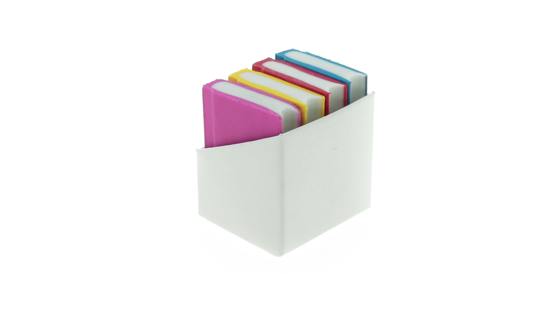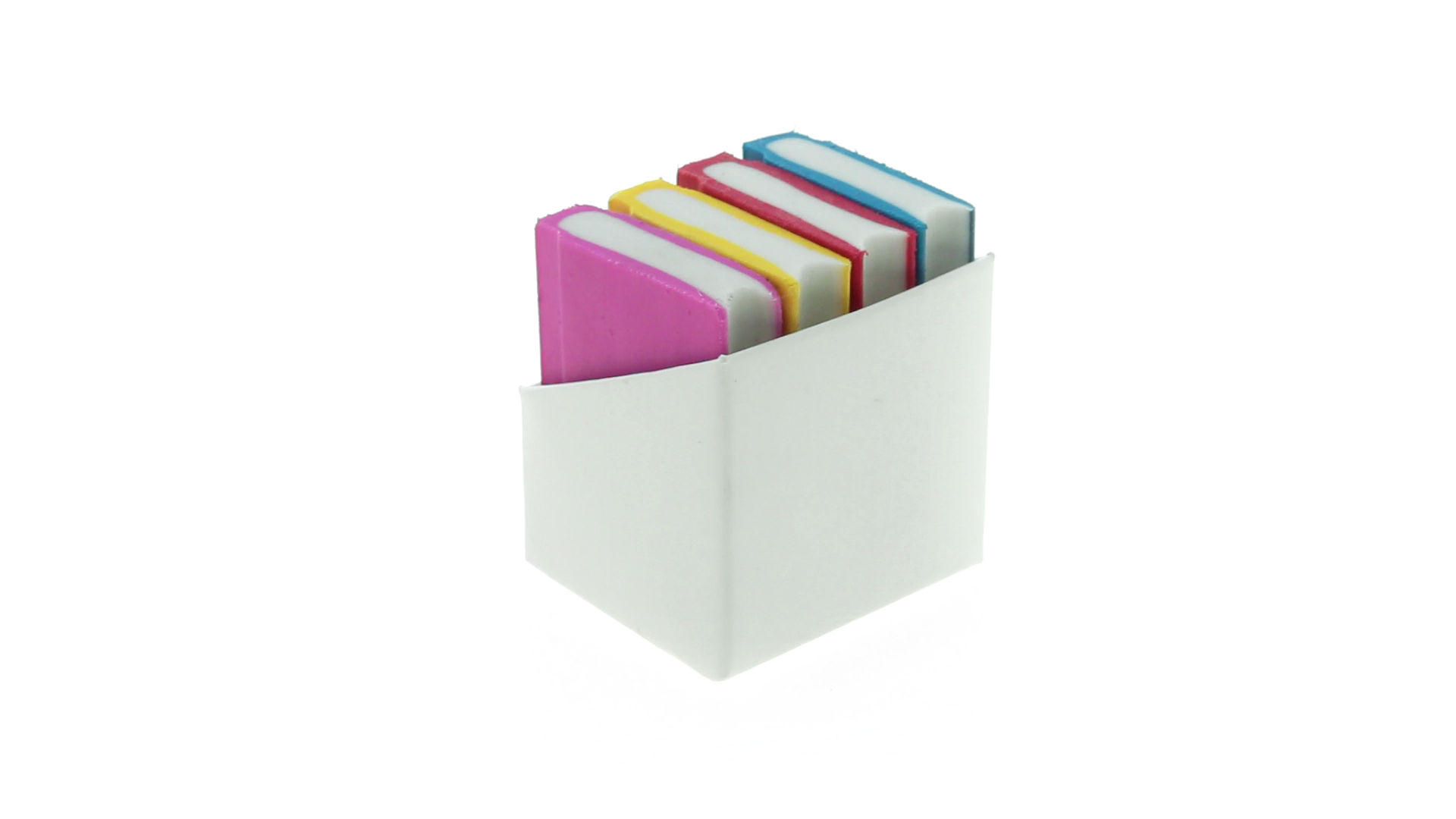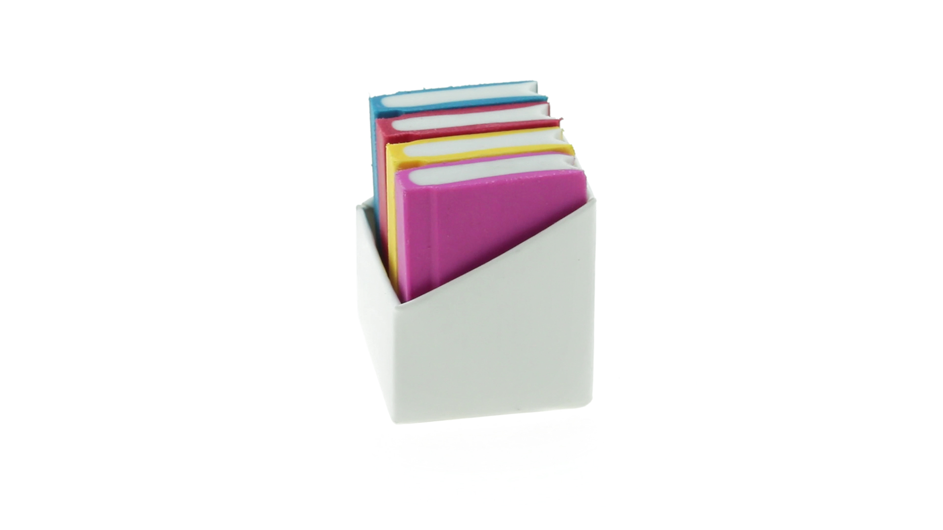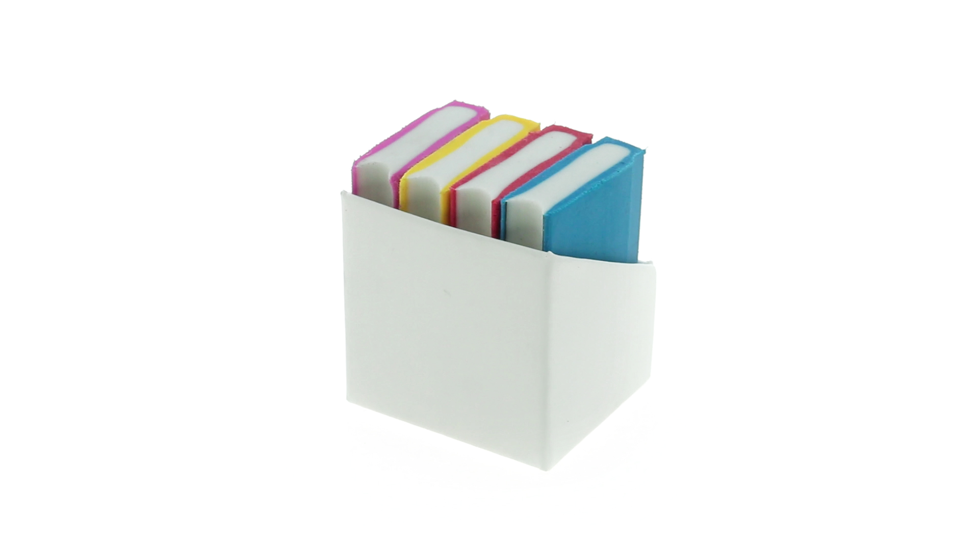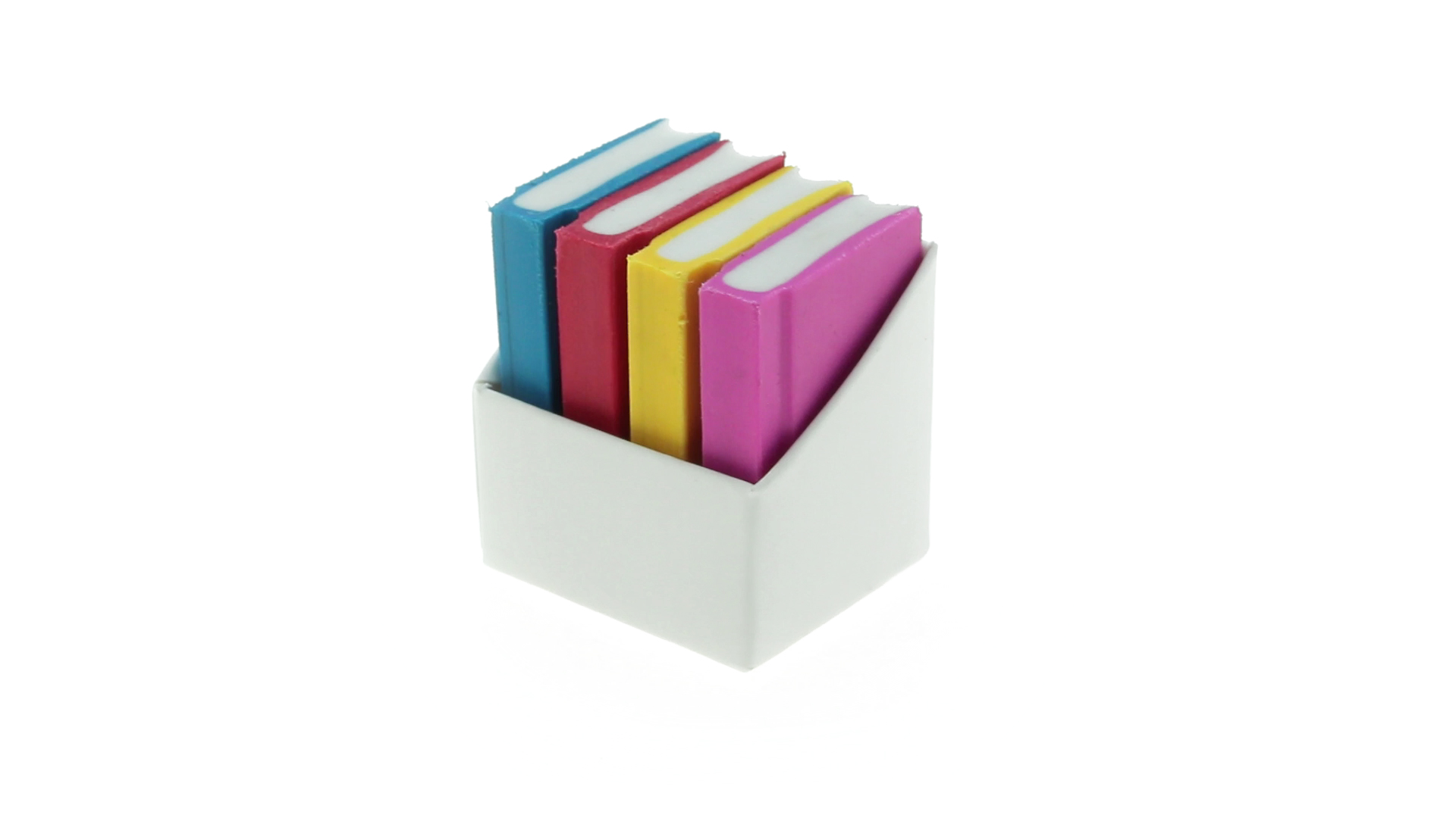Tolles Set aus 4 Radiergummis in Buchform in verschiedenen lebendigen Farben. Präsentiert in einer weissen Kartonschachtel.
