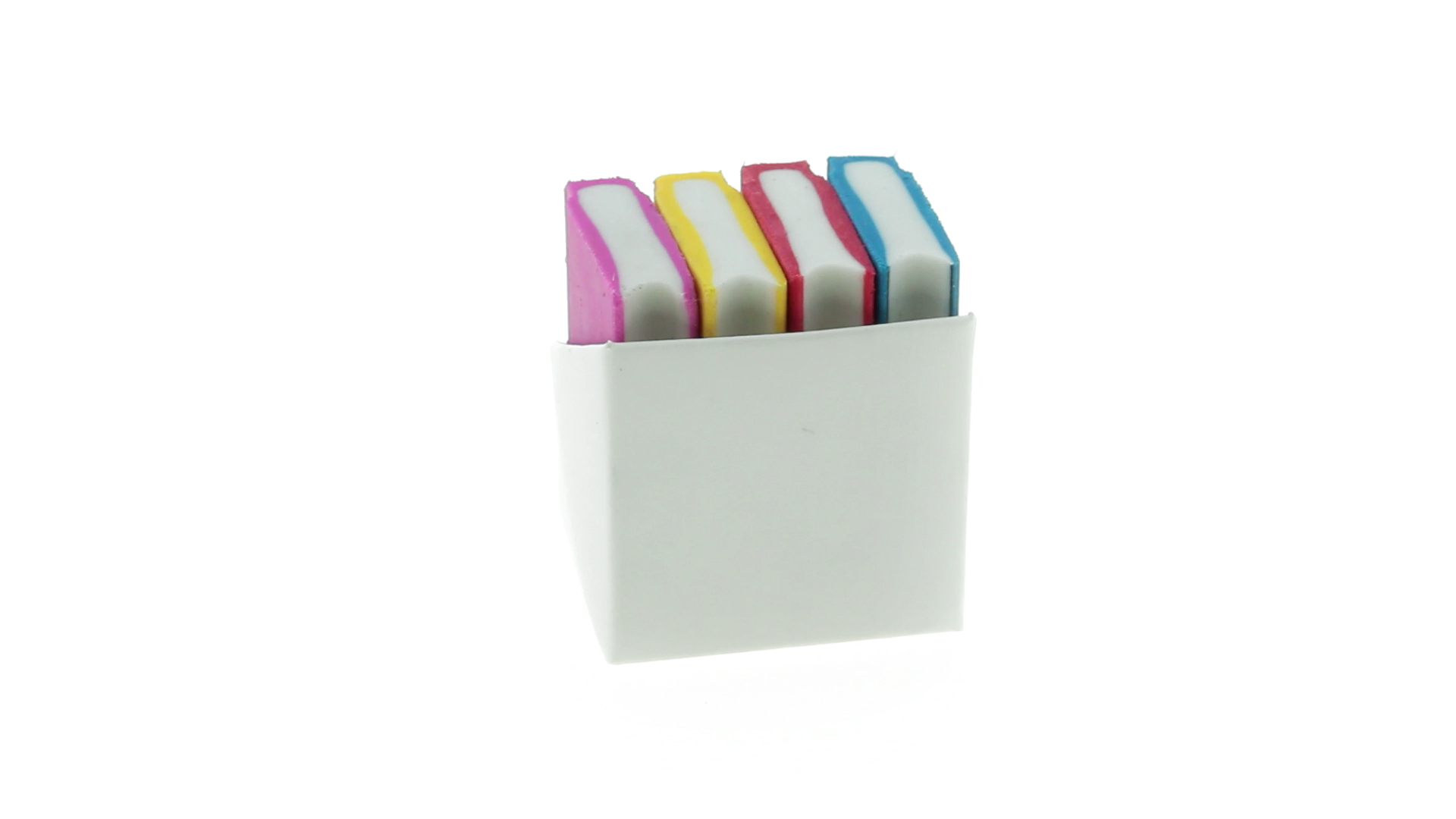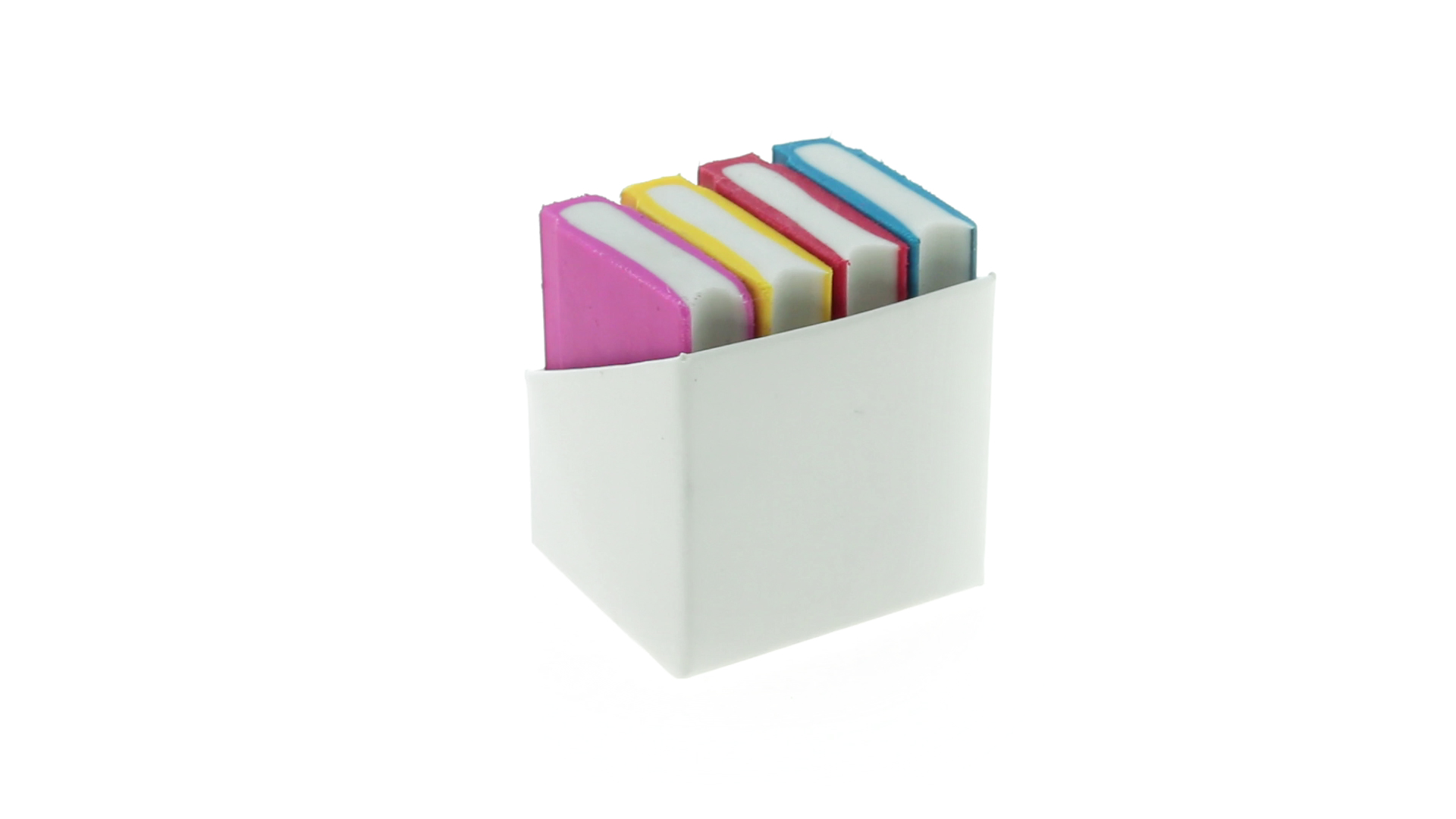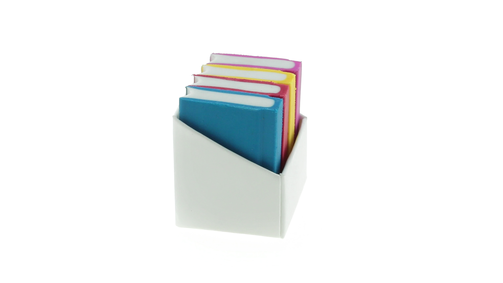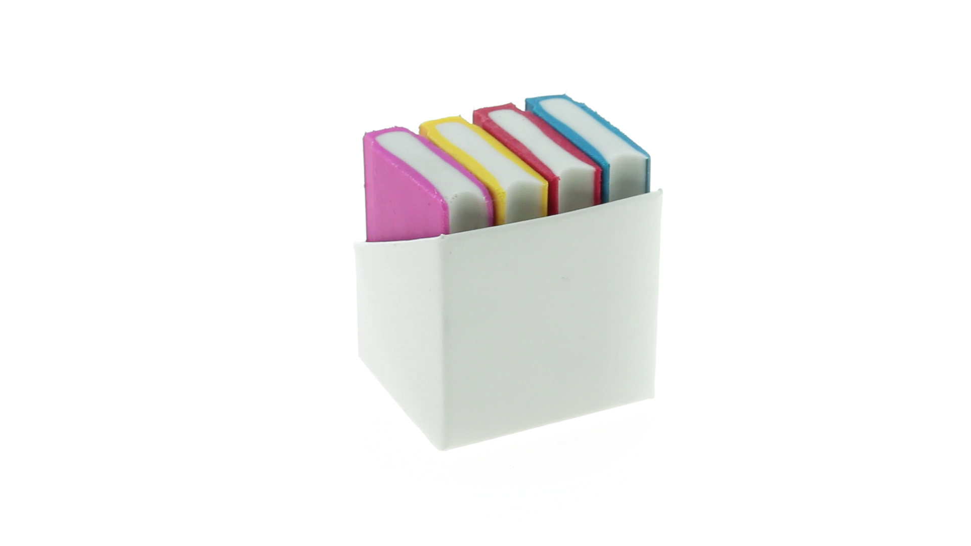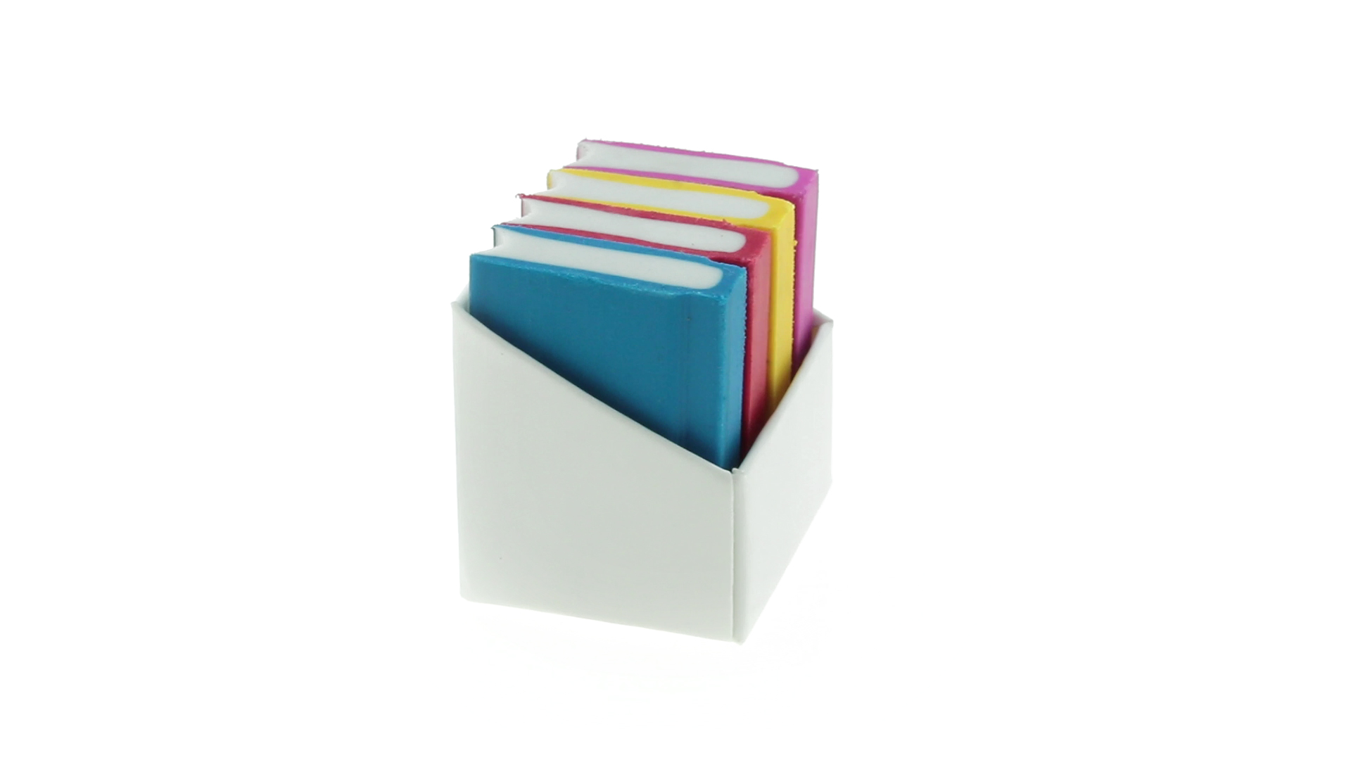 Tolles Set aus 4 Radiergummis in Buchform in verschiedenen lebendigen Farben. Präsentiert in einer weissen Kartonschachtel.