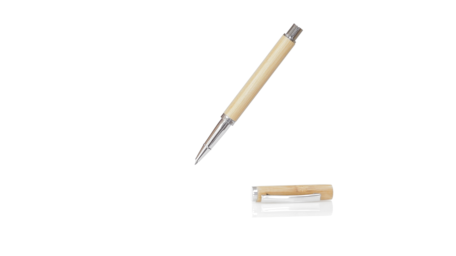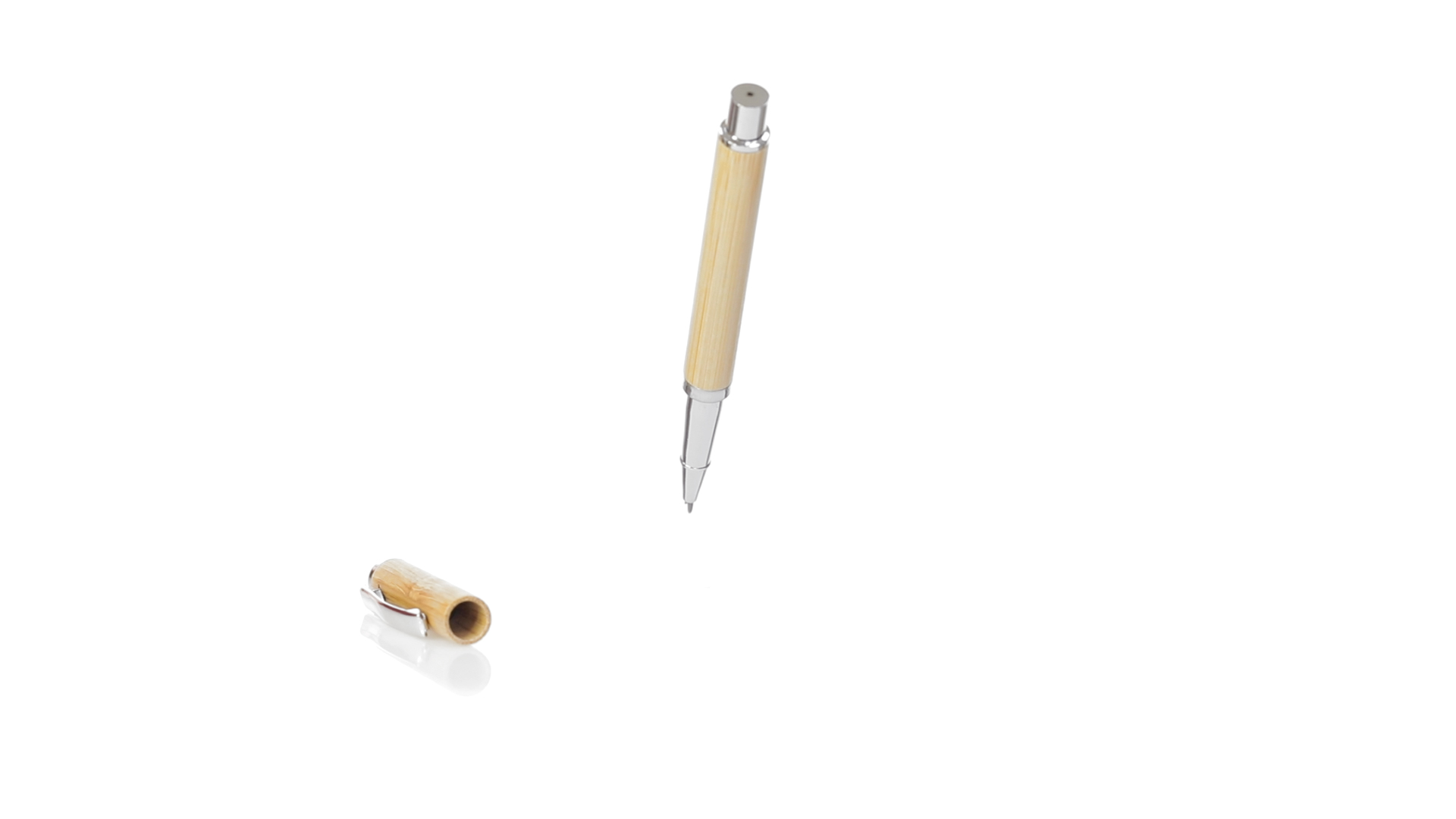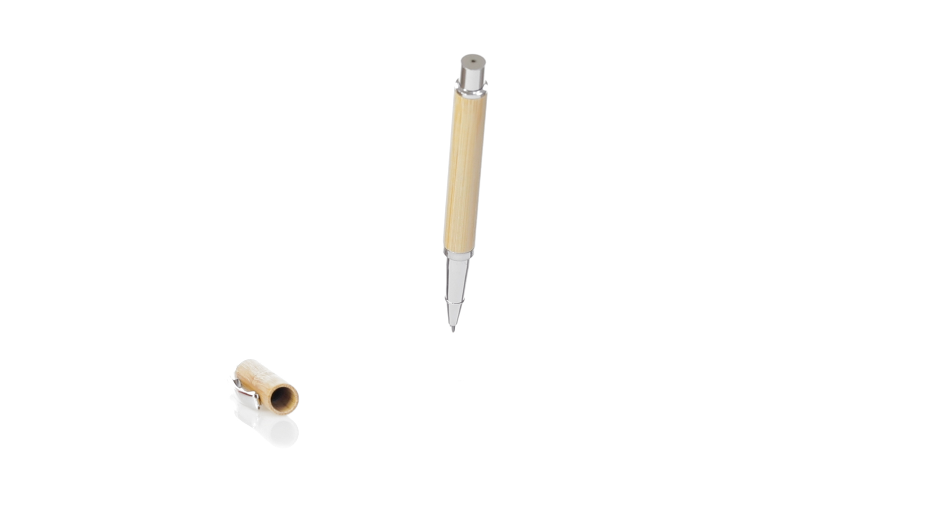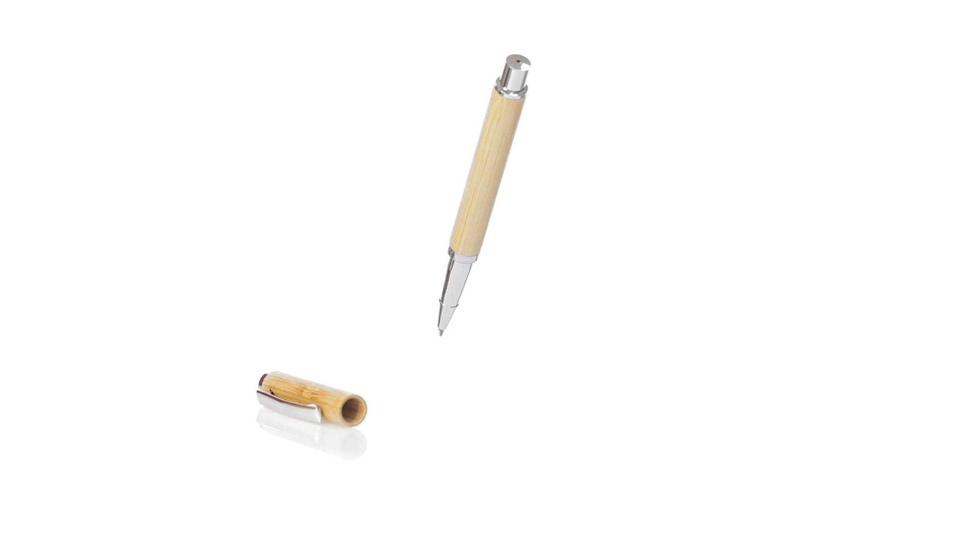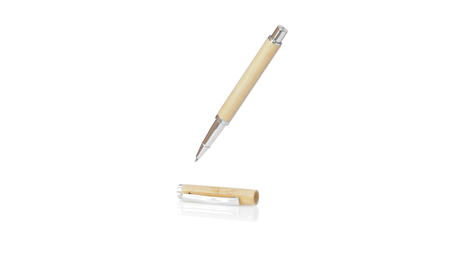 Tintenroller mit Deckel aus der Nature Line. Hergestellt aus Bambus, mit glattem Schaft und verchromten Beschlägen. Jumbo-Patrone, mit blauer Tinte.