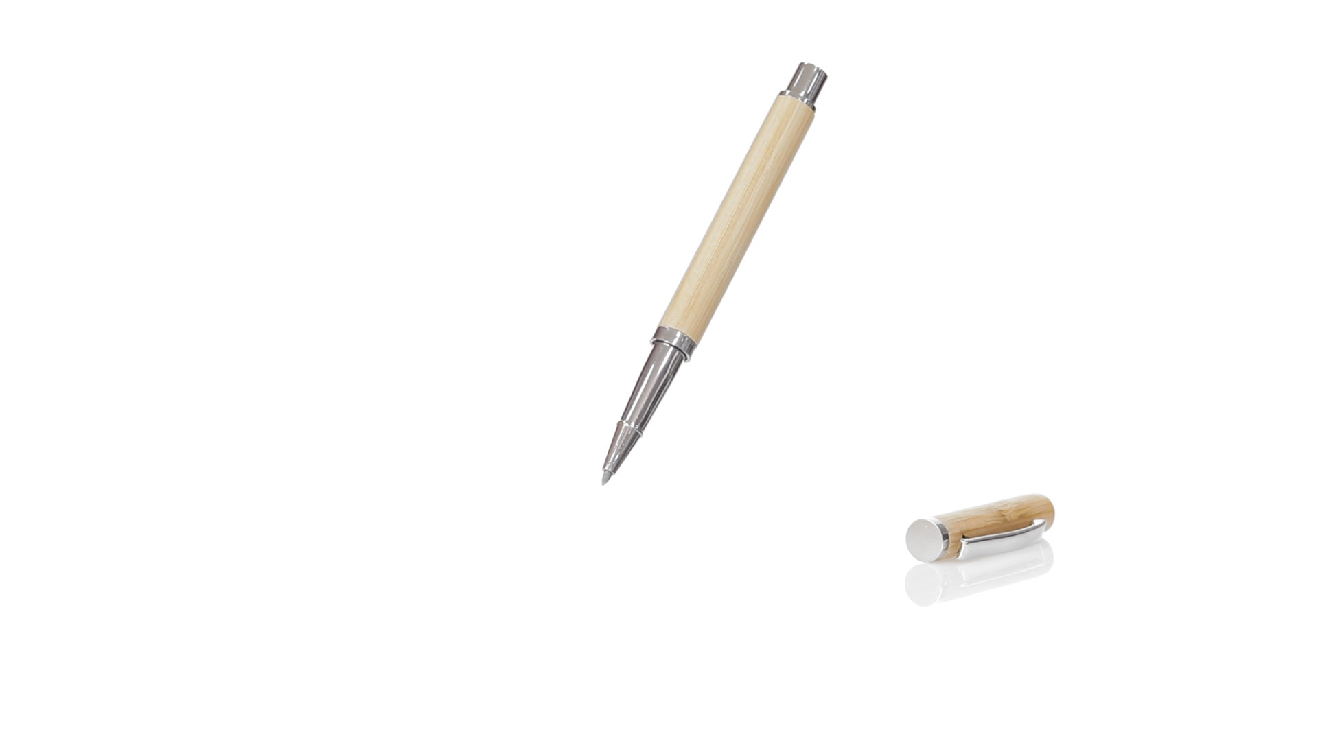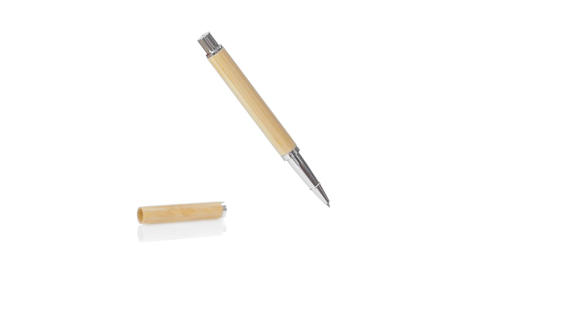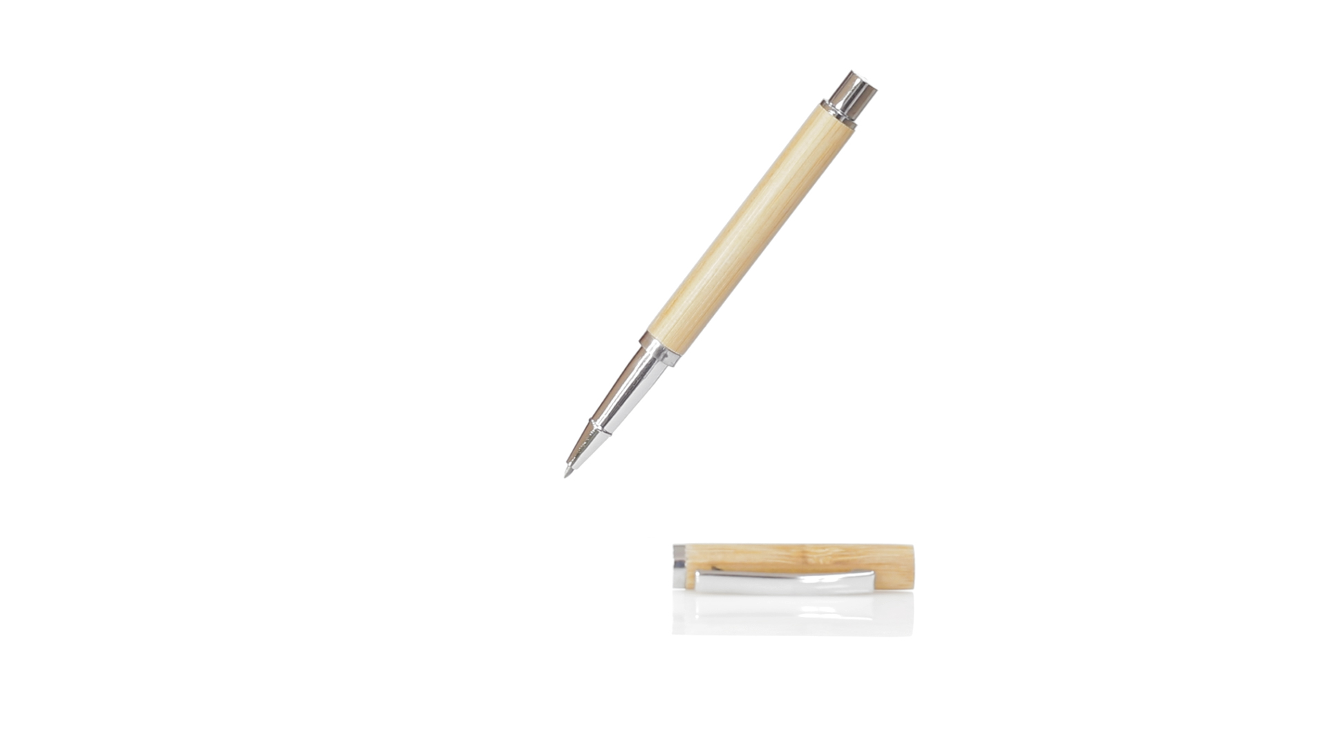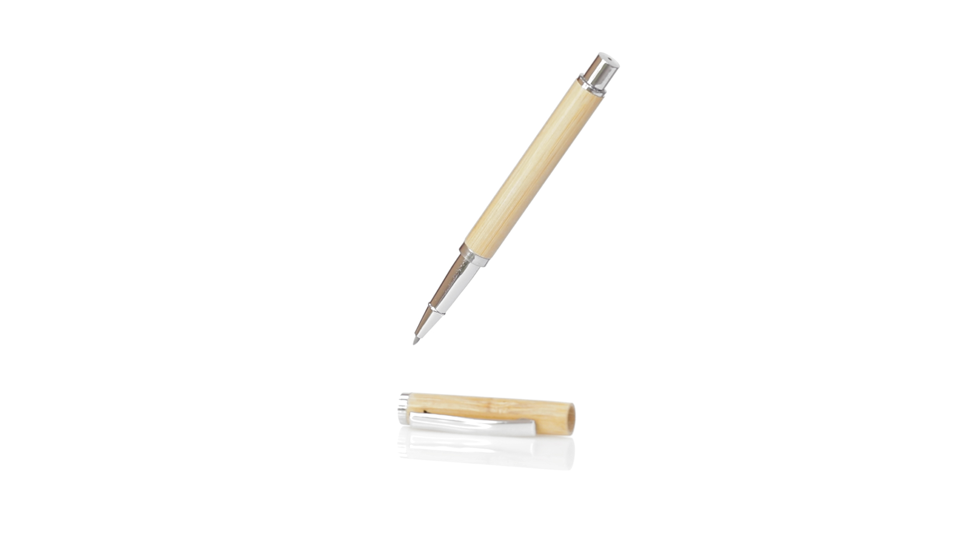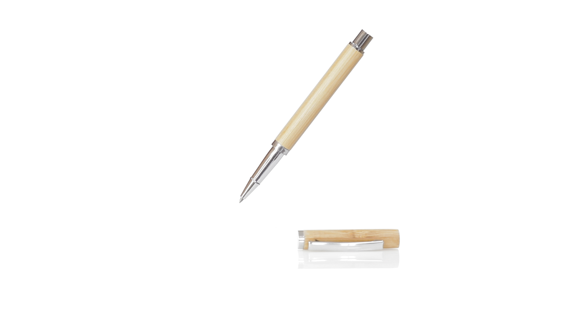 Tintenroller mit Deckel aus der Nature Line. Hergestellt aus Bambus, mit glattem Schaft und verchromten Beschlägen. Jumbo-Patrone, mit blauer Tinte.