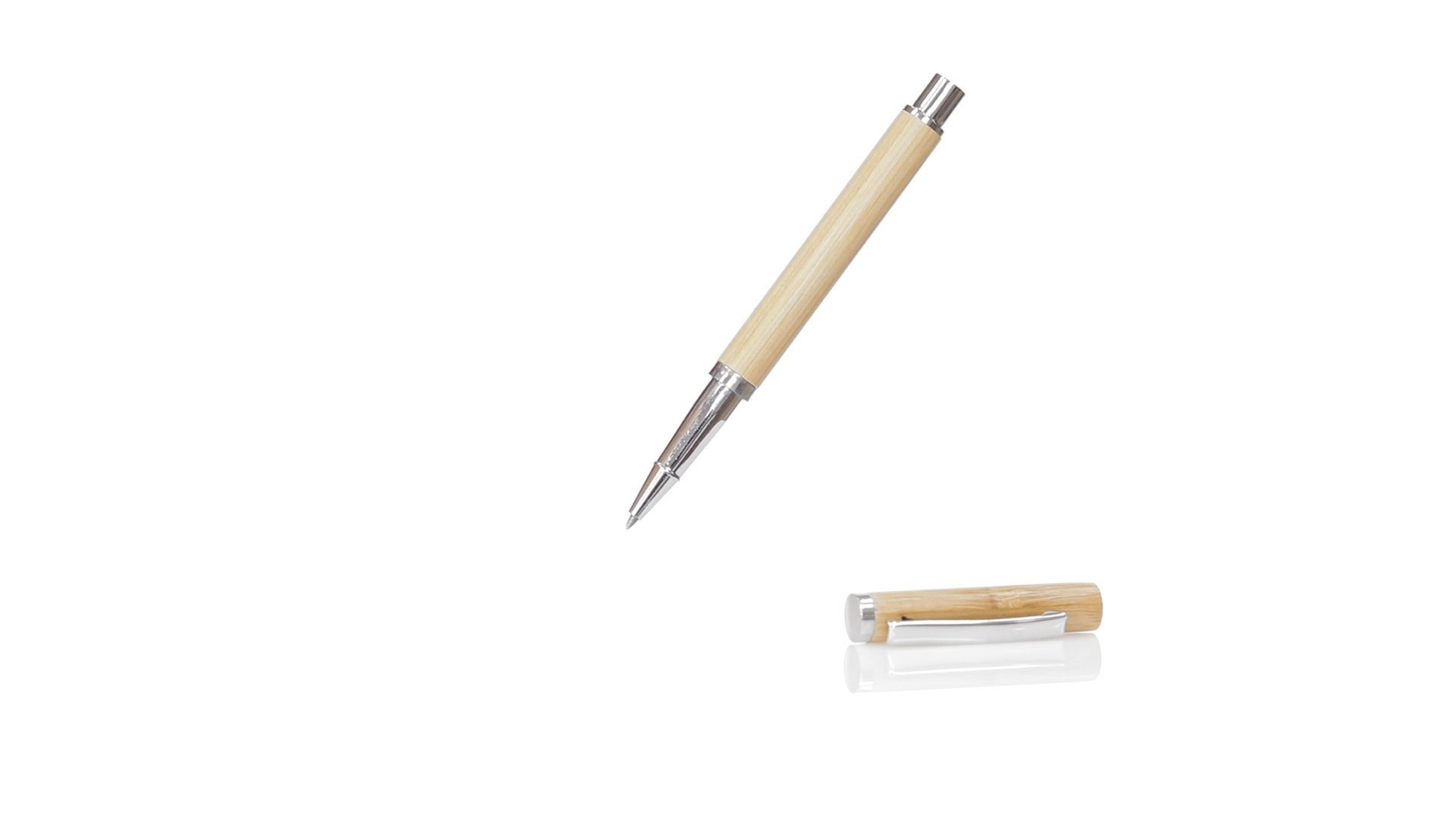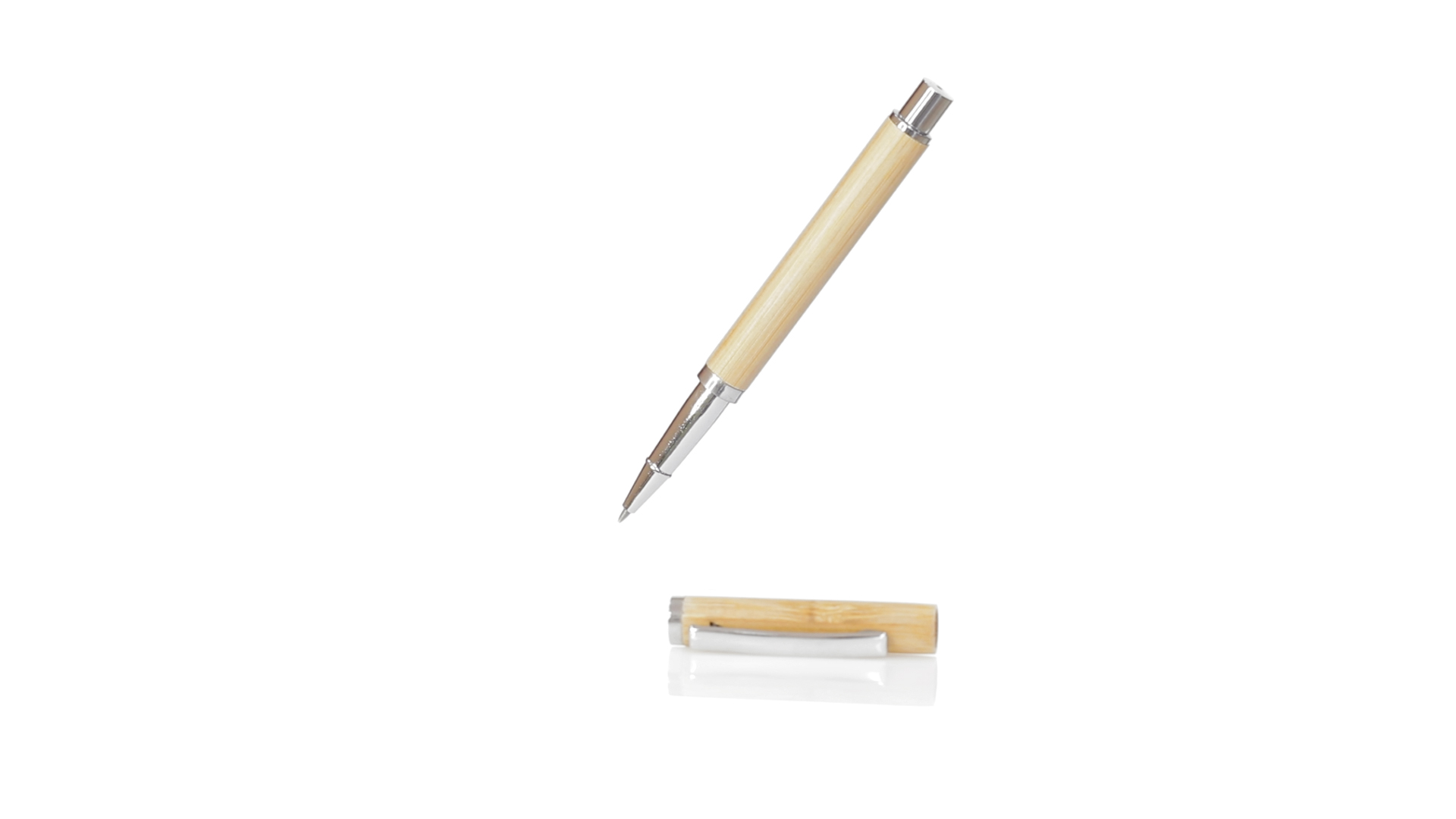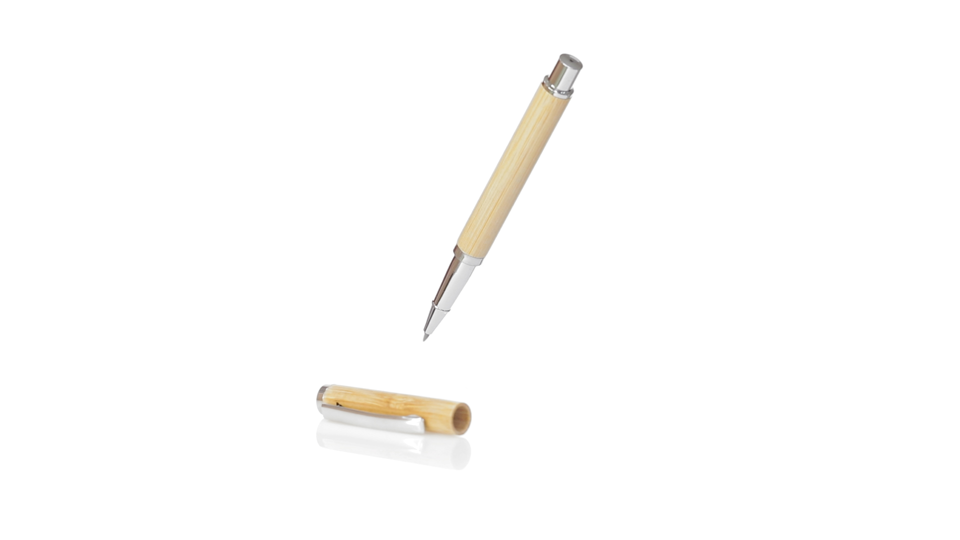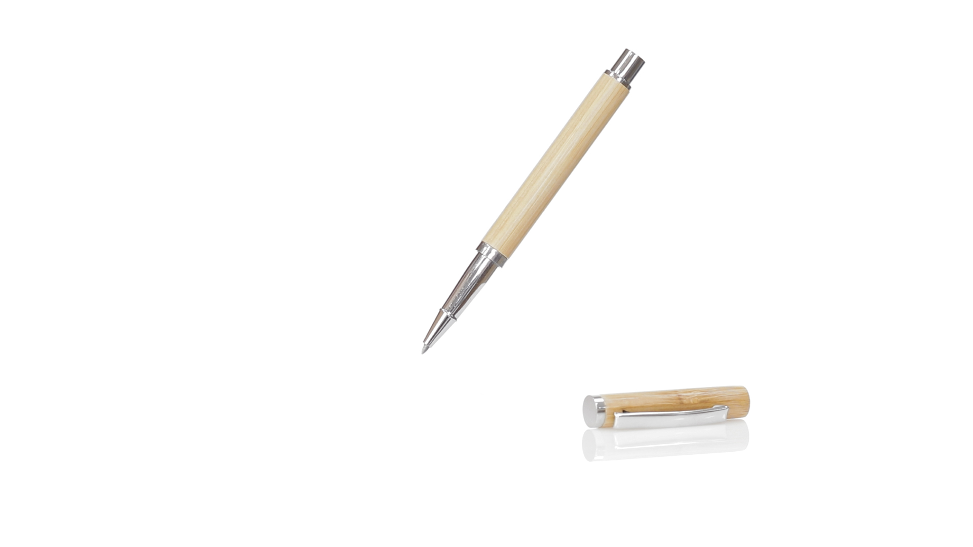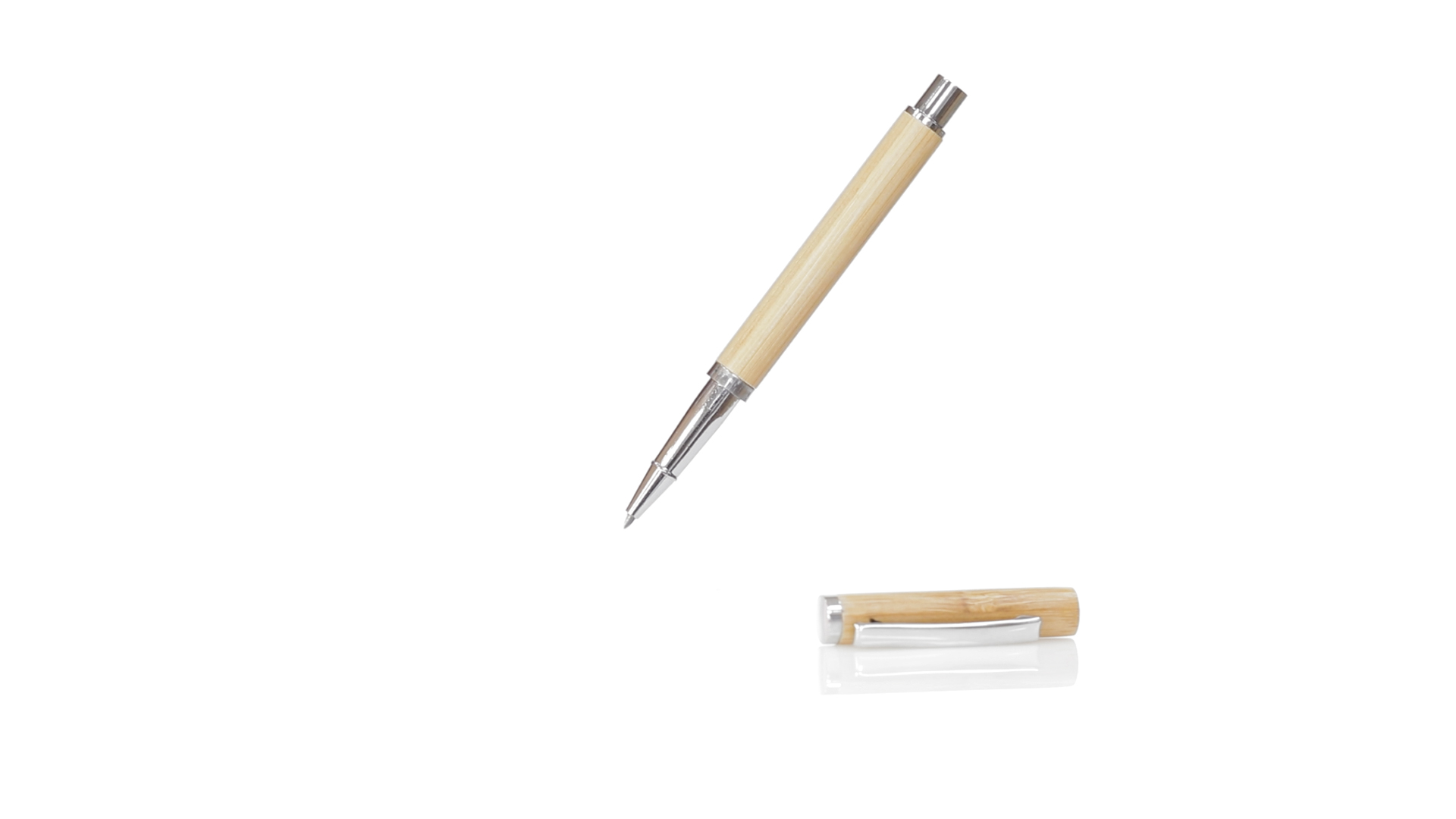 Tintenroller mit Deckel aus der Nature Line. Hergestellt aus Bambus, mit glattem Schaft und verchromten Beschlägen. Jumbo-Patrone, mit blauer Tinte.
