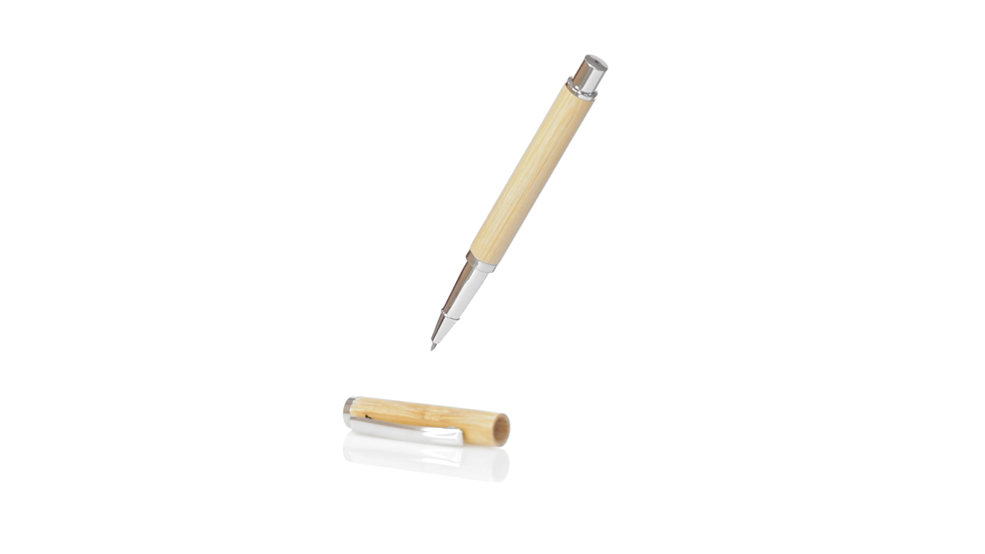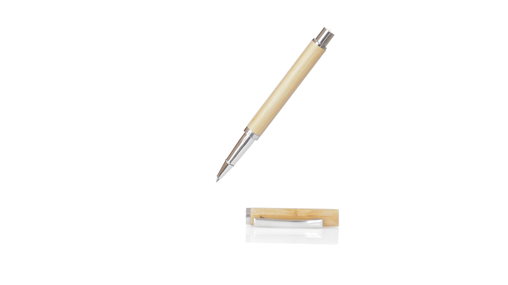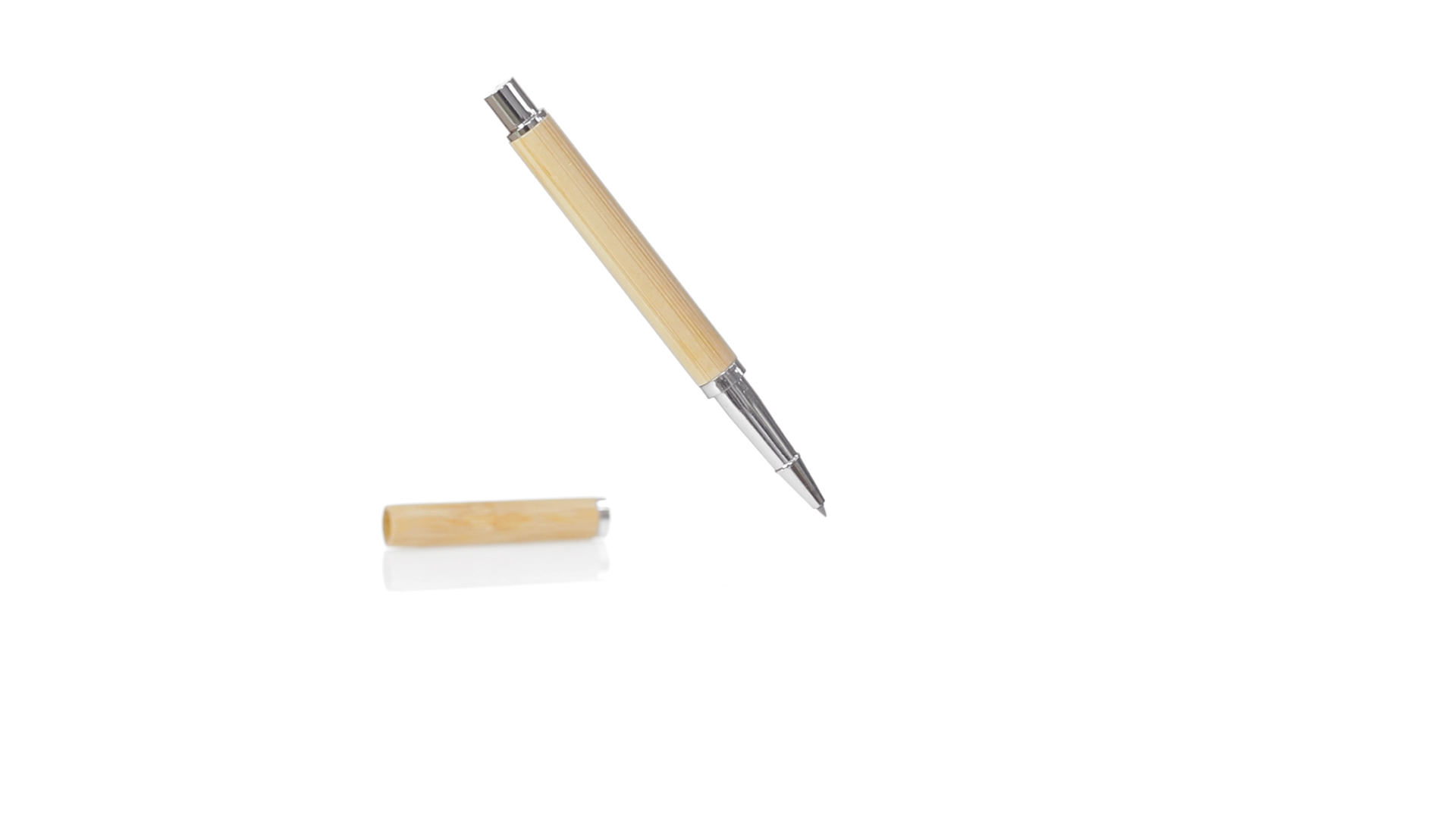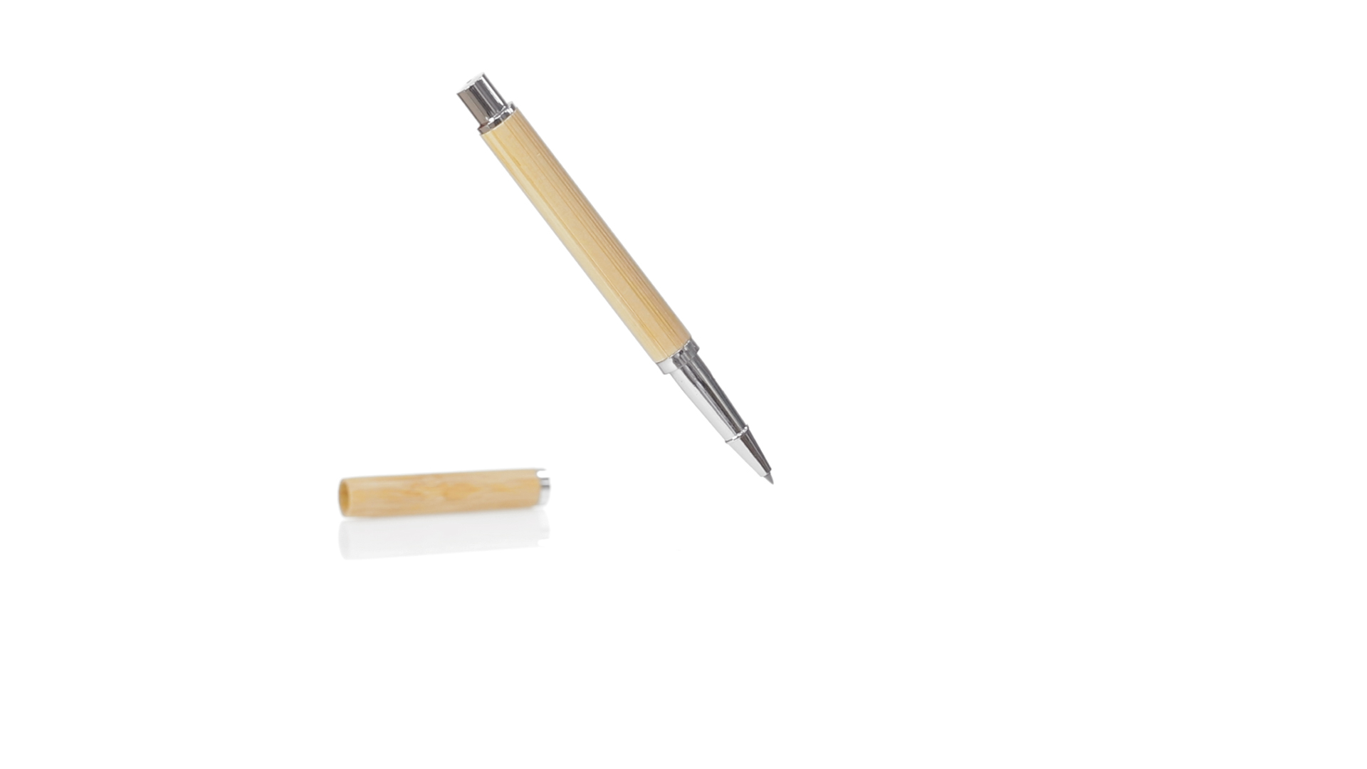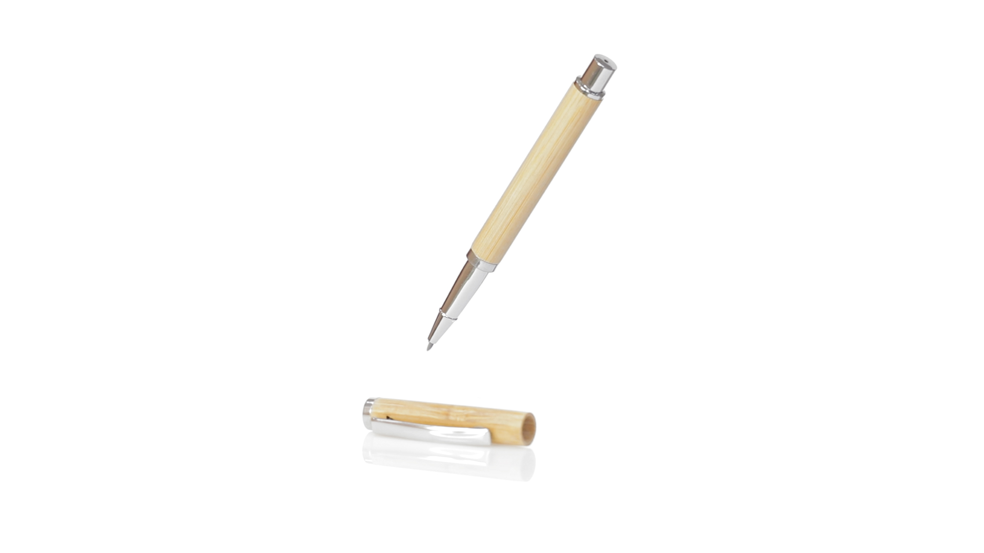 Tintenroller mit Deckel aus der Nature Line. Hergestellt aus Bambus, mit glattem Schaft und verchromten Beschlägen. Jumbo-Patrone, mit blauer Tinte.