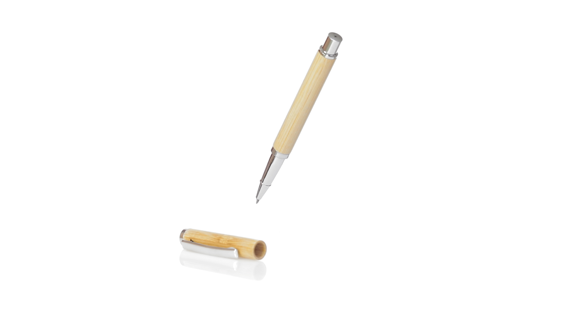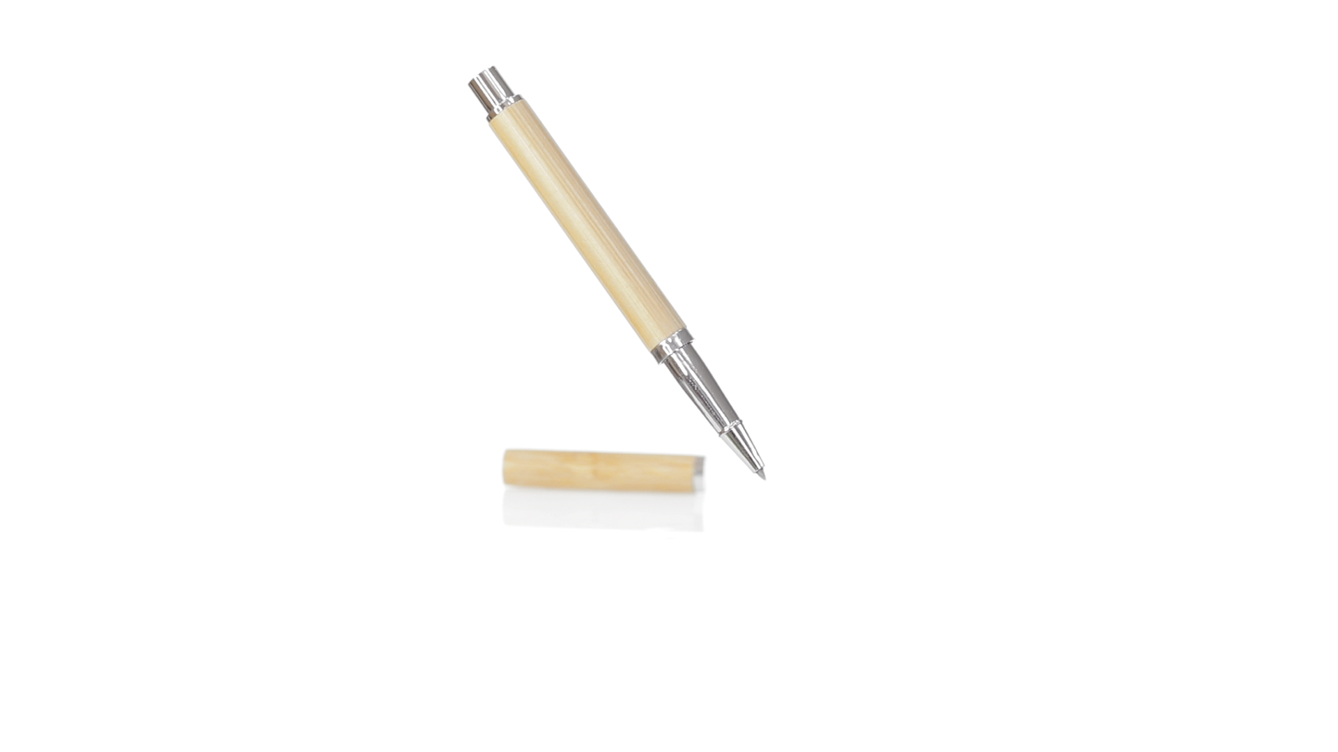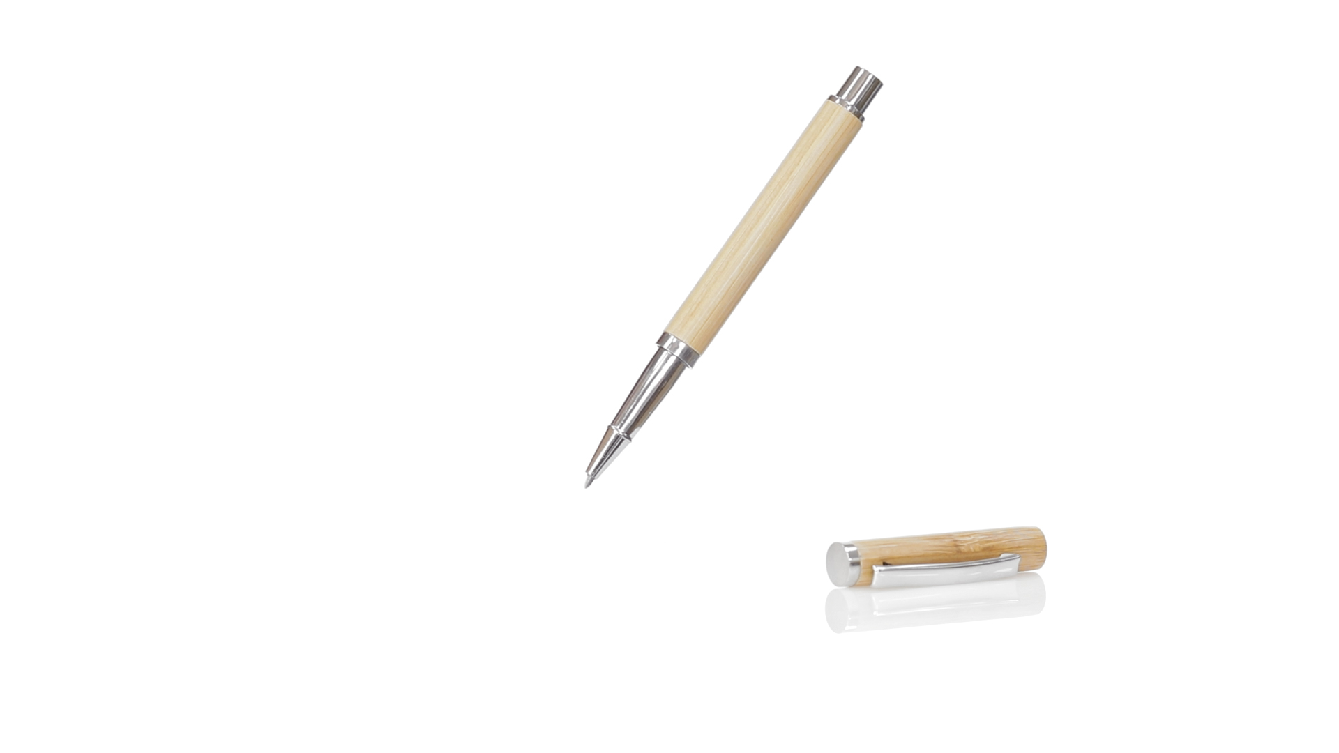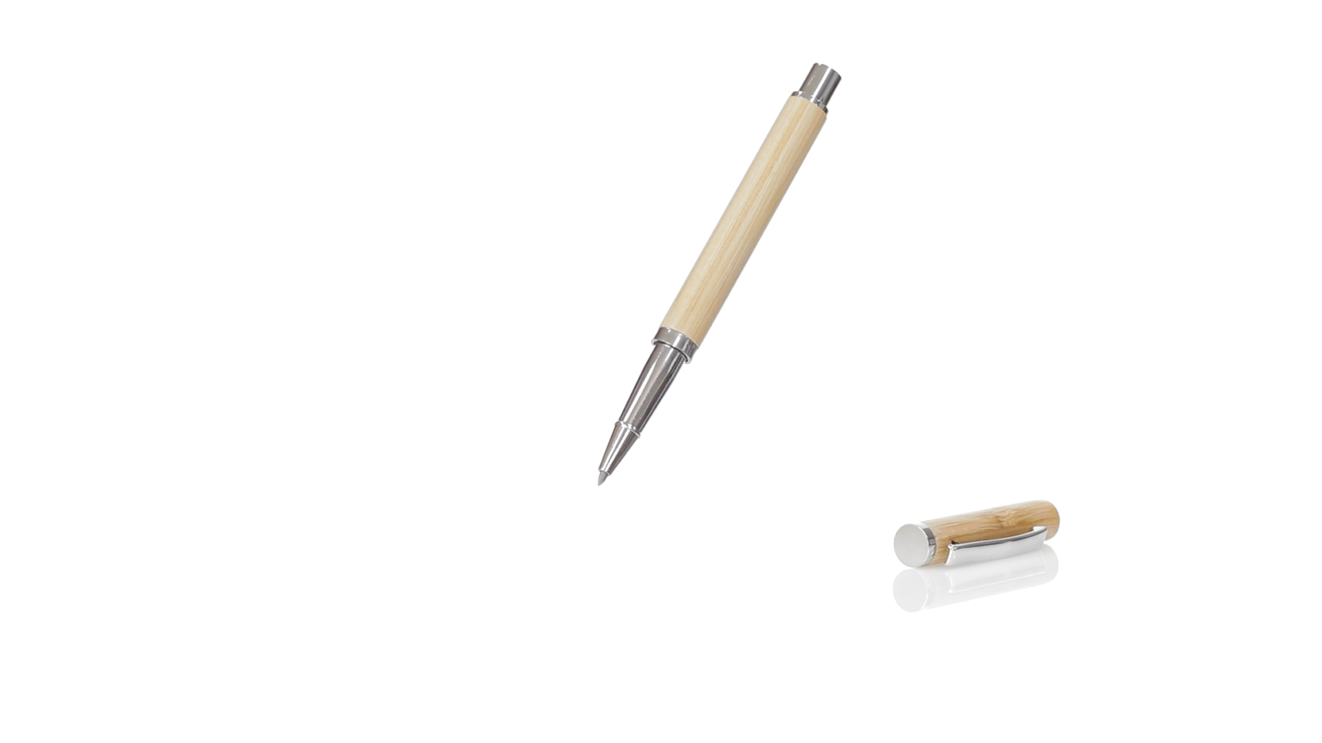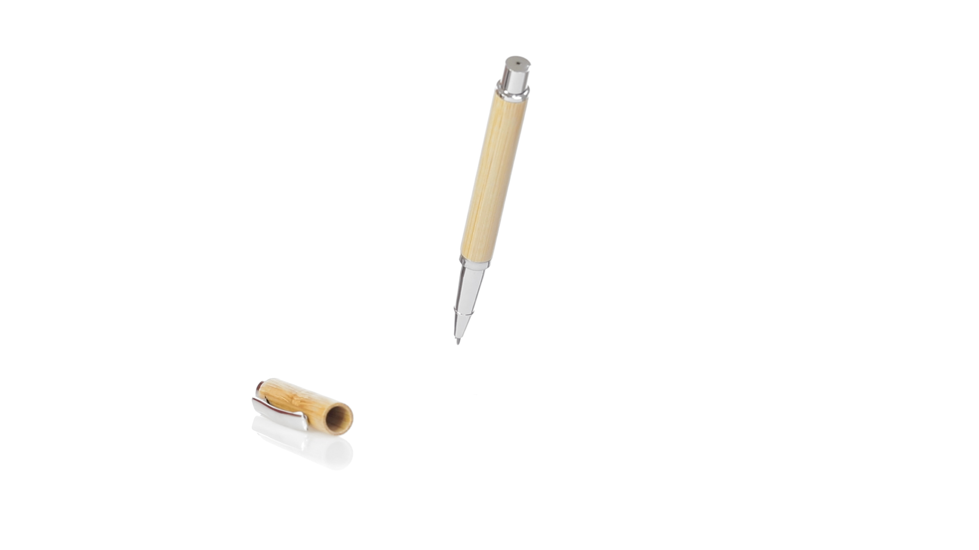 Tintenroller mit Deckel aus der Nature Line. Hergestellt aus Bambus, mit glattem Schaft und verchromten Beschlägen. Jumbo-Patrone, mit blauer Tinte.