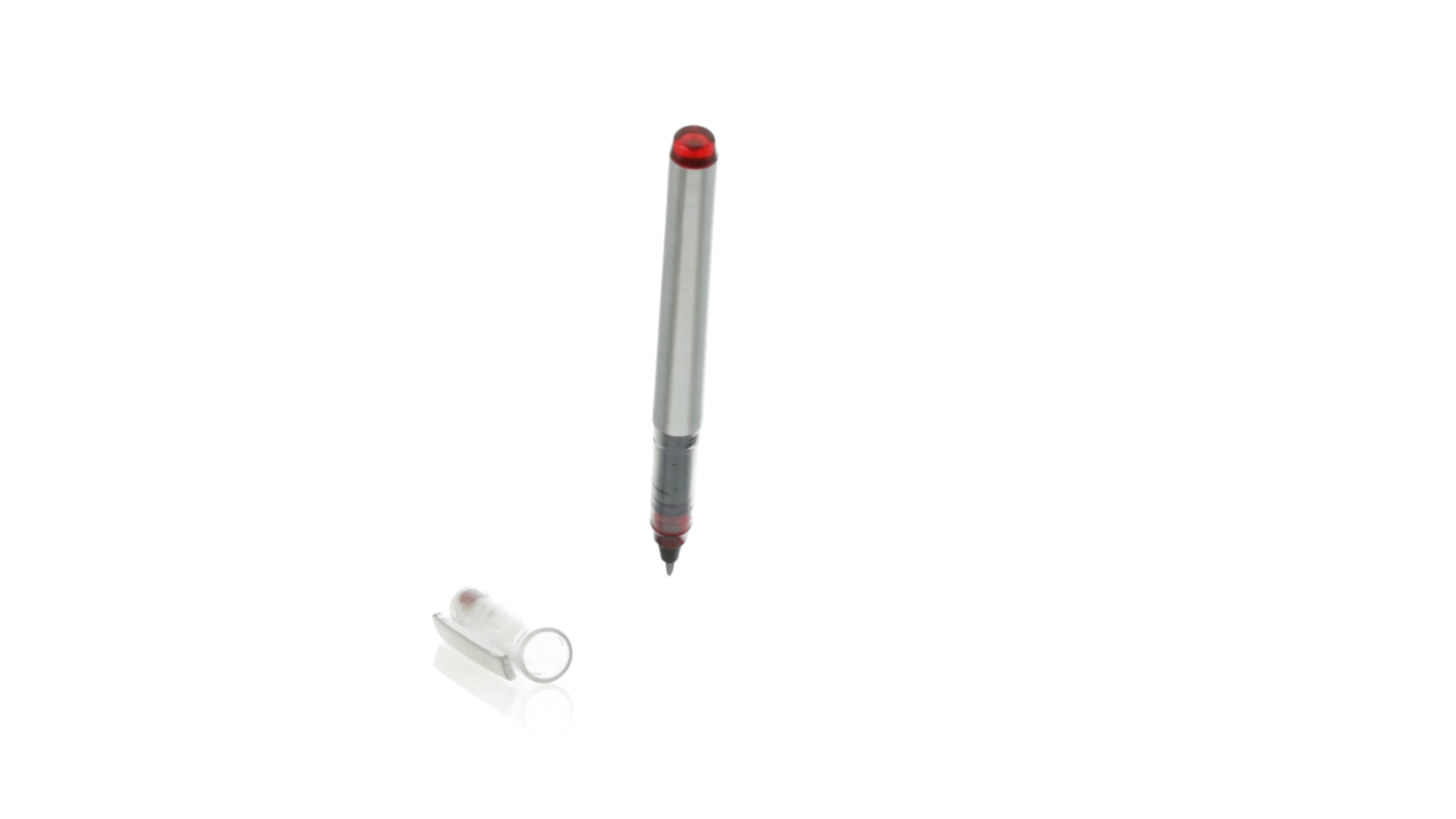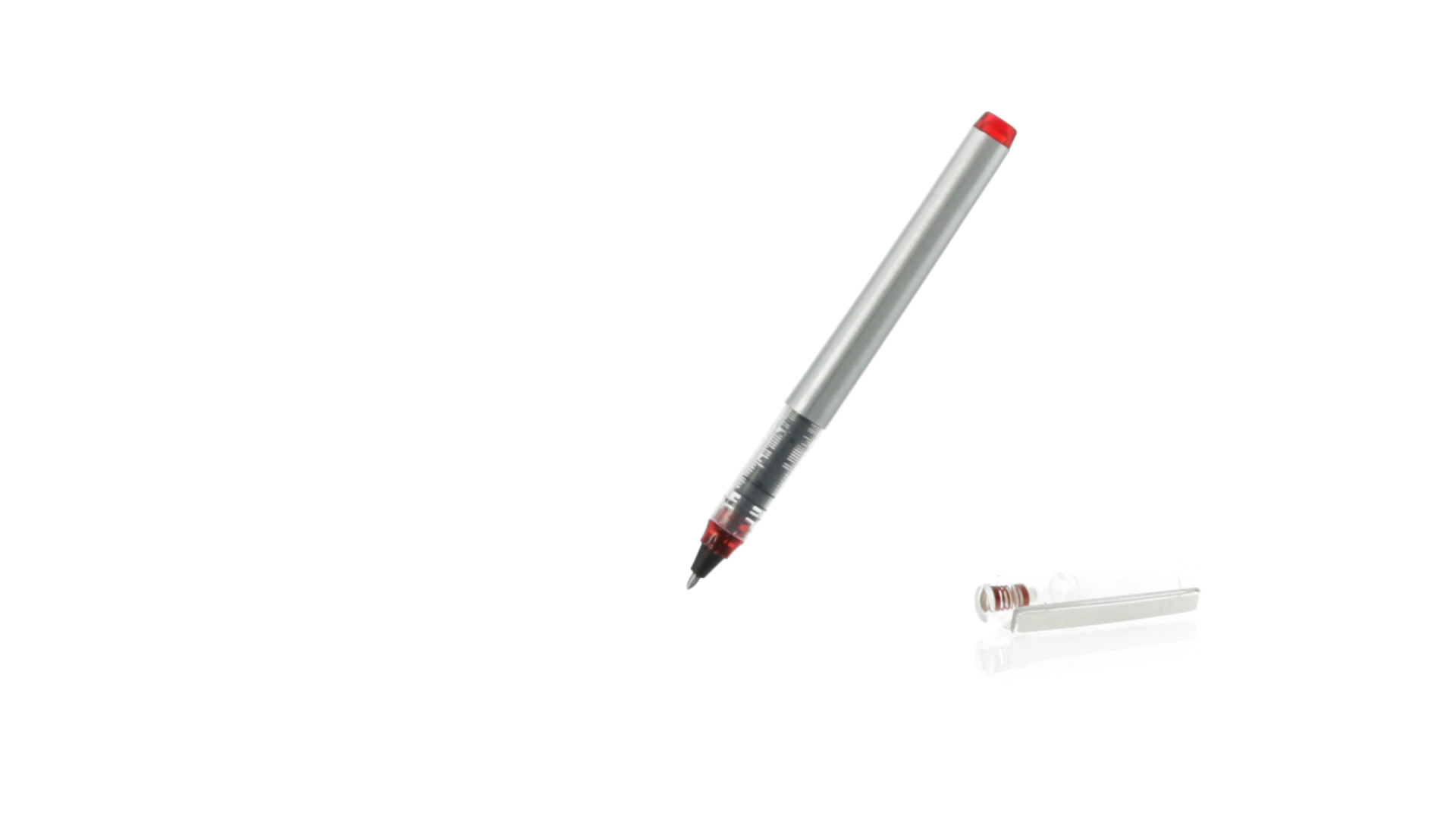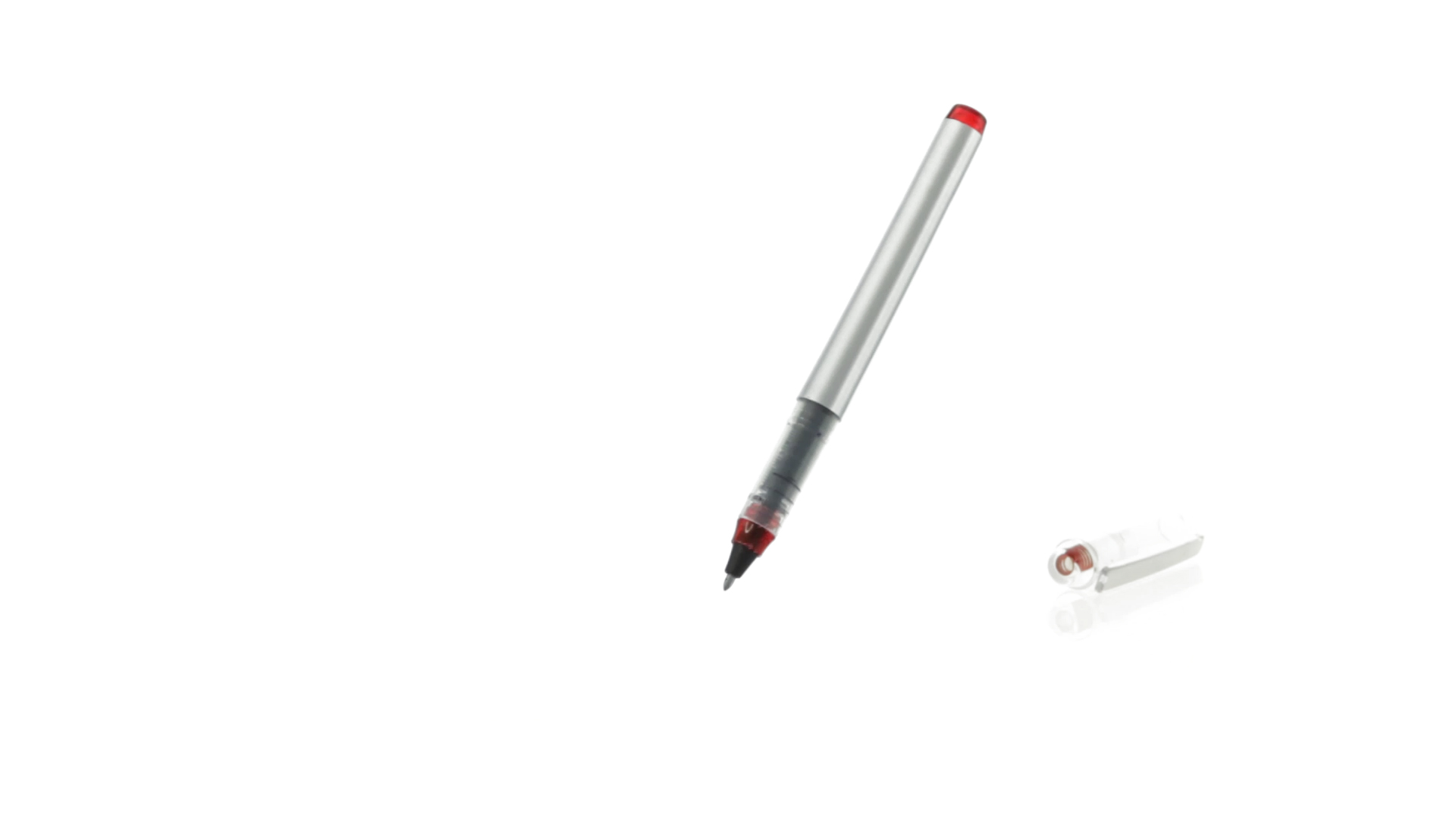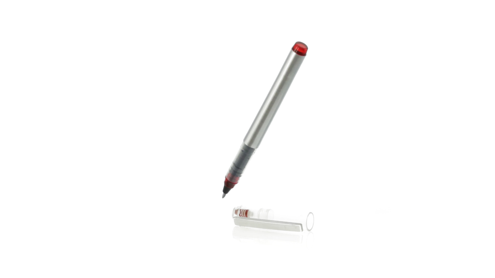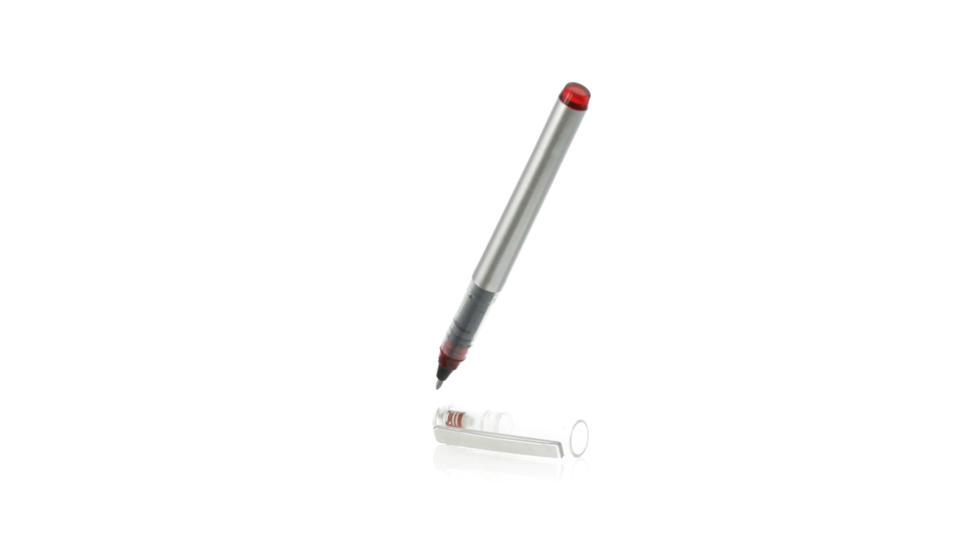 Tintenroller von STYB mit transparenter Kappe und originellem, zweifarbigem Design sowie silbernem Schaft und Kontrastdetails in verschiedenen lebhaften Farben. Mit blauer Tinte.