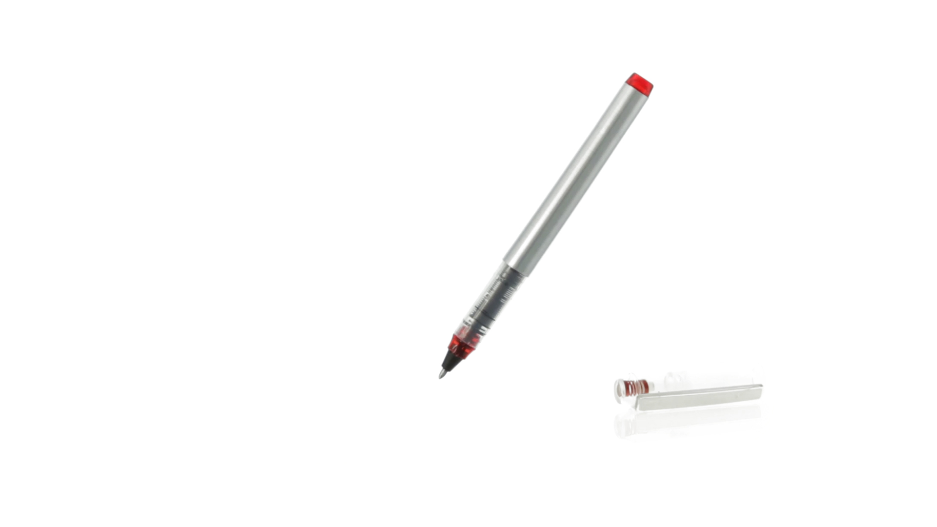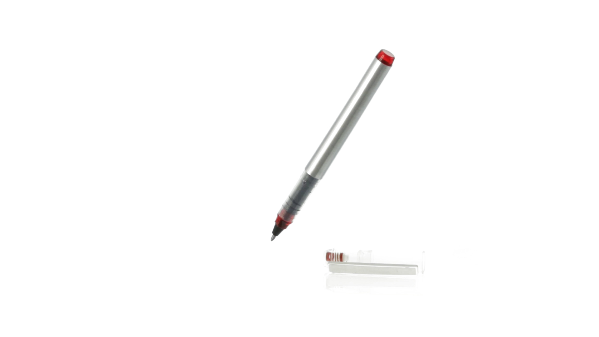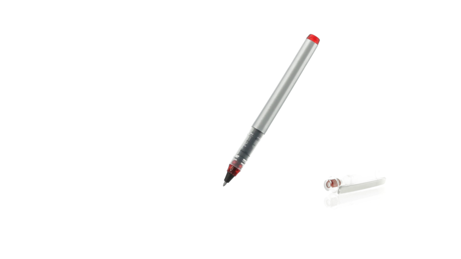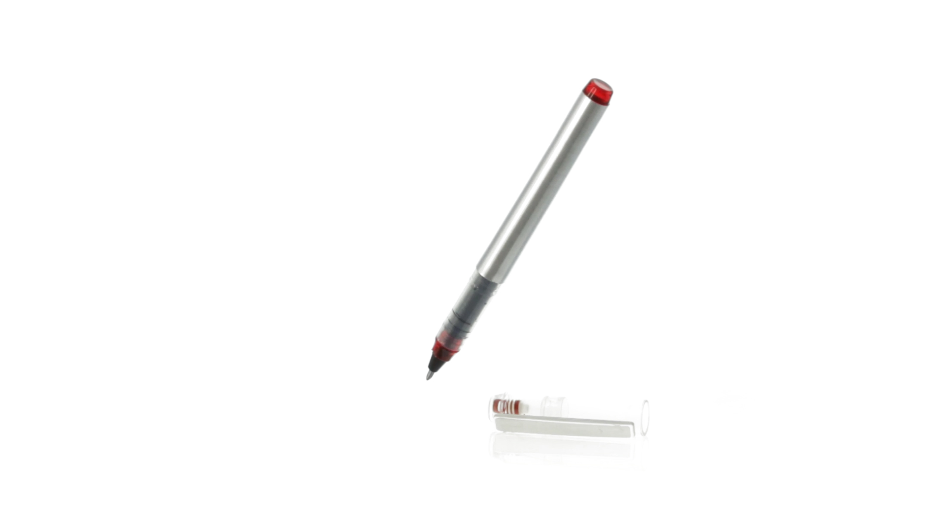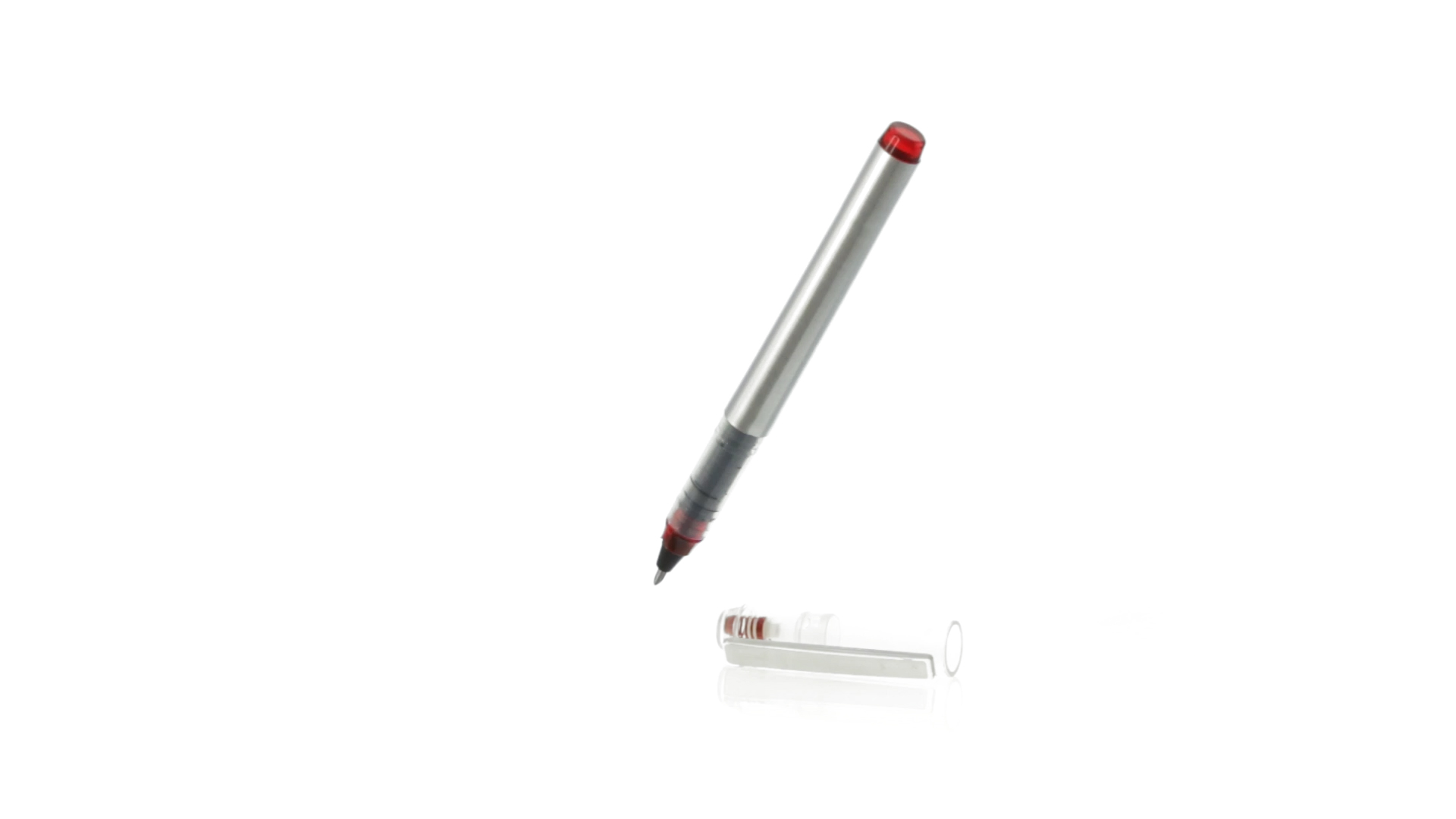 Tintenroller von STYB mit transparenter Kappe und originellem, zweifarbigem Design sowie silbernem Schaft und Kontrastdetails in verschiedenen lebhaften Farben. Mit blauer Tinte.