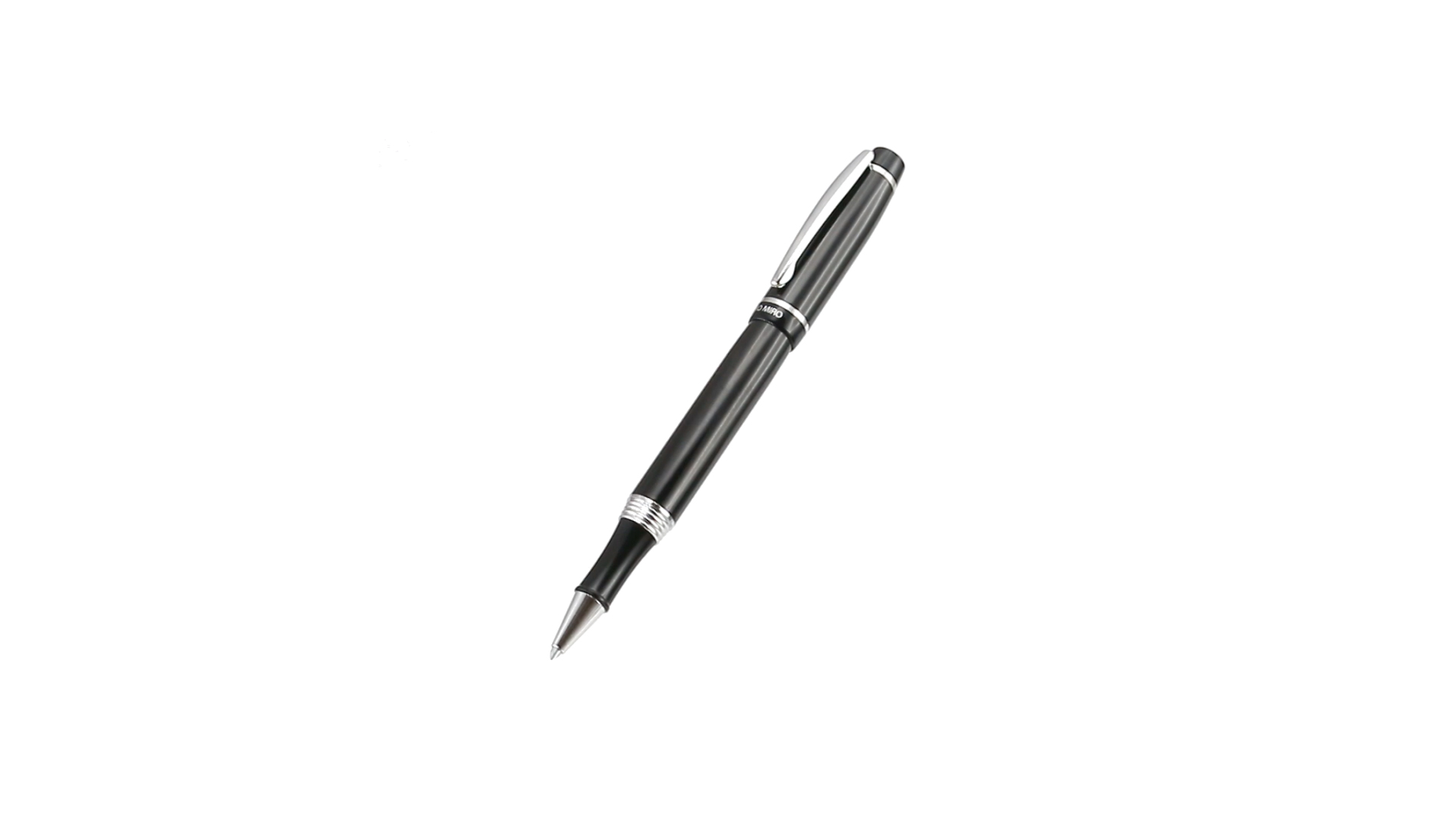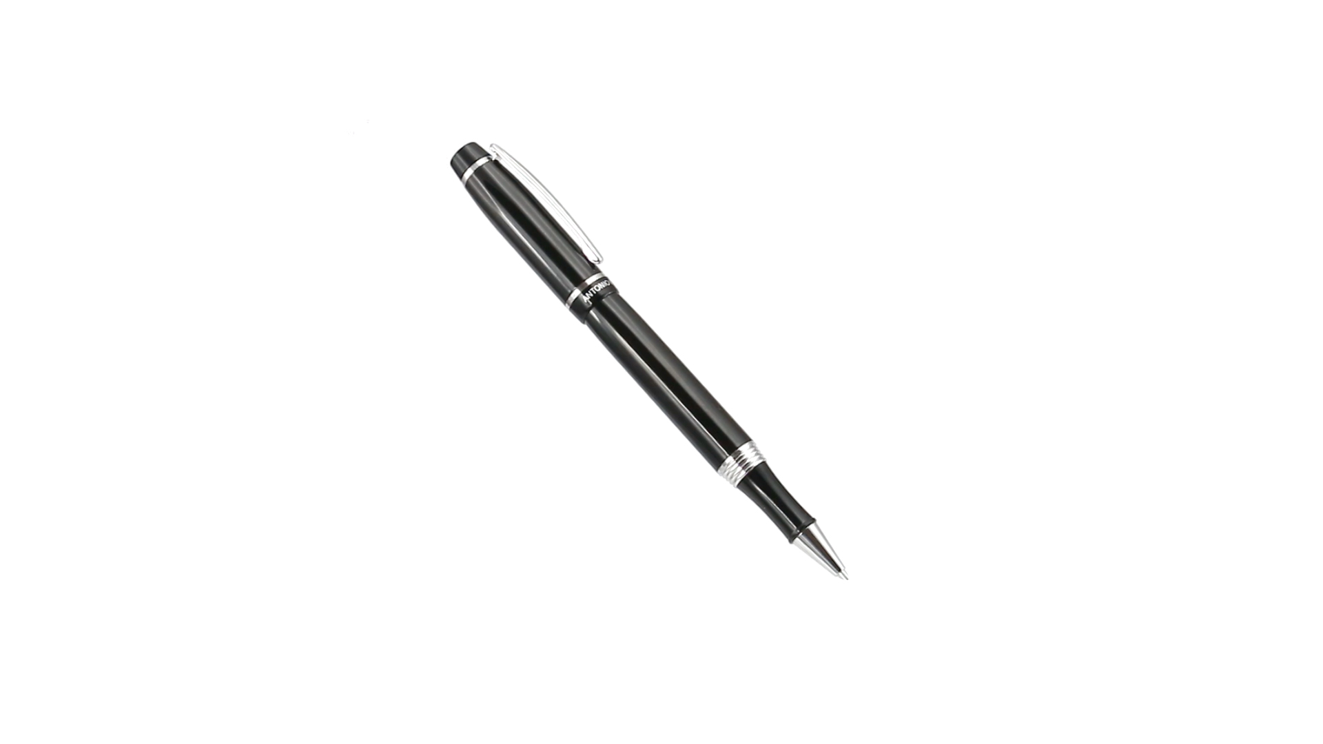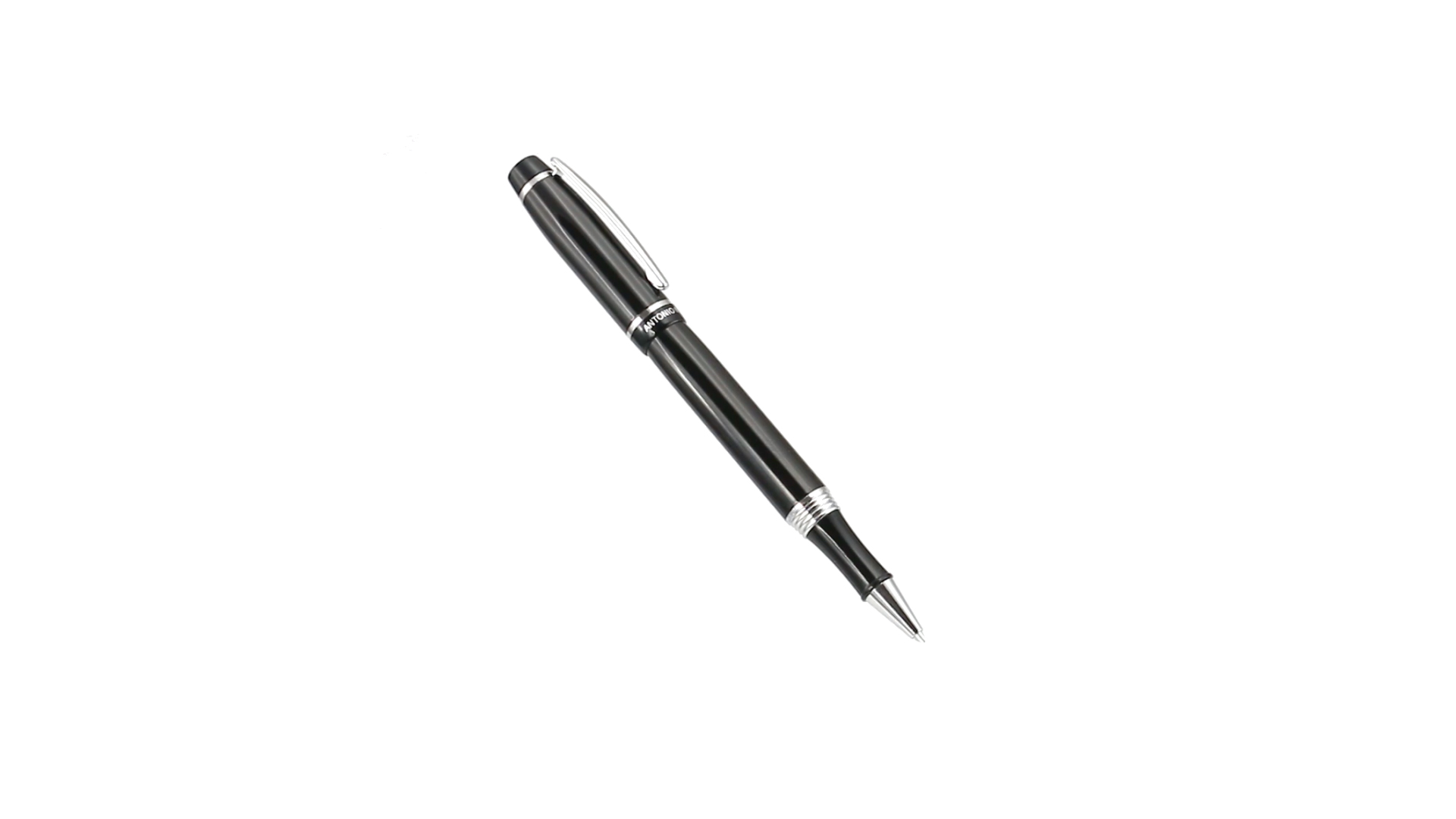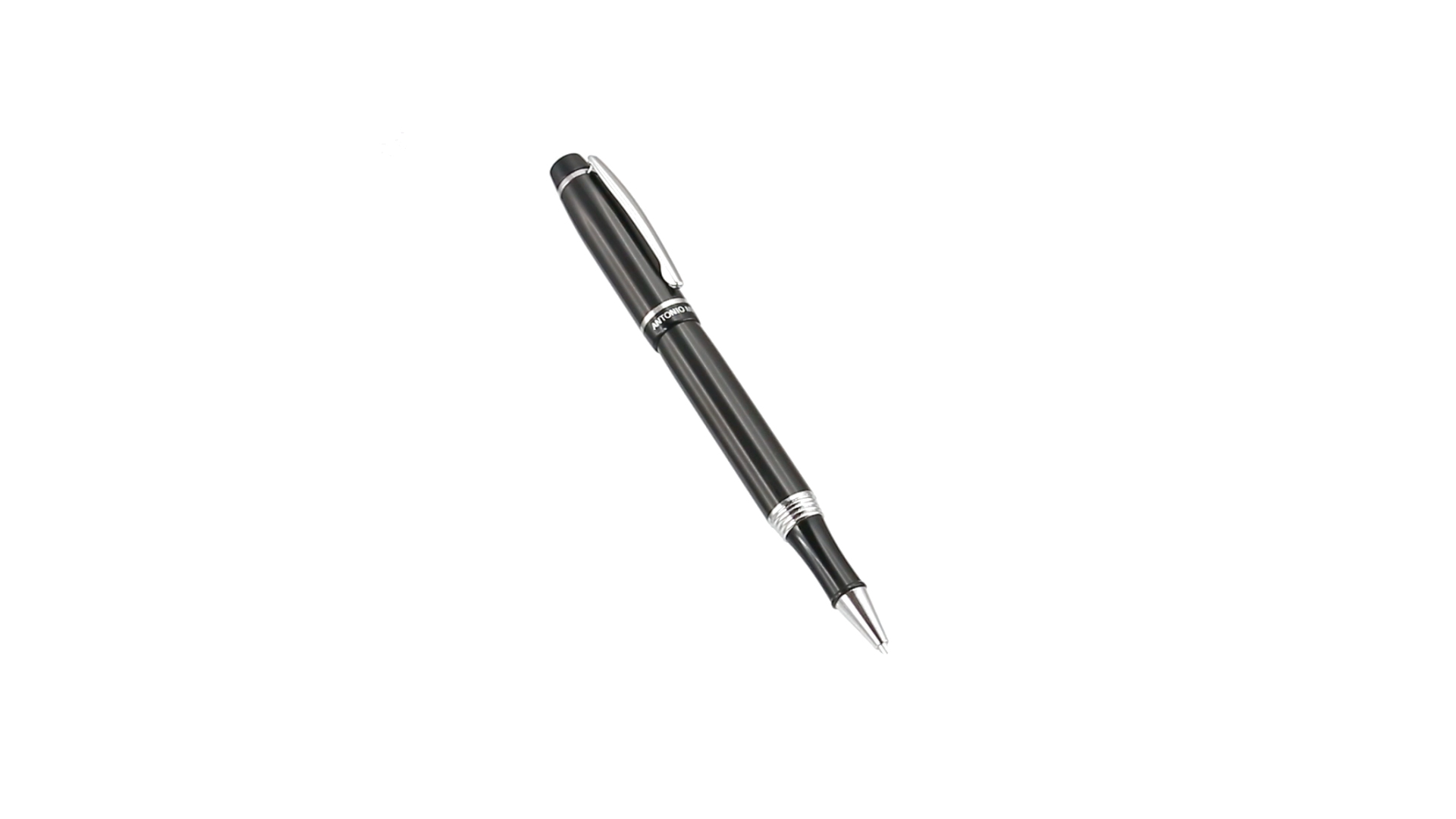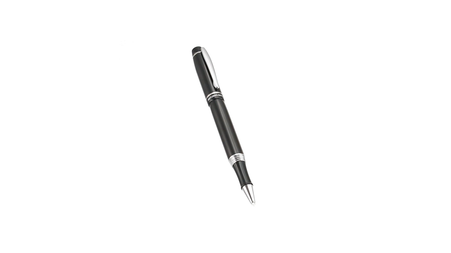 Tintenroller von Antonio Miró mit elegantem, zweifarbigem Design und geschmeidigem Metallschaft in schlichtem Schwarz. Mit dem Markenlogo unterhalb des Rings sowie Clip und Spitze in glänzendem Silber. Präsentiert in einer individuellen Schachtel in Schwarz mit dem Markenlogo. Blaue Tinte.