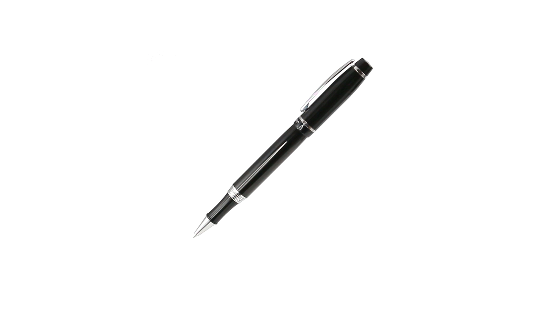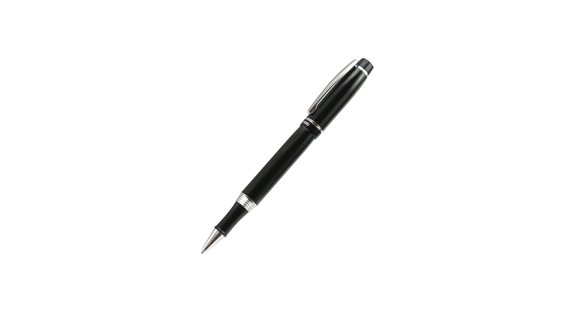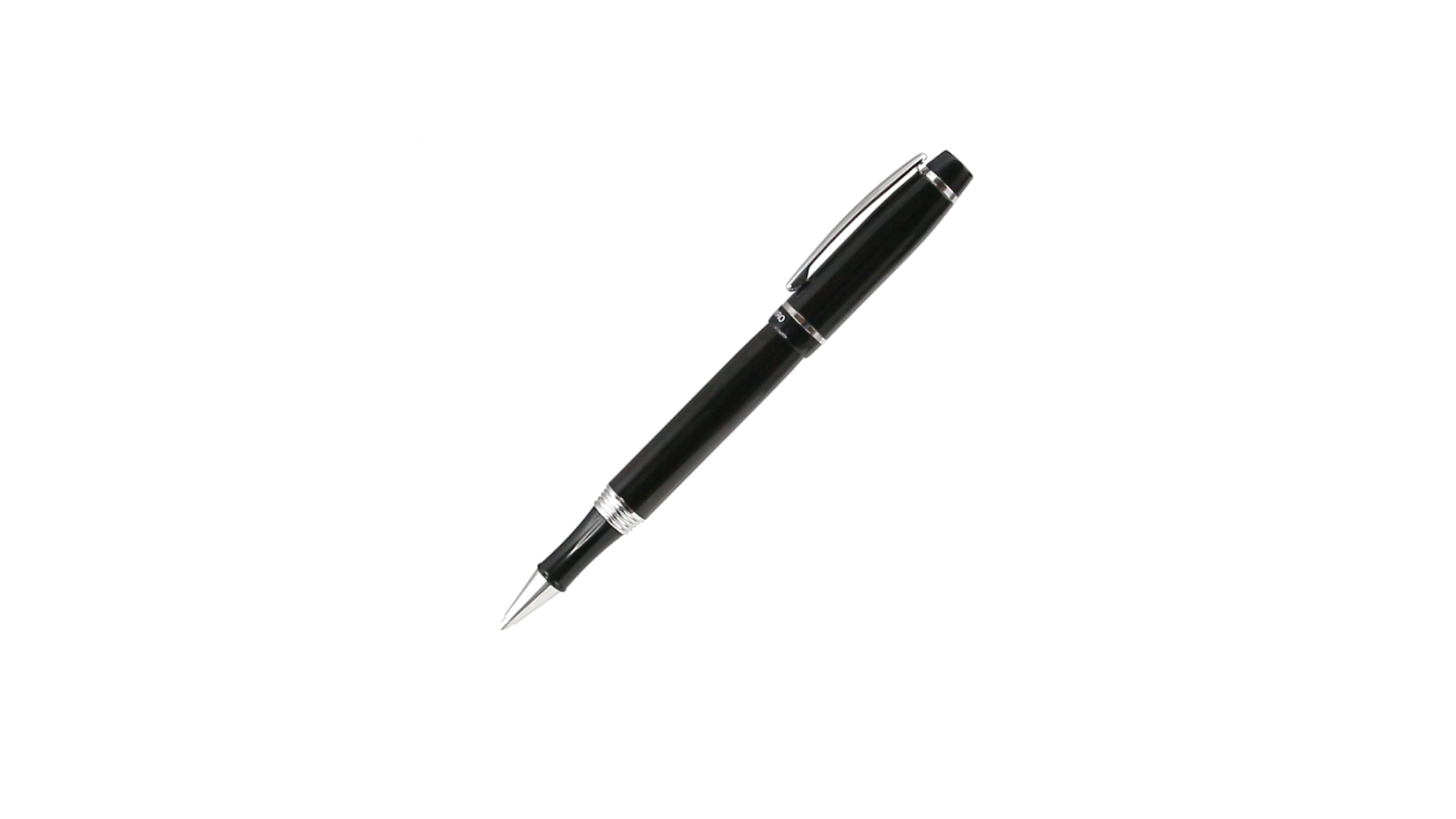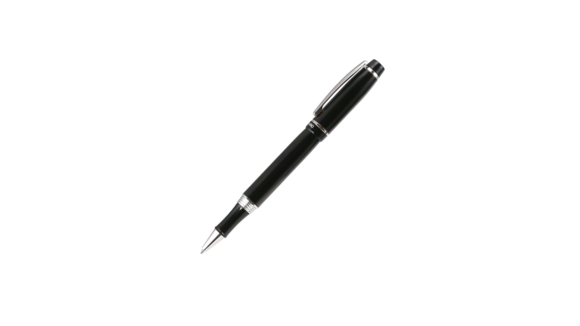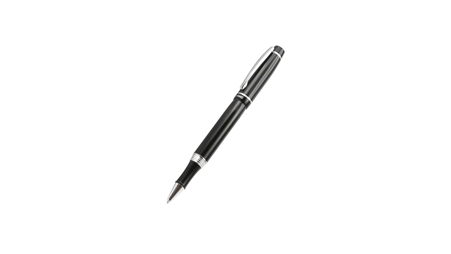 Tintenroller von Antonio Miró mit elegantem, zweifarbigem Design und geschmeidigem Metallschaft in schlichtem Schwarz. Mit dem Markenlogo unterhalb des Rings sowie Clip und Spitze in glänzendem Silber. Präsentiert in einer individuellen Schachtel in Schwarz mit dem Markenlogo. Blaue Tinte.