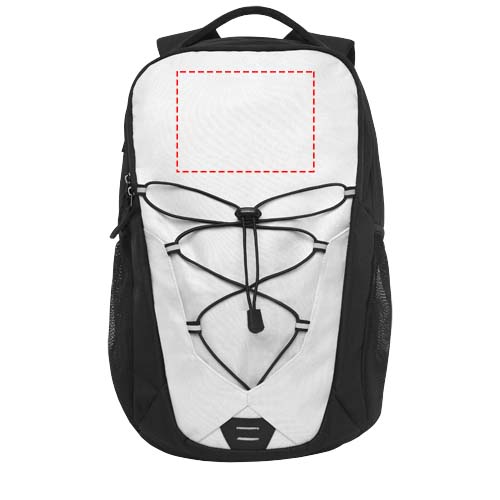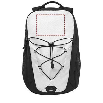 Eine Mischung aus Outdoor- und Alltagsrucksack aus farbigem Stoff und elastischer Kordel mit reflektierenden Akzenten auf der Vorderseite. Ausgestattet mit zwei Netz-Aussentaschen für Wasserflaschen, einem Frontfach mit mehreren kleinen Fächern, einem Haken und einer 12-Zoll-Tablethülle. Der Rucksack hat einen gepolsterten, verstärkten Griff und eine bequeme, gepolsterte Rückseite. Geeignet für einen 15,6-Zoll-Laptop in einer gepolsterten Hülle im Hauptfach.