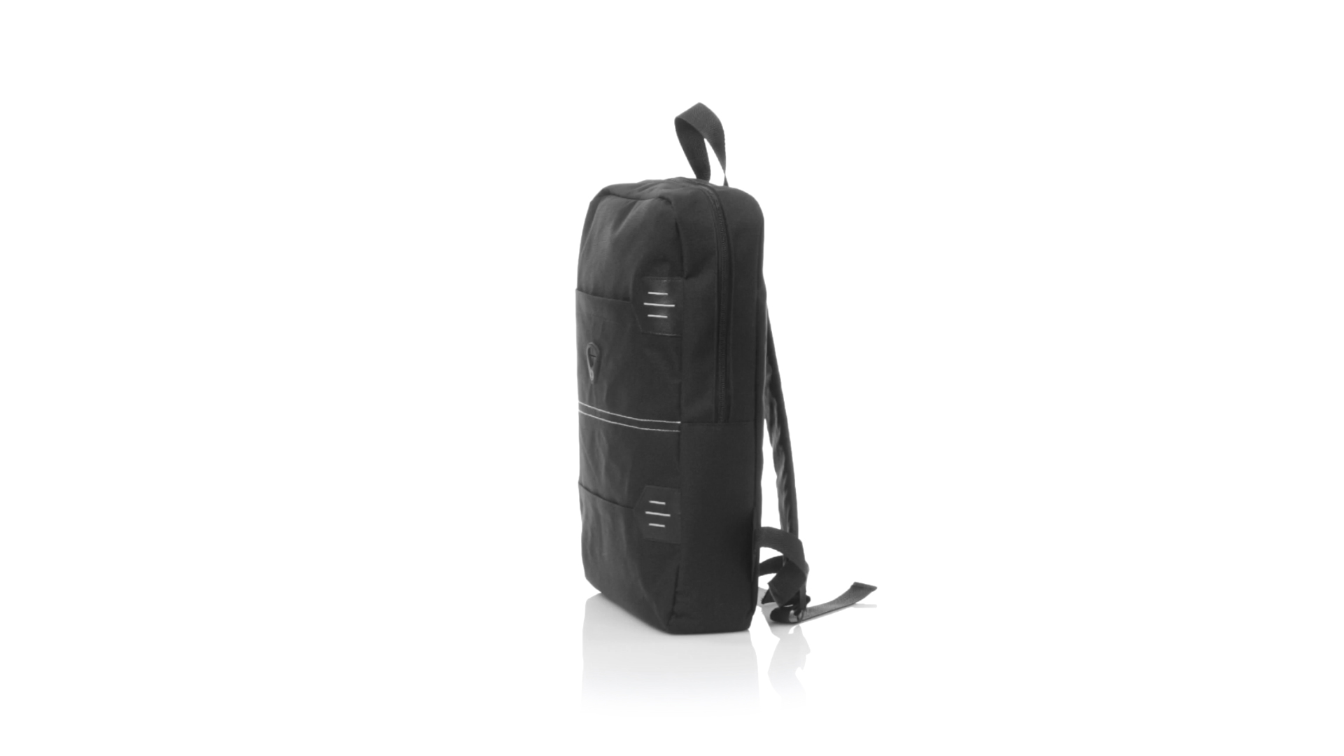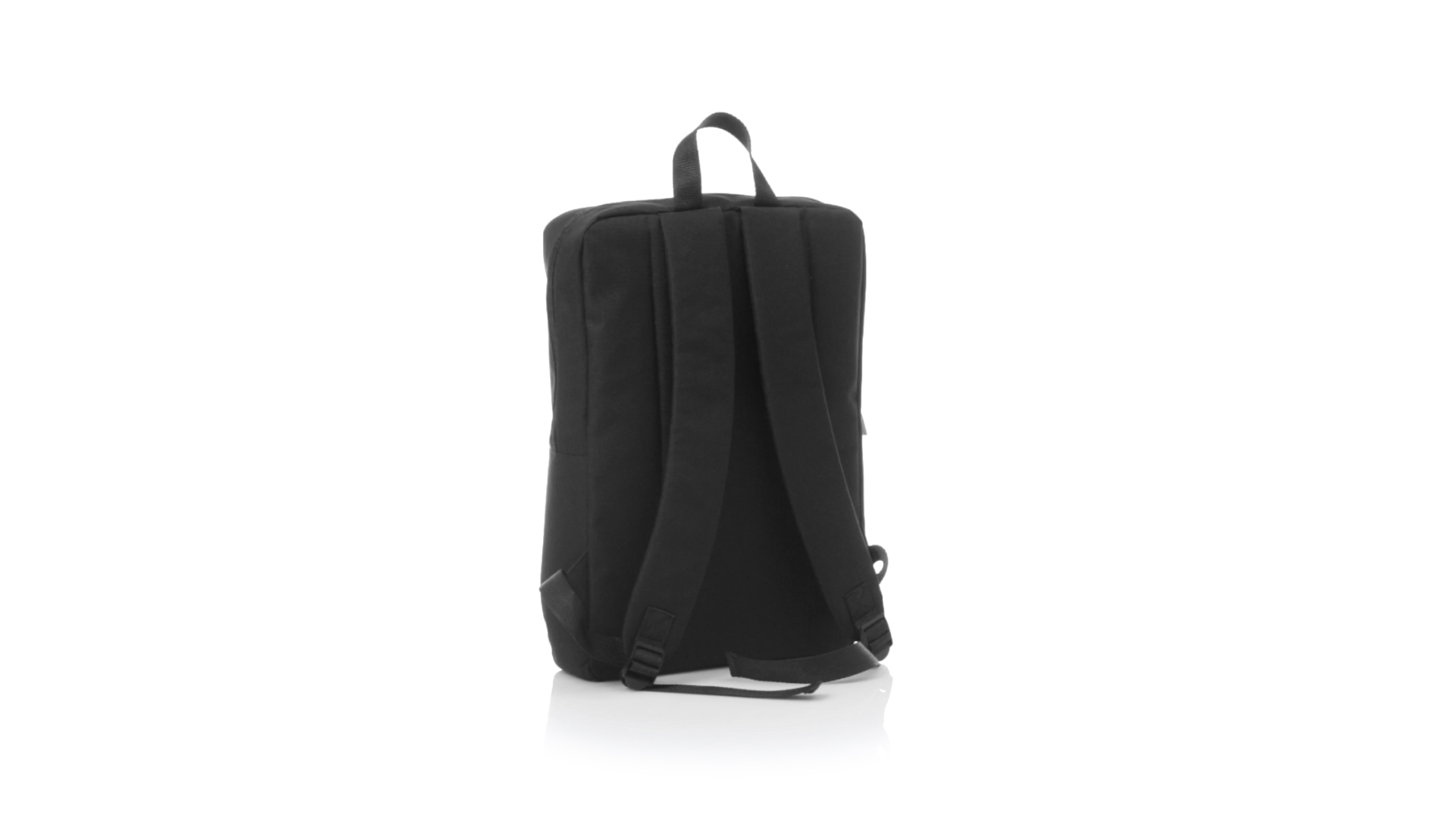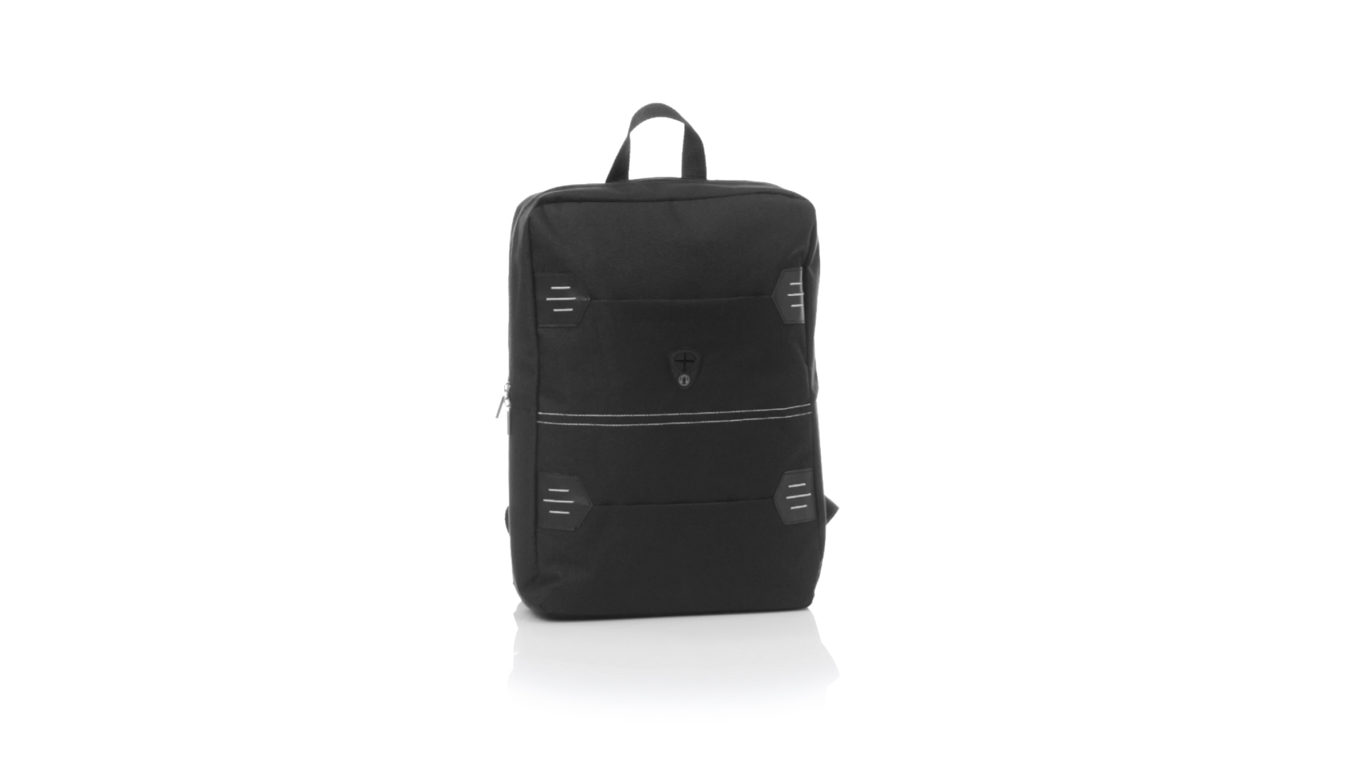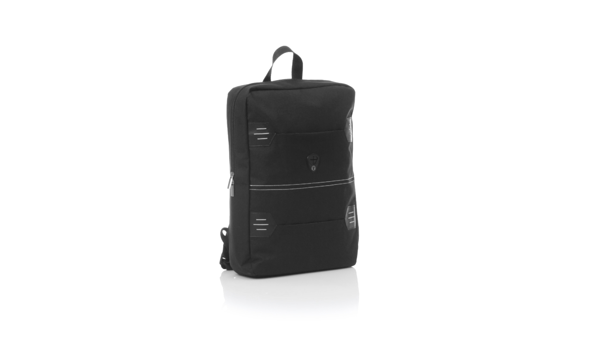 Rucksack aus resistentem 600D Polyester mit rechteckigem Design in elegantem Schwarz. Mit gepolstertem Rückenpanel und Schultergurten sowie gepolstertem Innenfach für einen Laptop von bis zu 15 Zoll und Kopfhörerausgang.