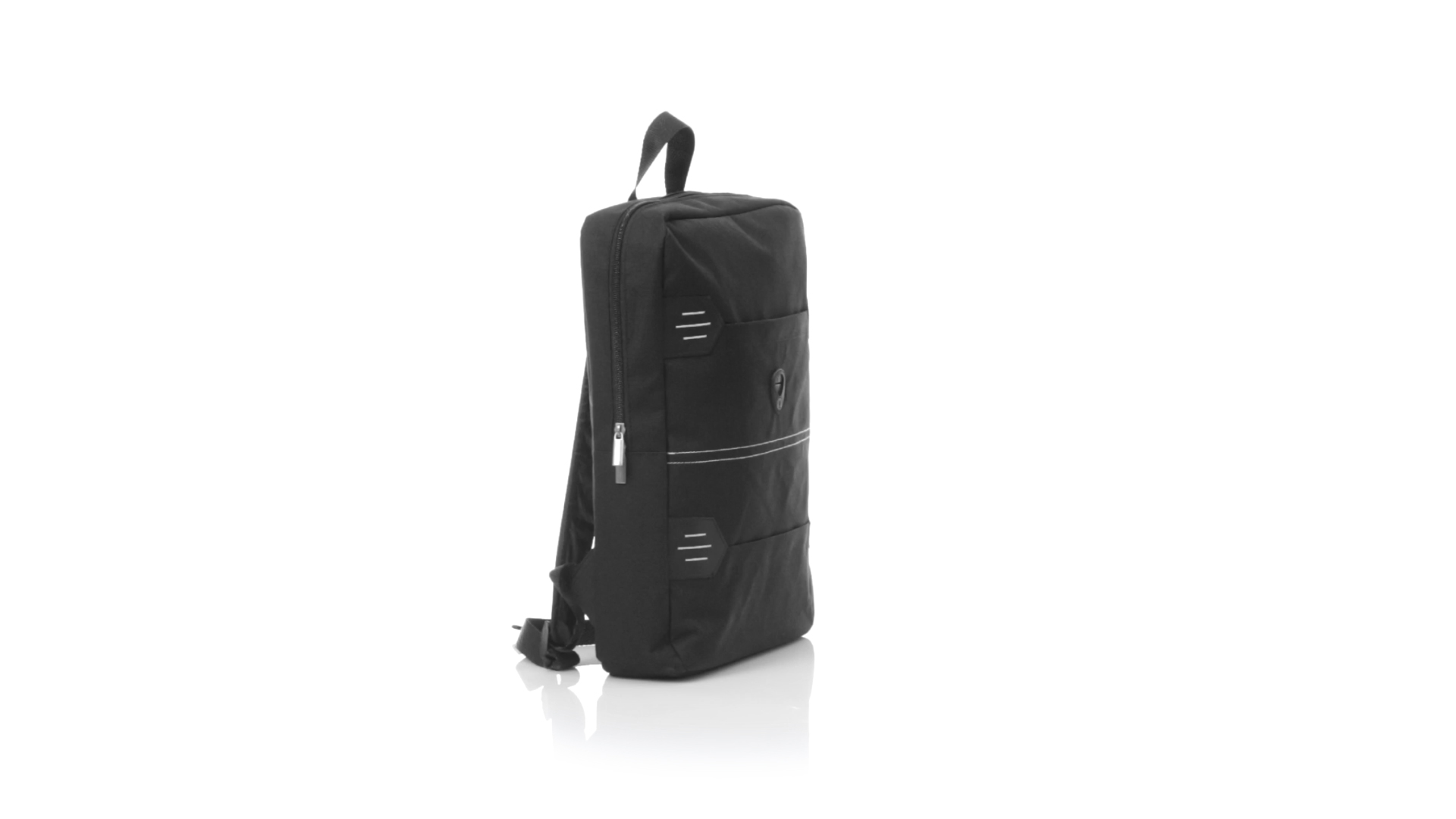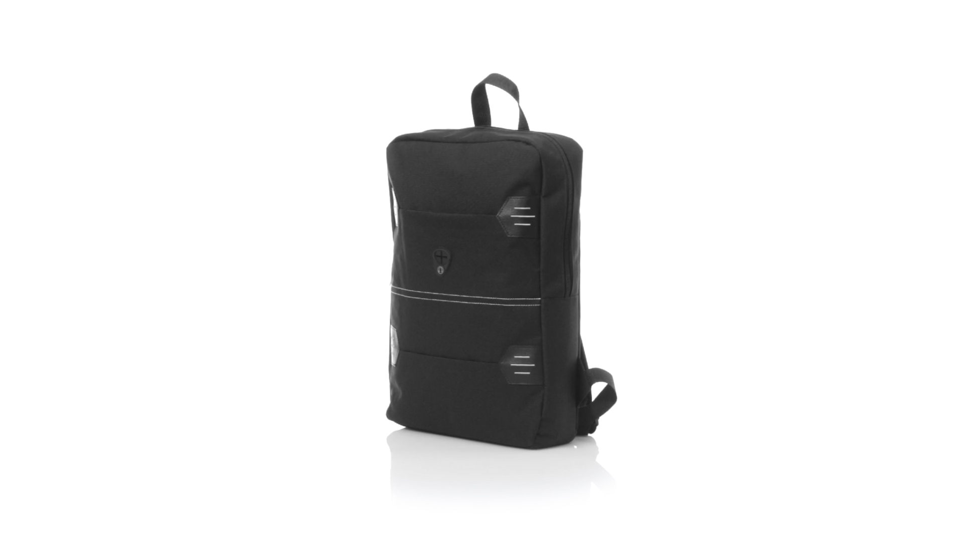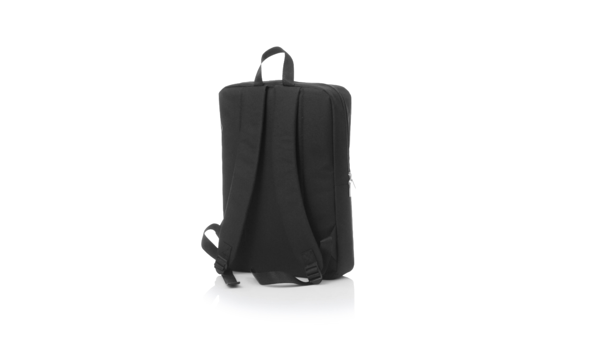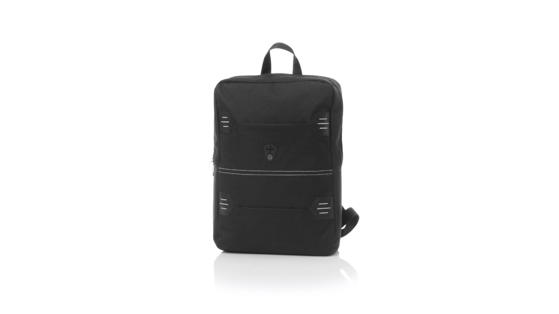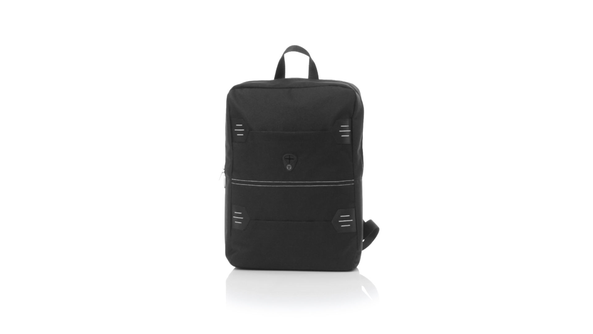 Rucksack aus resistentem 600D Polyester mit rechteckigem Design in elegantem Schwarz. Mit gepolstertem Rückenpanel und Schultergurten sowie gepolstertem Innenfach für einen Laptop von bis zu 15 Zoll und Kopfhörerausgang.