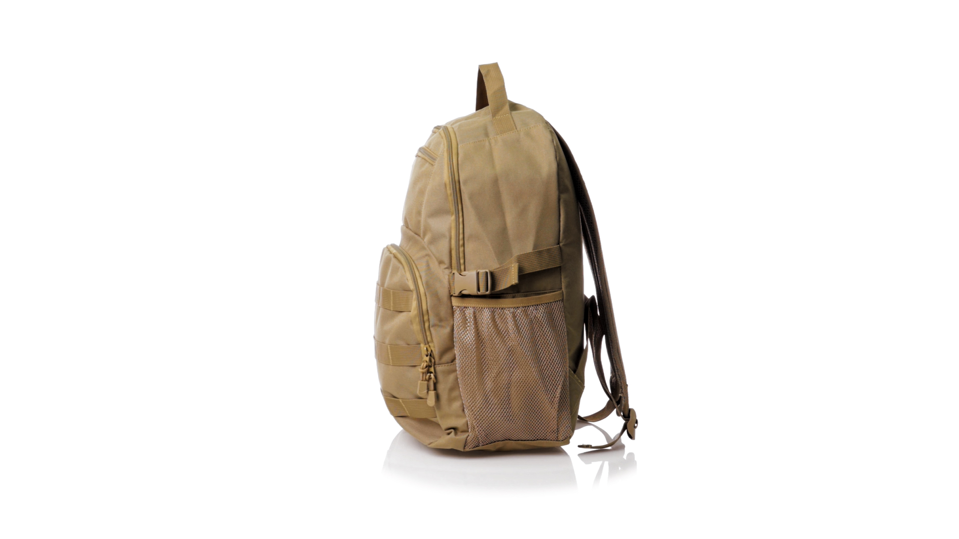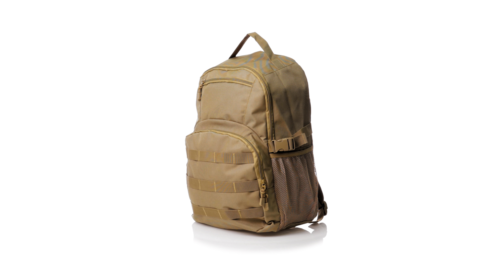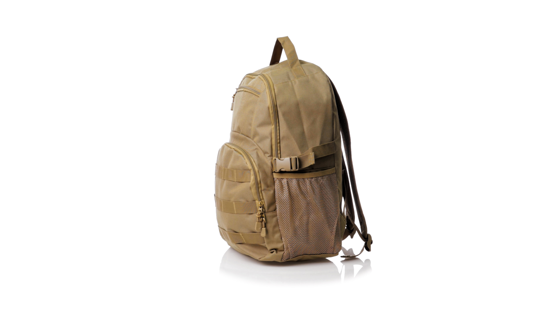 Taktischer Rucksack aus strapazierfähigem 800D-Polyester in Sandbrauntönen. Vorderseite mit mehreren elastischen Halterungen zum Aufhängen des notwendigen Zubehörs für das Abenteuer. Hauptfach mit Doppelreissverschluss und Tasche. Mit verstärkten Ecken, Tragegriff und seitlichen Netztaschen. Mit verstellbaren, gepolsterten Rücken- und Schultergurten, einzeln verpackt in einem recycelten Beutel.