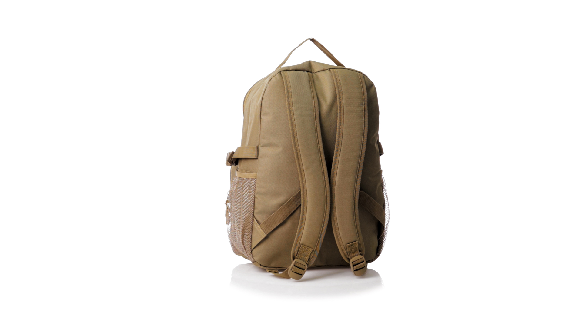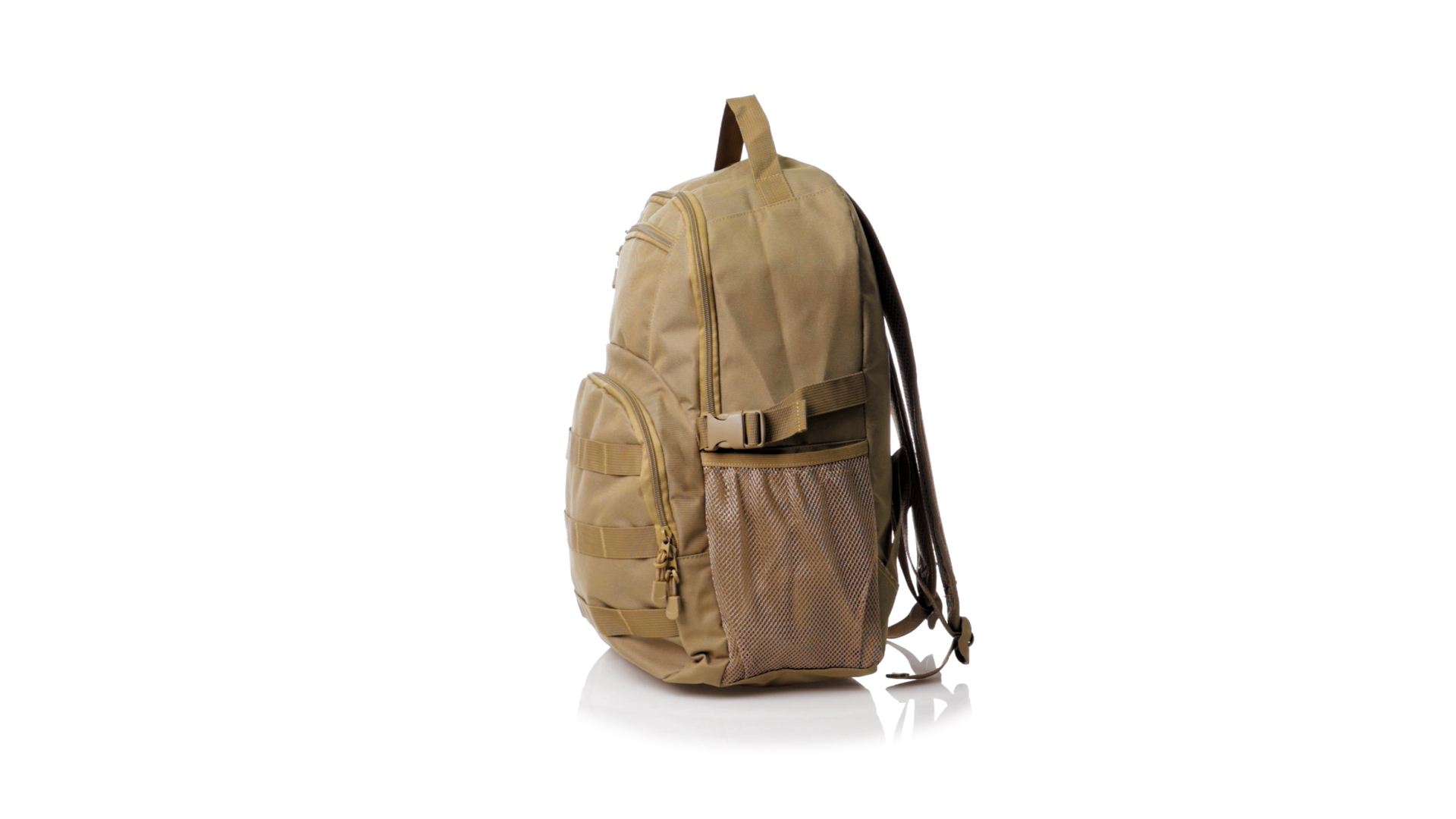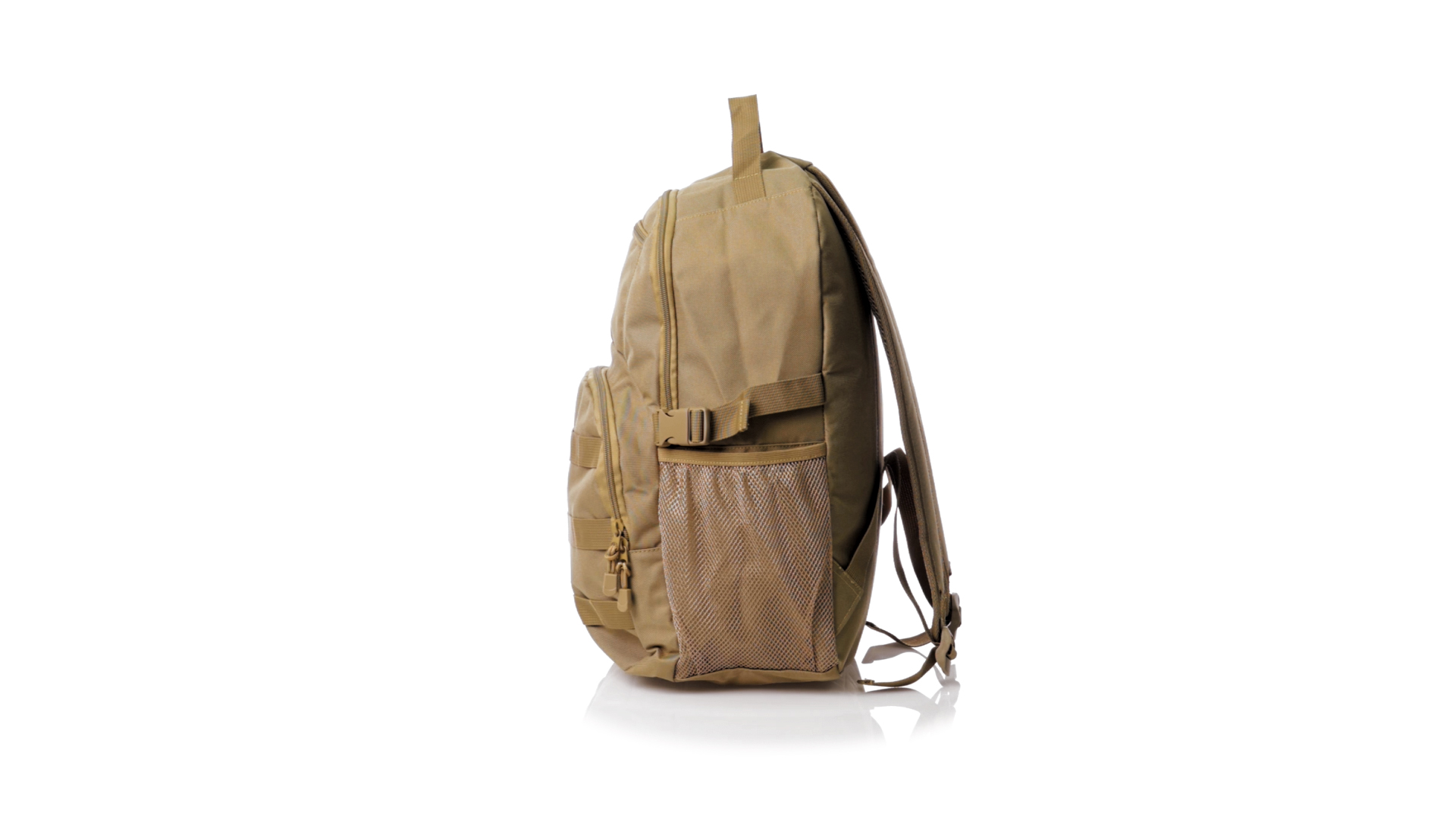 Taktischer Rucksack aus strapazierfähigem 800D-Polyester in Sandbrauntönen. Vorderseite mit mehreren elastischen Halterungen zum Aufhängen des notwendigen Zubehörs für das Abenteuer. Hauptfach mit Doppelreissverschluss und Tasche. Mit verstärkten Ecken, Tragegriff und seitlichen Netztaschen. Mit verstellbaren, gepolsterten Rücken- und Schultergurten, einzeln verpackt in einem recycelten Beutel.