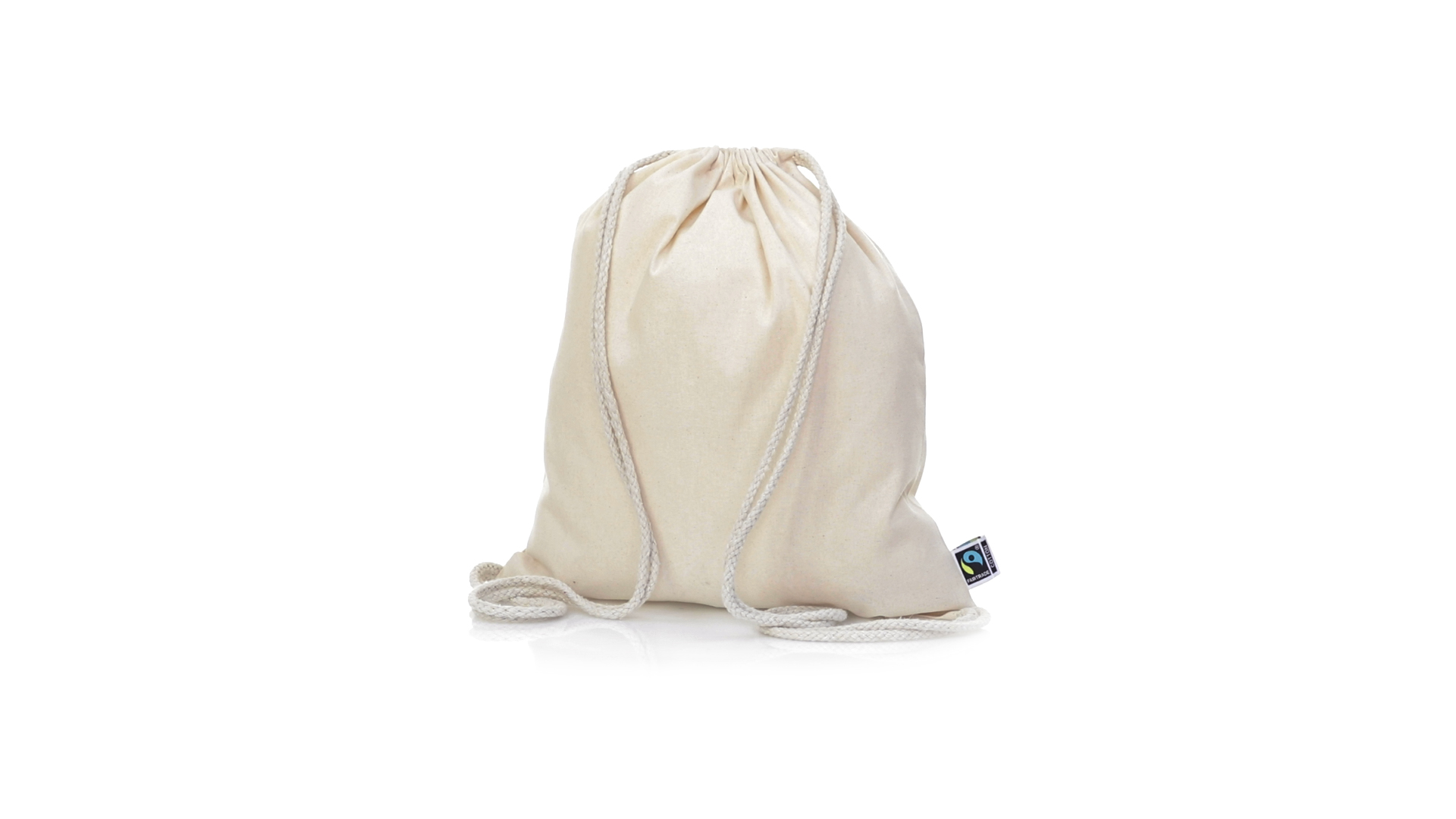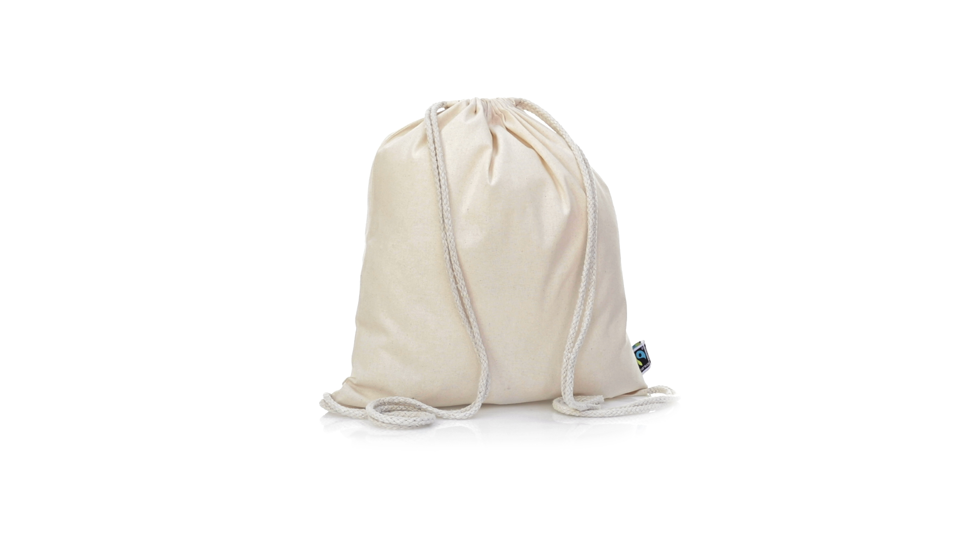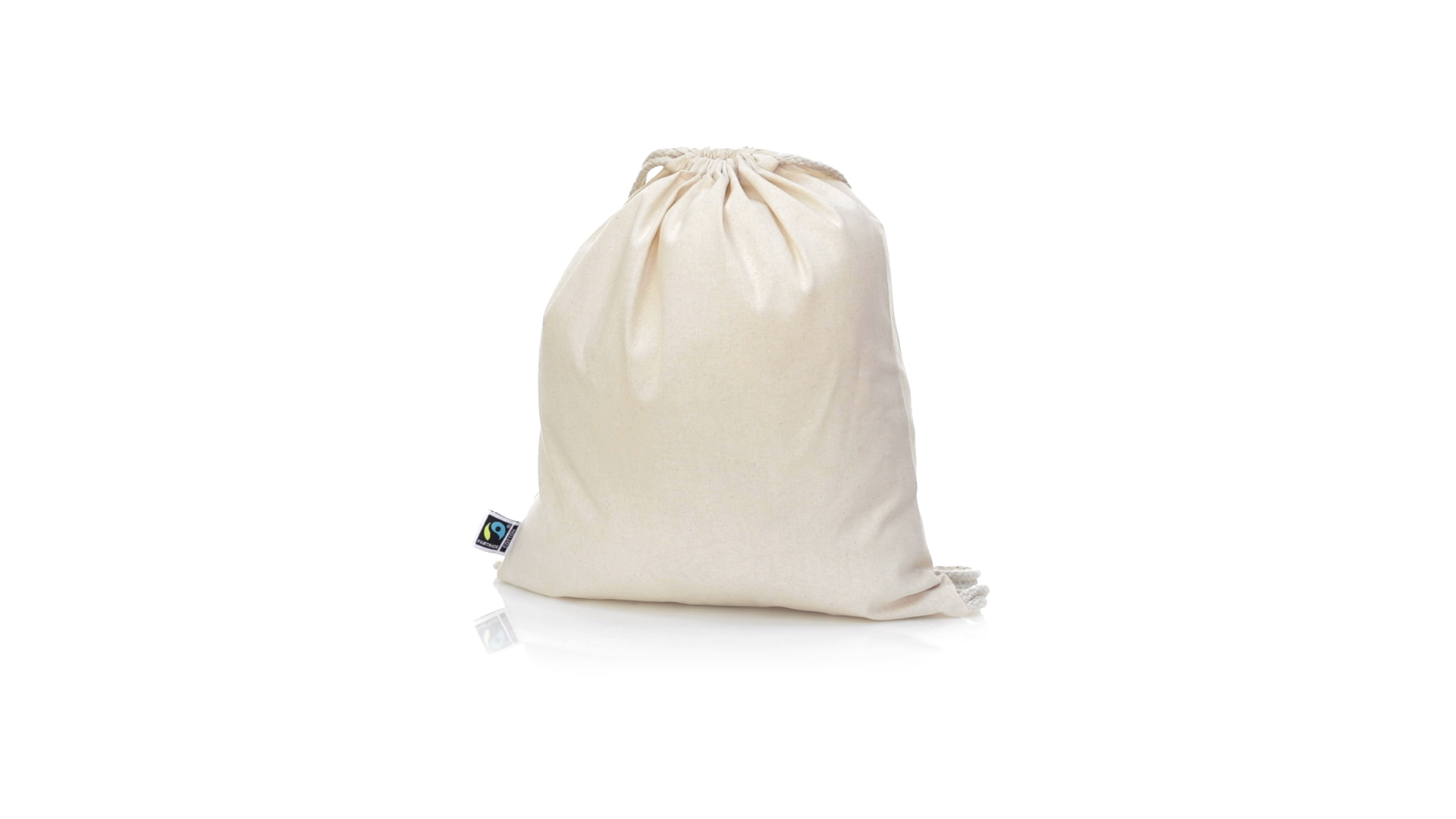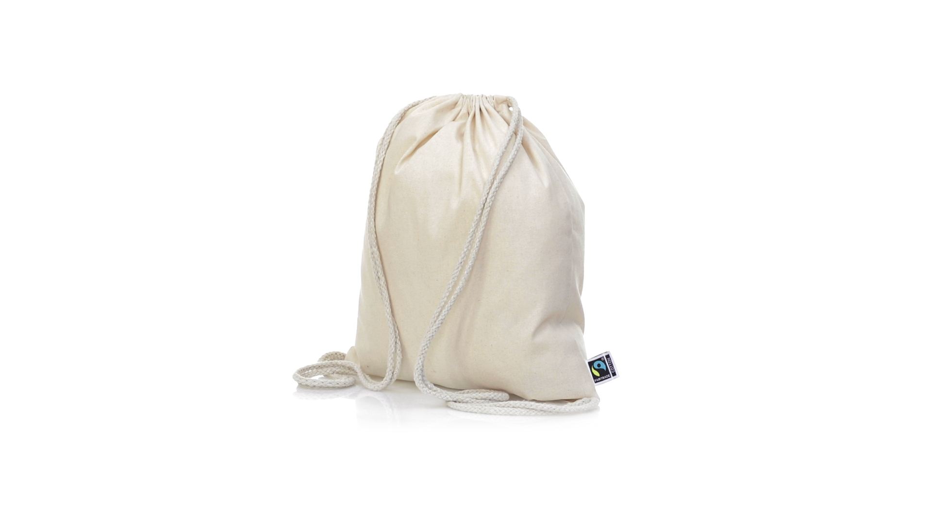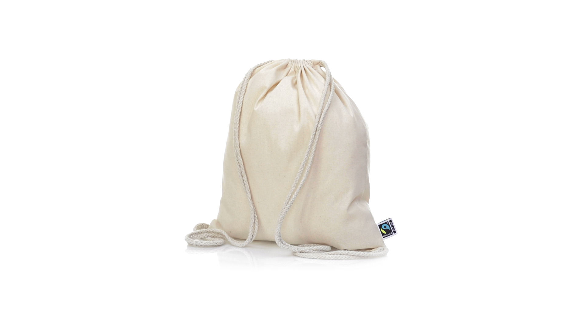 Linie "Natur" Rucksack mit Kordelzug aus Baumwolle 180g/m2 in einem natürlichen Farbton. Mit Fairtrade-Zertifizierung, eine Alternative zum konventionellen Handelssystem, die die Entwicklung der Völker und den Kampf gegen die Armut verfolgt. Mit genähter Oberfläche, Baumwollschnüren und einer Belastbarkeit von bis zu 9 kg. Inklusive Fairtrade-Etikett und Anhänger aus recyceltem Karton.