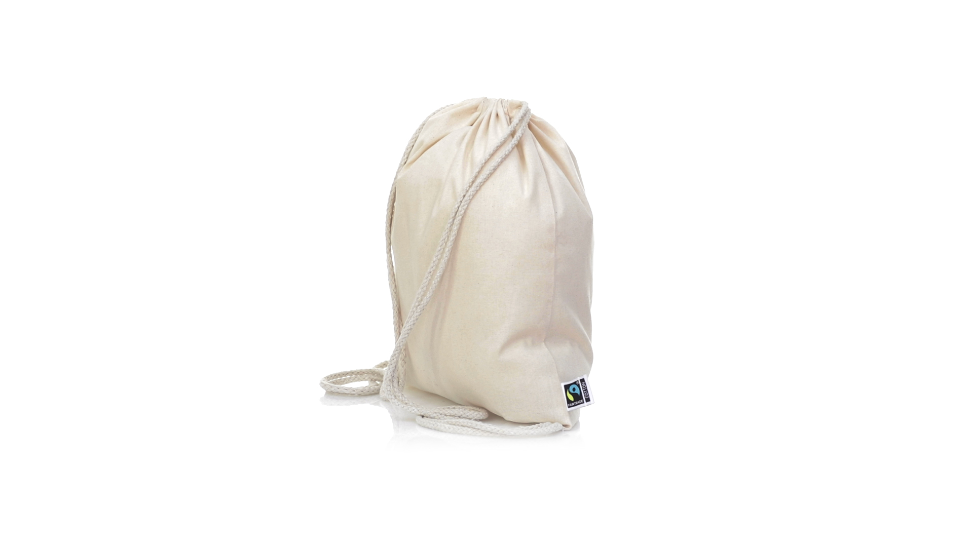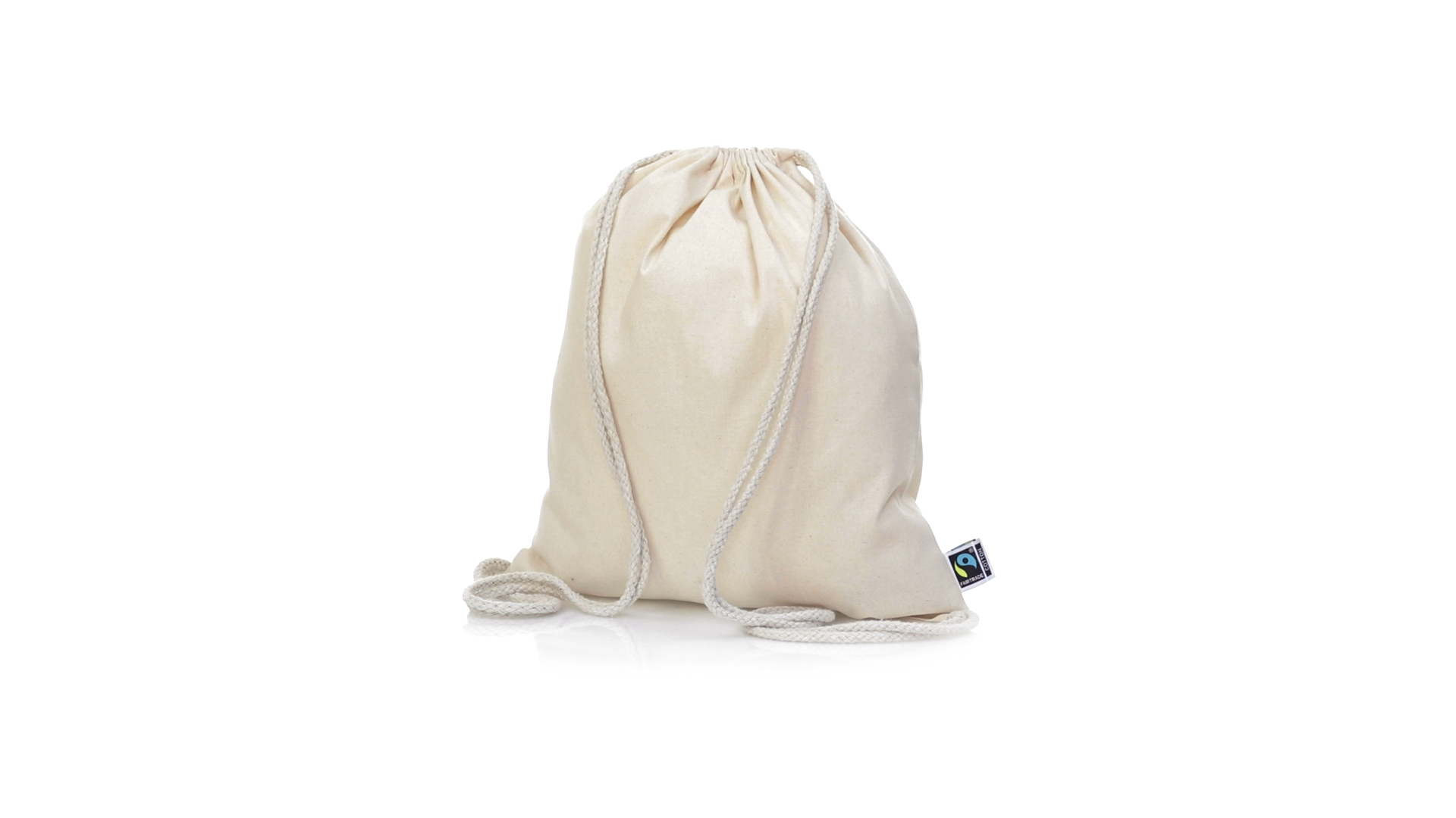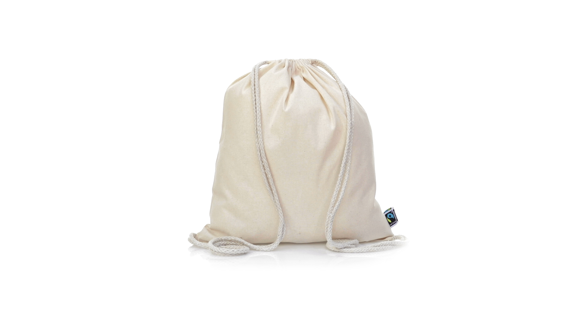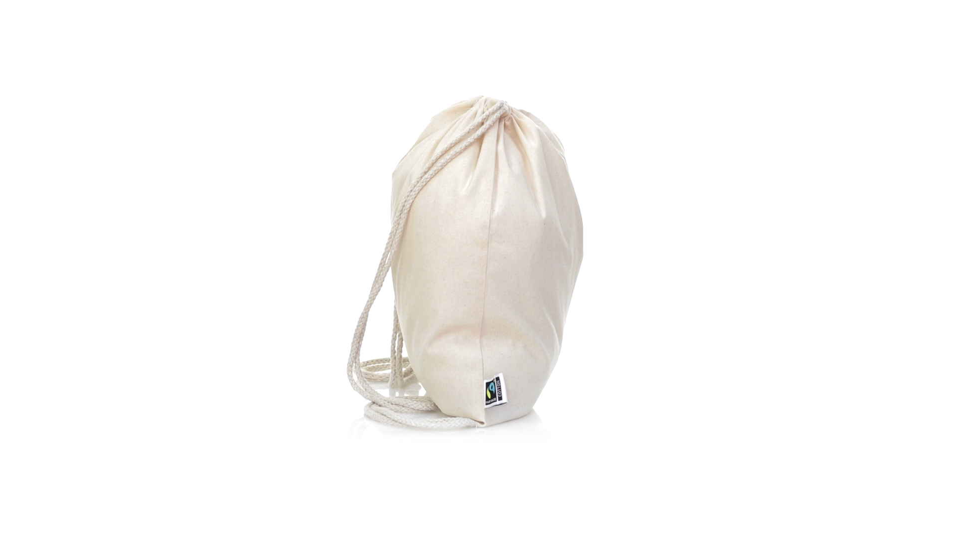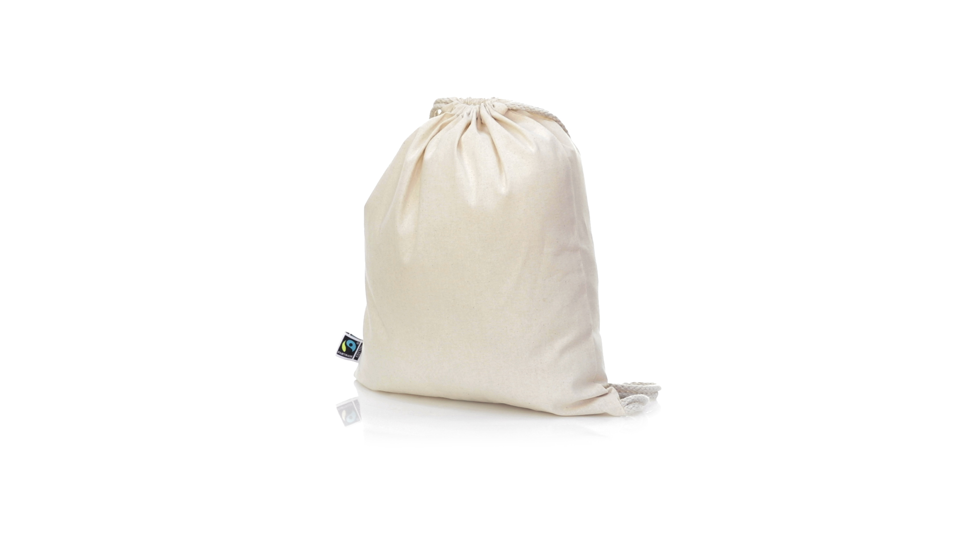 Linie "Natur" Rucksack mit Kordelzug aus Baumwolle 180g/m2 in einem natürlichen Farbton. Mit Fairtrade-Zertifizierung, eine Alternative zum konventionellen Handelssystem, die die Entwicklung der Völker und den Kampf gegen die Armut verfolgt. Mit genähter Oberfläche, Baumwollschnüren und einer Belastbarkeit von bis zu 9 kg. Inklusive Fairtrade-Etikett und Anhänger aus recyceltem Karton.