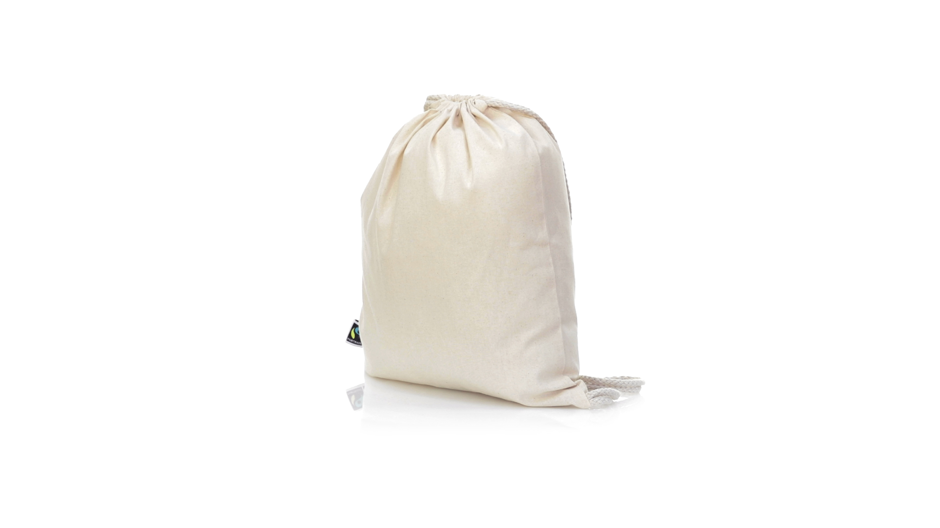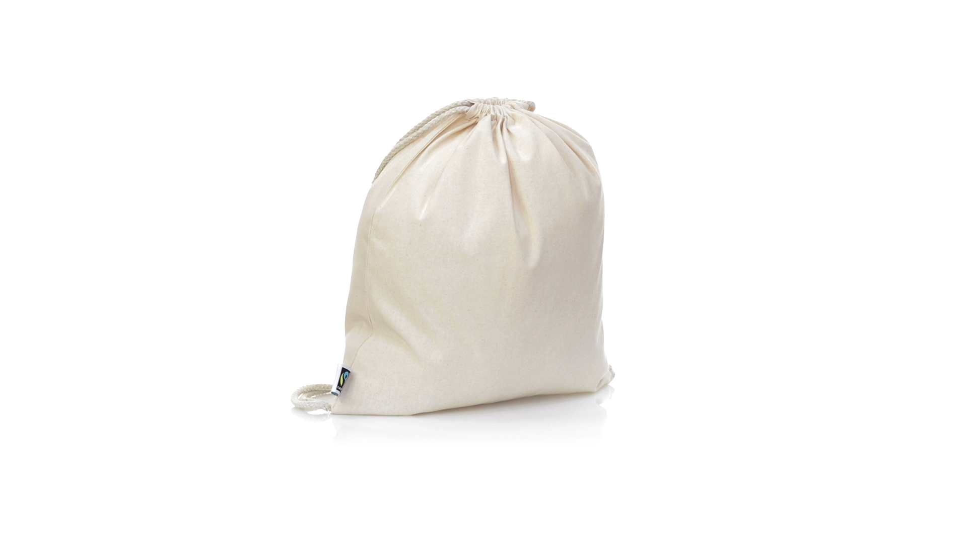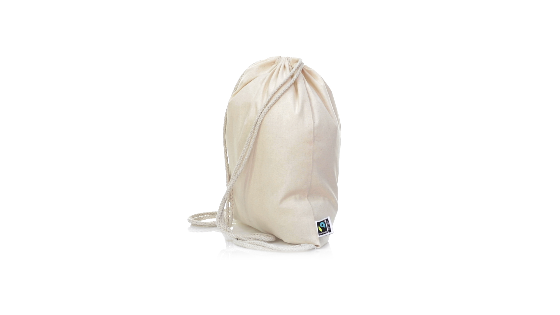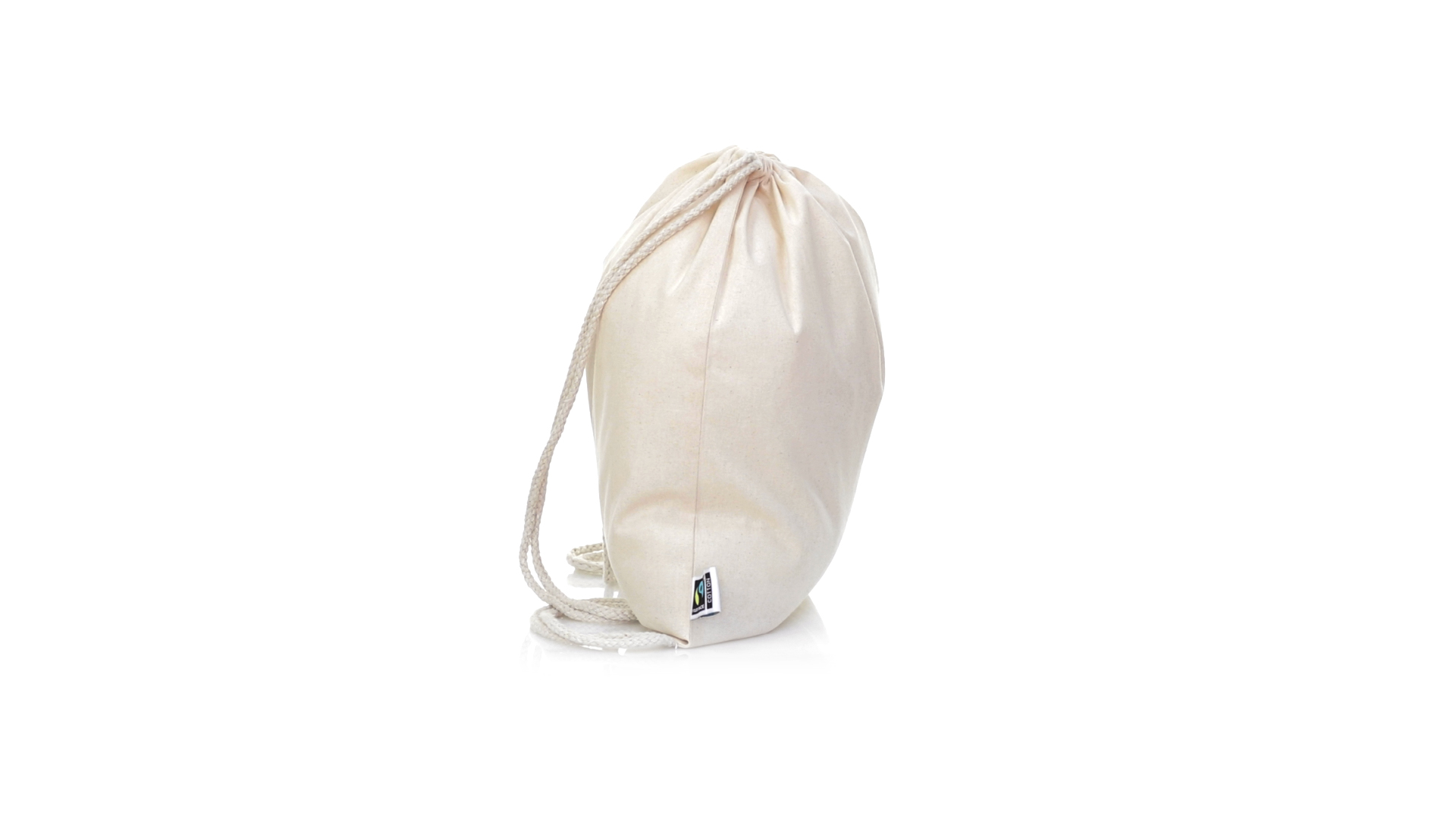 Linie "Natur" Rucksack mit Kordelzug aus Baumwolle 180g/m2 in einem natürlichen Farbton. Mit Fairtrade-Zertifizierung, eine Alternative zum konventionellen Handelssystem, die die Entwicklung der Völker und den Kampf gegen die Armut verfolgt. Mit genähter Oberfläche, Baumwollschnüren und einer Belastbarkeit von bis zu 9 kg. Inklusive Fairtrade-Etikett und Anhänger aus recyceltem Karton.