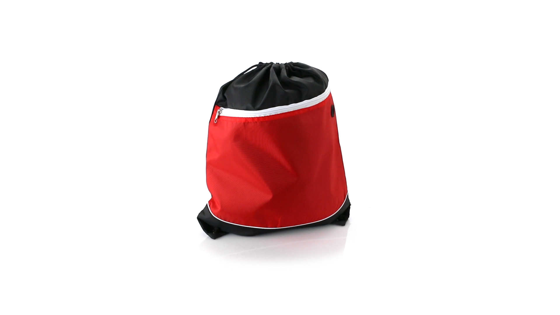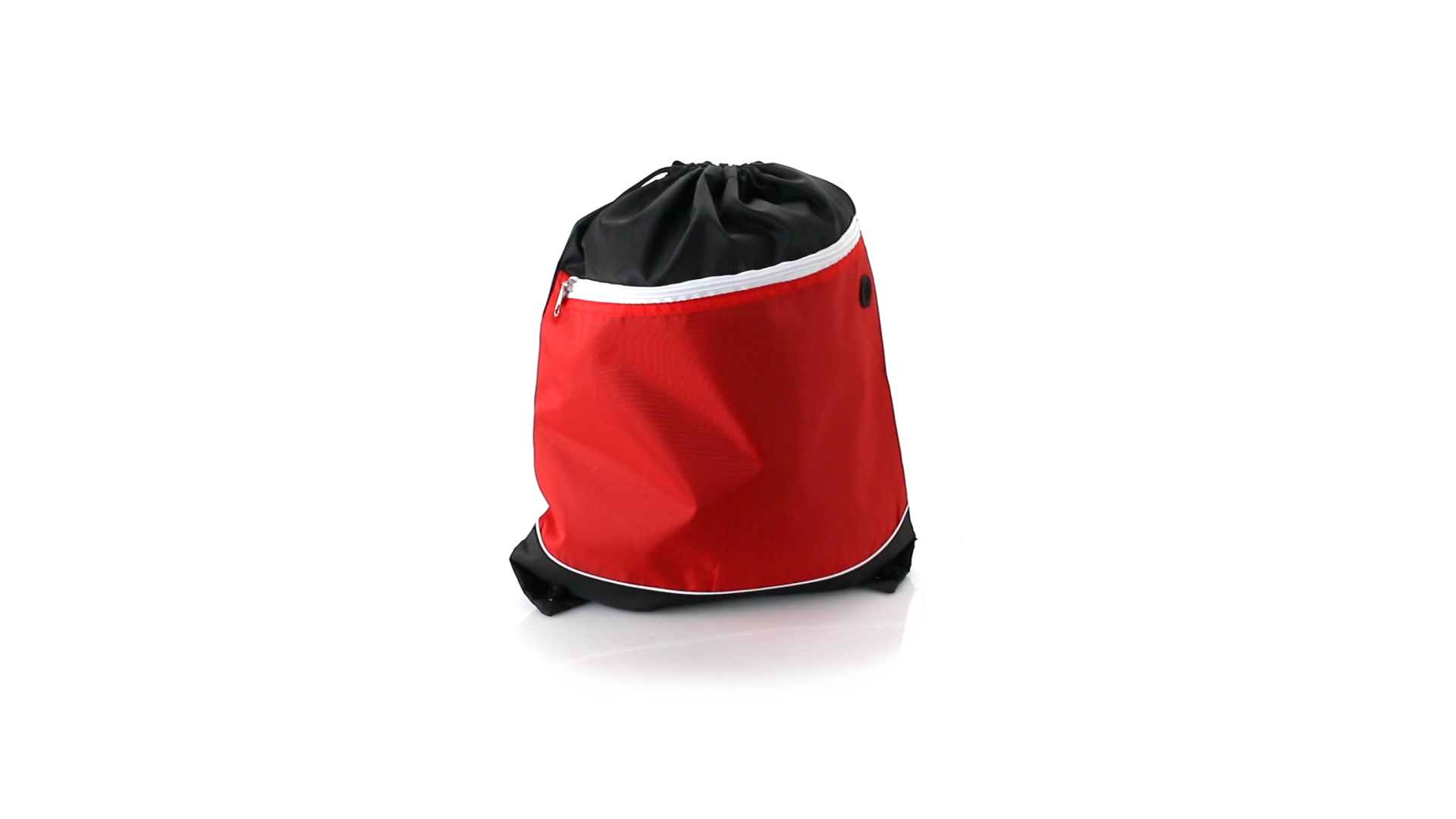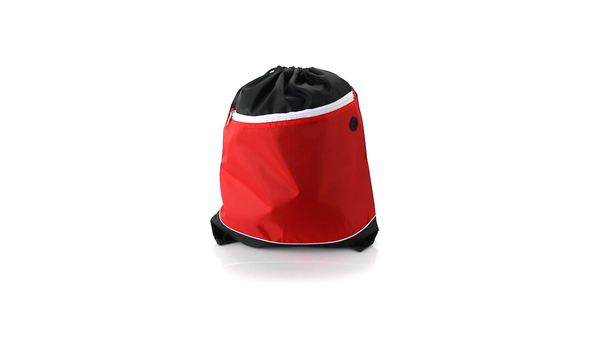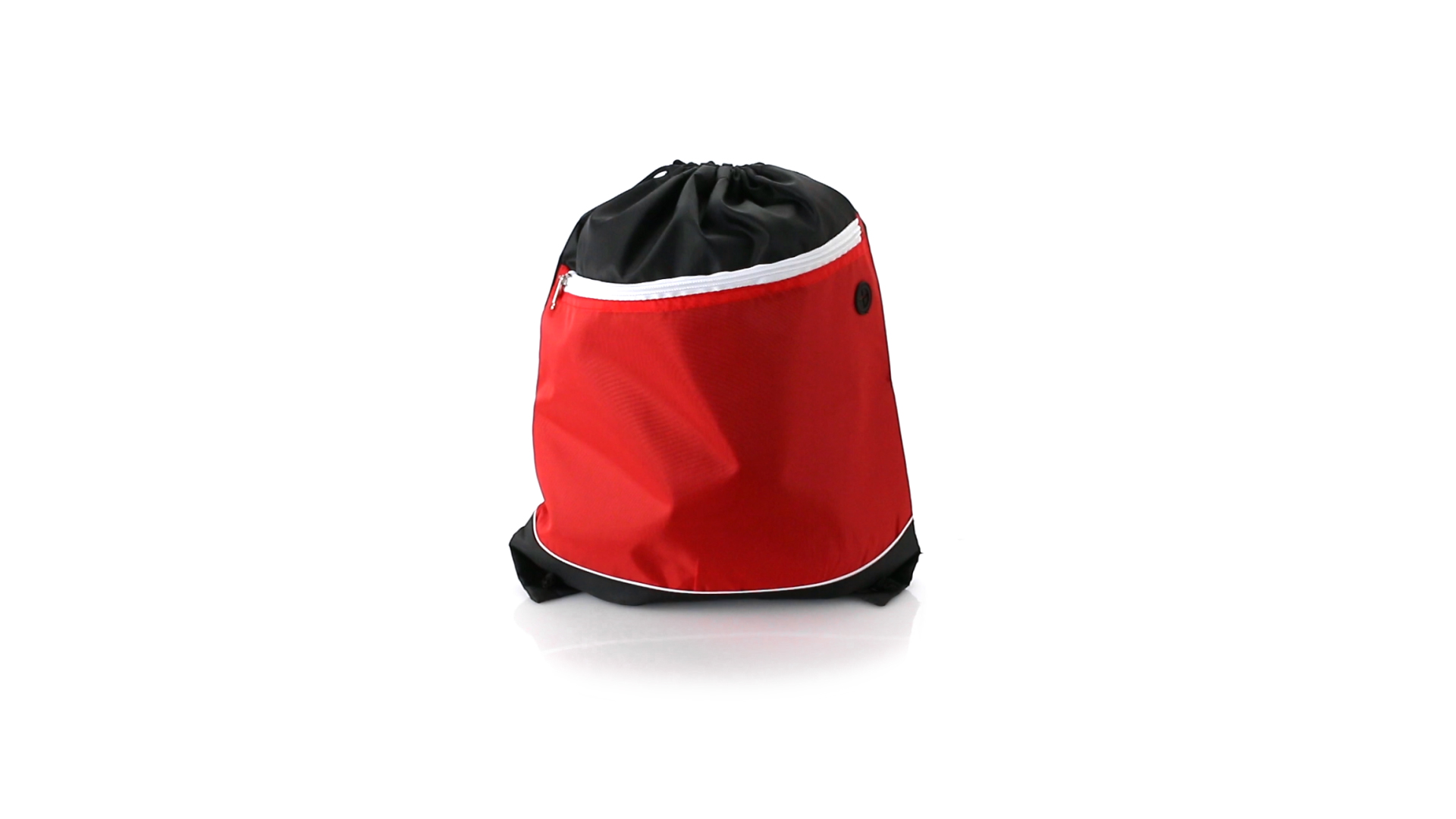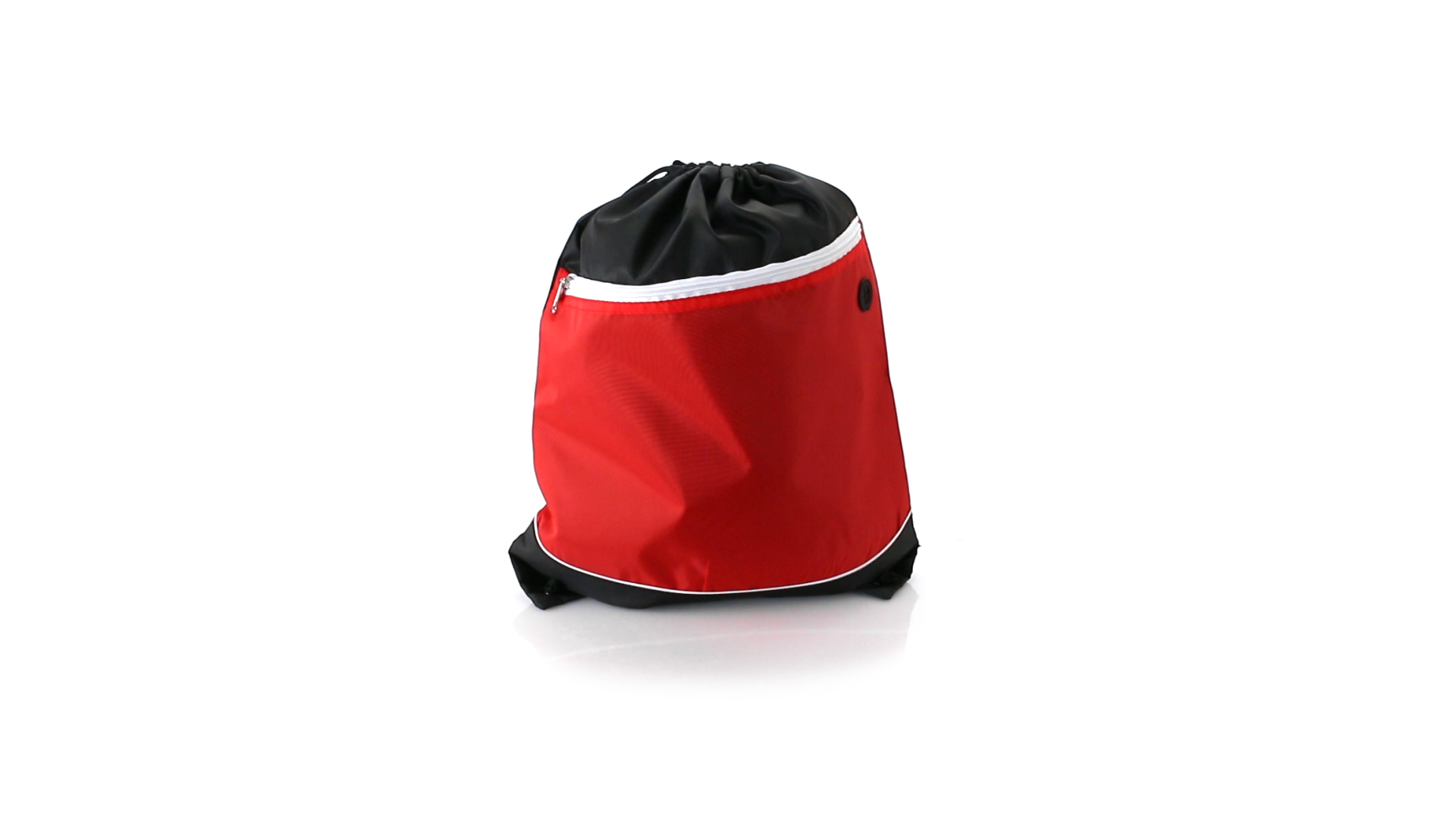 Rucksack mit Kordelzug aus angenehm weichem 210T Polyester mit originellem, zweifarbigem Design. Fronttasche mit Reissverschluss sowie Kopfhörerausgang. Schwarze Zugbänder zum Schliessen sowie verstärkte Ecken mit Metallösen.