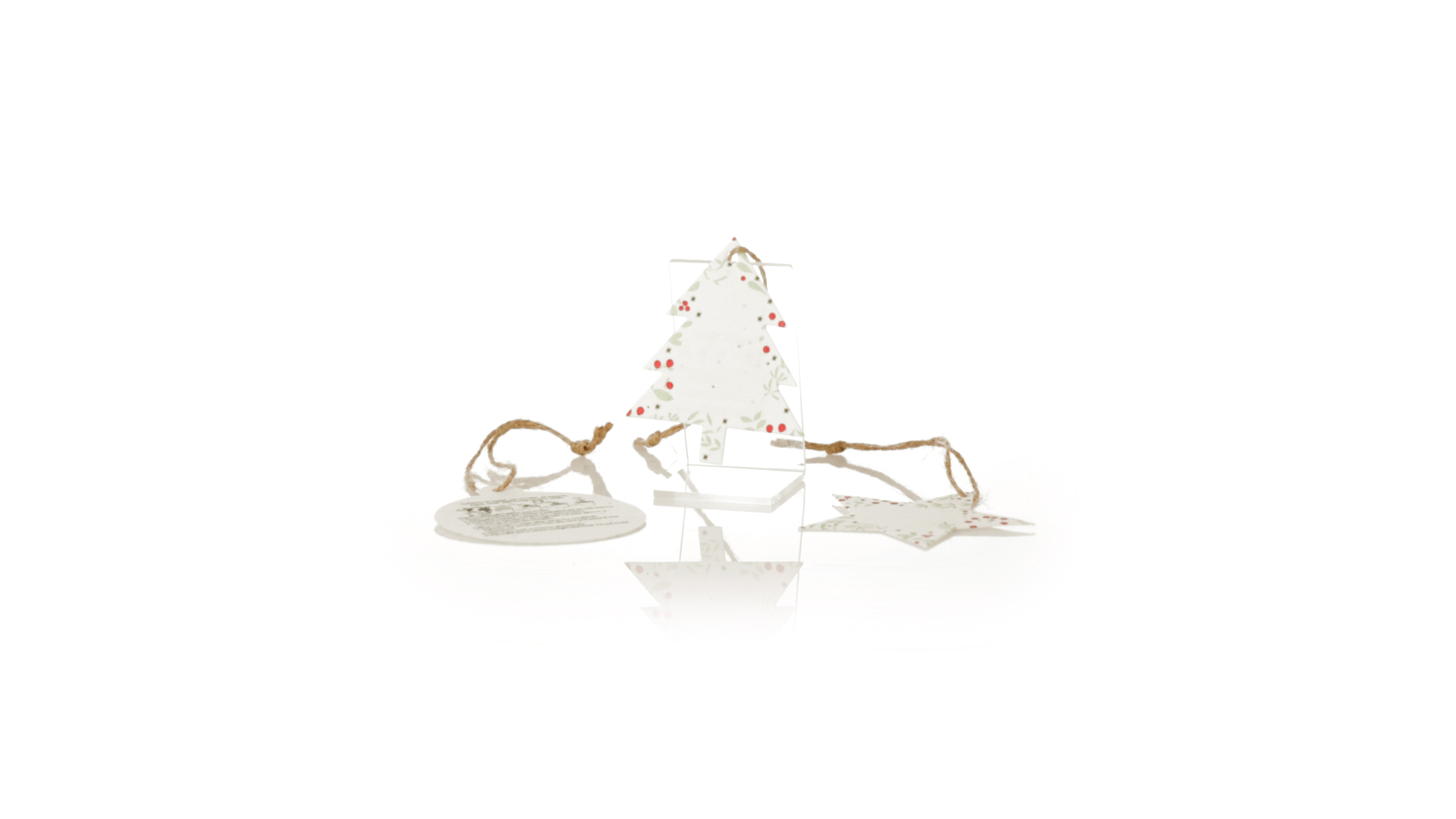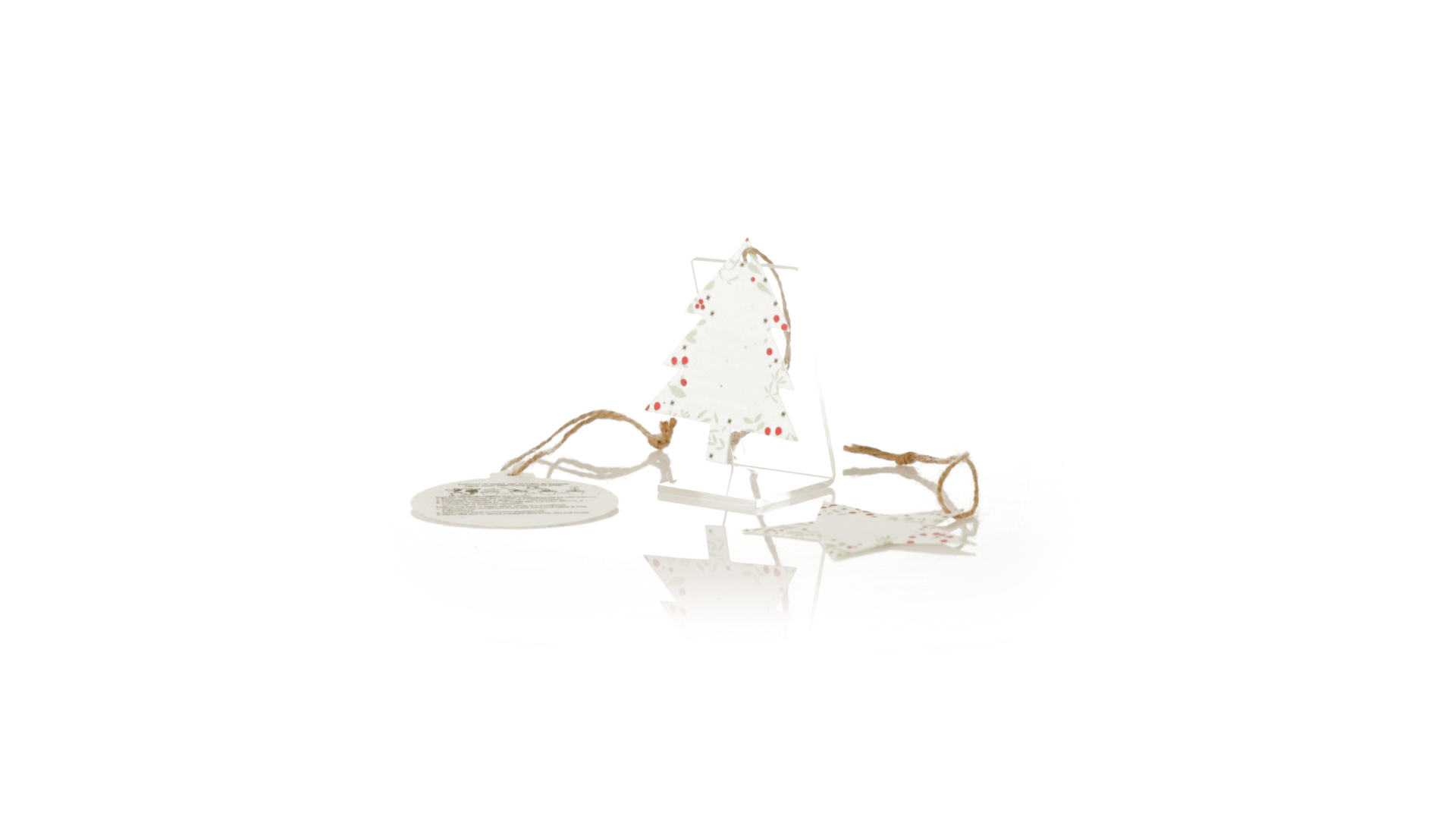 Nachhaltiger und origineller Weihnachtsschmuck aus recyclebarem und abbaubarem Saatgutpapier. Enthält verschiedene farbige Petuniensamen, die das Papier nach seiner Nutzungsdauer in pflanzbares Papier verwandeln. Mit natürlichem Juteaufhänger. Erhältlich in 3 Designs: Kugel, Stern und Baum. Präsentiert in einer Tüte aus recyceltem Papier.Mit Pflanzanleitung in Spanisch und Englisch.