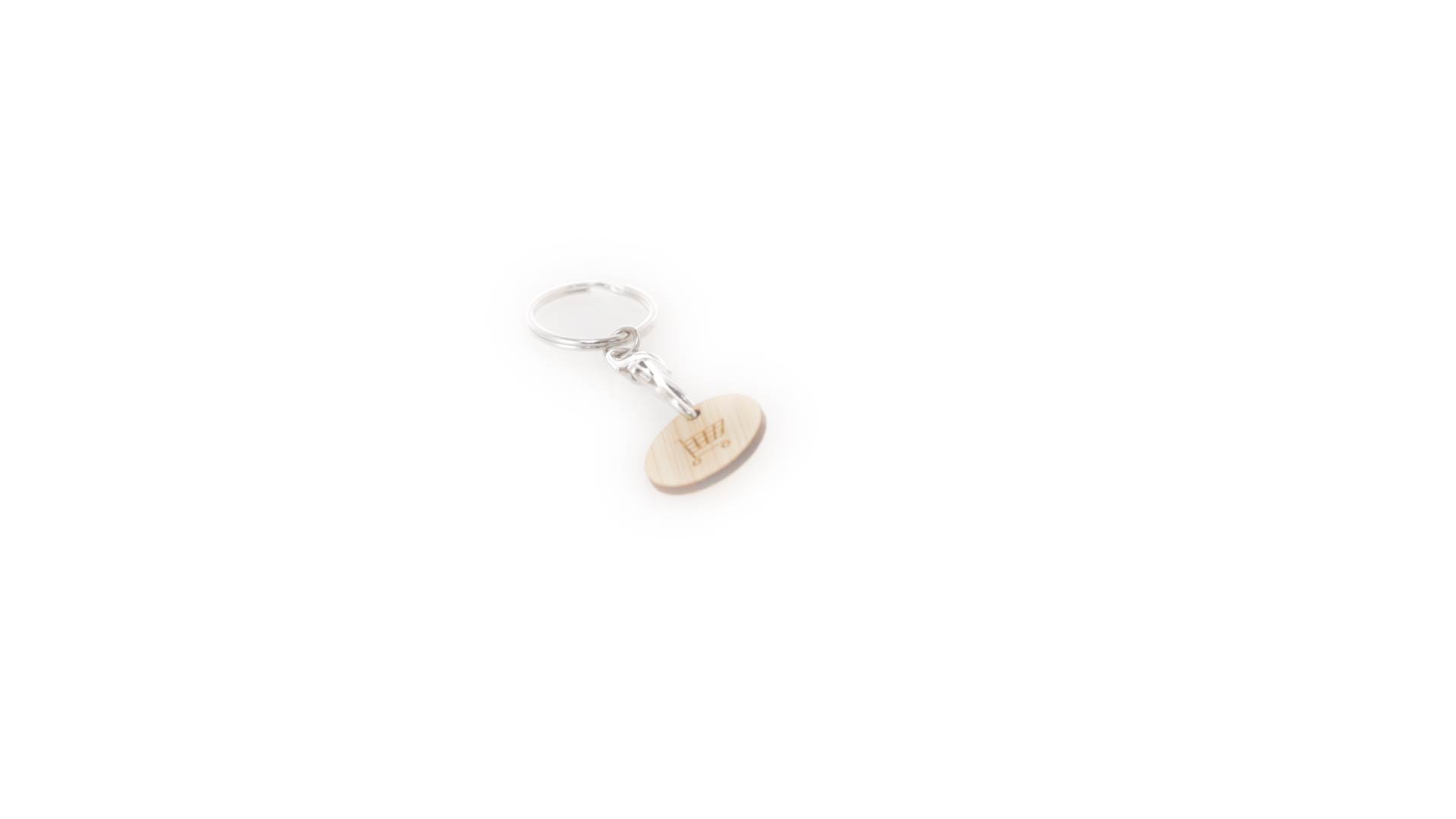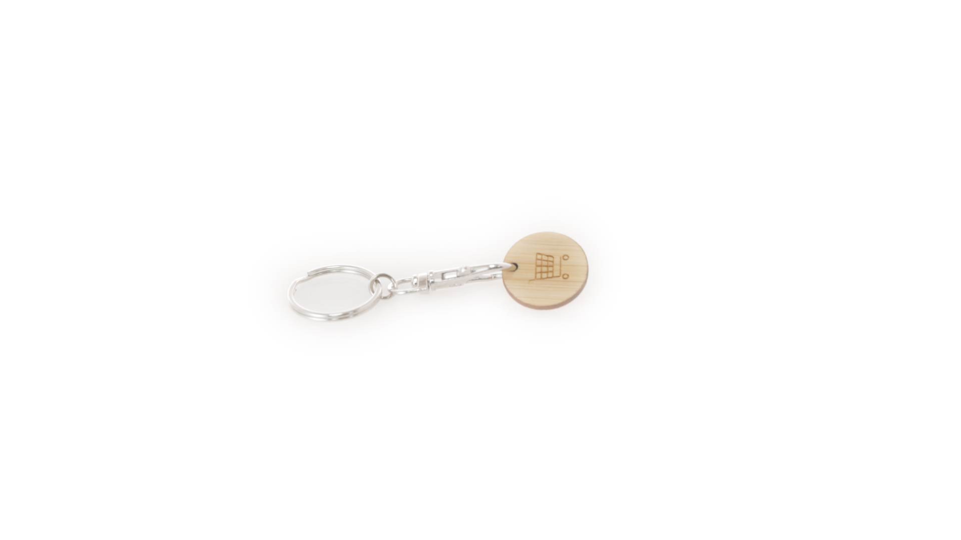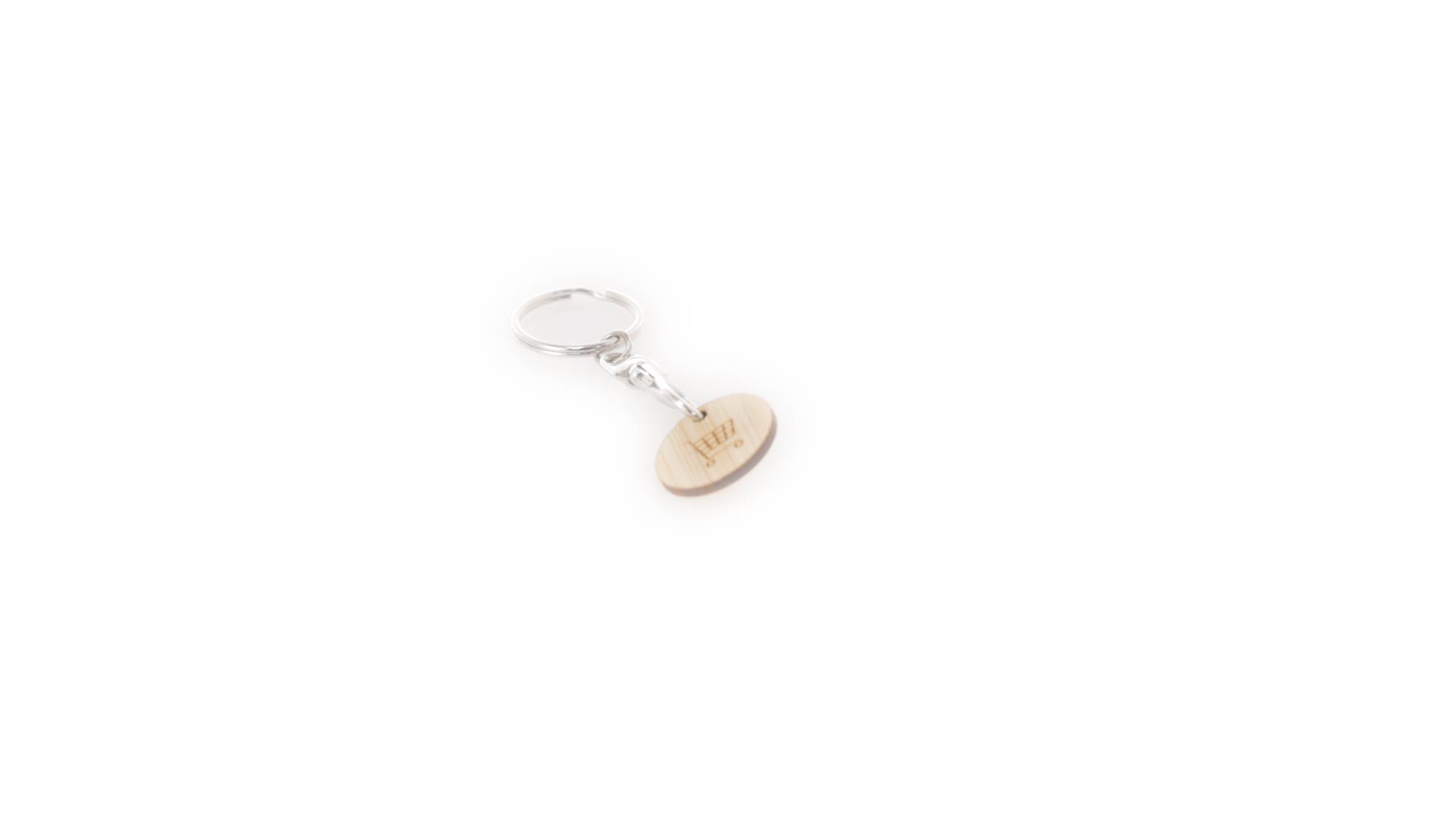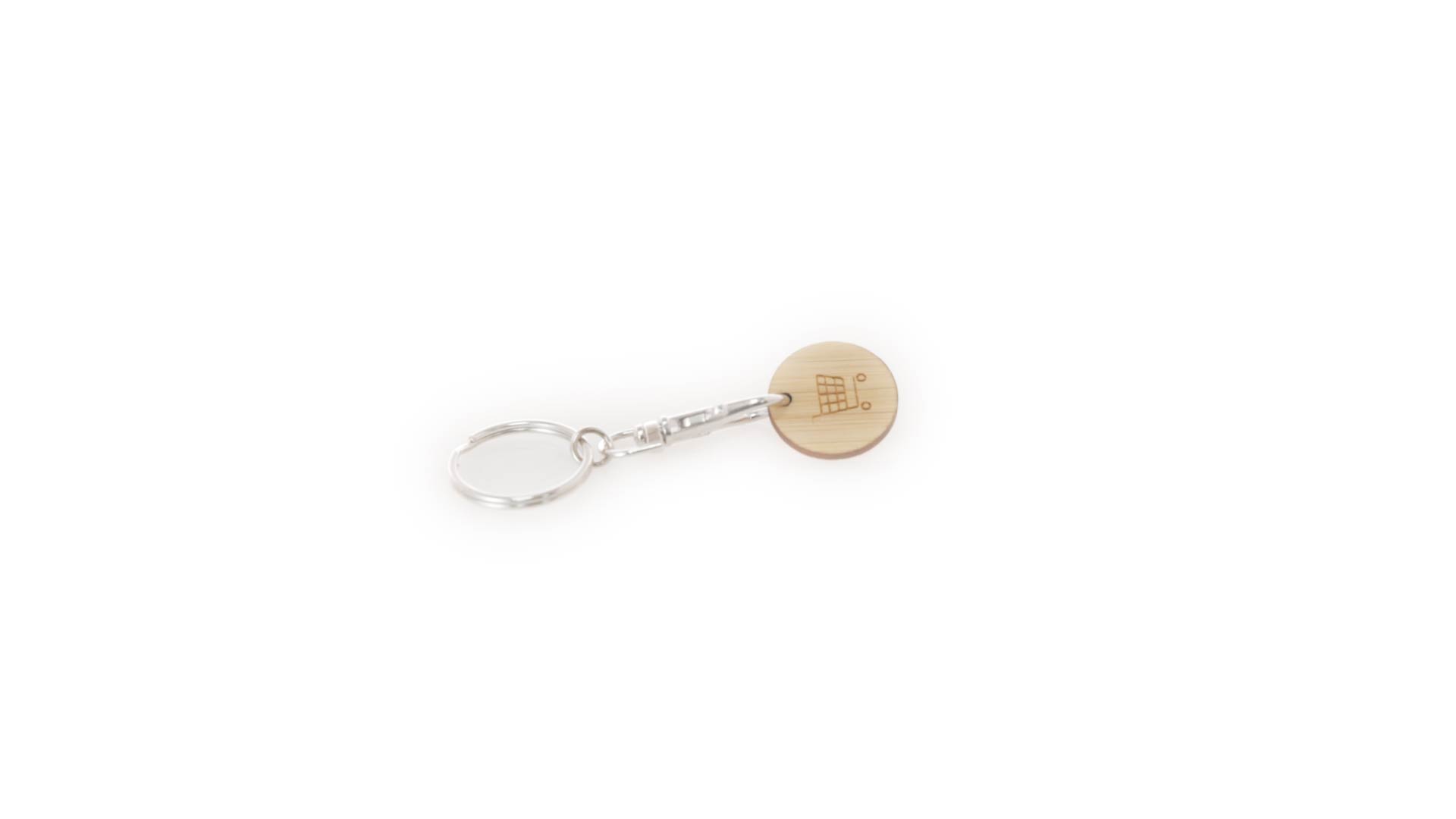 Münz-Schlüsselanhänger aus Bambus. Mit Drehkarabinerverschluss und Schlüsselring. Inklusive einer Münze aus Bambus mit eingraviertem Logo eines Einkaufswagens. Materialien wie Bambus fördern die Verwendung natürlicher Rohstoffe und reduzieren so den Schadstoffausstoss.